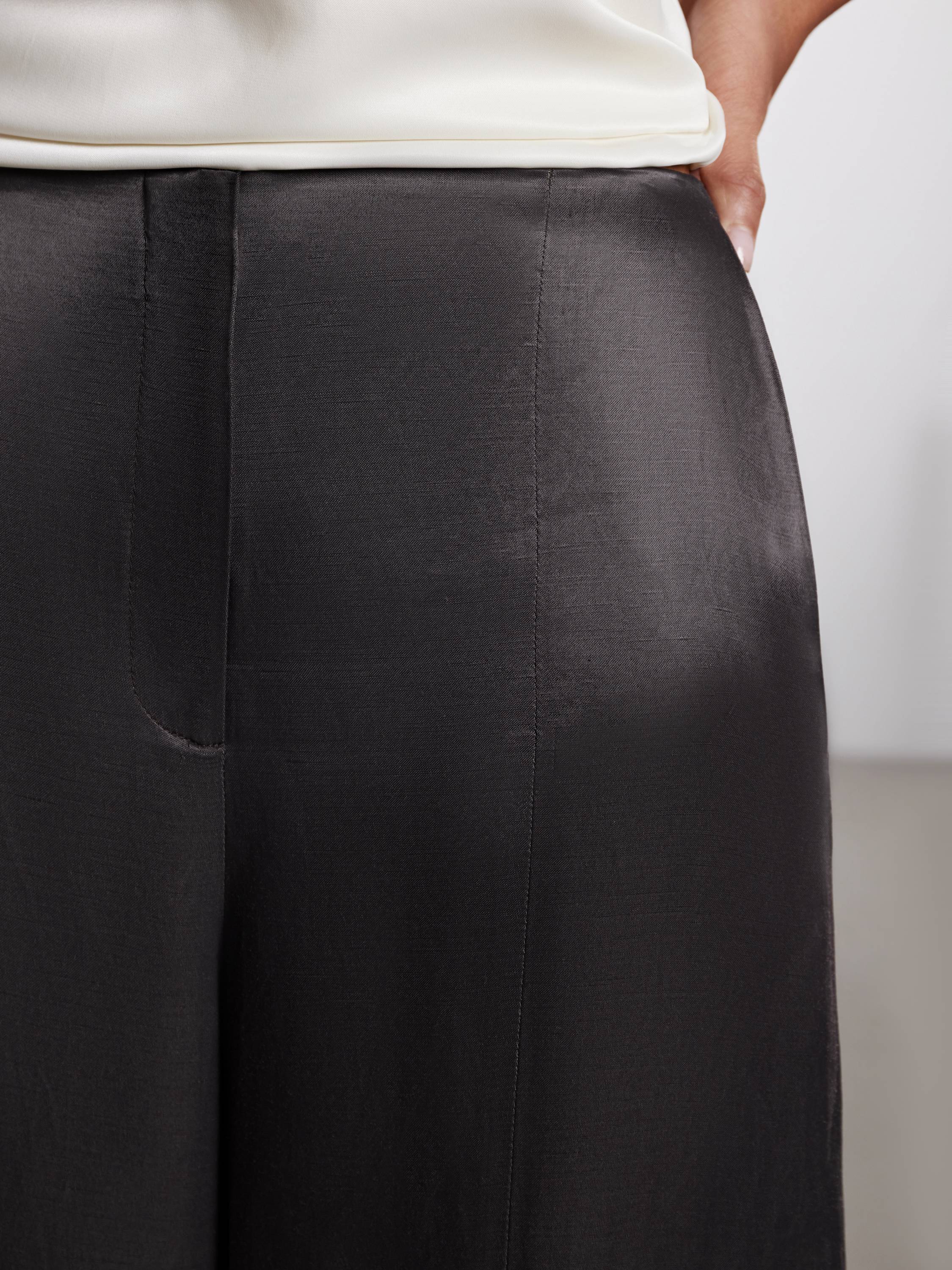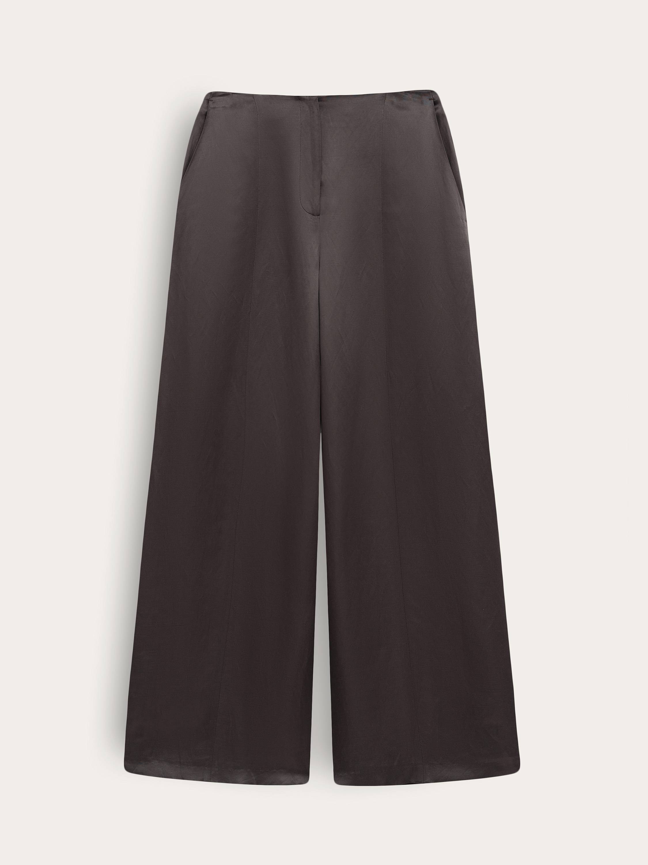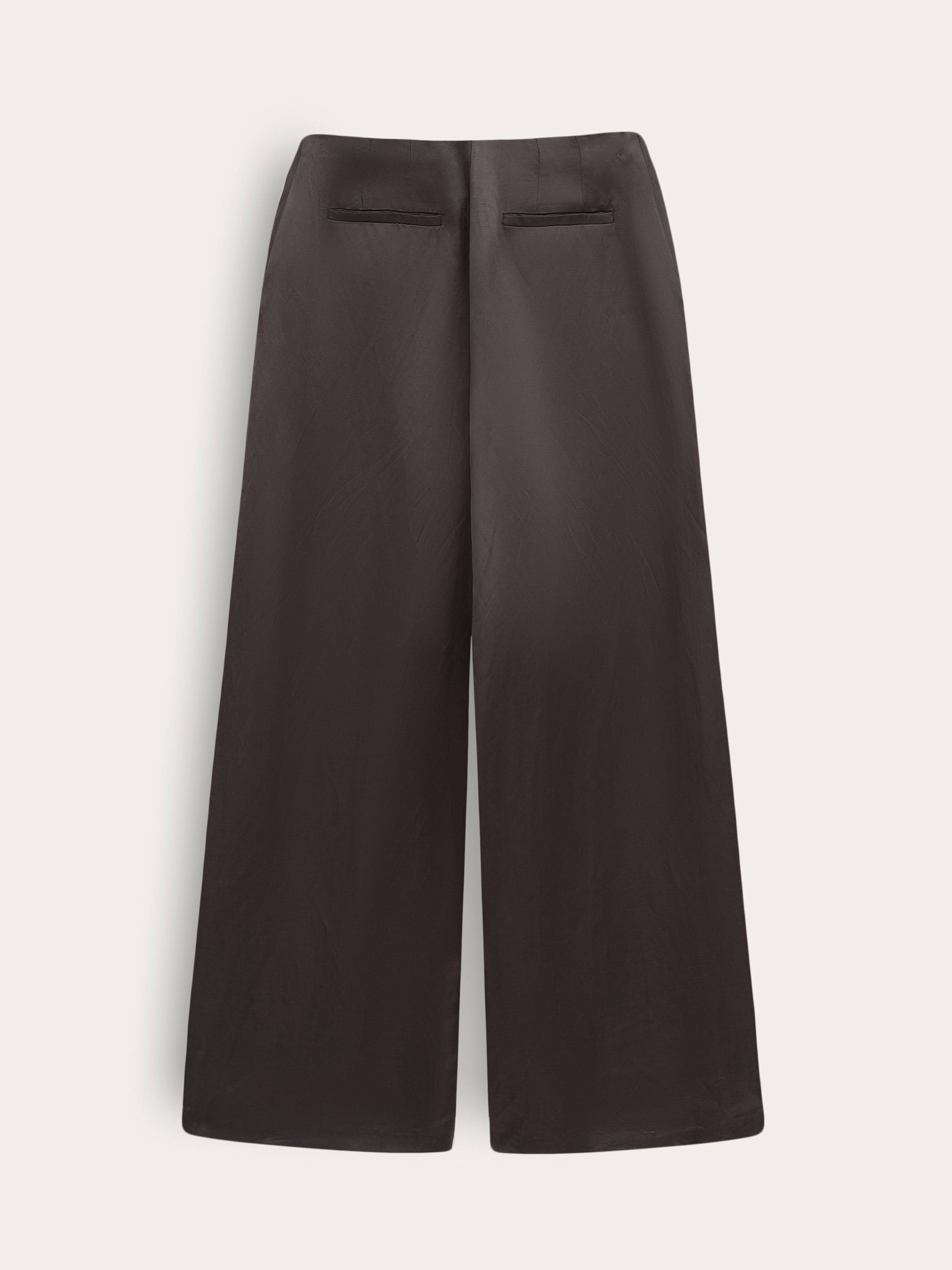 Широкие брюки из смесового полотна — выразительная модель с характерной фактурой и деликатным переливом. Глубокий коричневый оттенок усиливает ощущение благородства и делает образ собранным. Свободный силуэт с аккуратными защипами, эластичной вставкой сзади и поясом на пуговице обеспечивает комфортную посадку и визуально вытягивает линию ноги. Мягкая пластика ткани подчёркивает текучесть формы и придаёт образу ненавязчивую элегантность. Эти брюки органично впишутся в утренний комплект с базовым топом, а вечером легко станут частью ансамбля с рубашкой из того же материала или тонким жакетом.
