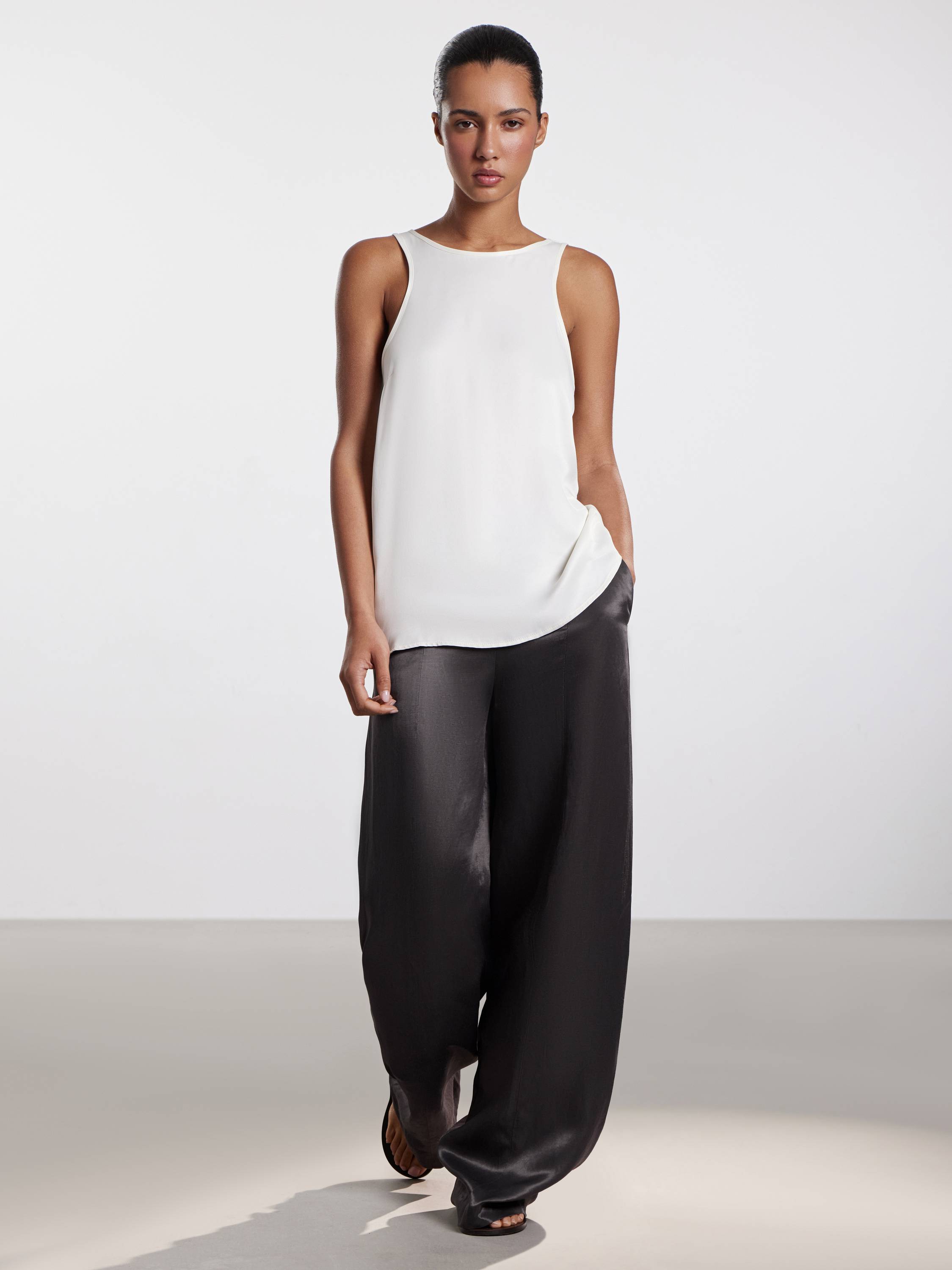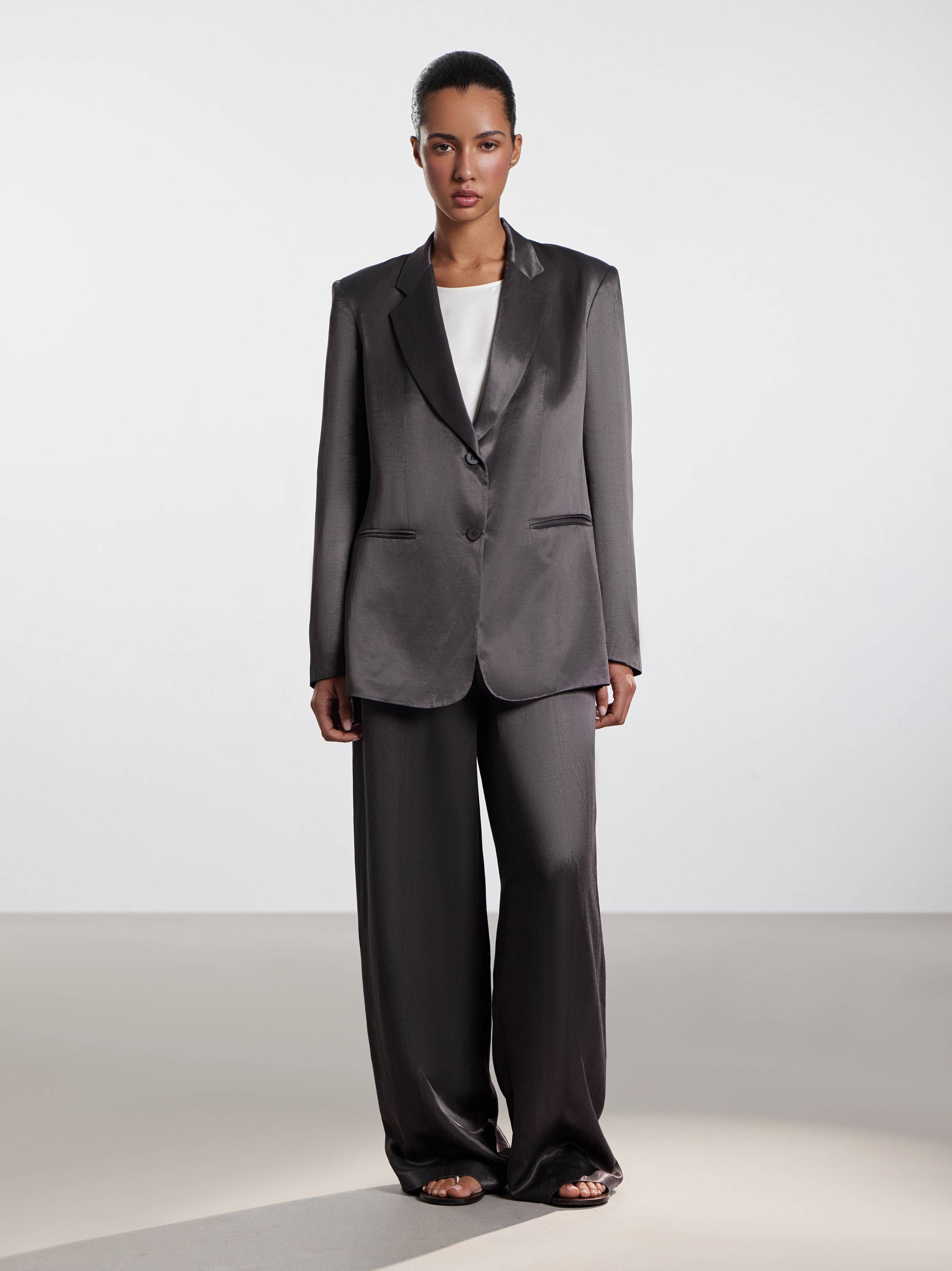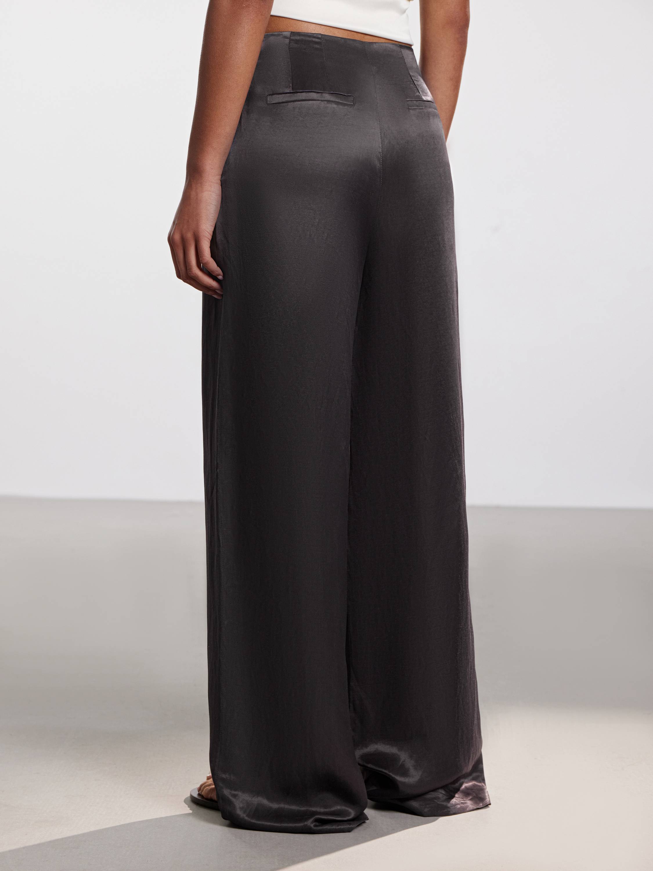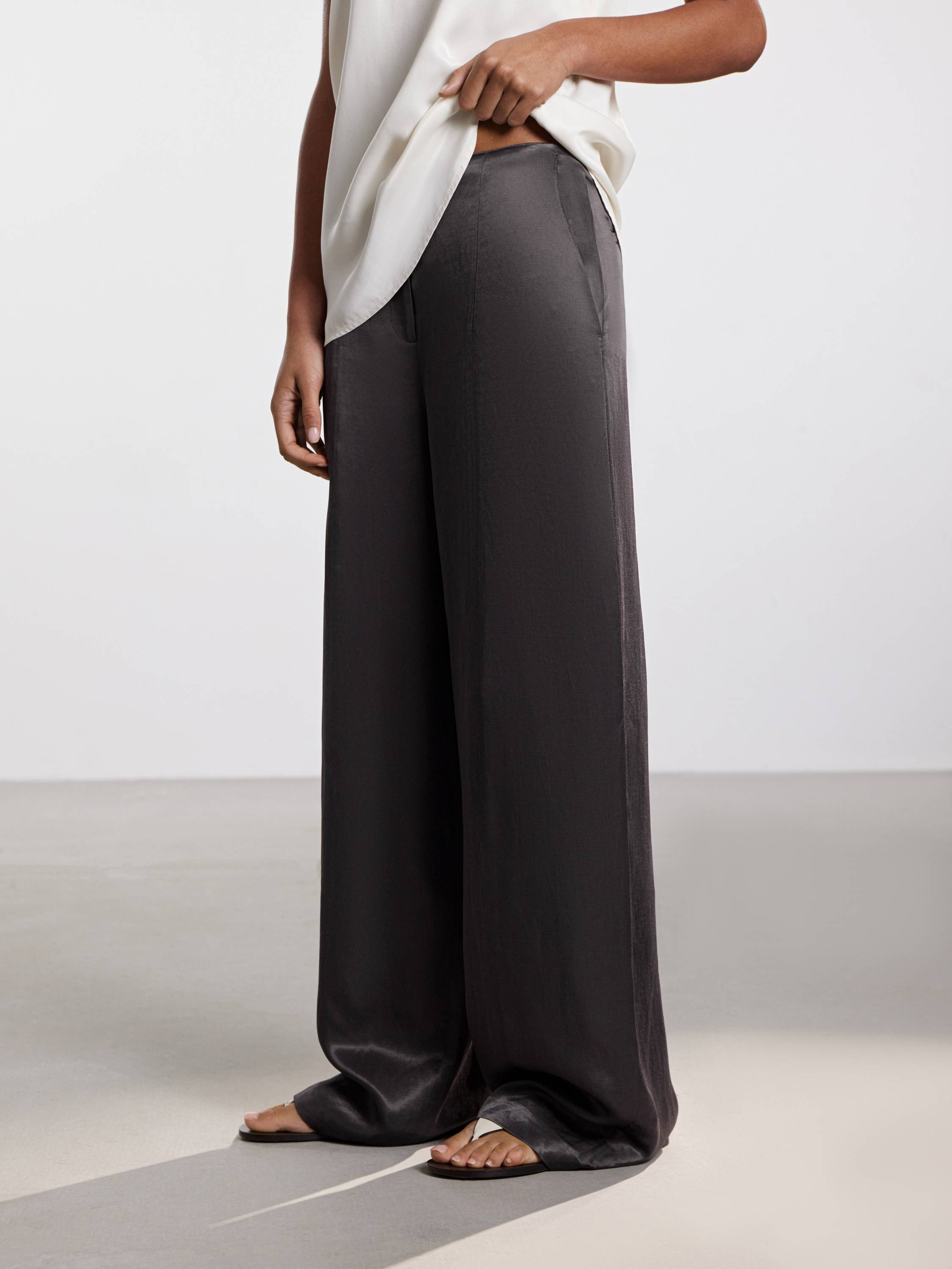 Широкие брюки из смесового полотна — выразительная модель с характерной фактурой и деликатным переливом. Глубокий коричневый оттенок усиливает ощущение благородства и делает образ собранным. Свободный силуэт с аккуратными защипами, эластичной вставкой сзади и поясом на пуговице обеспечивает комфортную посадку и визуально вытягивает линию ноги. Мягкая пластика ткани подчёркивает текучесть формы и придаёт образу ненавязчивую элегантность. Эти брюки органично впишутся в утренний комплект с базовым топом, а вечером легко станут частью ансамбля с рубашкой из того же материала или тонким жакетом.