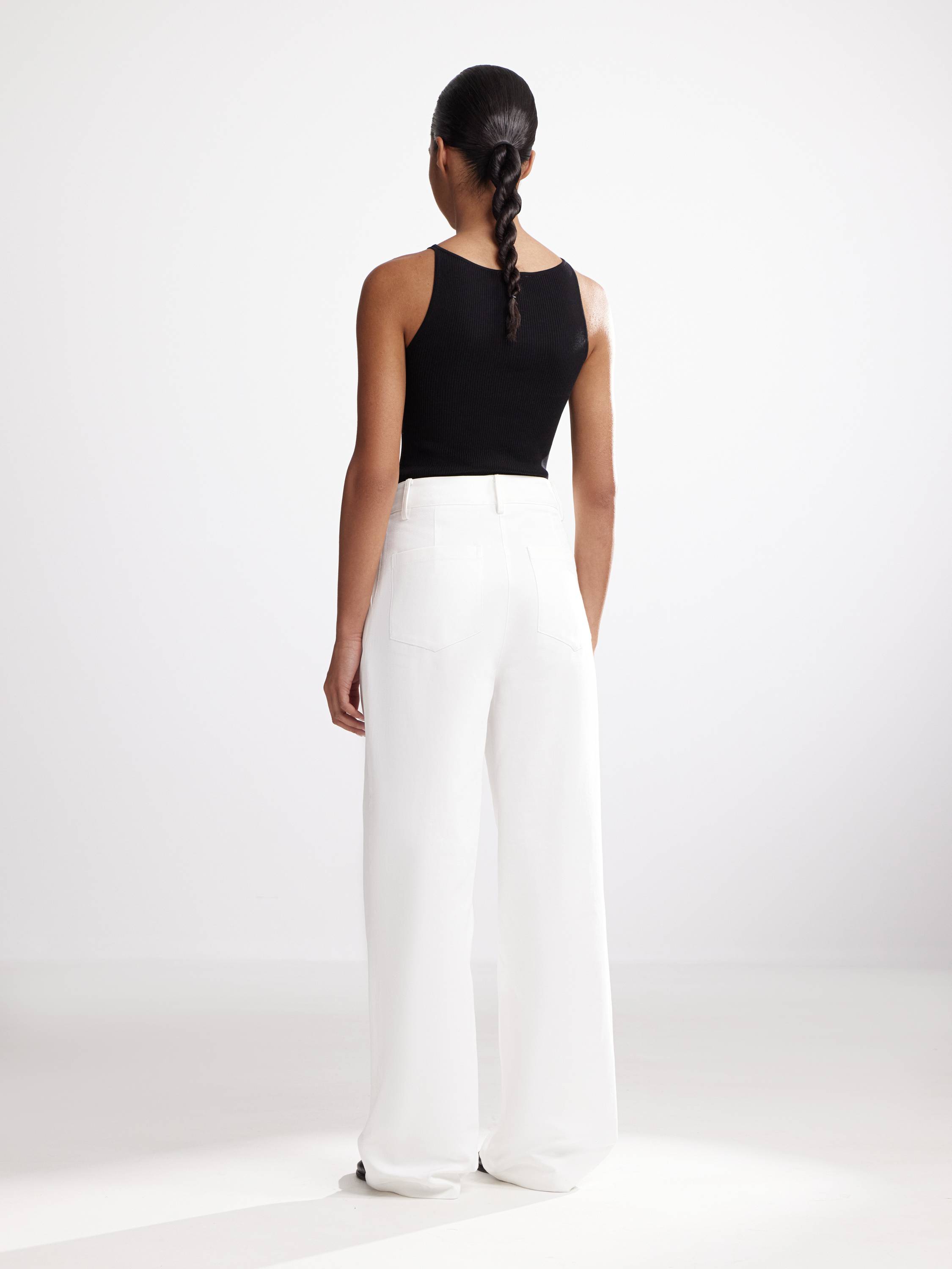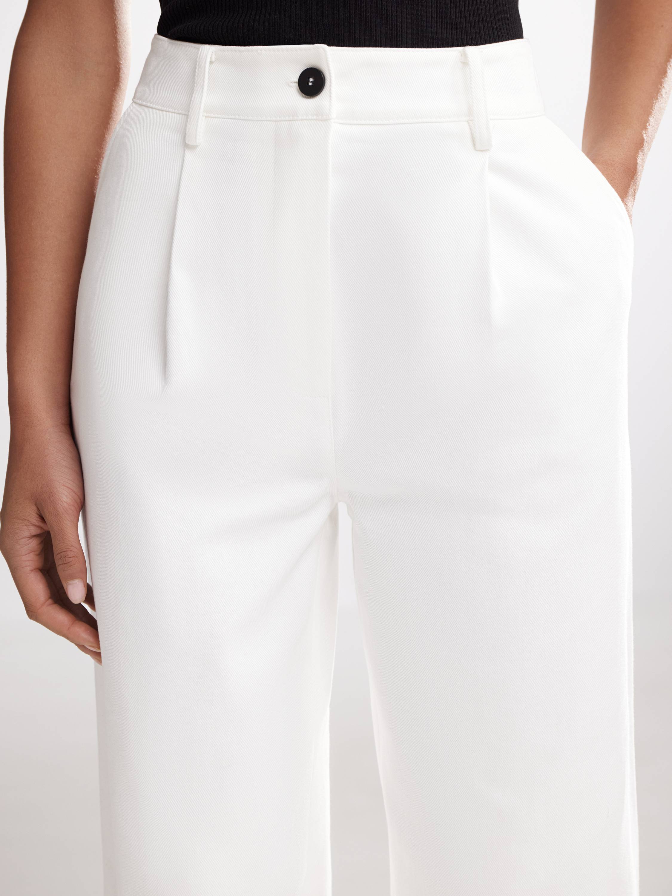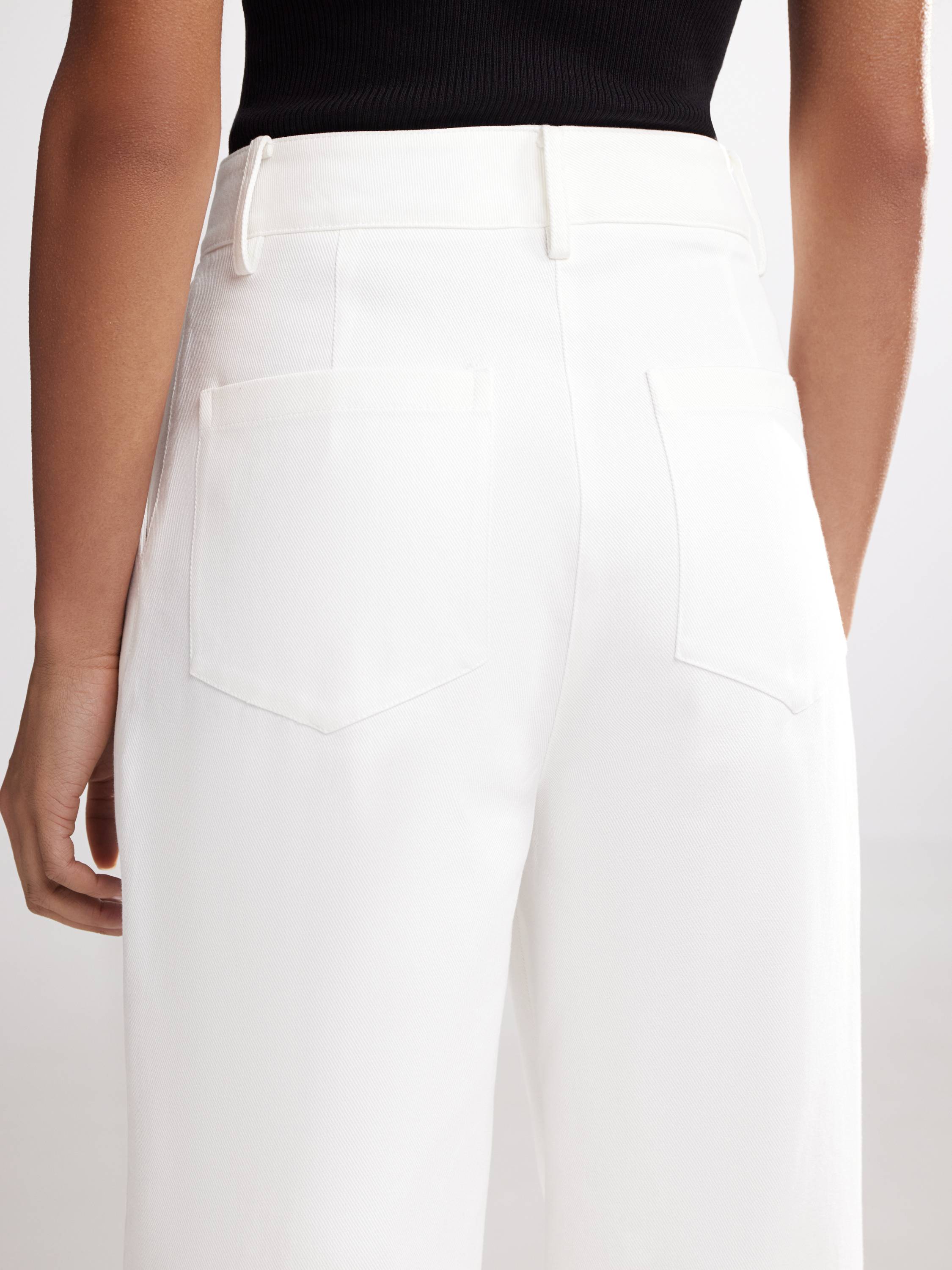 Прямые брюки из плотного хлопкового денима — лаконичная модель с собранным силуэтом и архитектурной чистотой линий. Материал отличается стабильной текстурой, приятен на ощупь и хорошо держит форму, при этом не теряя пластики в движении. Чистый молочный оттенок подчеркивает свежесть образа и делает акцент на фактуре ткани. Высокая посадка, аккуратные защипы и минималистичная конструкция с пятью карманами отсылают к классике, но читаются современно. Эта пара станет универсальной базой — и для городских образов в духе smart casual, и для расслабленных летних сочетаний с хлопковыми топами и кожаными минималистичными сандалиями.