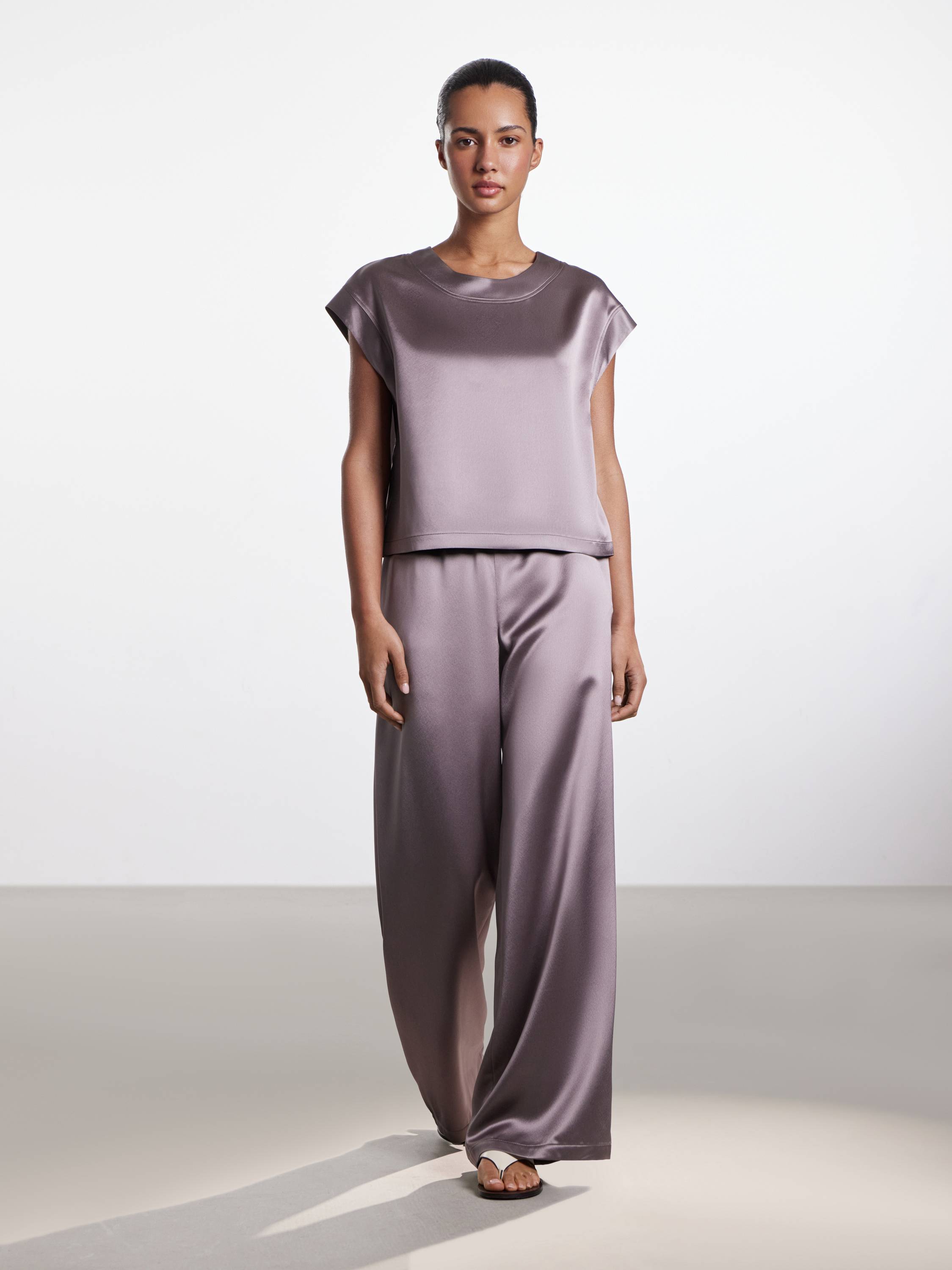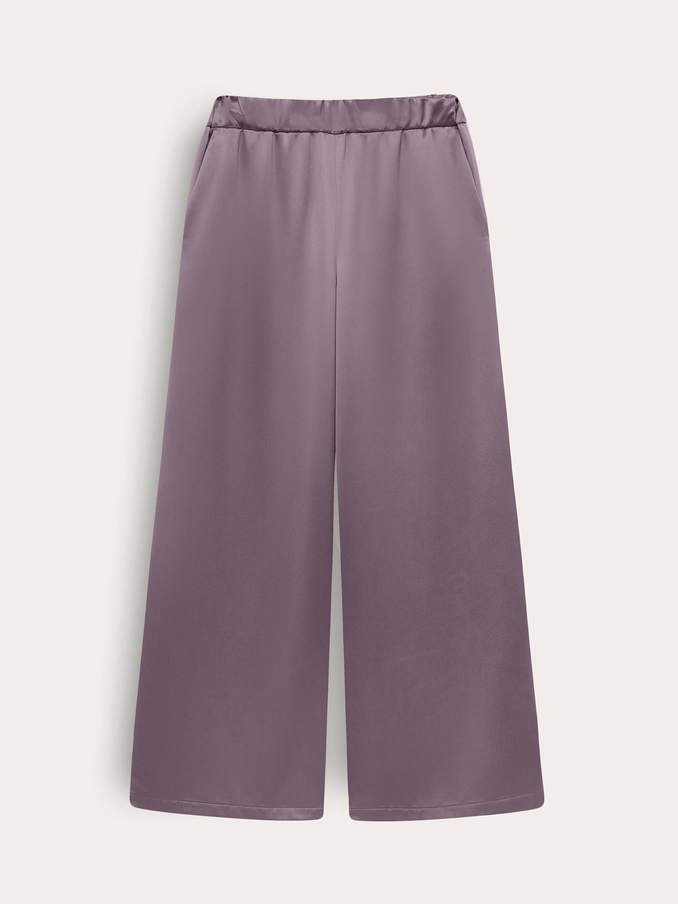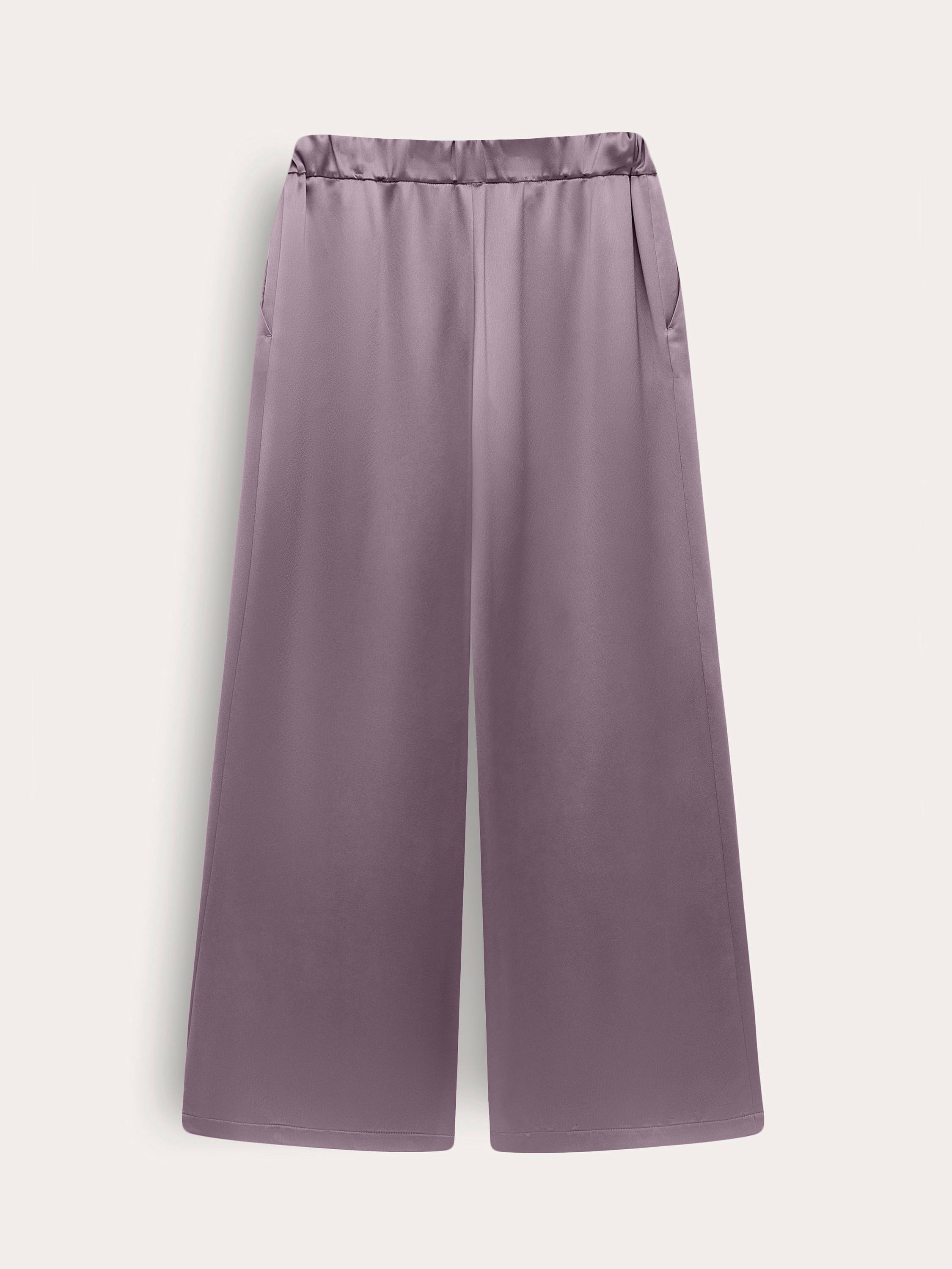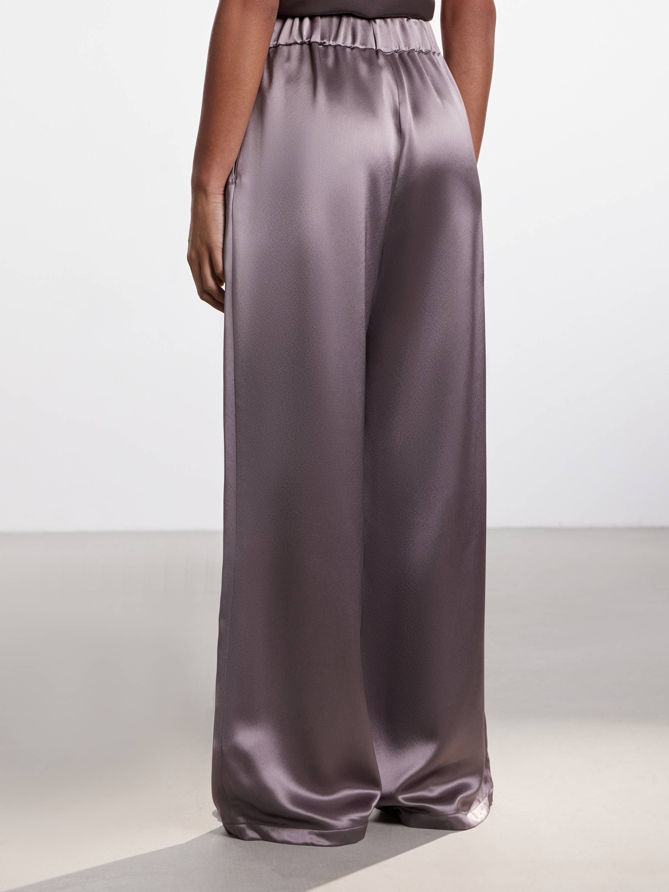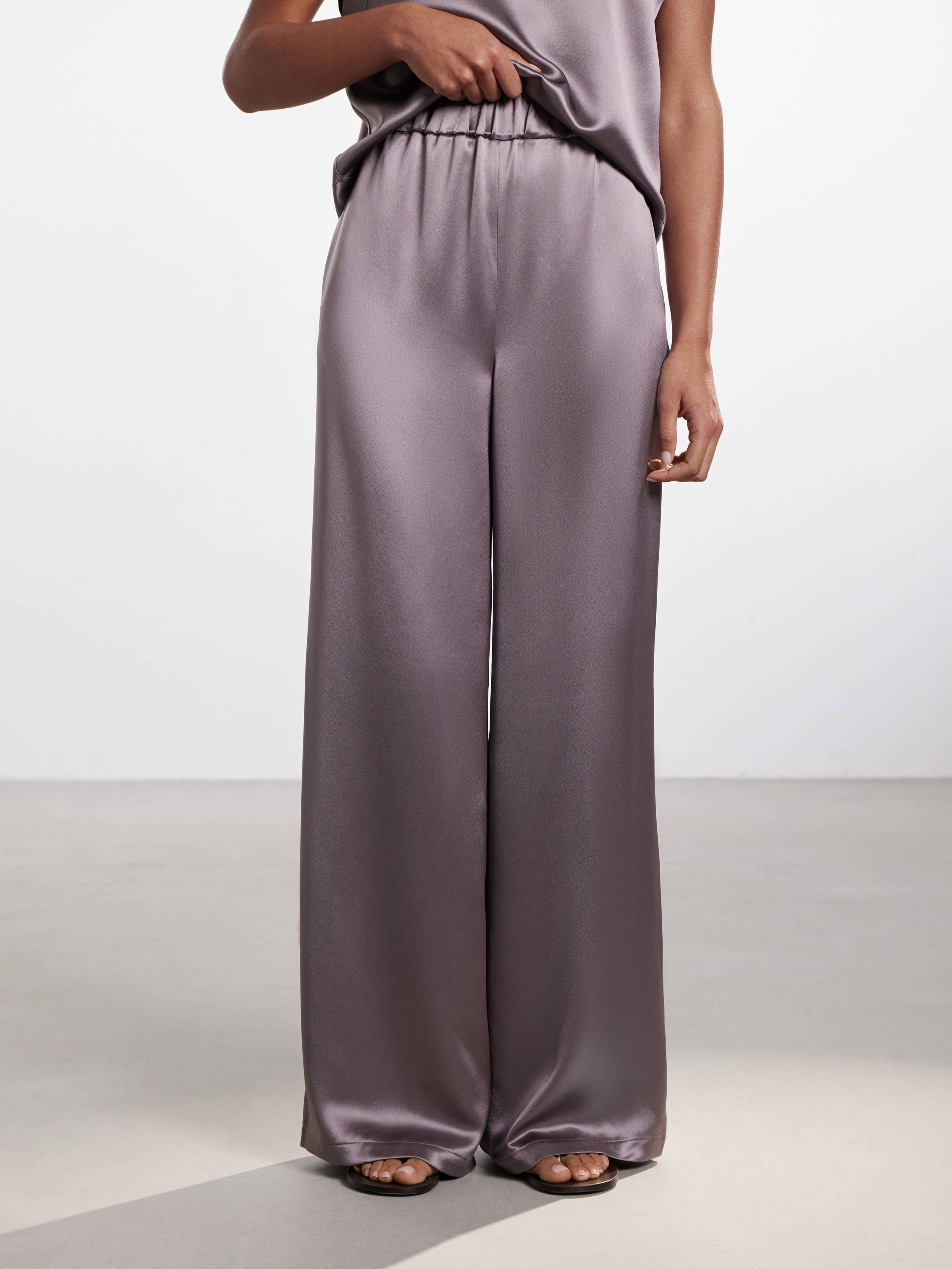 Свободные брюки с эластичной посадкой на талии созданы для тех, кто ценит эстетику движения и легкость линий. Материал с изысканным сатиновым блеском мягко отражает свет, подчеркивая архитектуру силуэта и текучесть формы. Деликатная драпировка по ноге визуально вытягивает силуэт и придает образу утонченность, а эластичный пояс обеспечивает комфорт в течение дня. Лаконичный крой делает модель идеальной базой: она одинаково органично смотрится и в комплекте с расслабленным топом, и в вечернем ансамбле с шелковой рубашкой или структурным жакетом.