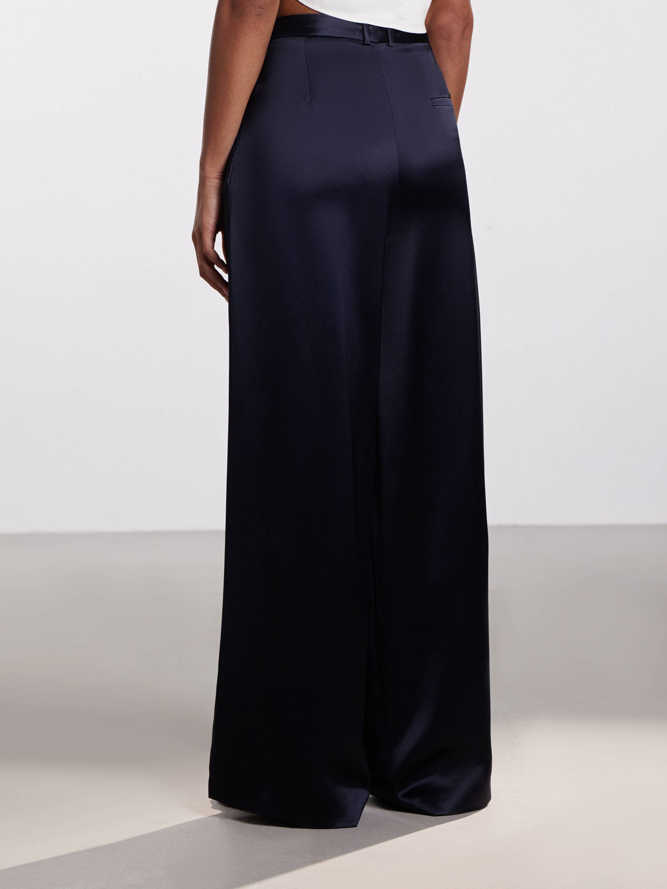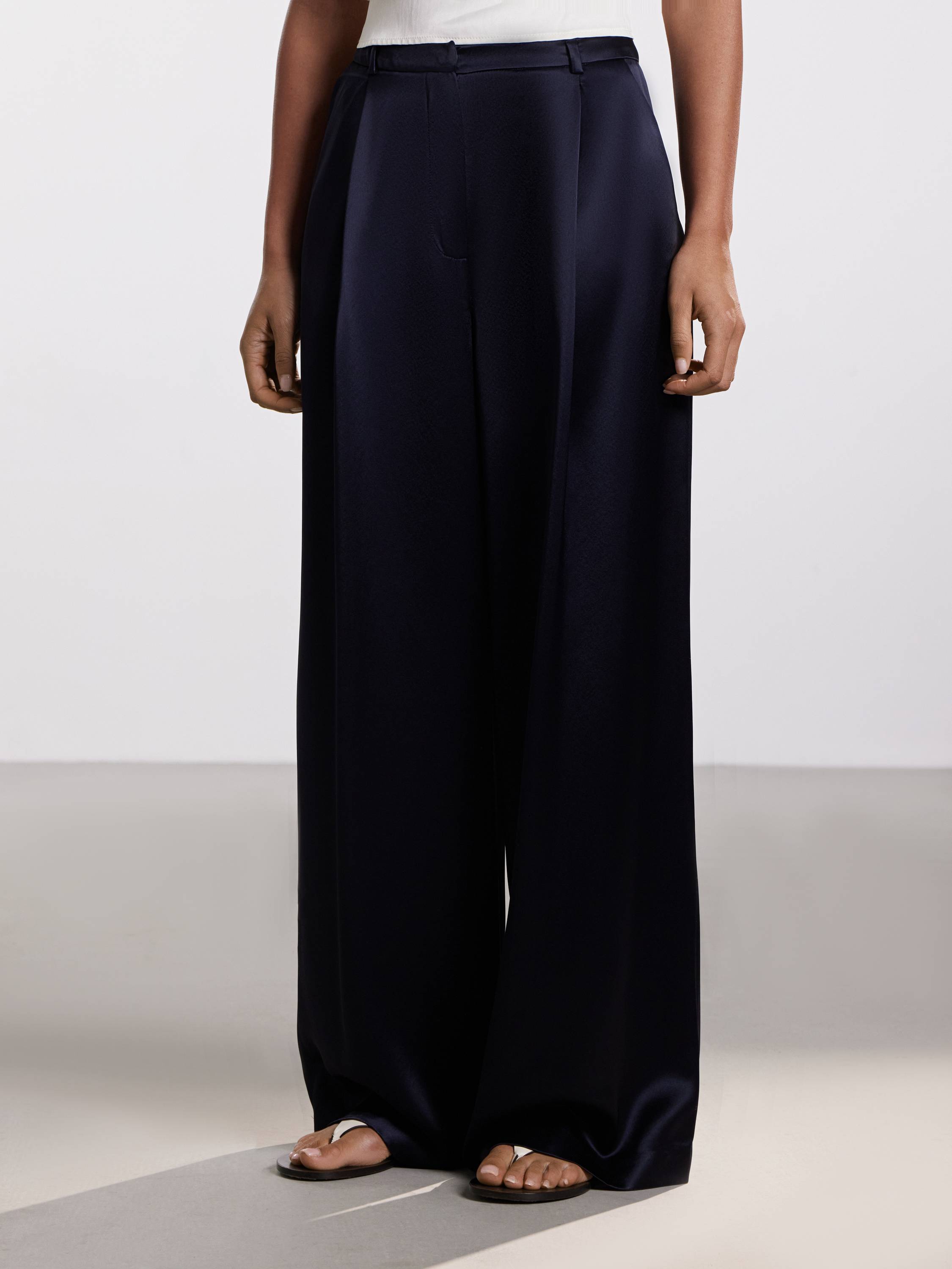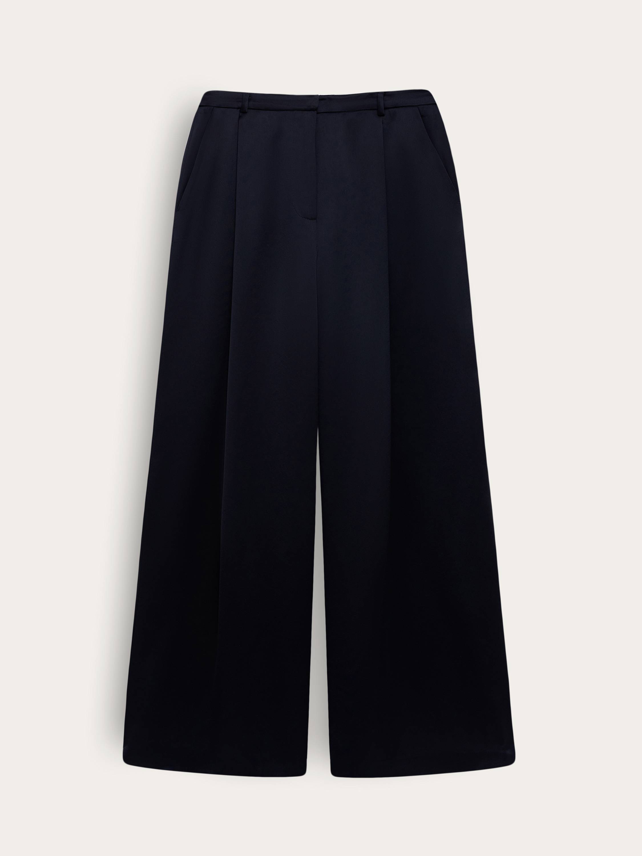 Широкие брюки из смесового ацетата — воплощение архитектурной легкости и премиального блеска в повседневном гардеробе. Мягкое полотно с деликатным сатиновым отливом элегантно обтекает силуэт, создавая ощущение текучести и свободы. Аккуратные защипы визуально вытягивают линию ног, а слегка удлиненный крой добавляет изысканности даже самым базовым комбинациям. Оттенки глубокого синего и черного звучат сдержанно и выразительно. Эти брюки легко адаптируются под разный настрой: от делового образа с жакетом до расслабленного сочетания с топом и сандалиями.