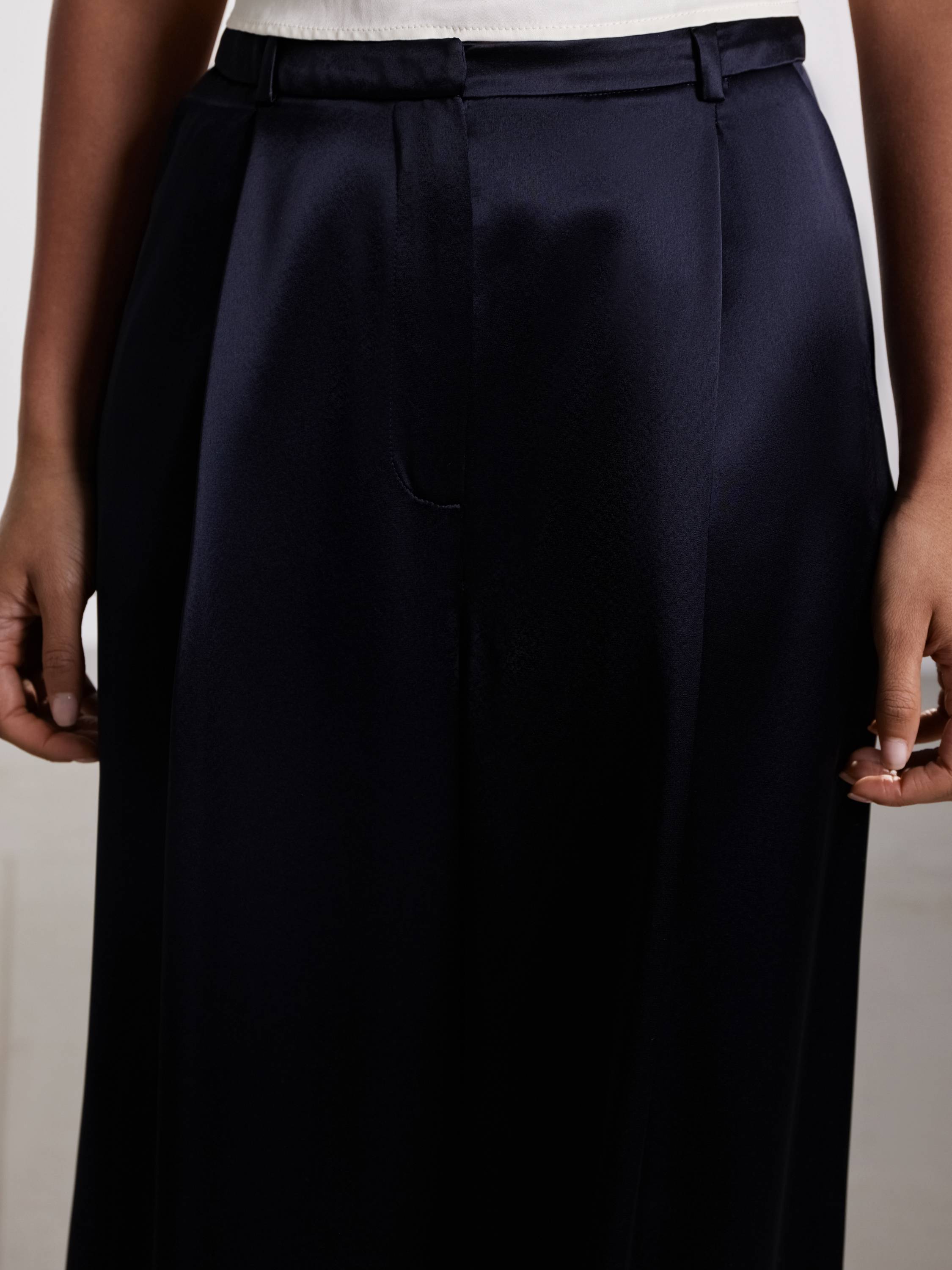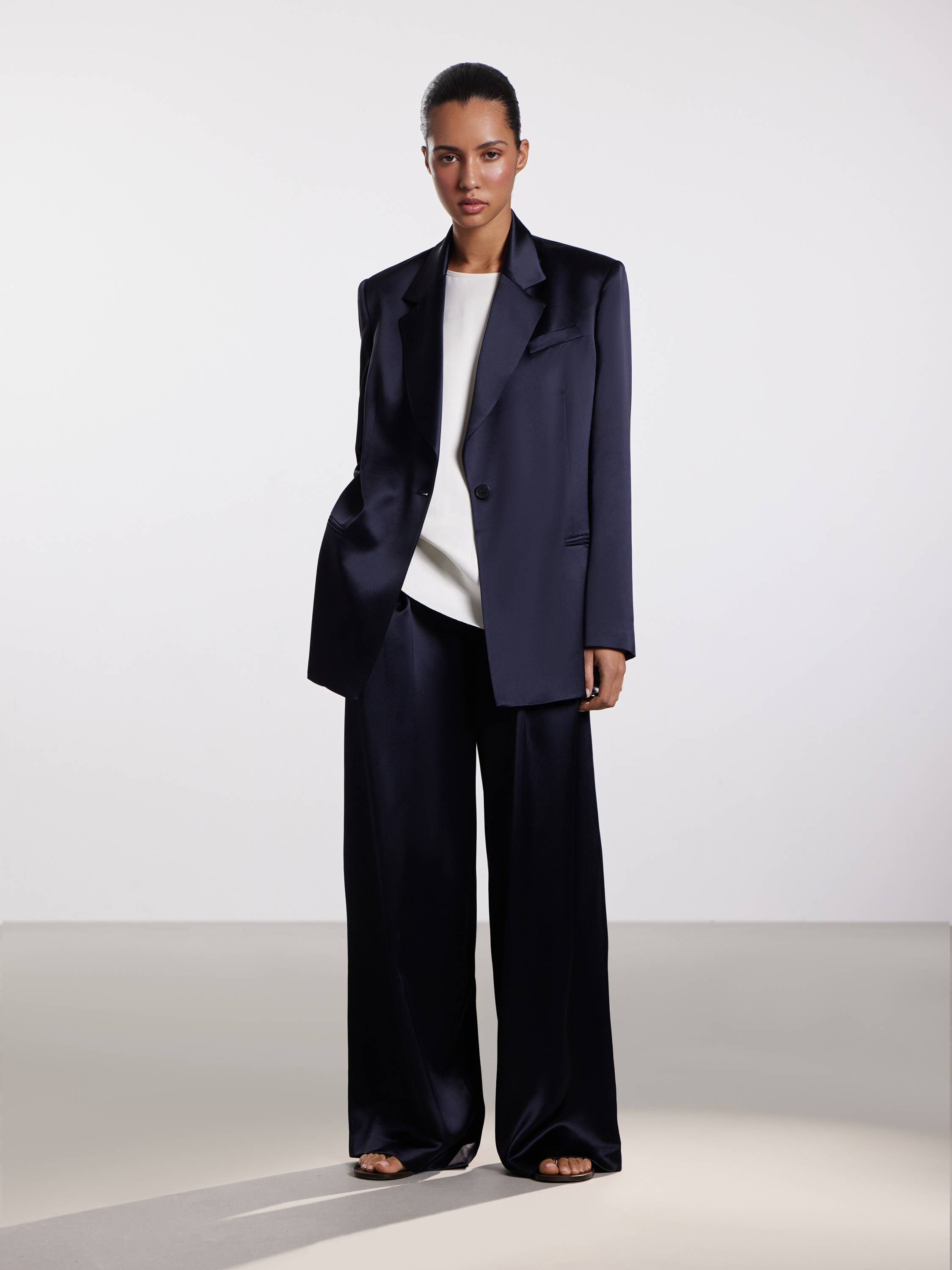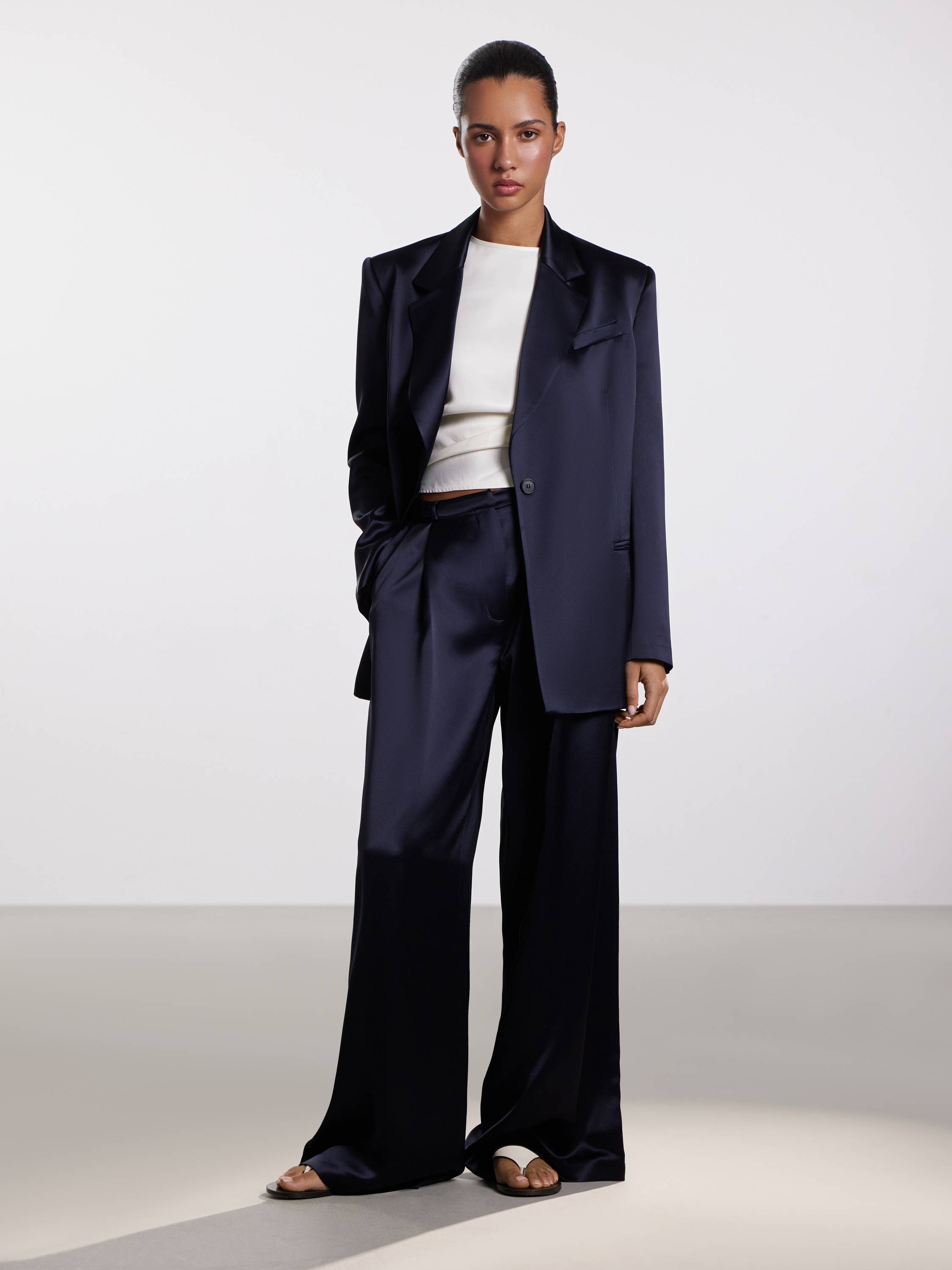 Широкие брюки из смесового ацетата — воплощение архитектурной легкости и премиального блеска в повседневном гардеробе. Мягкое полотно с деликатным сатиновым отливом элегантно обтекает силуэт, создавая ощущение текучести и свободы. Аккуратные защипы визуально вытягивают линию ног, а слегка удлиненный крой добавляет изысканности даже самым базовым комбинациям. Оттенки глубокого синего и черного звучат сдержанно и выразительно. Эти брюки легко адаптируются под разный настрой: от делового образа с жакетом до расслабленного сочетания с топом и сандалиями.