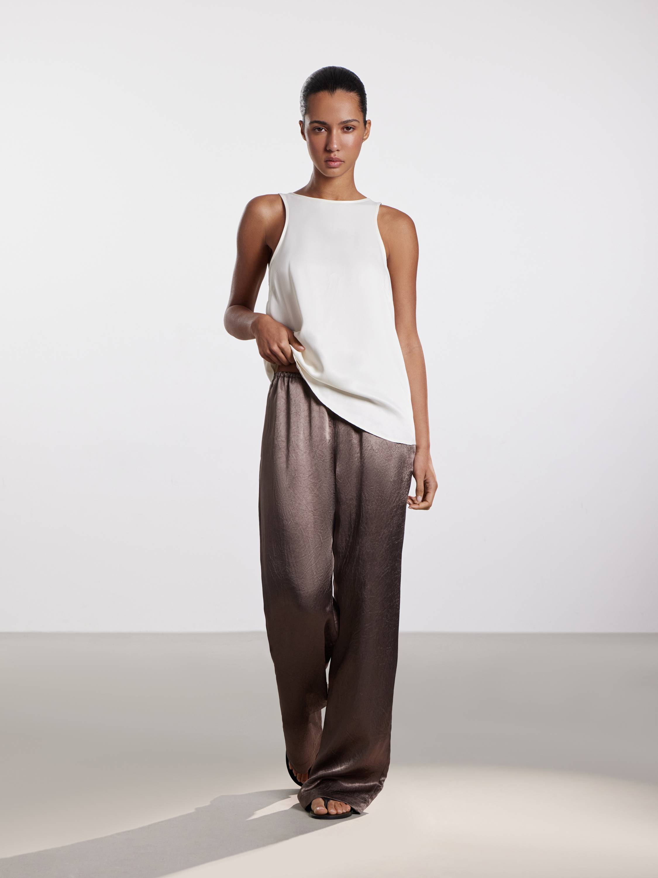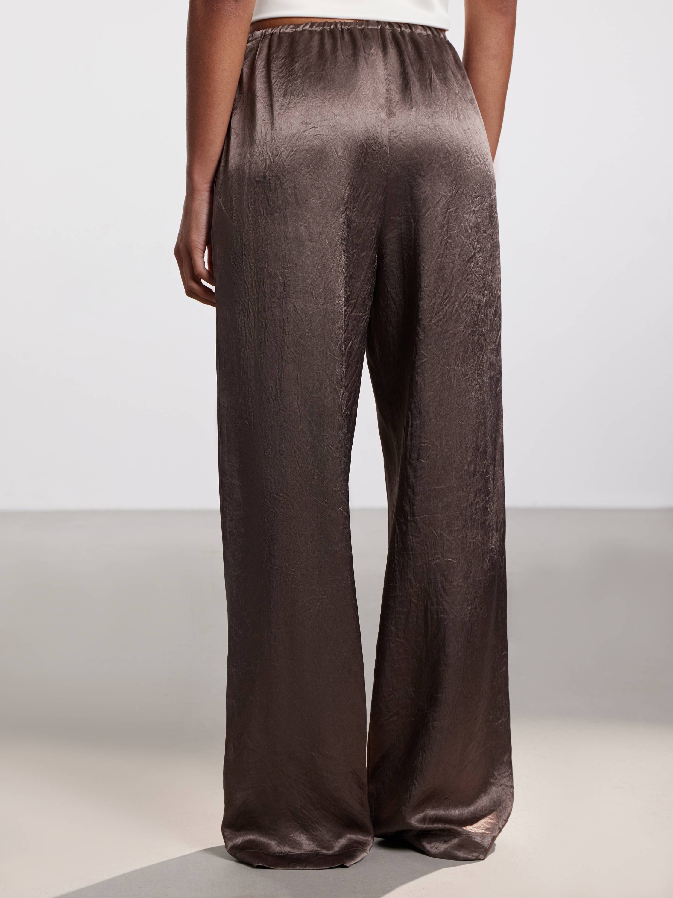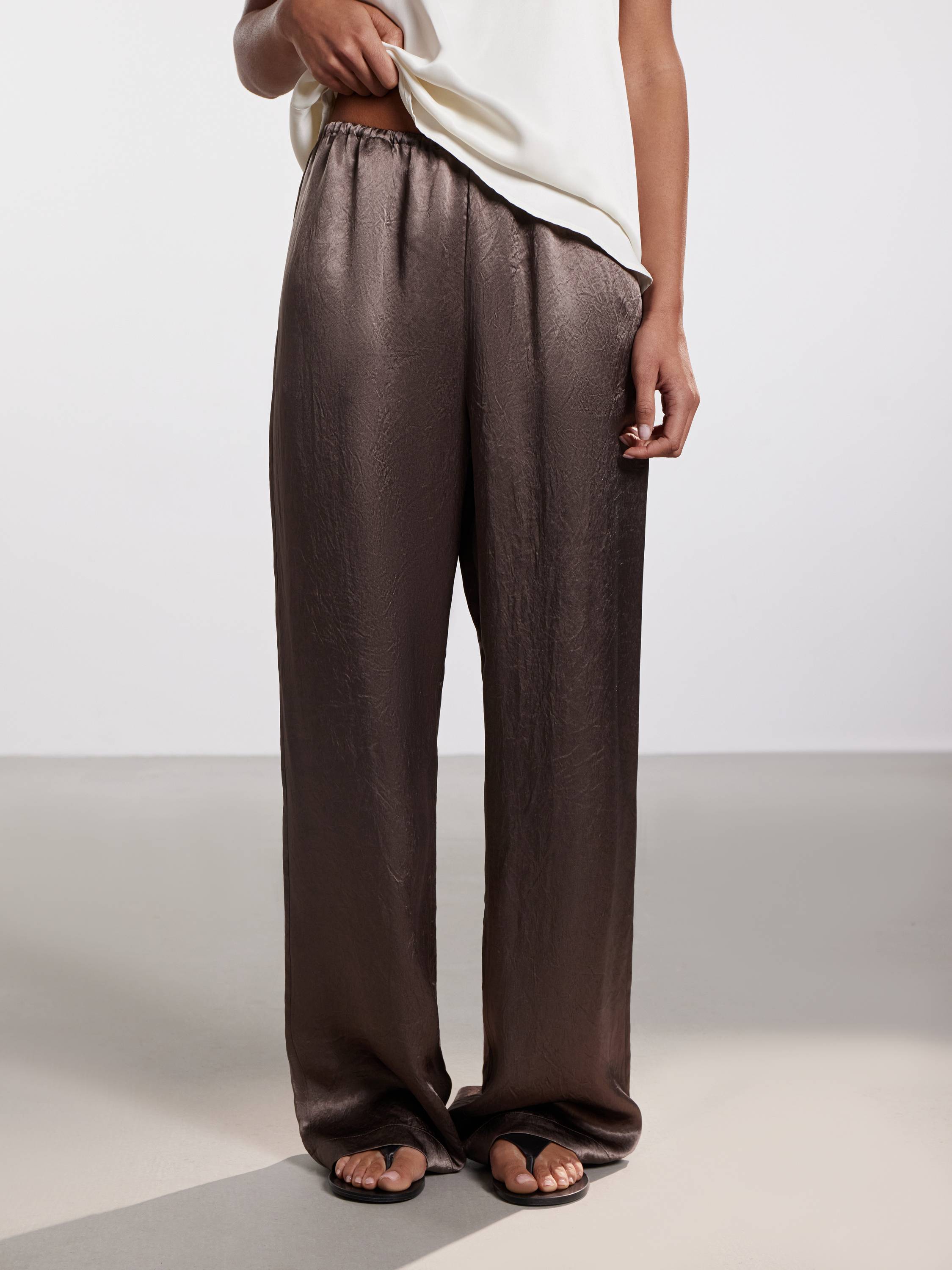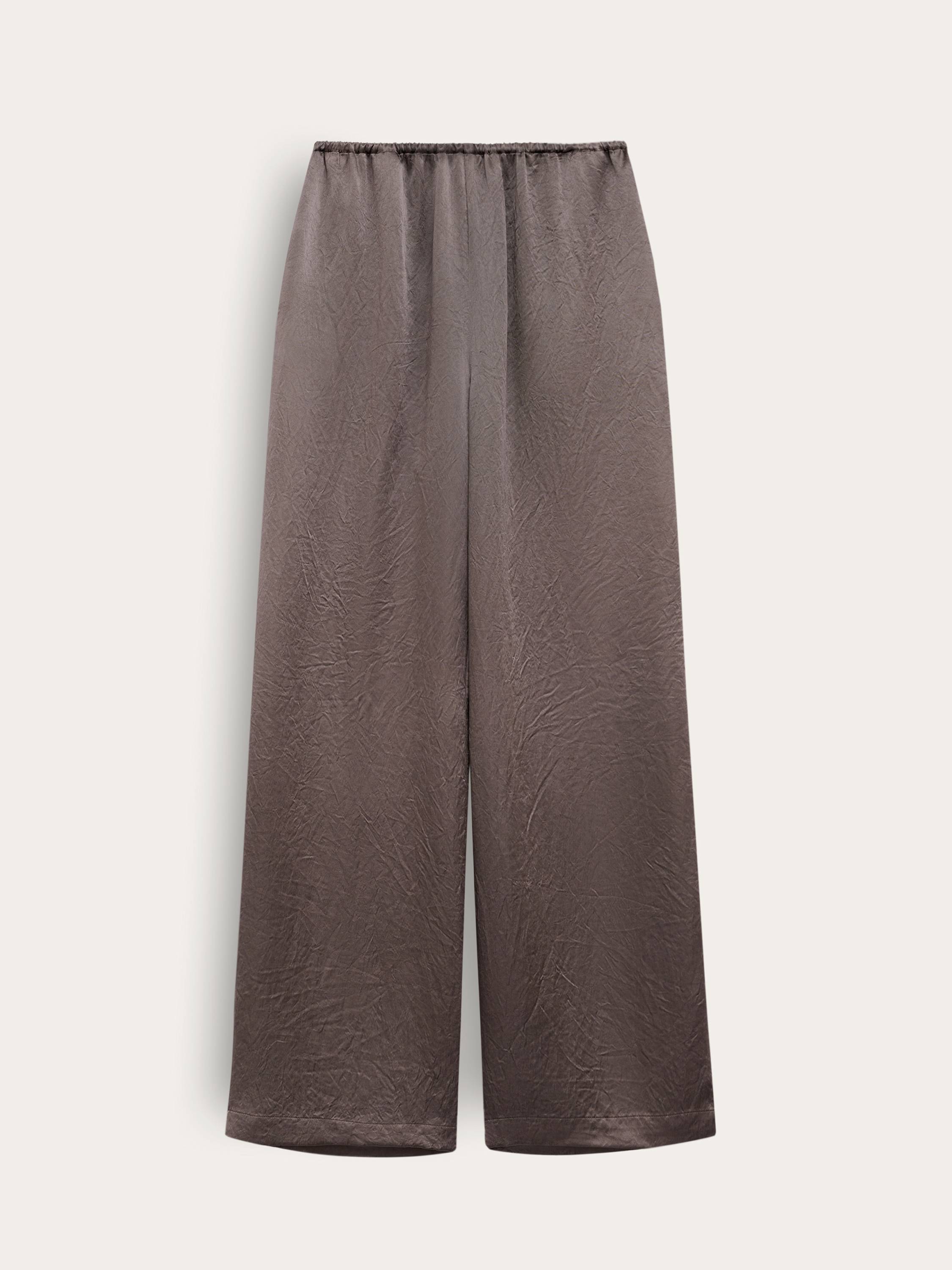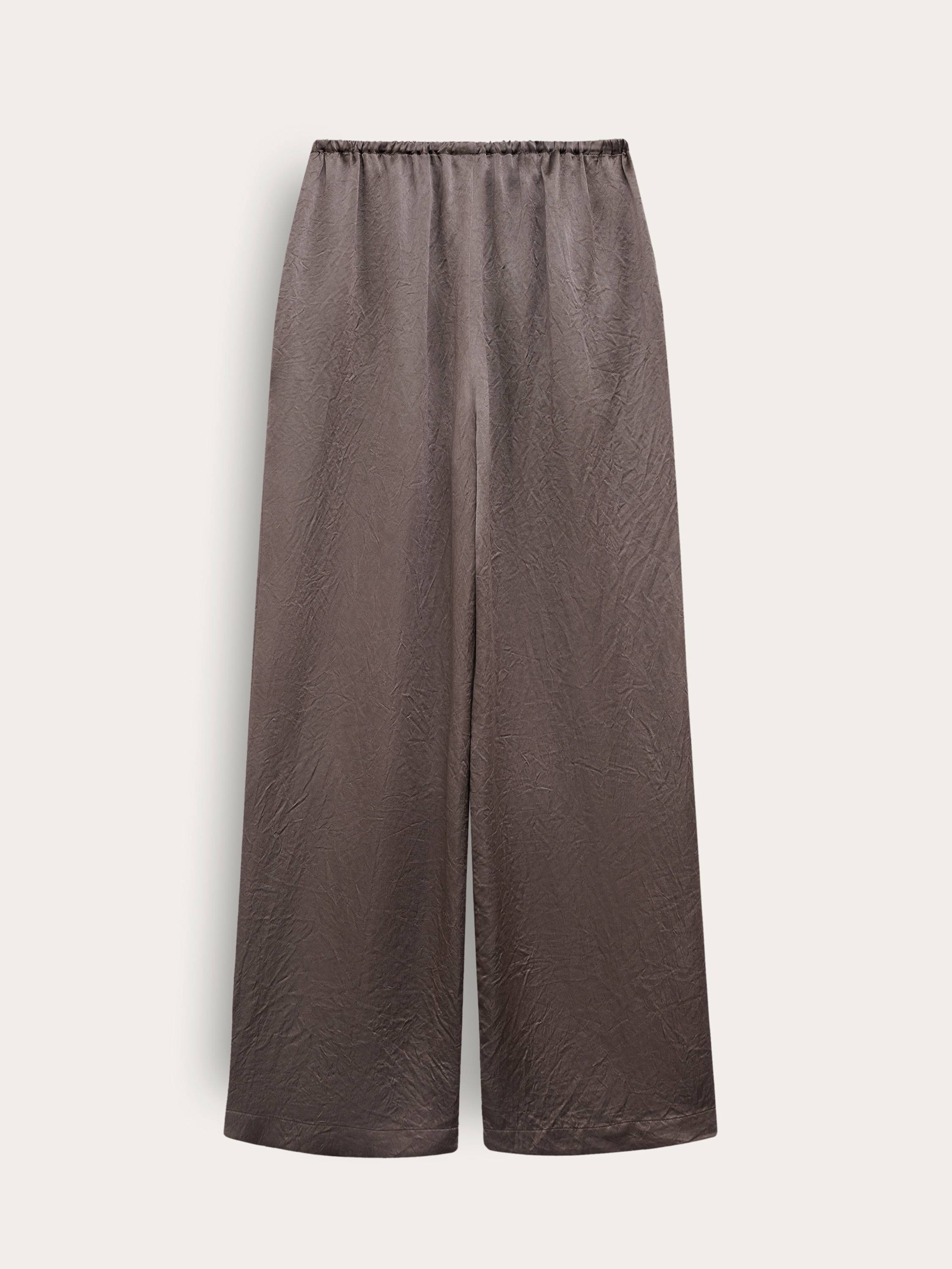 Брюки из 100% ацетата в глубоком оттенке хаки — легкая и выразительная модель с характерной фактурой. Мягкий блеск поверхности дополнен эффектом жатости, благодаря чему ткань выглядит особенно живо и пластично. Свободный силуэт с прямыми штанинами и эластичным поясом обеспечивает комфортную посадку и подчеркивает расслабленный ритм образа. Тонкая текстура ацетата дарит прохладу, деликатно ложится по фигуре и красиво драпируется при движении. Эти брюки можно вписать как в повседневные ансамбли, так и в более собранные комплекты с акцентом на фактуру и стилистическую чистоту.