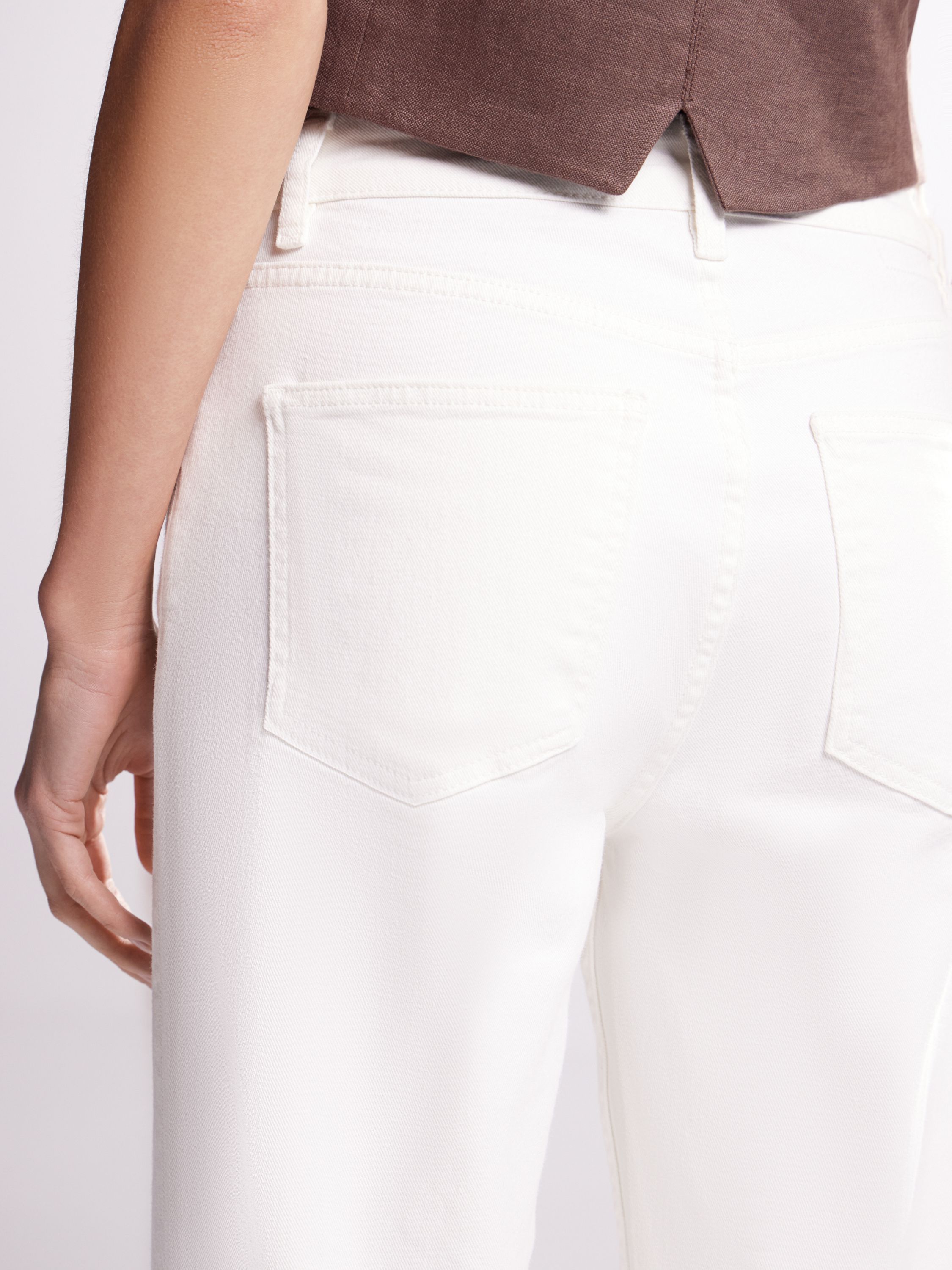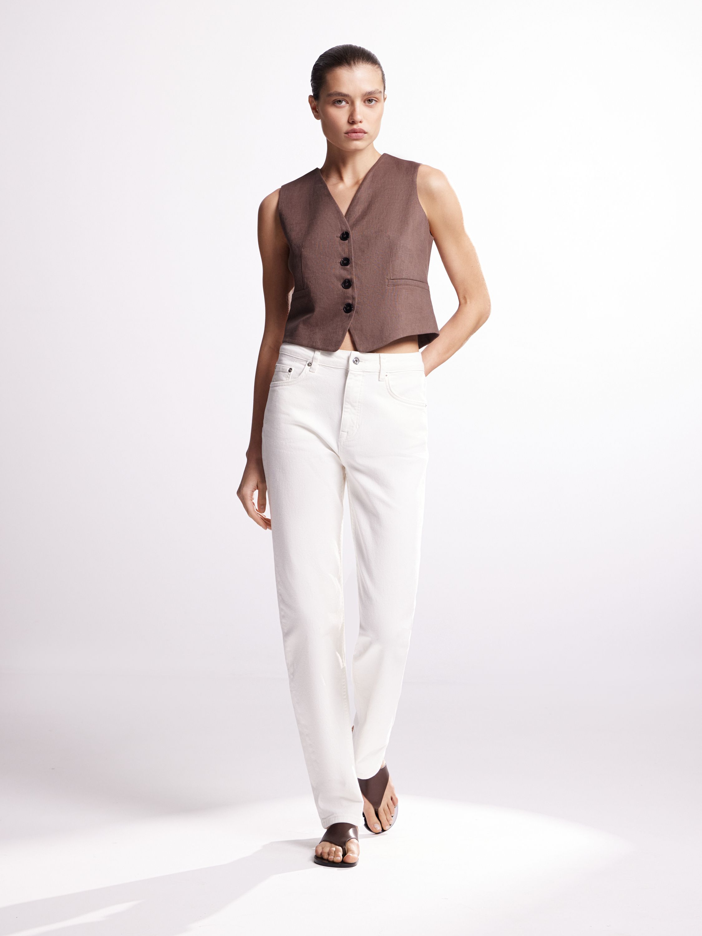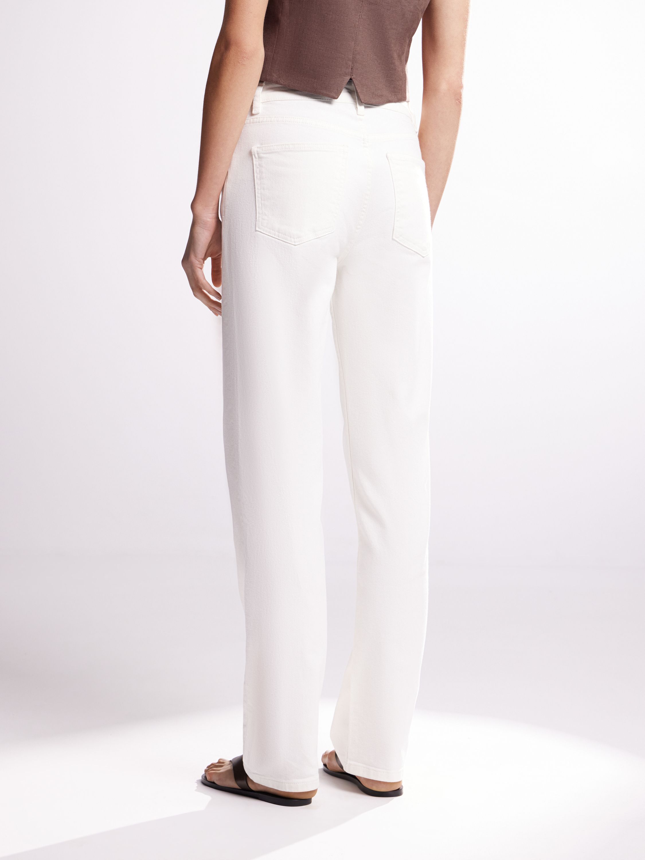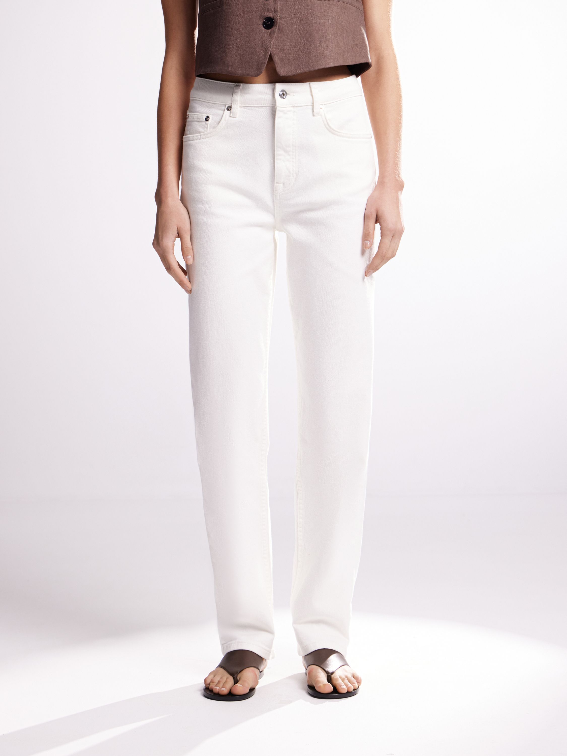 Чистый крой, прямой силуэт, архитектурная посадка. Эти брюки из хлопкового денима переосмысливают базовую форму с акцентом на выверенность и структуру. Плотная ткань держит форму, но не перегружает — визуально вытягивает силуэт и добавляет четкости образу. Средняя посадка, классическая застежка, пять карманов и лаконичная отделка — все работает на сдержанность и актуальность. Носится с жилетами, футболками, рубашками — от повседневных образов до вечерних с минимальными усилиями.
