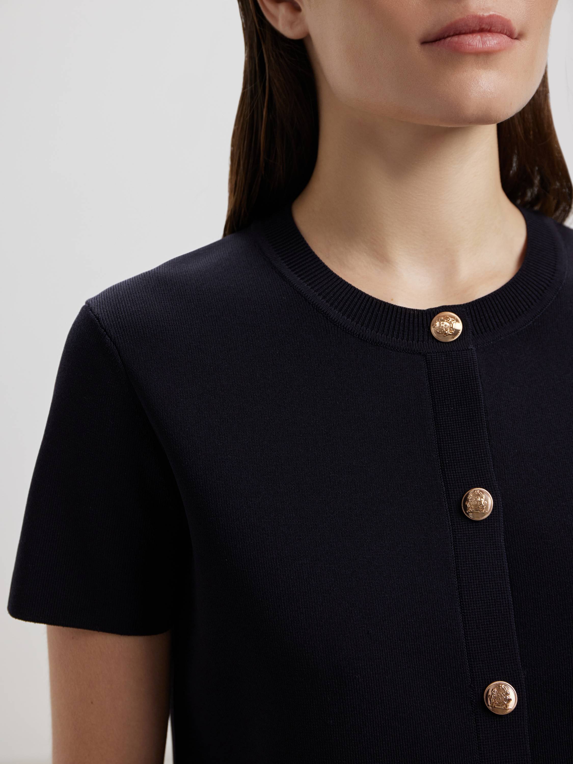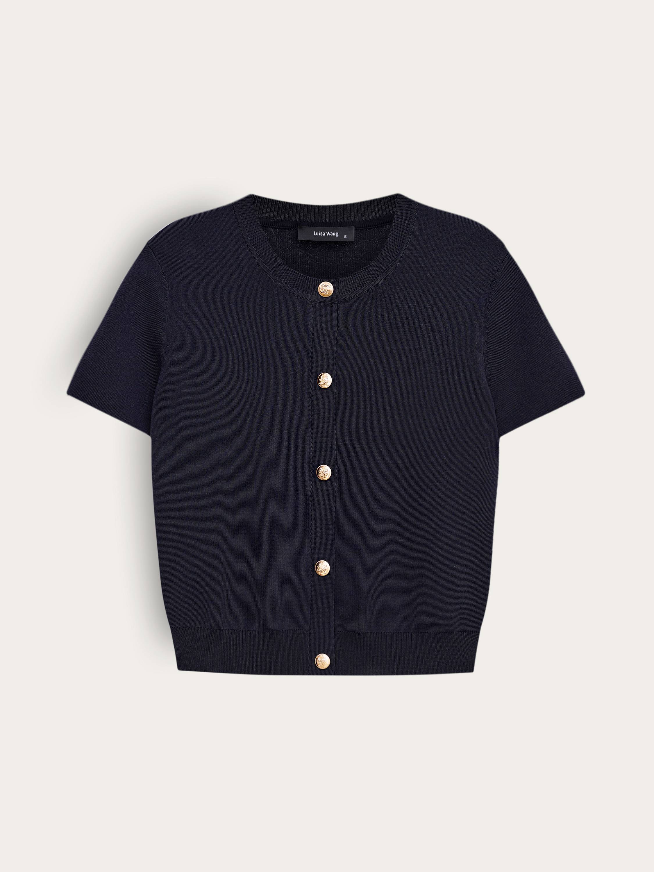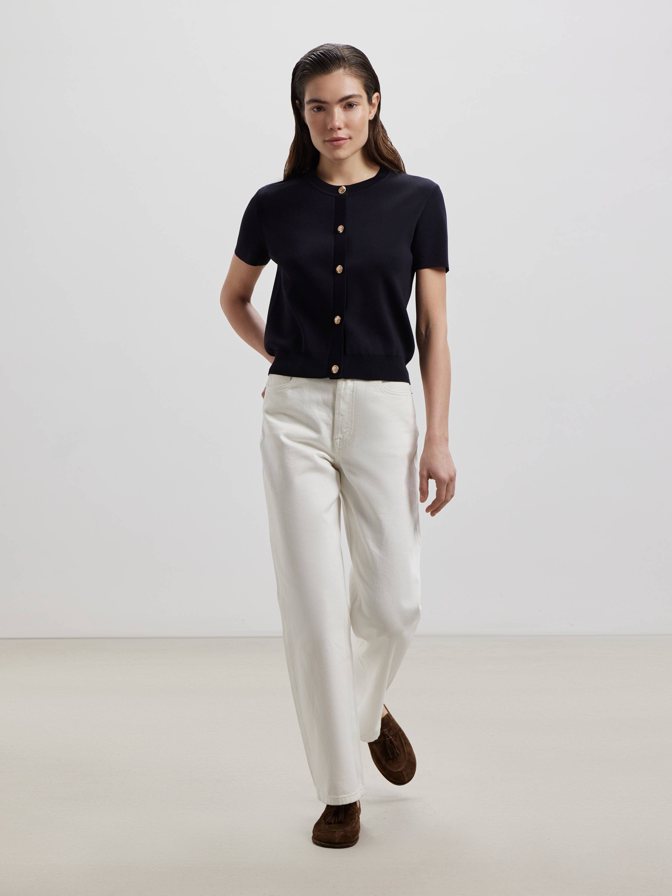 Кардиган с короткими рукавами, выполненный из мягкого трикотажа на вискозной основе, объединяет лаконичную форму и выразительные детали. Фактурная контрастная планка и фигурные пуговицы с гравировкой придают модели винтажное настроение и подчеркивают геометрию образа. Классическая полоска делает акцент на линии плеч и добавляет графичности, а лаконичный крой позволяет сочетать кардиган с джинсами, юбками и шортами. Модель представлена в двух оттенках — молочном с темным кантом и глубоком темно-синем.