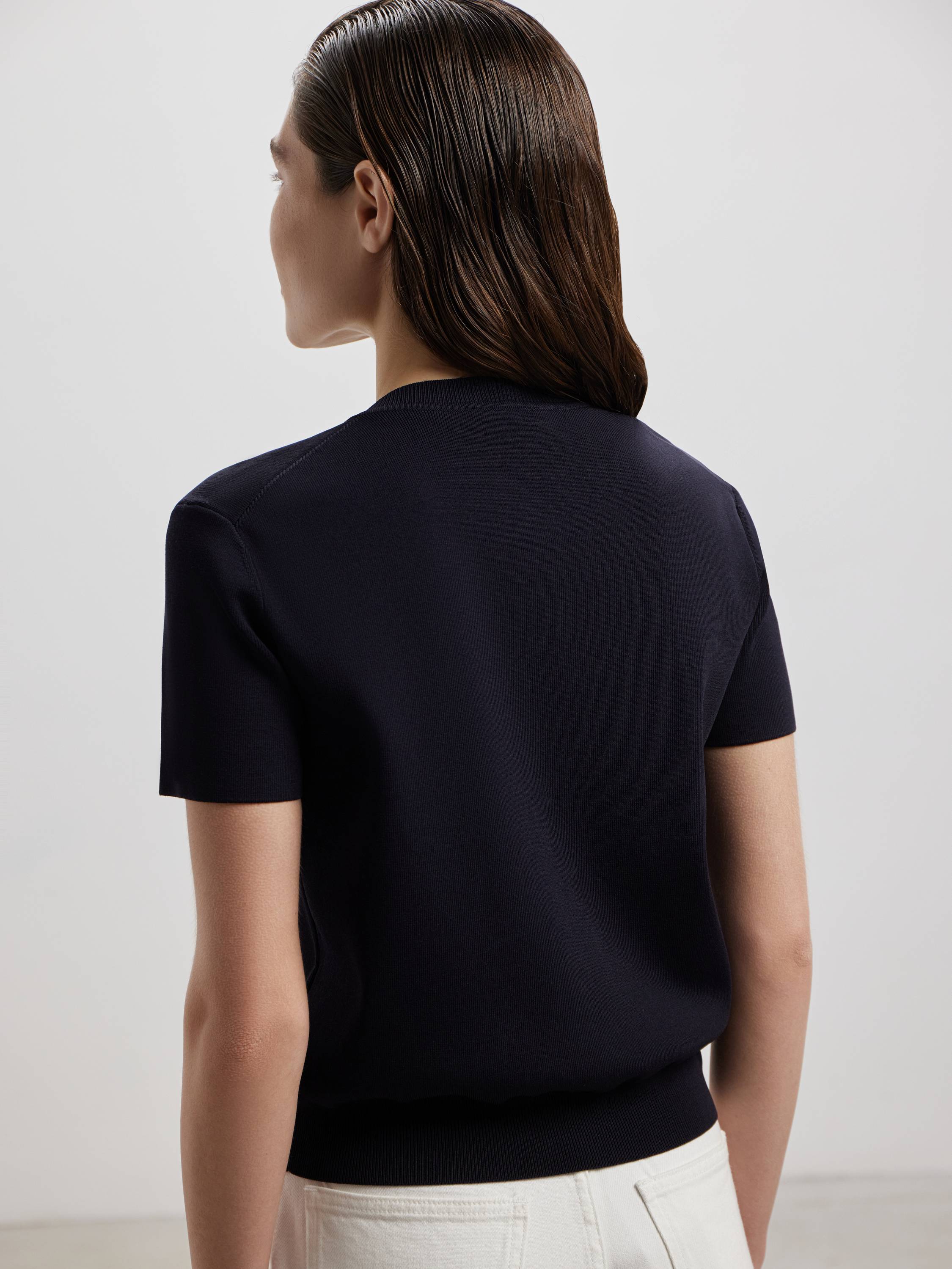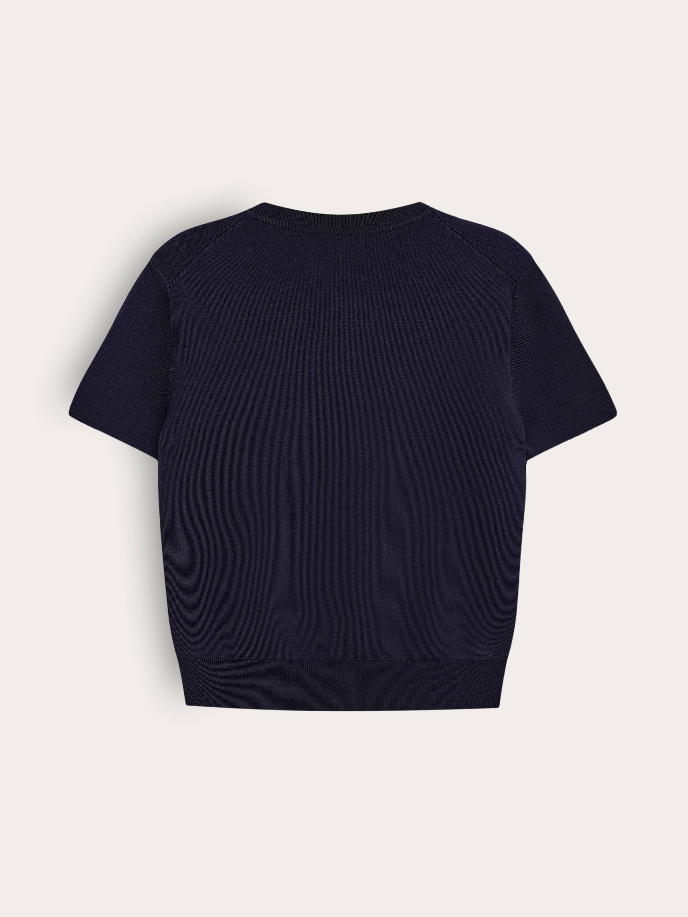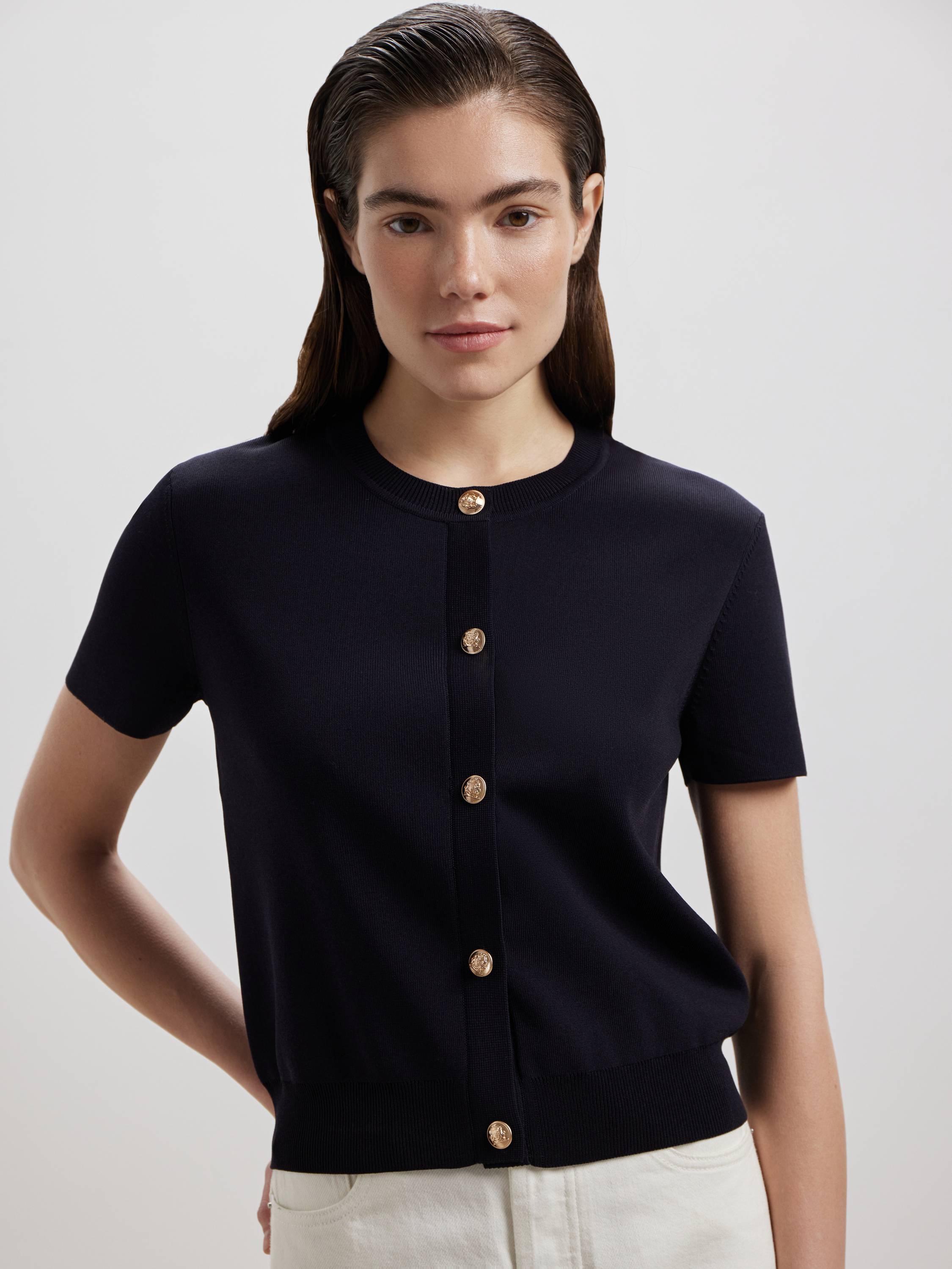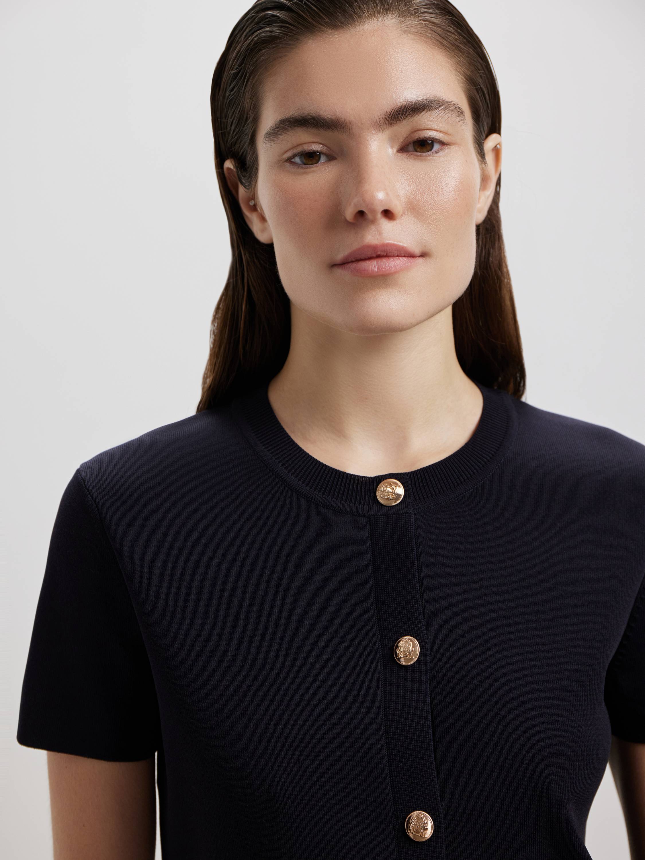 Кардиган с короткими рукавами, выполненный из мягкого трикотажа на вискозной основе, объединяет лаконичную форму и выразительные детали. Фактурная контрастная планка и фигурные пуговицы с гравировкой придают модели винтажное настроение и подчеркивают геометрию образа. Классическая полоска делает акцент на линии плеч и добавляет графичности, а лаконичный крой позволяет сочетать кардиган с джинсами, юбками и шортами. Модель представлена в двух оттенках — молочном с темным кантом и глубоком темно-синем.