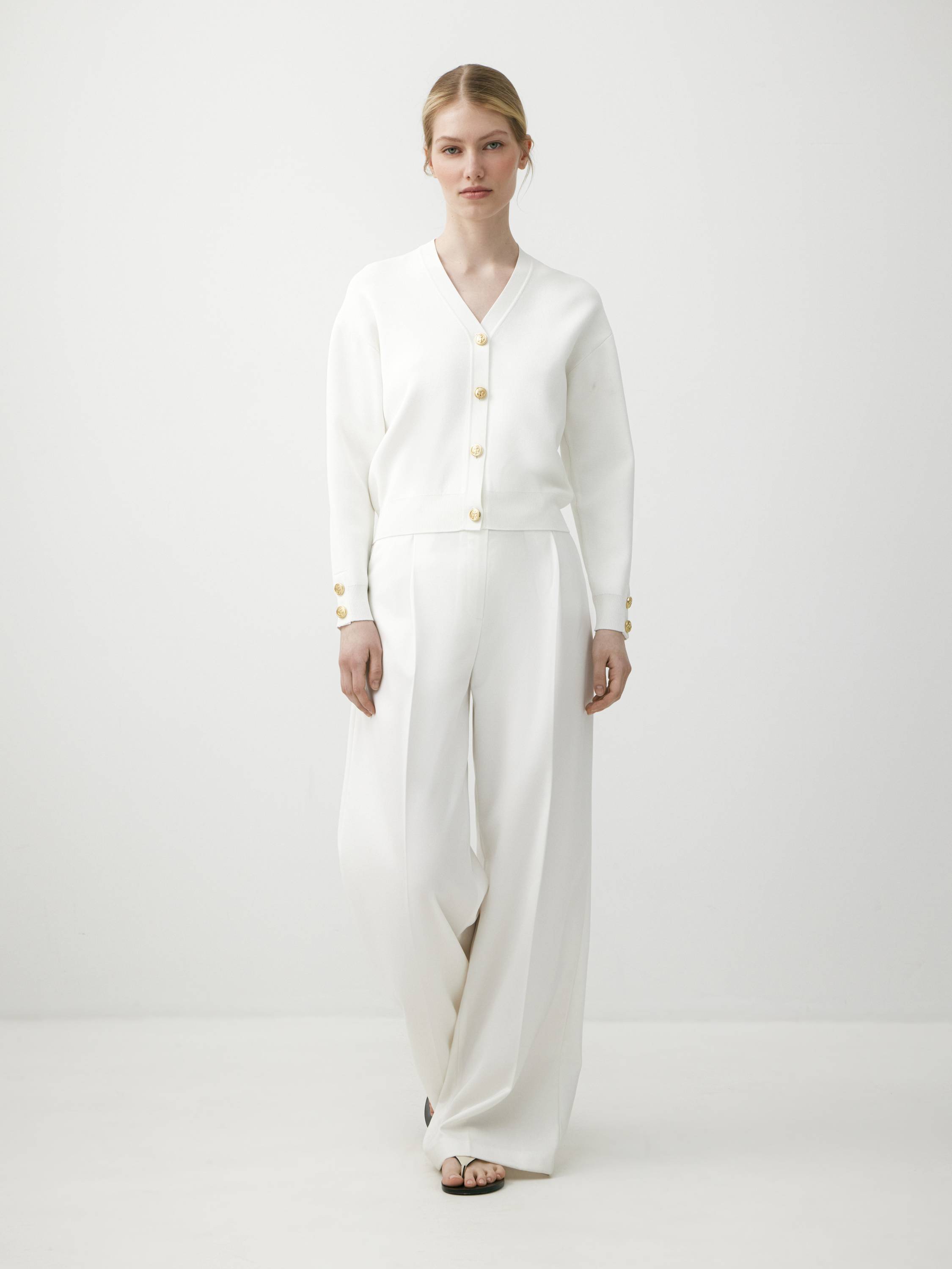 Минималистичный кардиган с V-образным вырезом и акцентной фурнитурой — лаконичный и универсальный элемент базового гардероба. Модель выполнена из мягкого, эластичного трикотажа со слегка шелковистой поверхностью. Контрастные золотистые пуговицы с декоративной гравировкой добавляют образу выразительности, сохраняя при этом элегантный настрой. Прямой крой и два классических оттенка — белый и шоколадный — позволяют сочетать кардиган с джинсами, брюками или юбками в расслабленном или более собранном стиле.