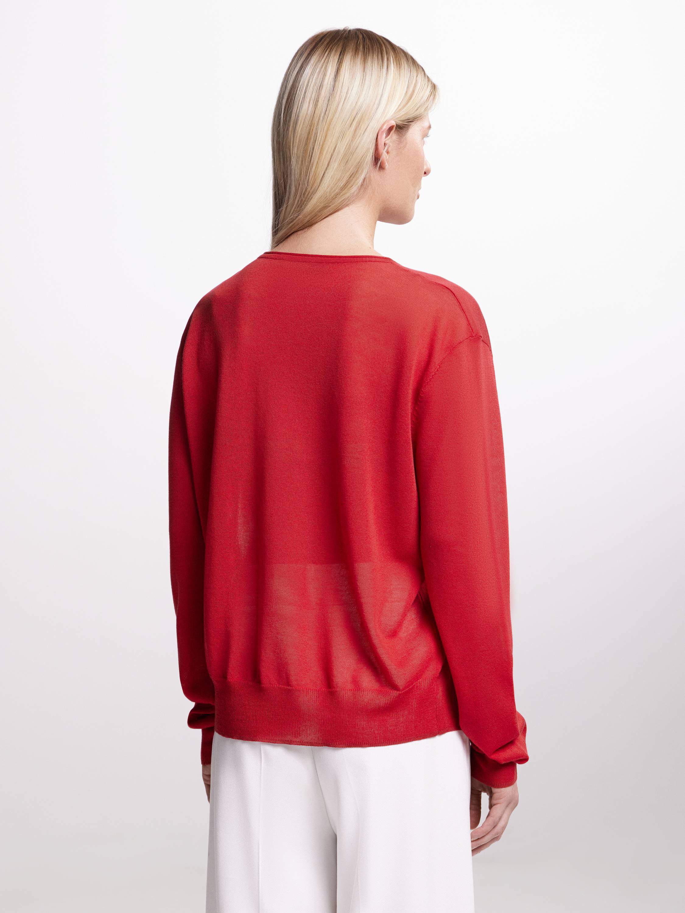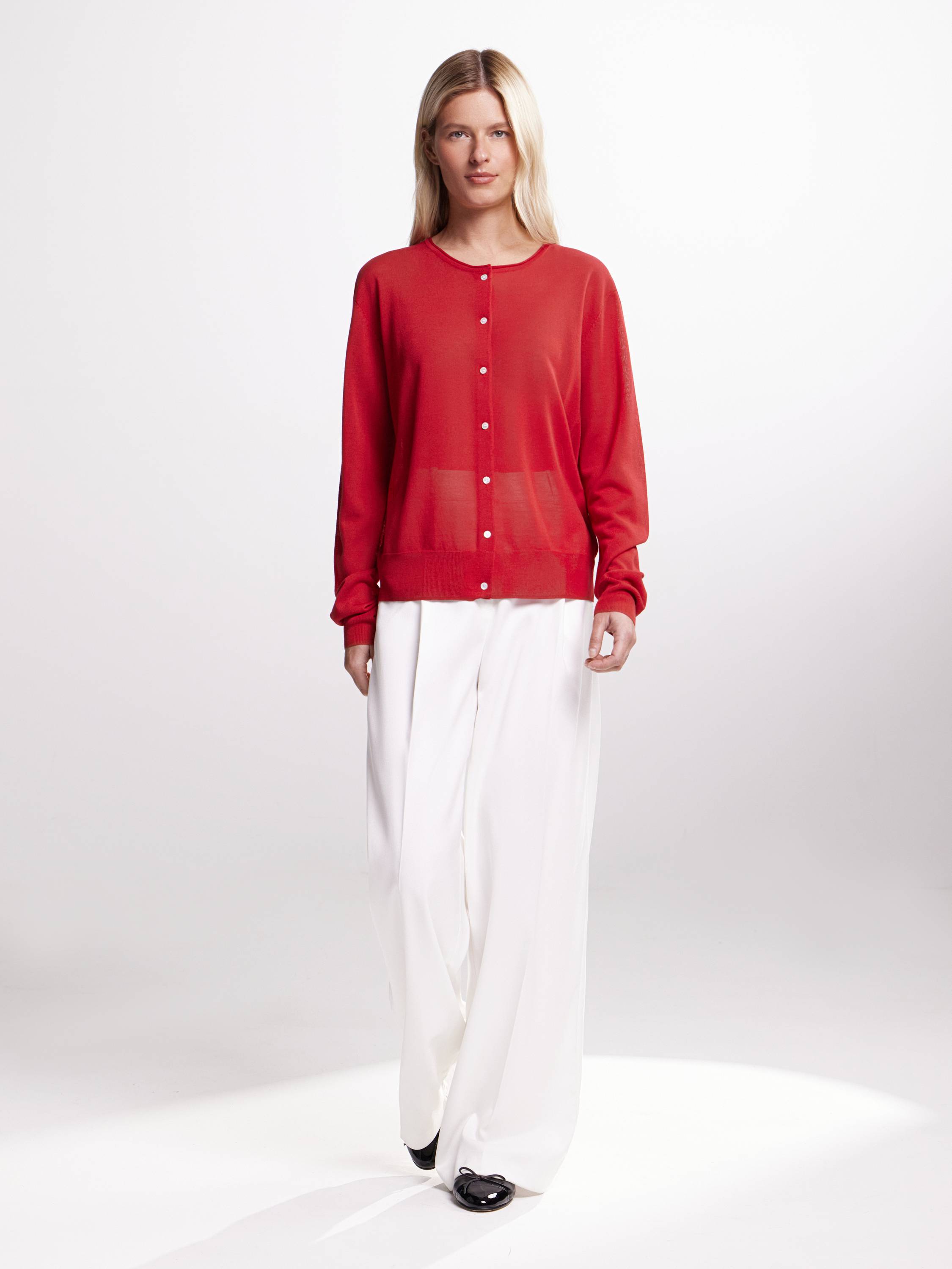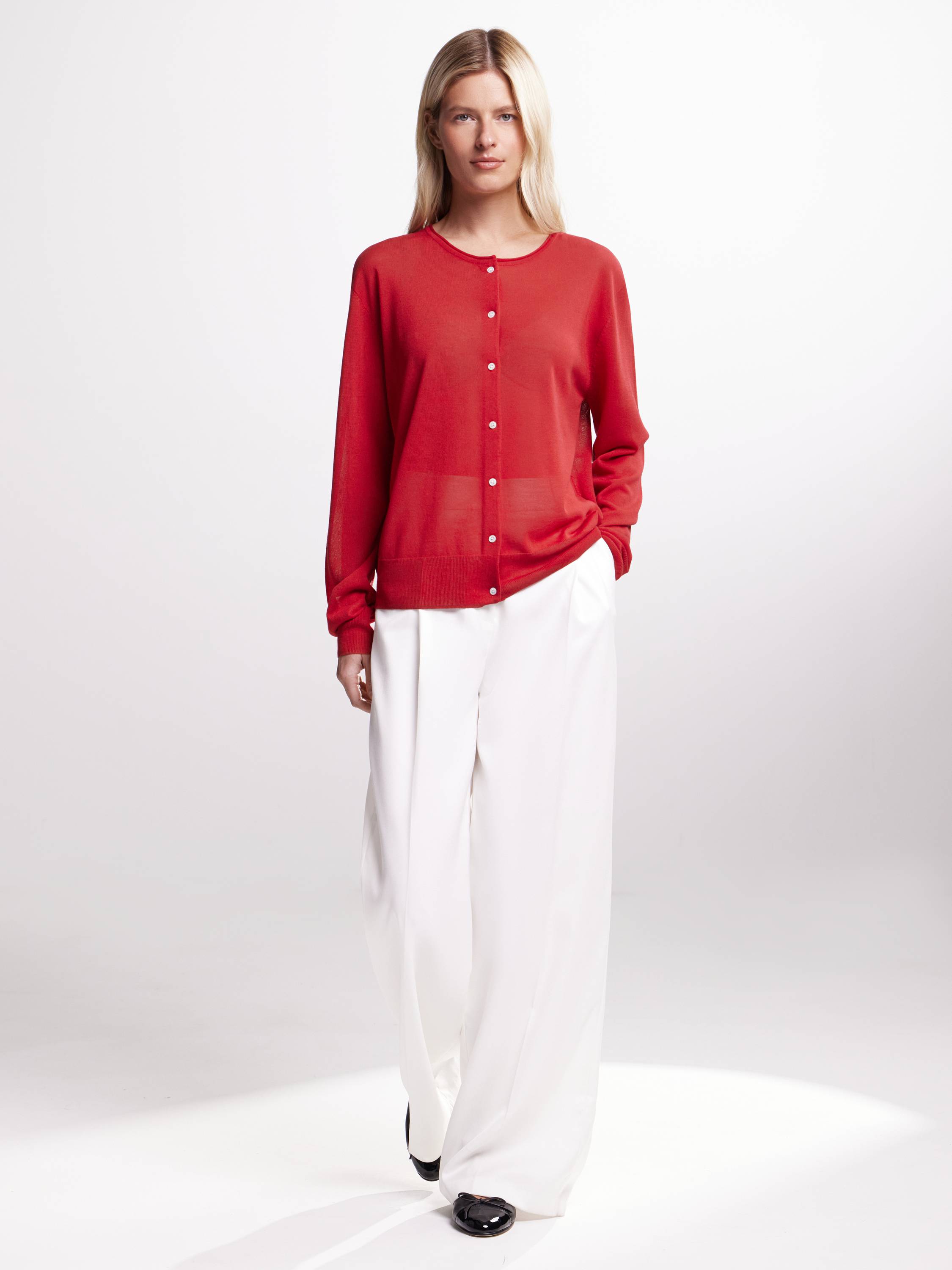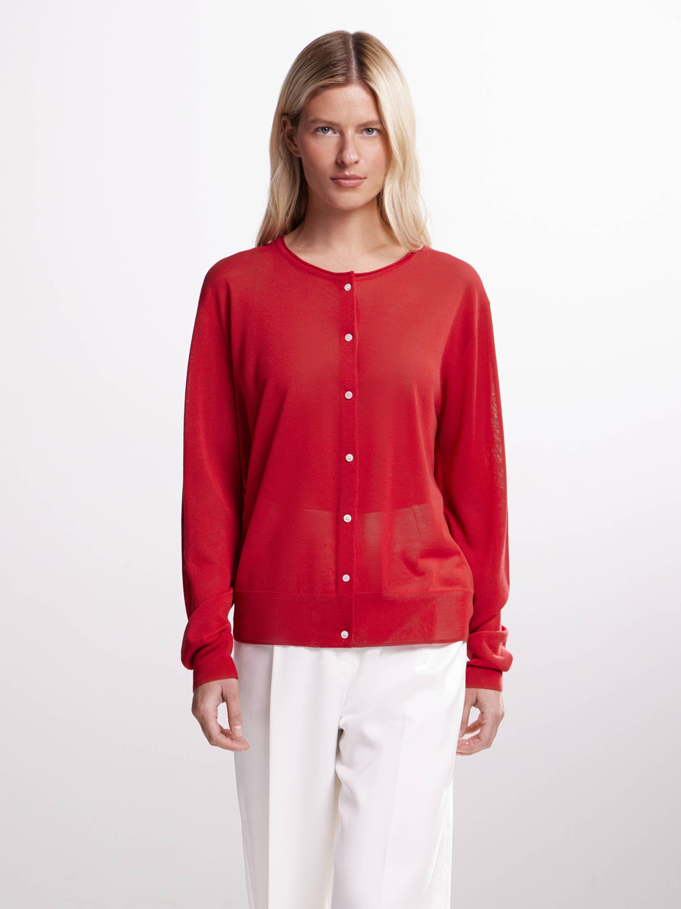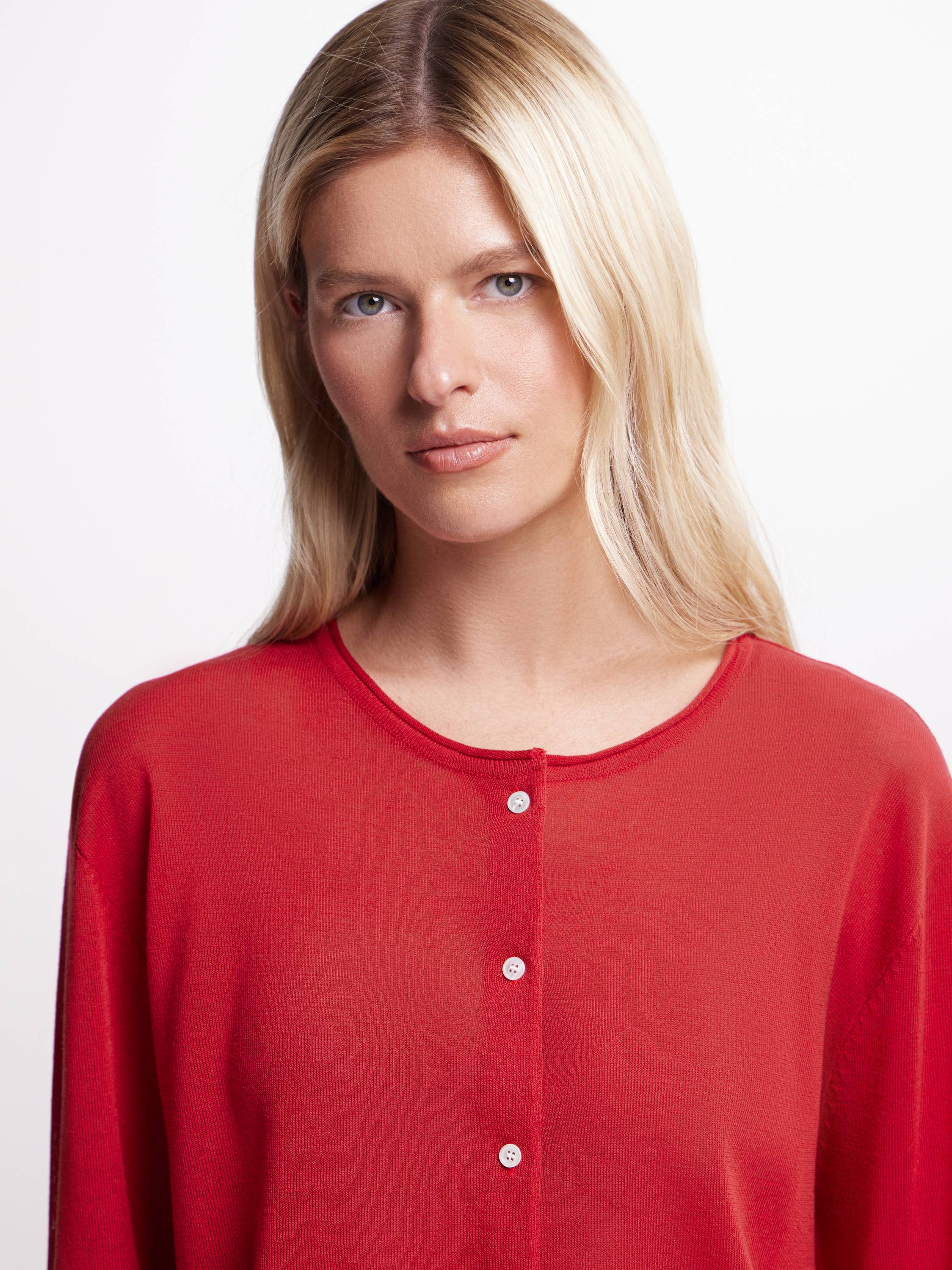 Полупрозрачный кардиган из тонкого трикотажа — воздушный и универсальный. Прямой крой с мягкой линией плеч создает расслабленный силуэт, а широкая планка и аккуратные пуговицы делают образ собранным. Полотно на основе лиоцелла приятно к телу, дышит и красиво драпируется, подчеркивая текучесть движения. Модель представлена в двух оттенках — насыщенном темно-синем и выразительном красном. Такой кардиган можно носить как самостоятельно, так и в составе многослойных летних образов.
