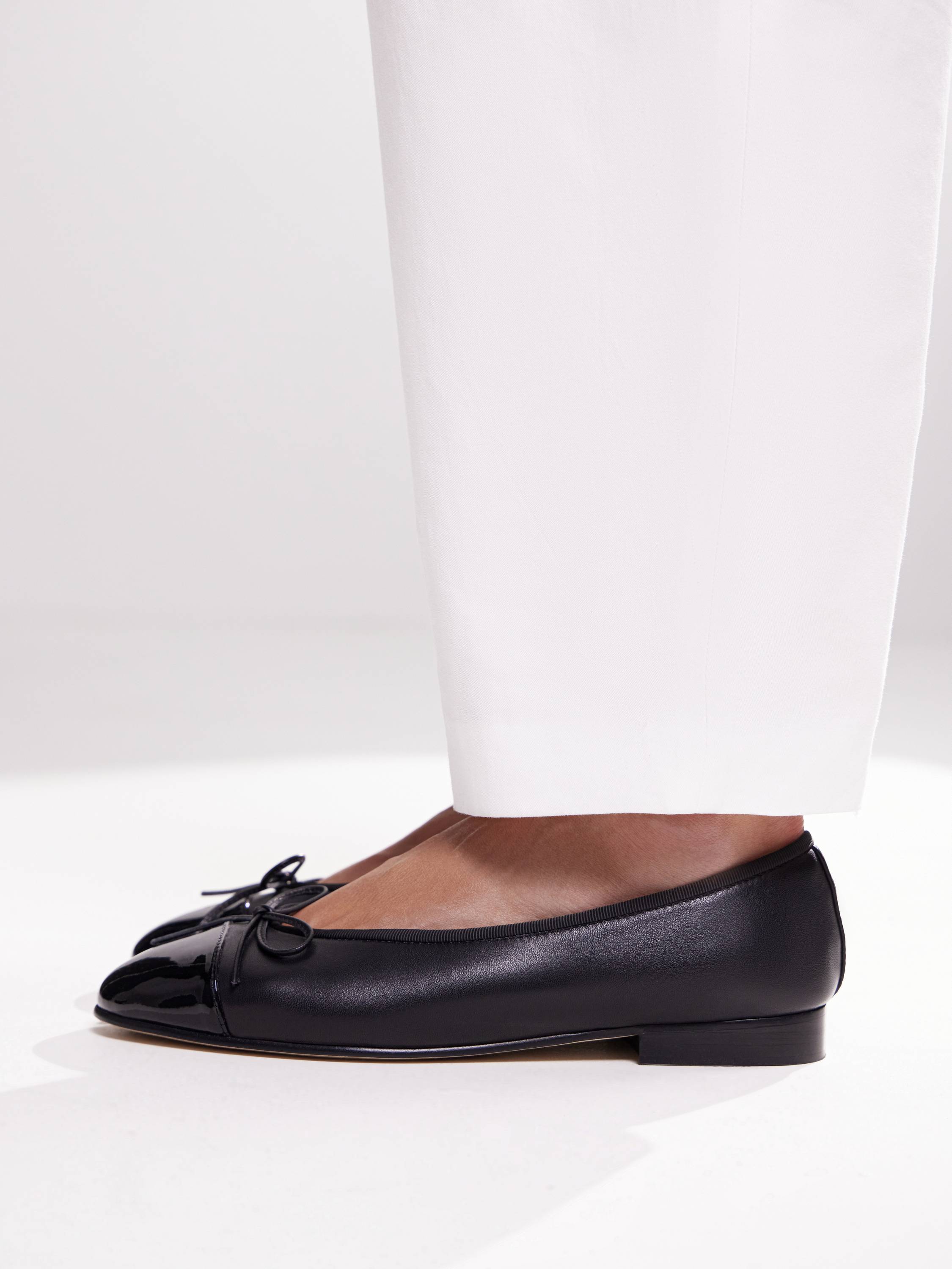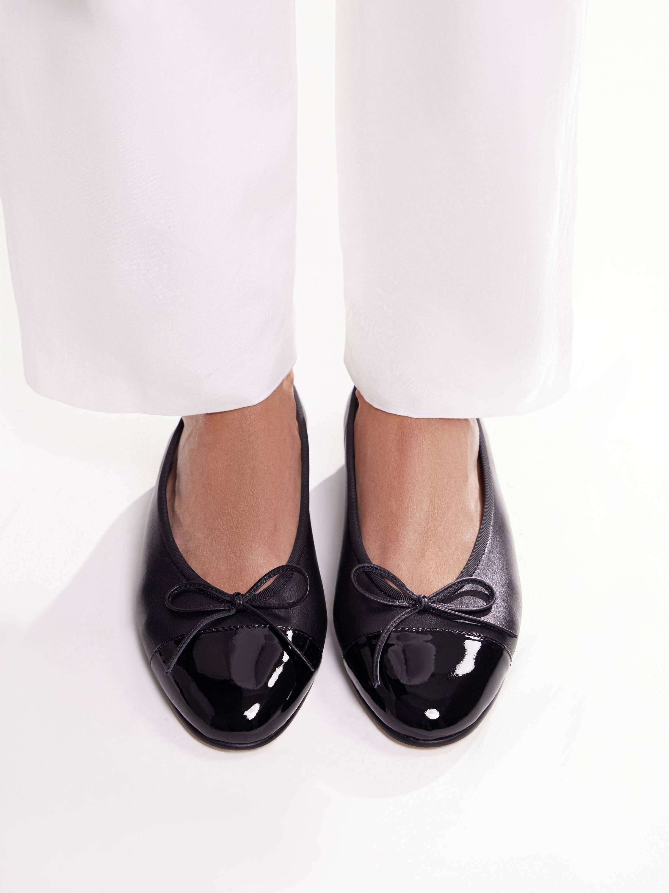 Балетки из натуральной кожи с лакированным мысом — изящная пара с легким французским акцентом. Модель на низком ходу с округлым вырезом дополнена миниатюрным бантом и глянцевой деталью, которая придает образу немного графичности. Мягкая кожа комфортно садится по ноге, а гибкая подошва обеспечивает удобство в течение дня. Носите с легкими брюками, юбками миди или летящими платьями — такие балетки станут стильным завершением любого образа.