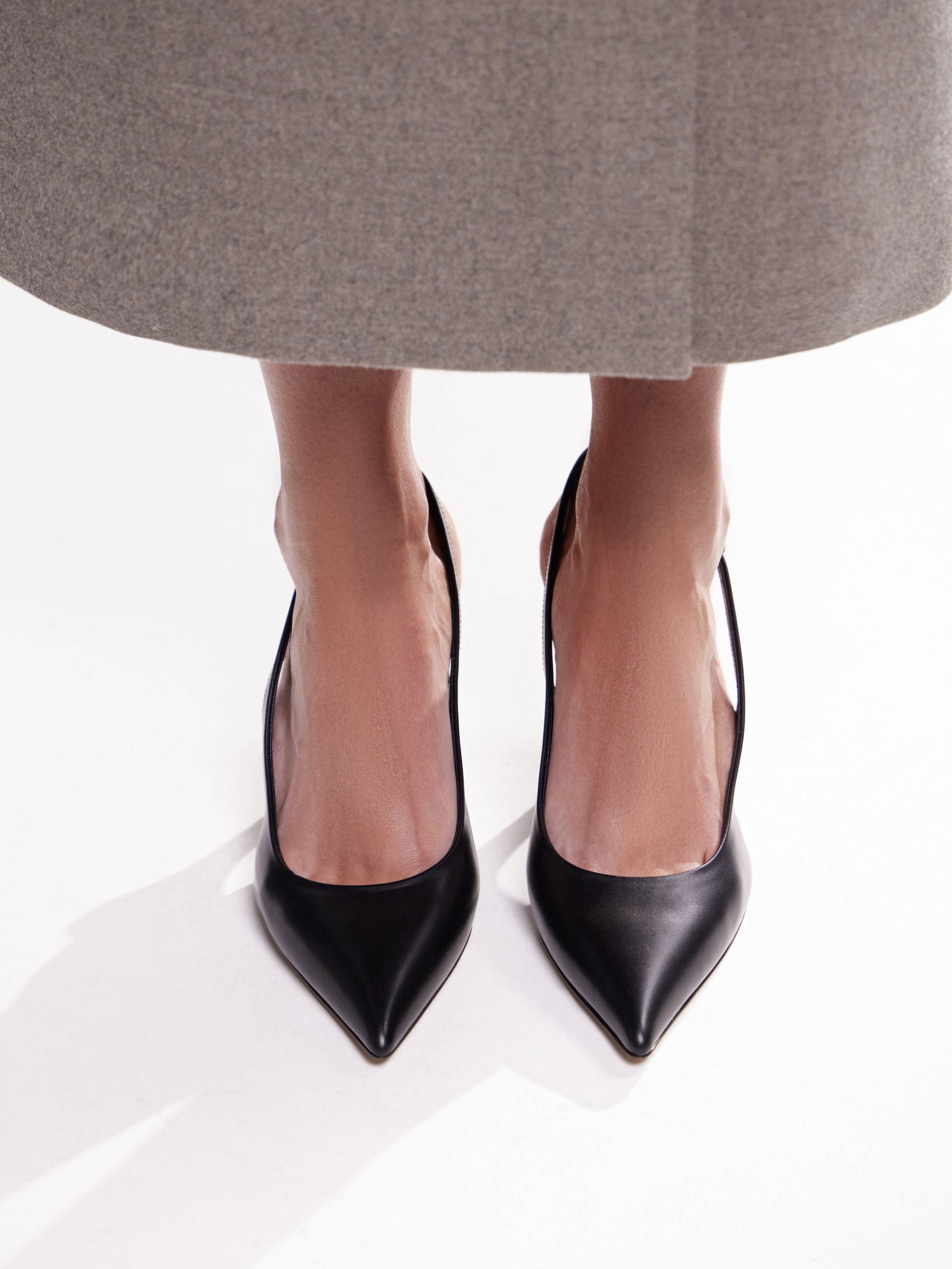 Туфли slingback на тонком каблуке — воплощение элегантности в лаконичной форме. Модель выполнена из гладкой натуральной кожи с матовой текстурой: она мягко адаптируется к форме стопы и комфортна в носке. За счет открытой пятки и регулируемого ремешка с изящной золотистой пряжкой посадка остается стабильной, а визуальный акцент смещается на изящный силуэт. Острый мыс придает обуви графичности и удлиняет ногу, а каблук средней высоты формирует правильный угол подъема без лишнего напряжения. Чистый оттенок — универсальный, не привязанный к сезону или стилю. Эти туфли легко вписываются как в повседневные образы, так и в вечерние — с платьем, костюмом, денимом или юбкой. Идеальный элемент минималистичного гардероба с акцентом на форму.