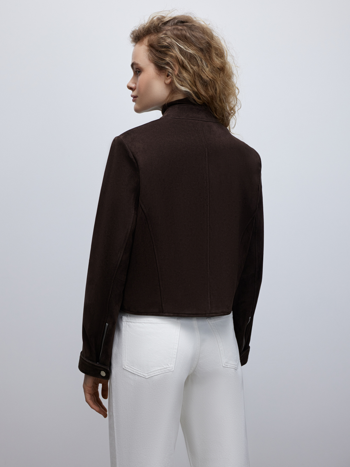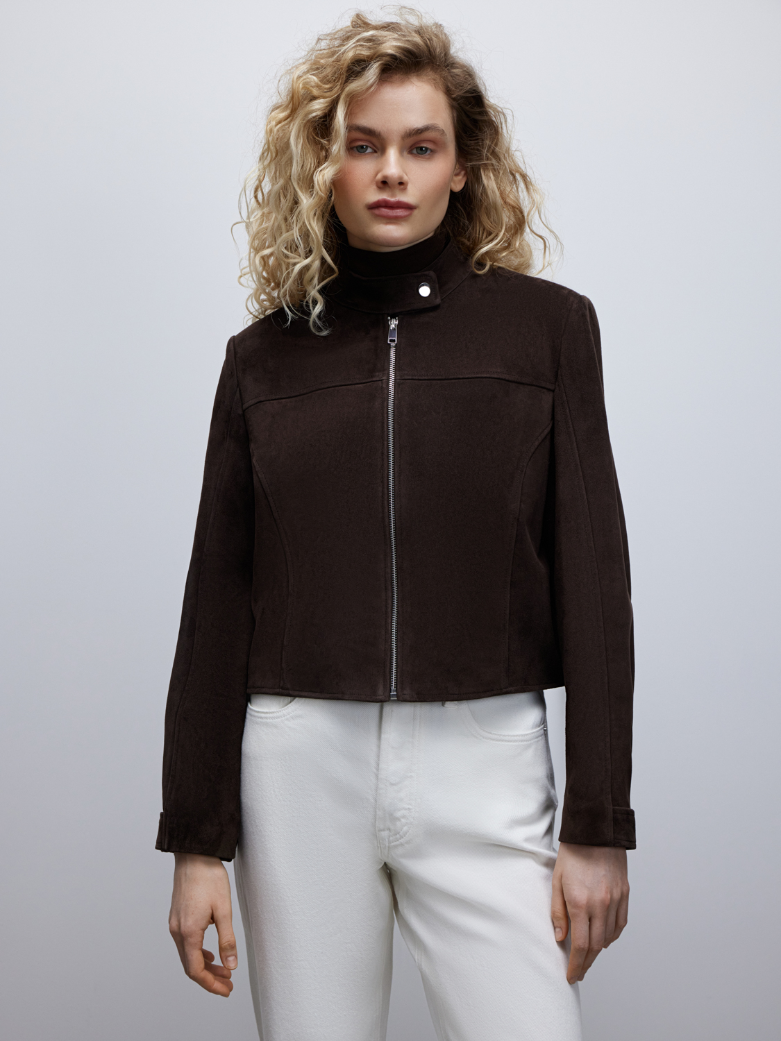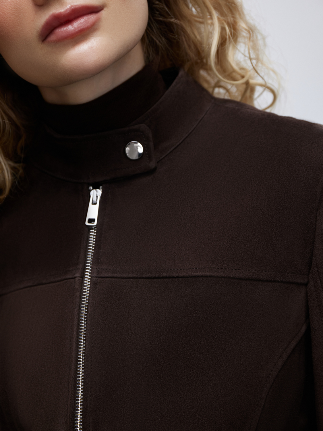 Лаконичная куртка прямого кроя выполнена из натуральной замши — мягкого, благородного материала с матовой бархатистой текстурой. Высокий воротник-стойка фиксируется на кнопку и образует аккуратную линию у шеи. Минималистичный дизайн поддержан потайной молнией и отсутствием лишней фурнитуры, что делает модель особенно актуальной в сочетаниях с денимом, трикотажем и летящими силуэтами. Замша не только визуально выделяет изделие, но и дарит особую тактильную глубину — теплую, бархатную, слегка утонченную. В коллекции представлено два оттенка: шоколадный и графичный серо-коричневый.