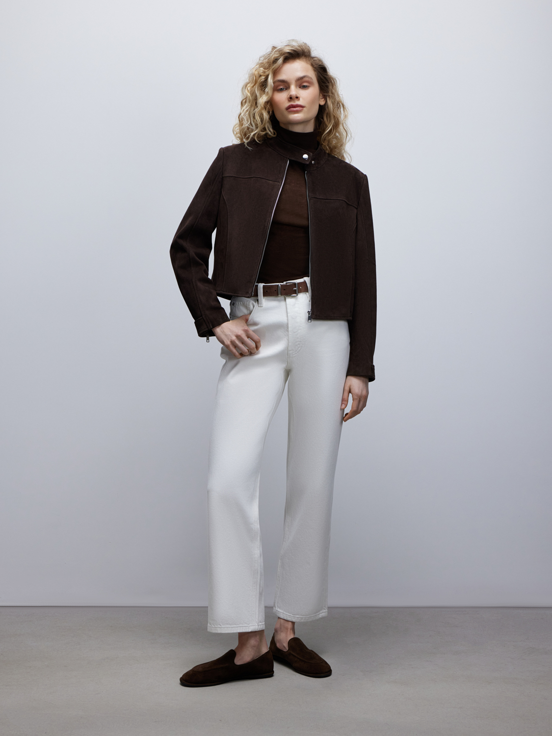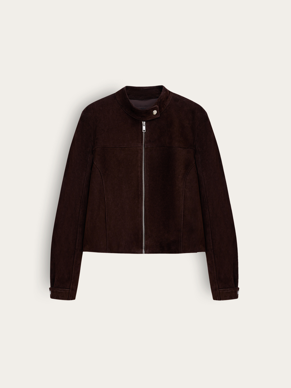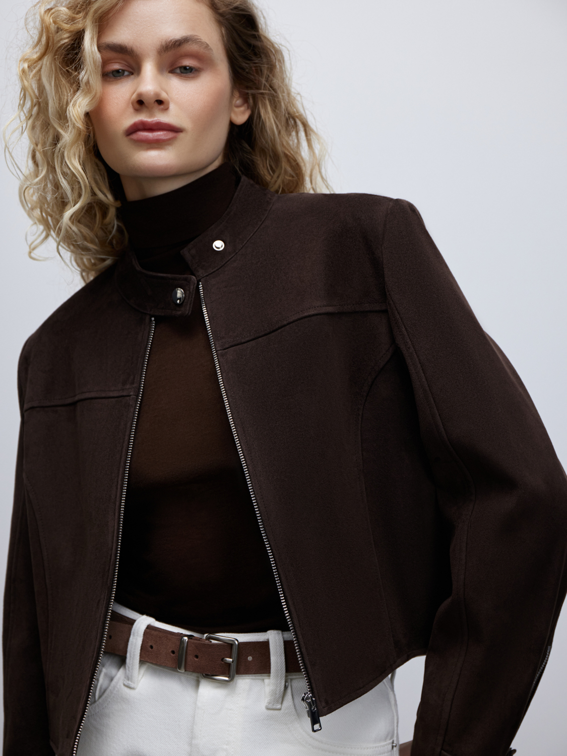 Лаконичная куртка прямого кроя выполнена из натуральной замши — мягкого, благородного материала с матовой бархатистой текстурой. Высокий воротник-стойка фиксируется на кнопку и образует аккуратную линию у шеи. Минималистичный дизайн поддержан потайной молнией и отсутствием лишней фурнитуры, что делает модель особенно актуальной в сочетаниях с денимом, трикотажем и летящими силуэтами. Замша не только визуально выделяет изделие, но и дарит особую тактильную глубину — теплую, бархатную, слегка утонченную. В коллекции представлено два оттенка: шоколадный и графичный серо-коричневый.