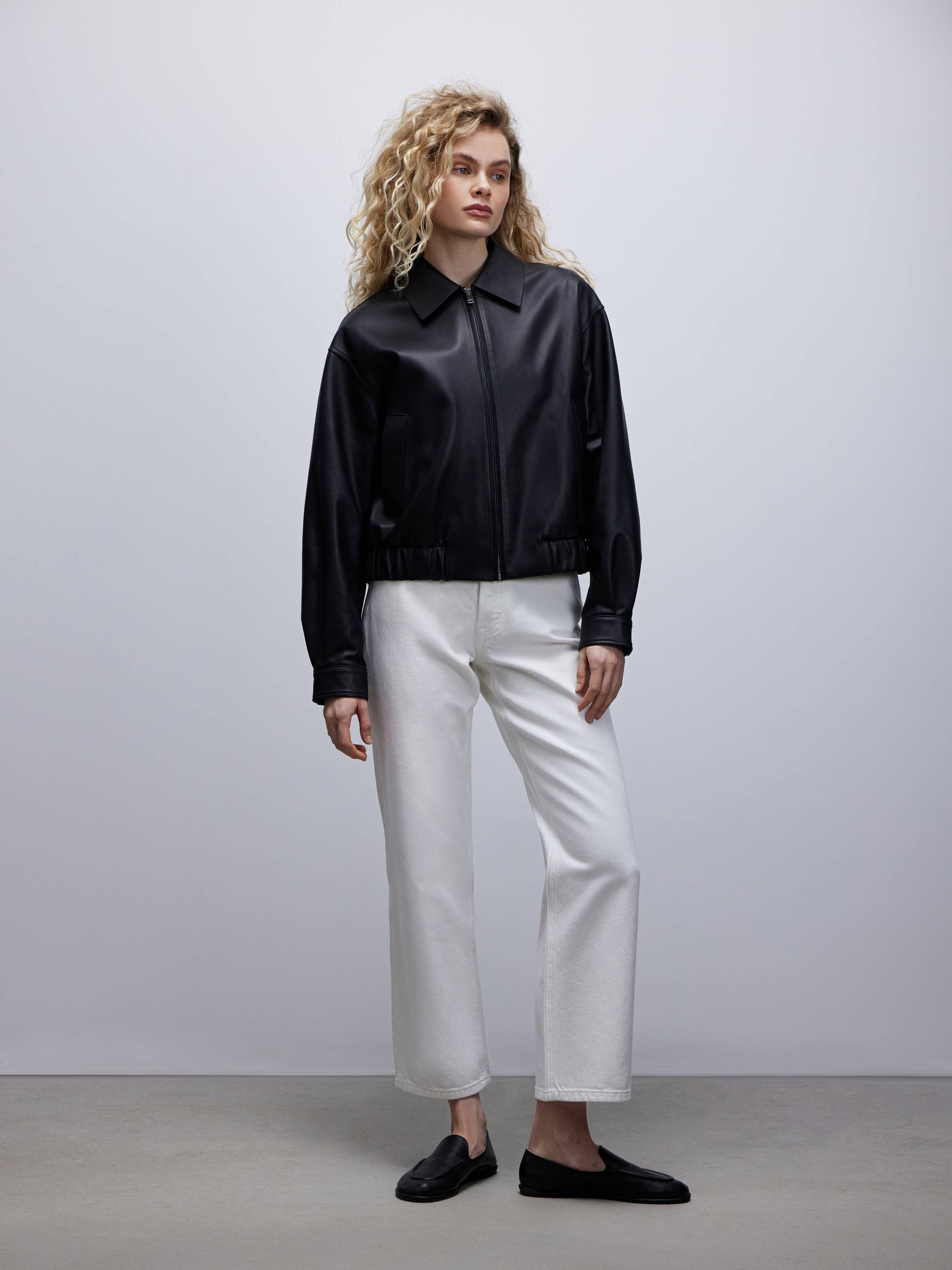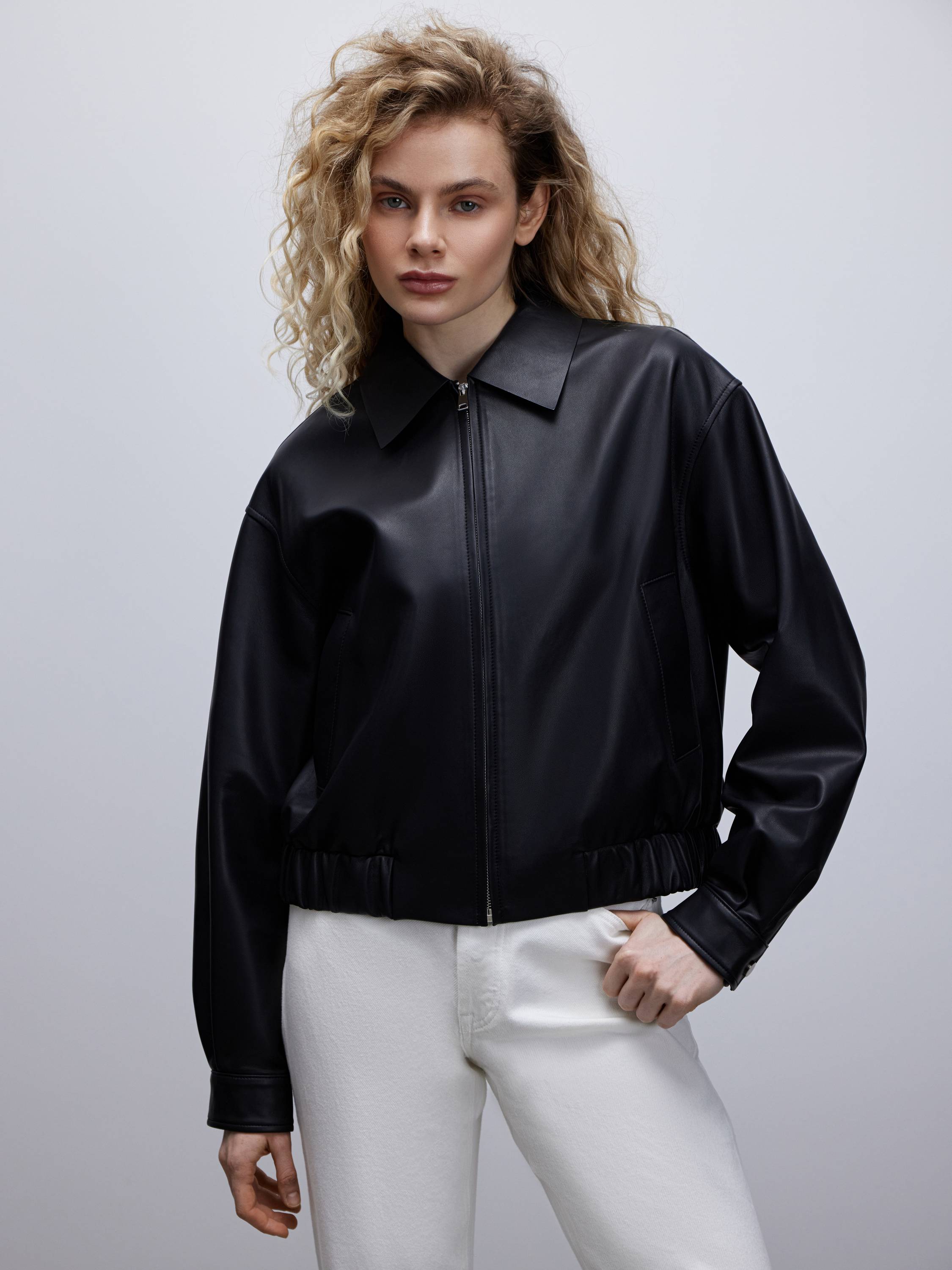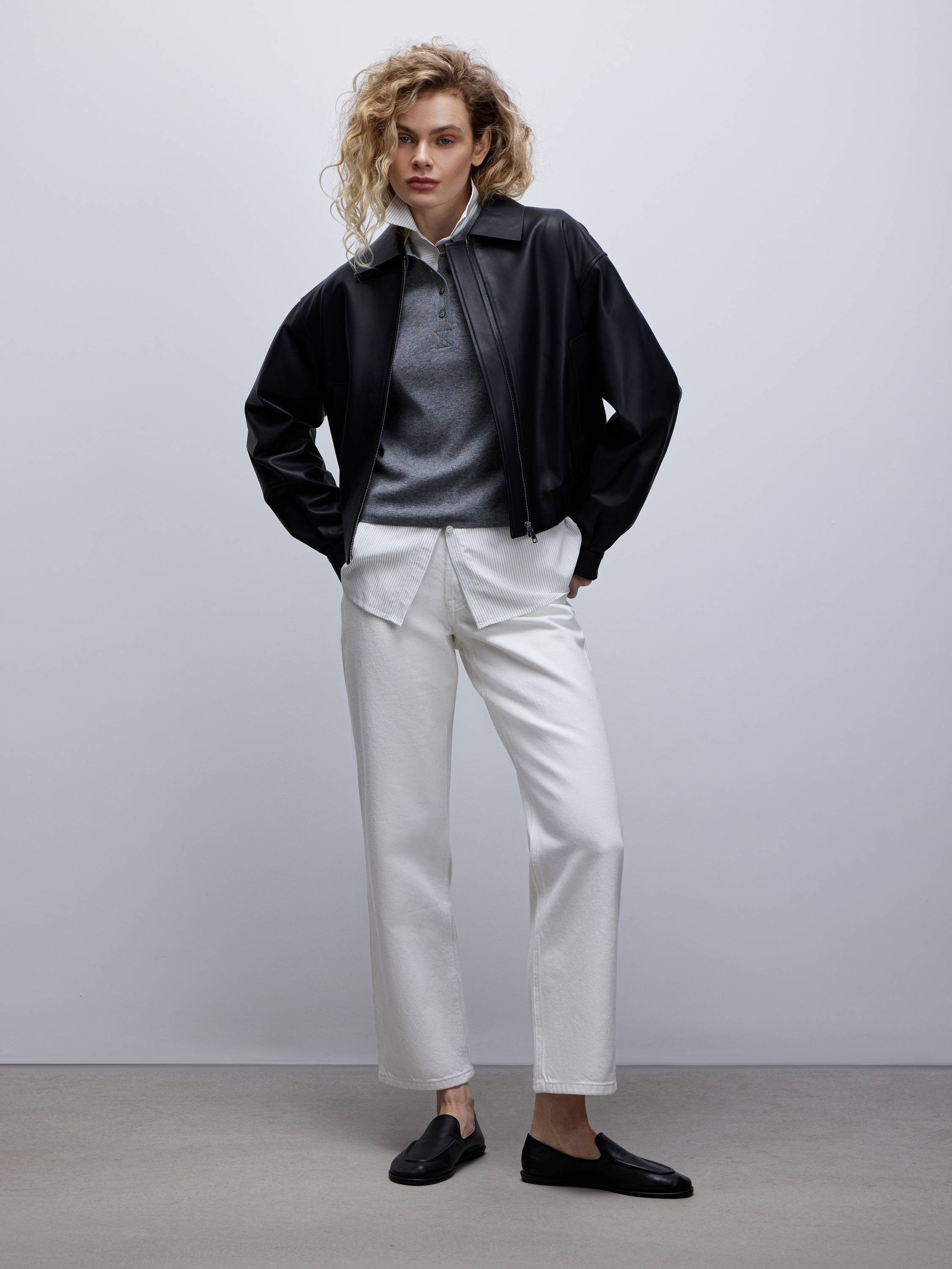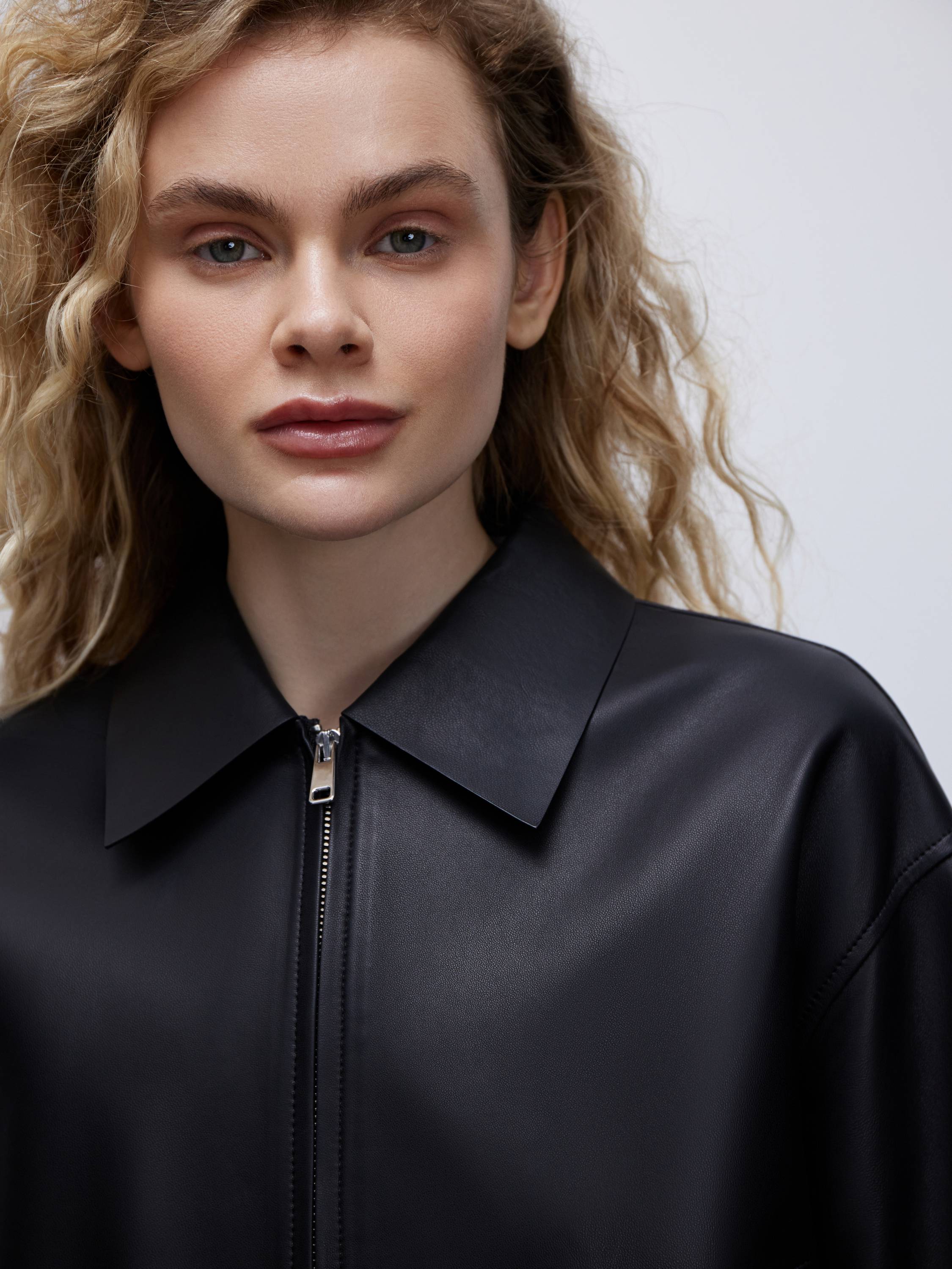 Свободная кожаная куртка с лаконичным дизайном и характером бомбера — универсальный акцент в современном гардеробе. Изготовлена из мягкой натуральной кожи с деликатным матовым блеском и пластичной фактурой. Модель дополнена воротником-стойкой и эластичной резинкой по низу, что придает силуэту собранность. Двухзамковая молния позволяет регулировать посадку, а гладкая подкладка облегчает посадку на фигуру и комфорт в течение дня. Куртка вписывается как в расслабленные, так и в структурированные образы, хорошо комбинируется с денимом, хлопковыми брюками или юбкой миди.