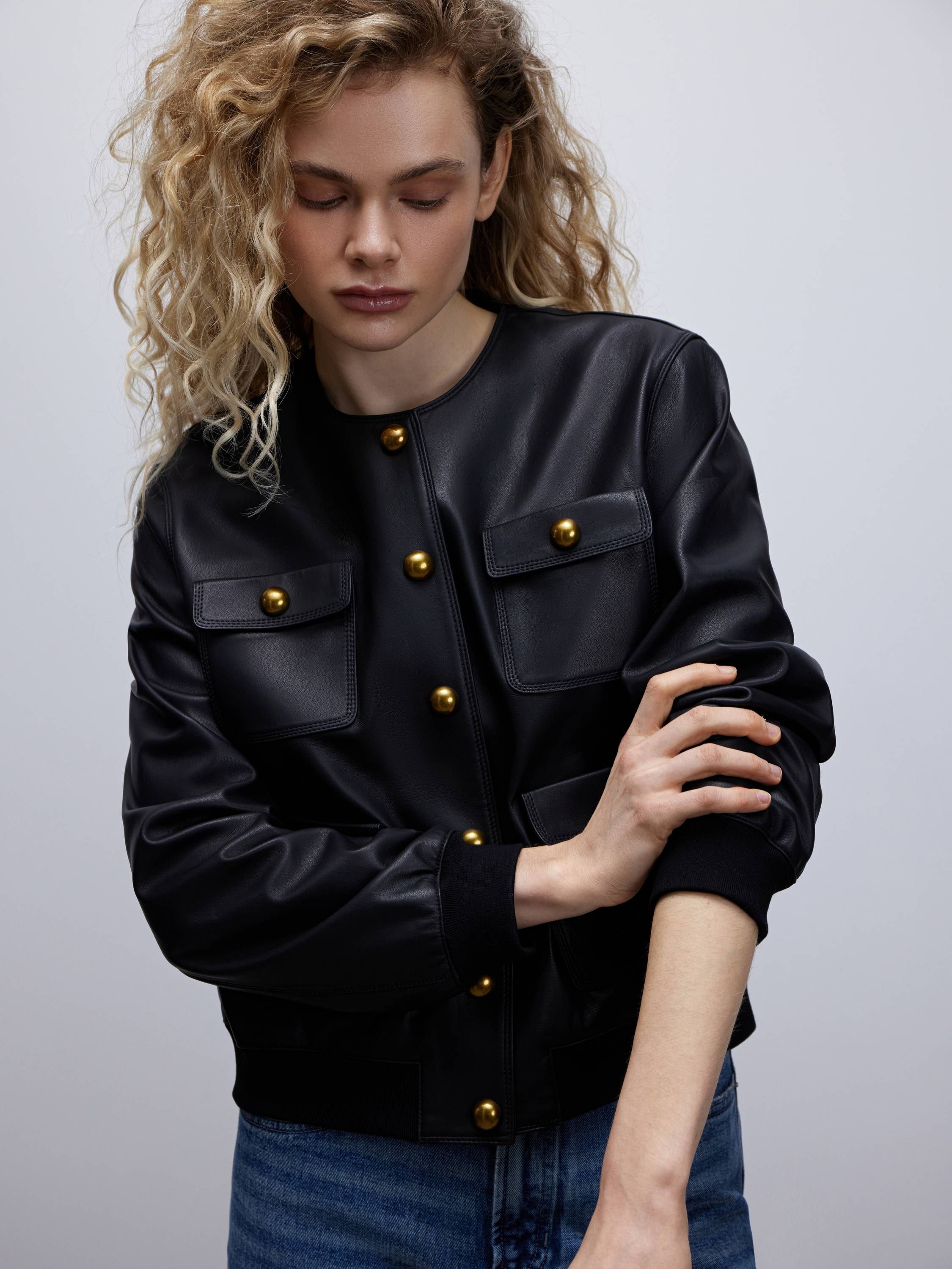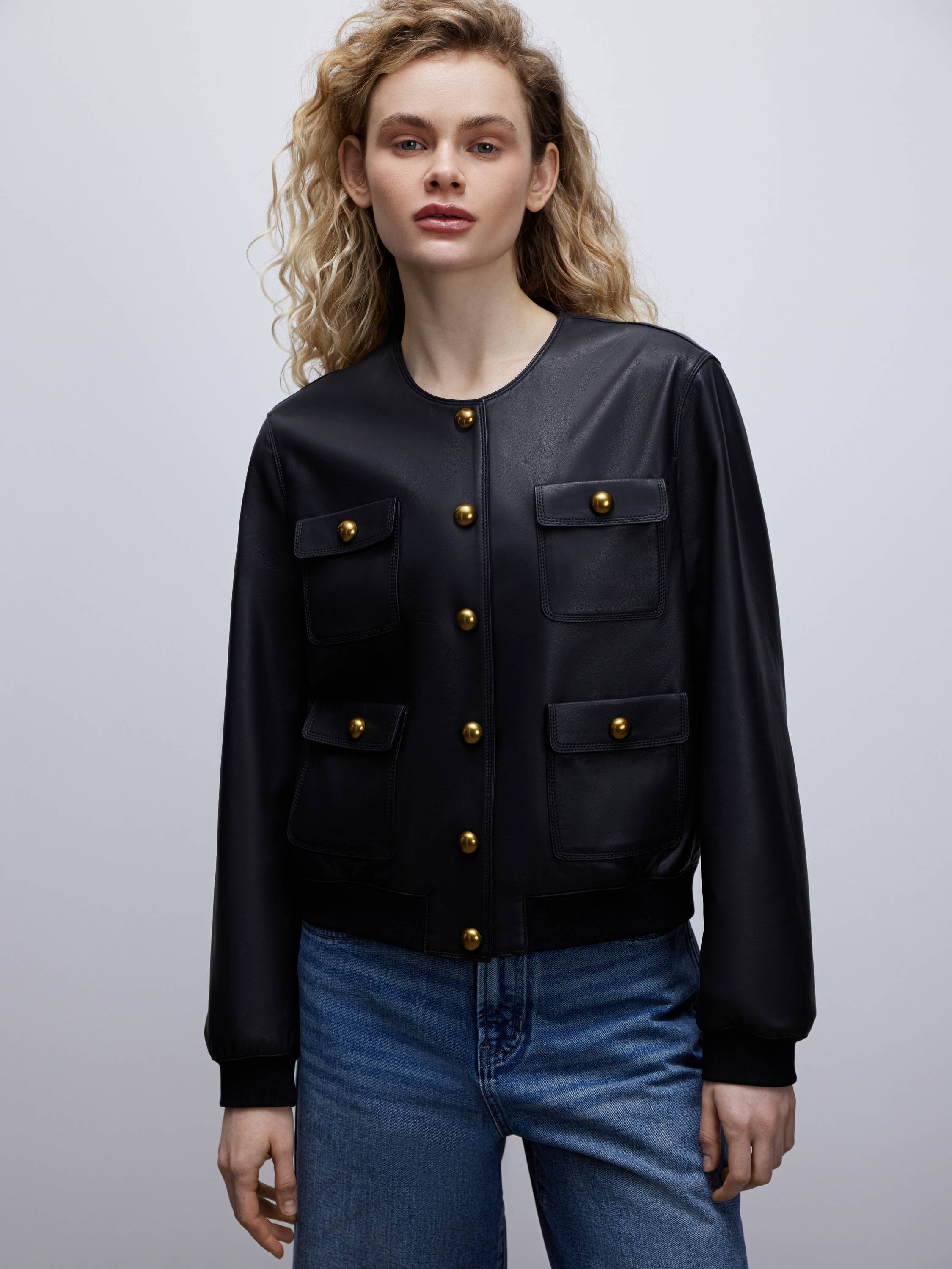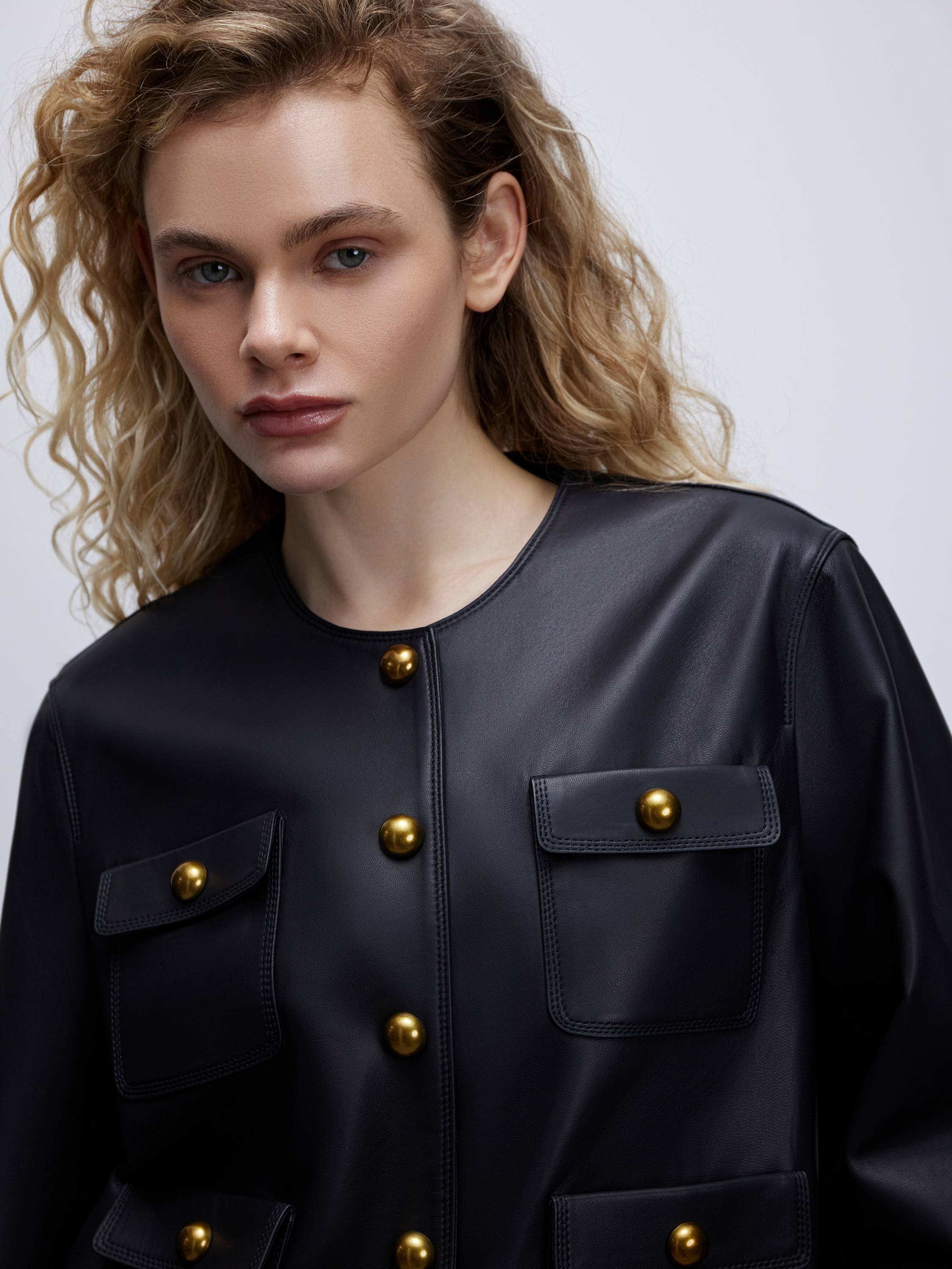 Куртка из 100% натуральной кожи в стиле современной классики. Матовая поверхность с едва уловимым блеском подчеркивает графику кроя и делает акцент на четкости линий. Модель выполнена в лаконичном силуэте без воротника, с округлым вырезом и золотистой фурнитурой, которая придает образу нотки элегантности. Четыре накладных кармана с винтажным акцентом создают сдержанную геометрию и при этом делают вещь практичной. Эластичные манжеты и низ обеспечивают комфортную посадку и мягко структурируют форму. Такая модель работает как самостоятельный акцент и органично вписывается в любой повседневный гардероб.