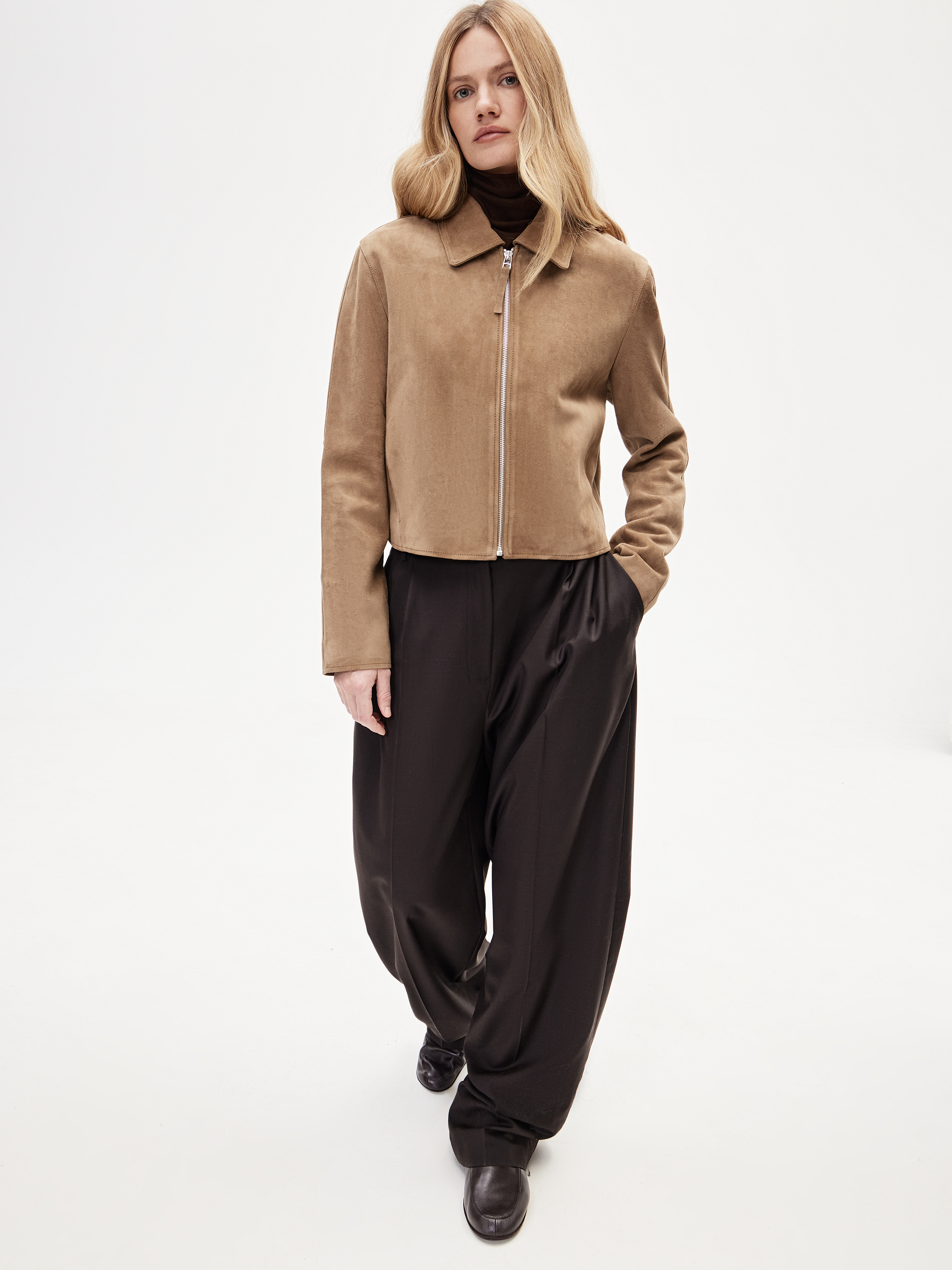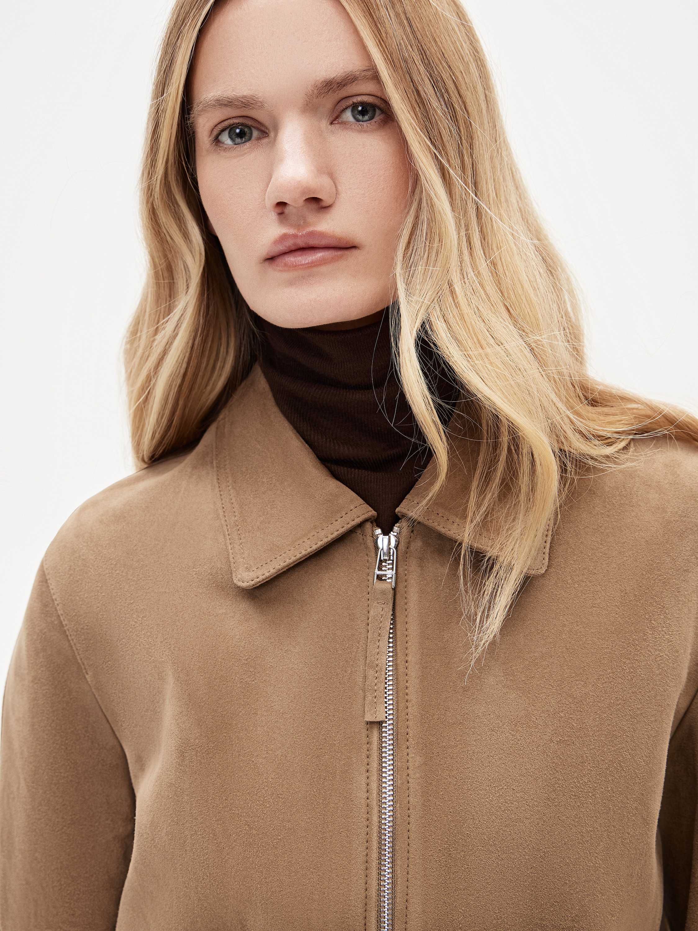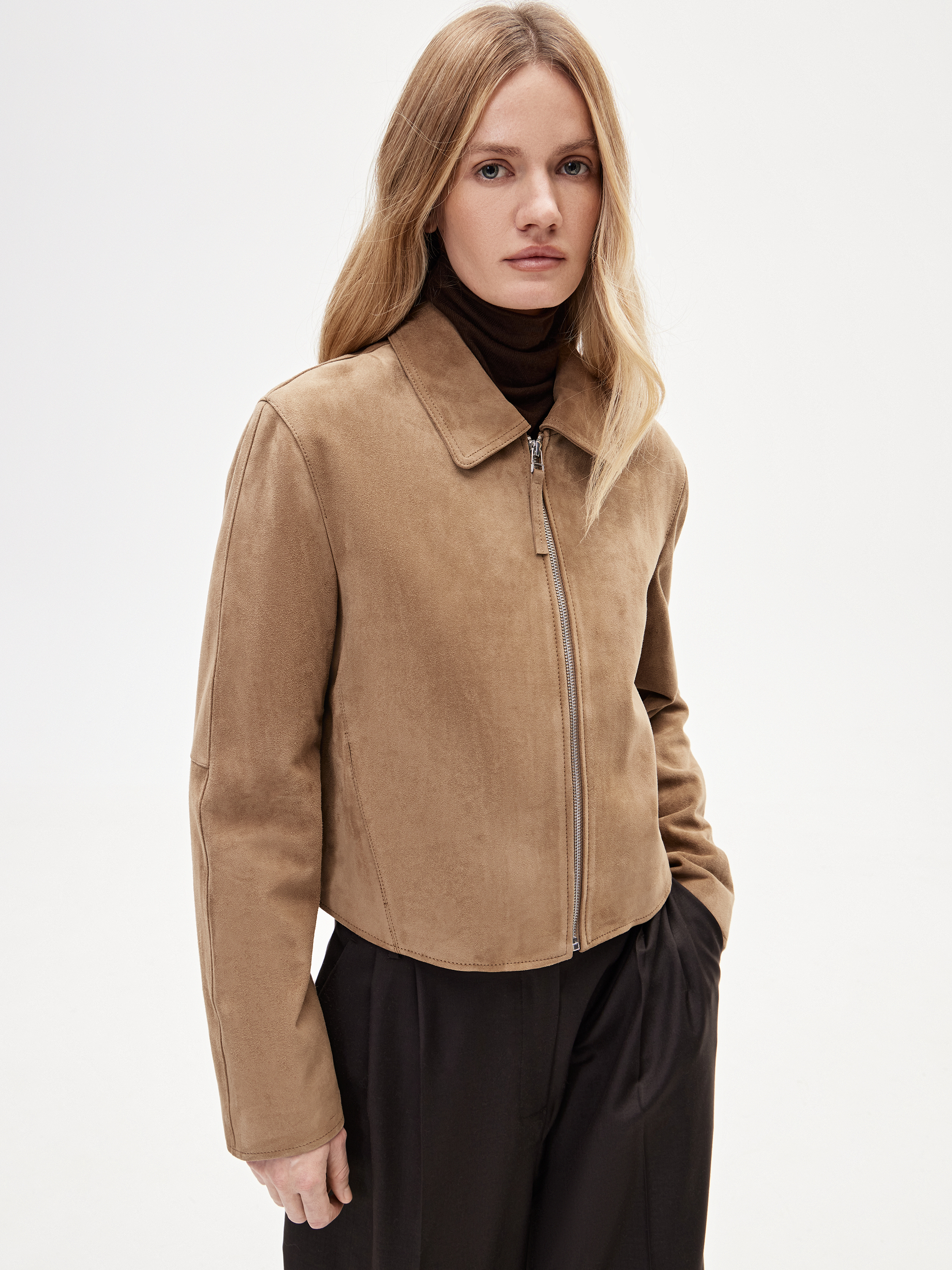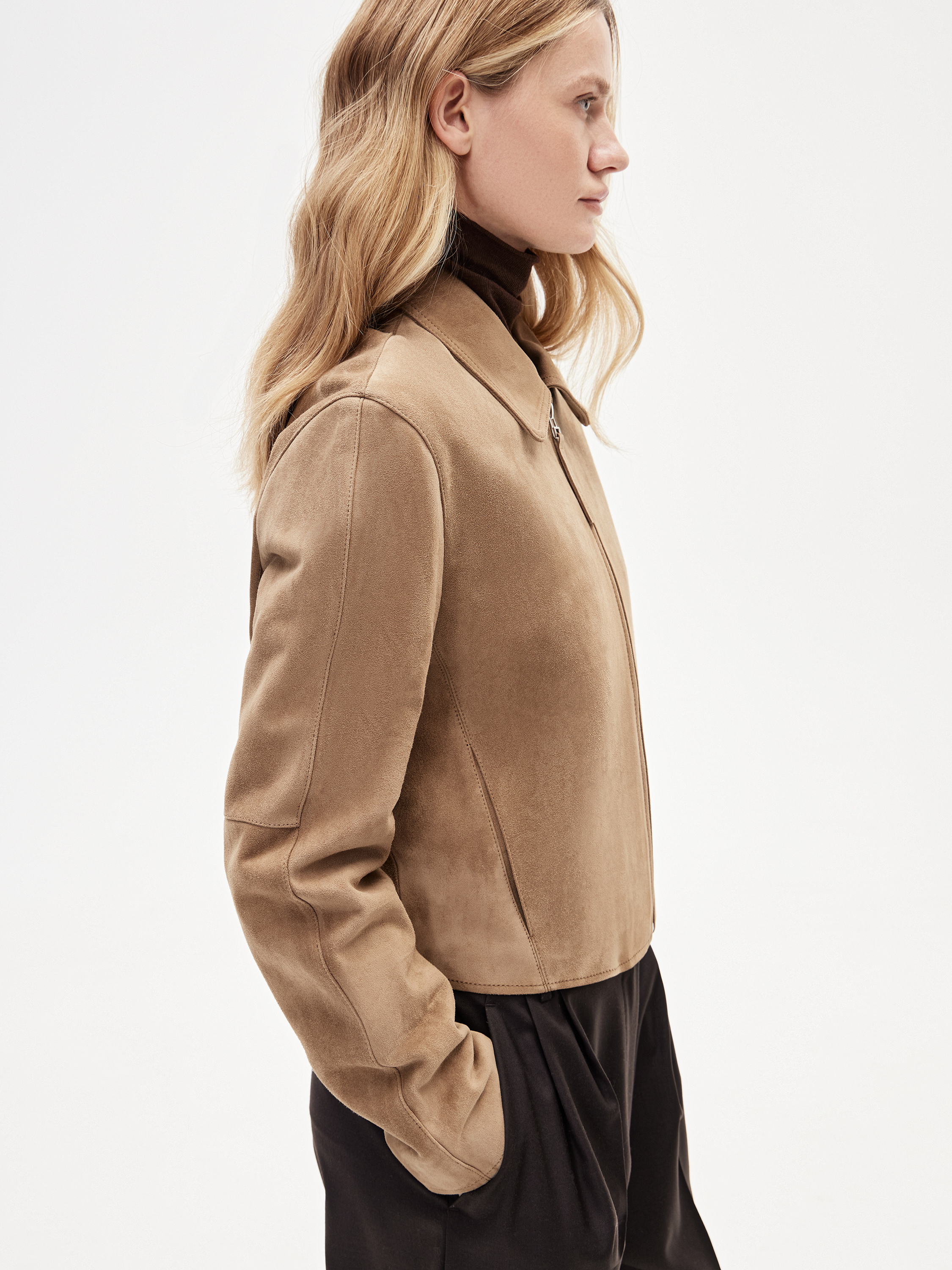 Лаконичная куртка из мягкой натуральной замши — универсальная база на прохладное межсезонье. Мягкий бархатистый материал не только тактильно приятен, но и обладает высокой износостойкостью. Замша «дышит», адаптируется к температуре тела и со временем становится только благороднее, подстраиваясь под особенности фигуры и образа жизни. Прямой укороченный силуэт делает акцент на линии талии, уравновешивая объемные джинсы и брюки с посадкой на бедрах. Минималистичный дизайн дополнен классическим отложным воротником, аккуратной молнией и выверенными швами. Глубокий шоколадный оттенок легко сочетается с денимом, трикотажем и натуральной палитрой гардероба.