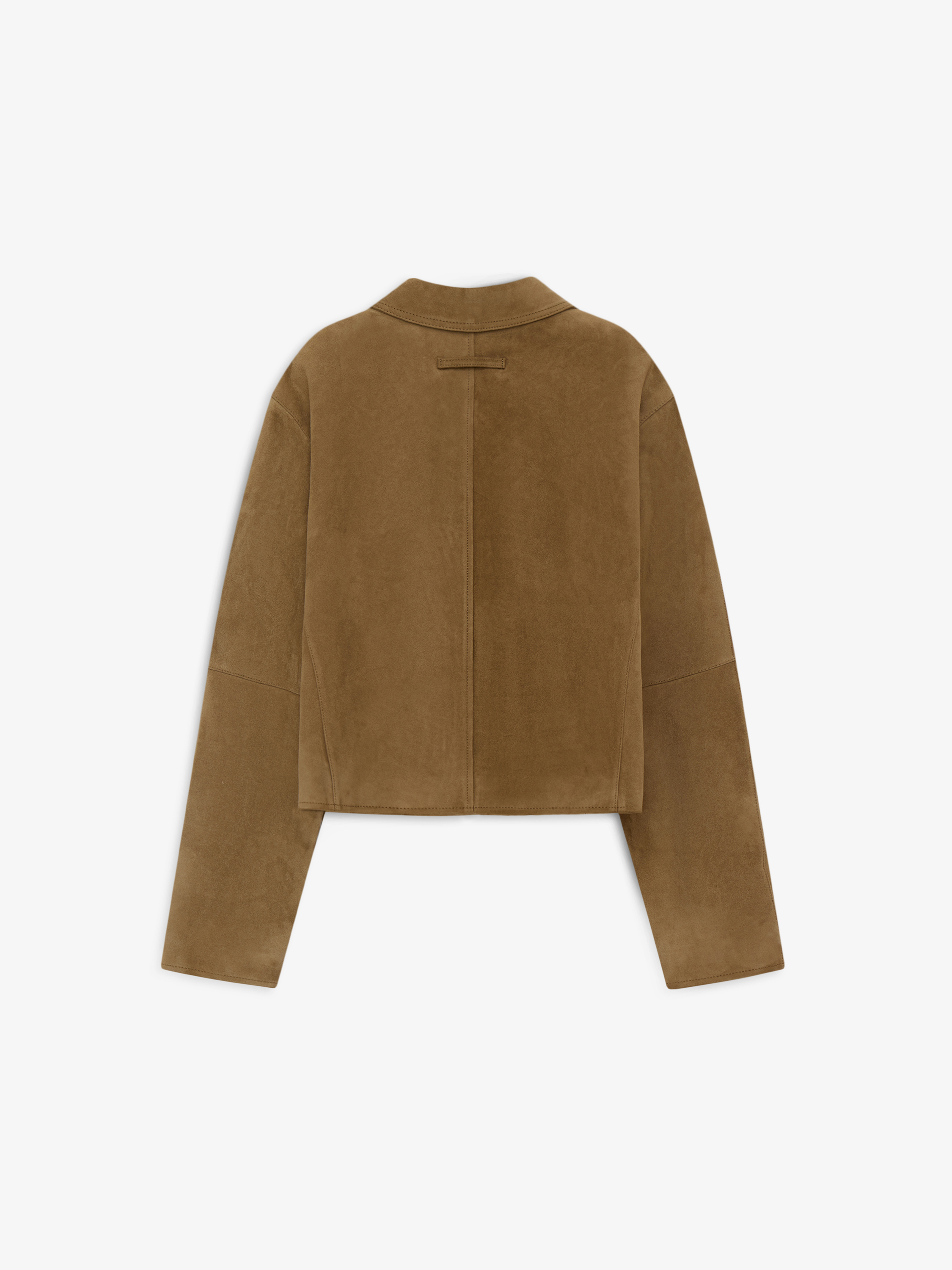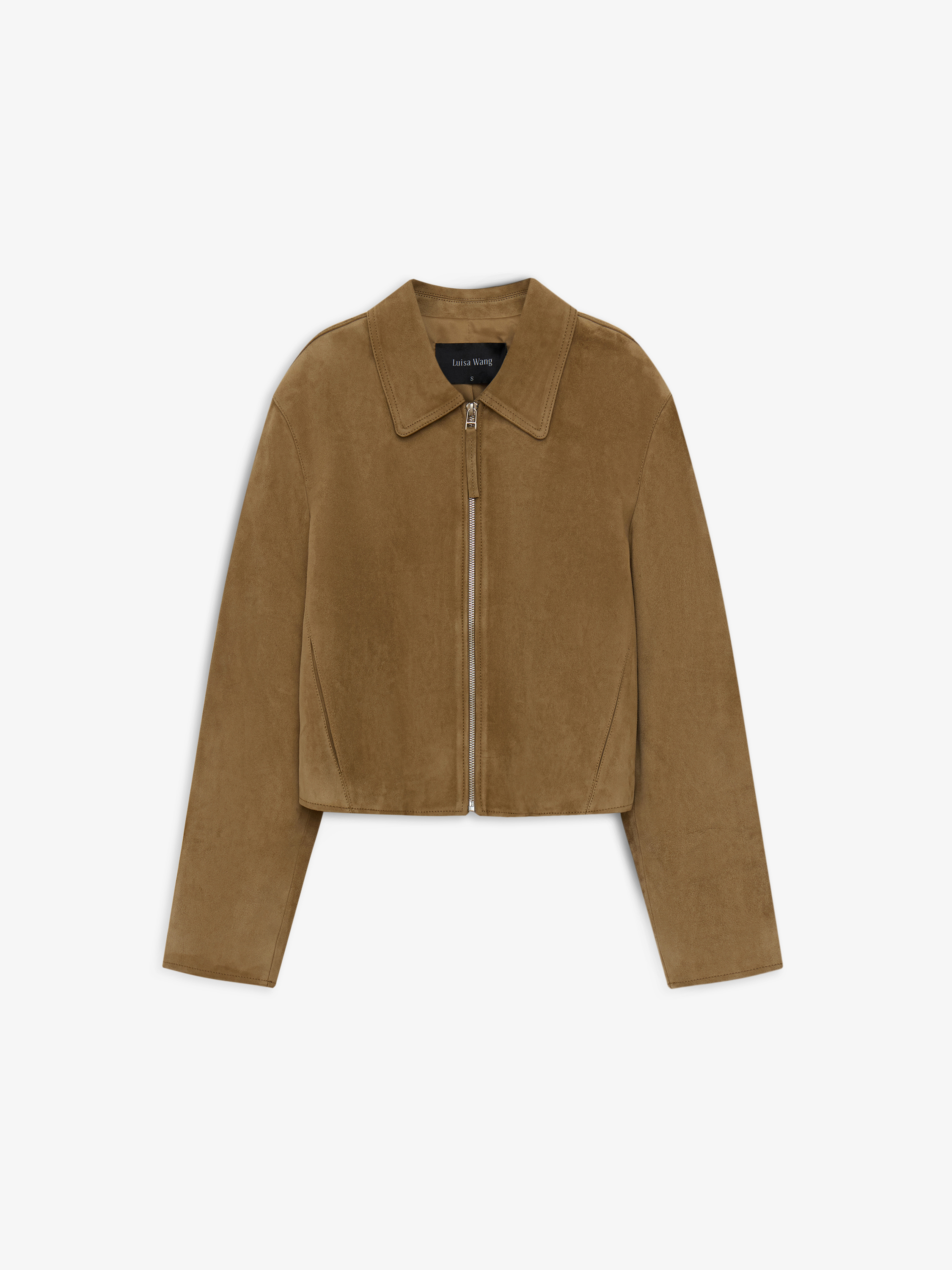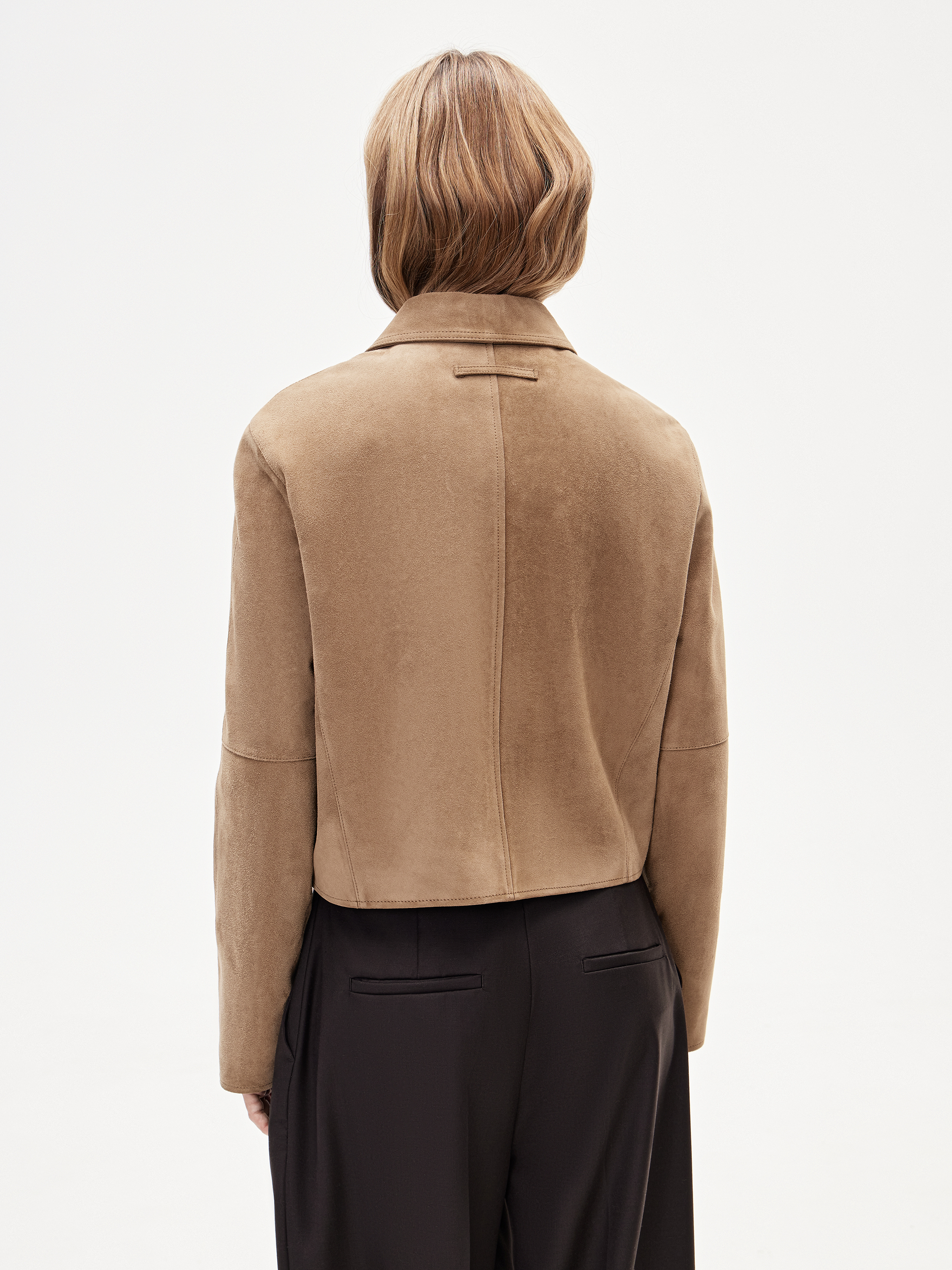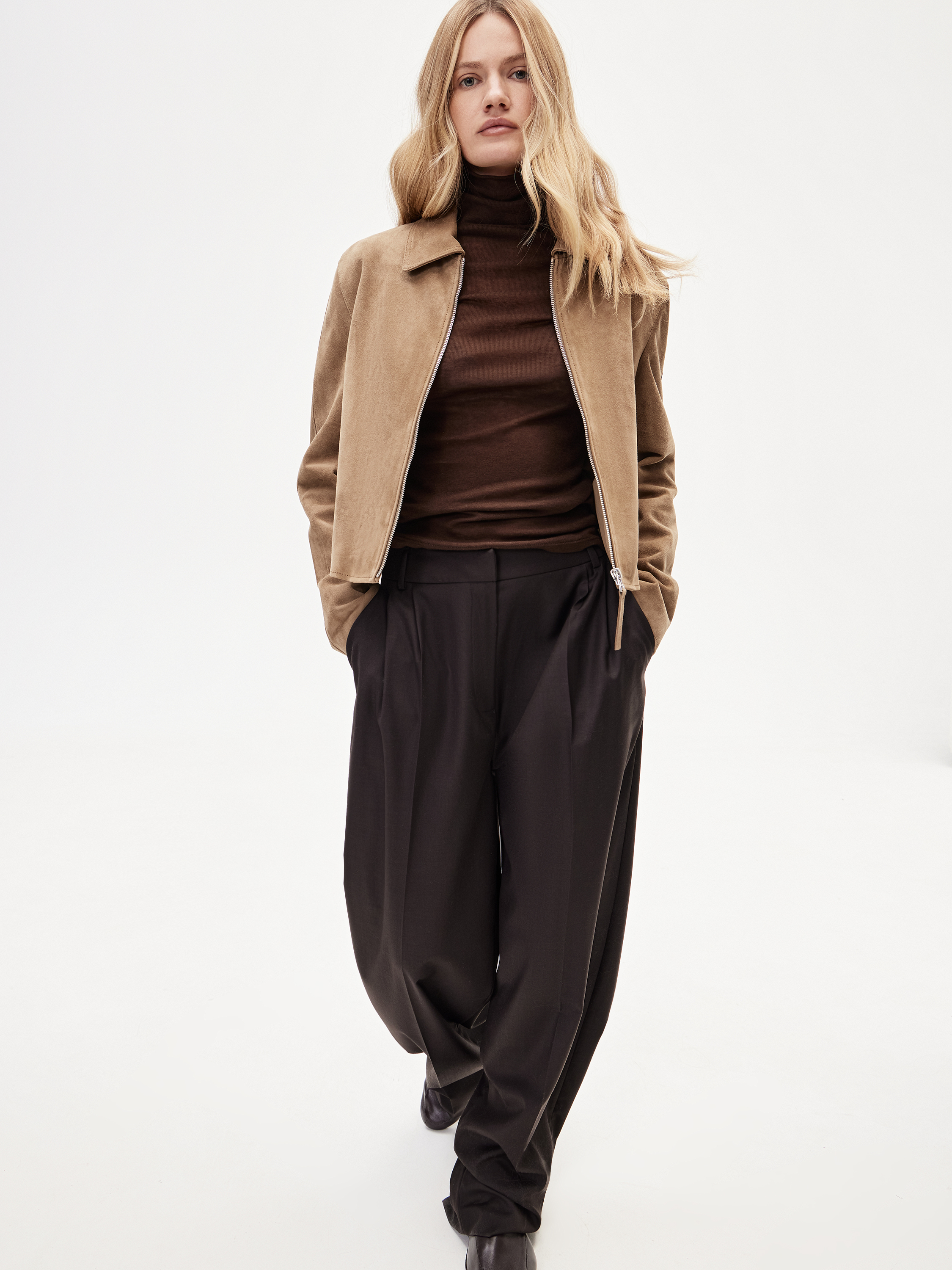 Лаконичная куртка из мягкой натуральной замши — универсальная база на прохладное межсезонье. Мягкий бархатистый материал не только тактильно приятен, но и обладает высокой износостойкостью. Замша «дышит», адаптируется к температуре тела и со временем становится только благороднее, подстраиваясь под особенности фигуры и образа жизни. Прямой укороченный силуэт делает акцент на линии талии, уравновешивая объемные джинсы и брюки с посадкой на бедрах. Минималистичный дизайн дополнен классическим отложным воротником, аккуратной молнией и выверенными швами. Глубокий шоколадный оттенок легко сочетается с денимом, трикотажем и натуральной палитрой гардероба.