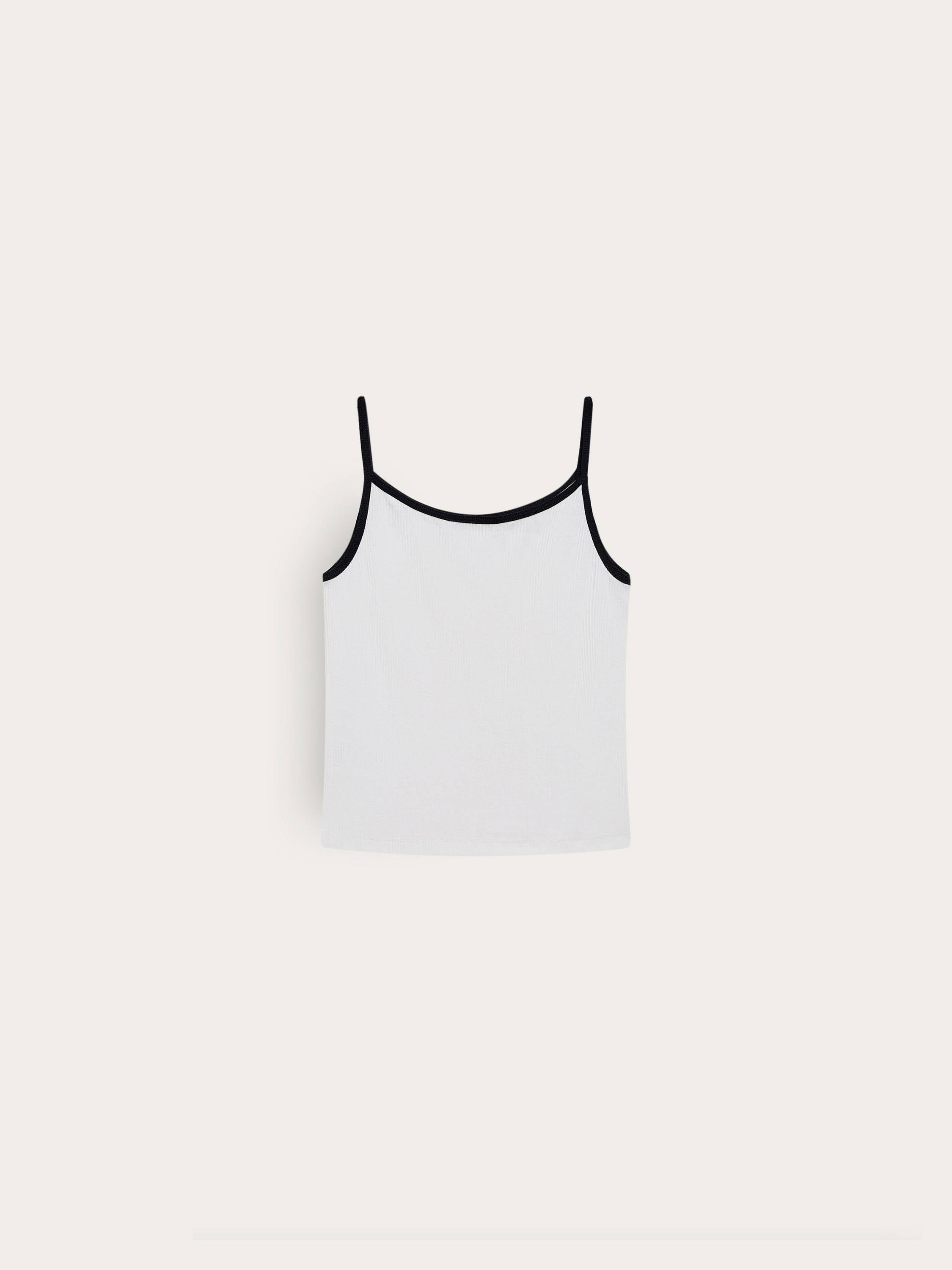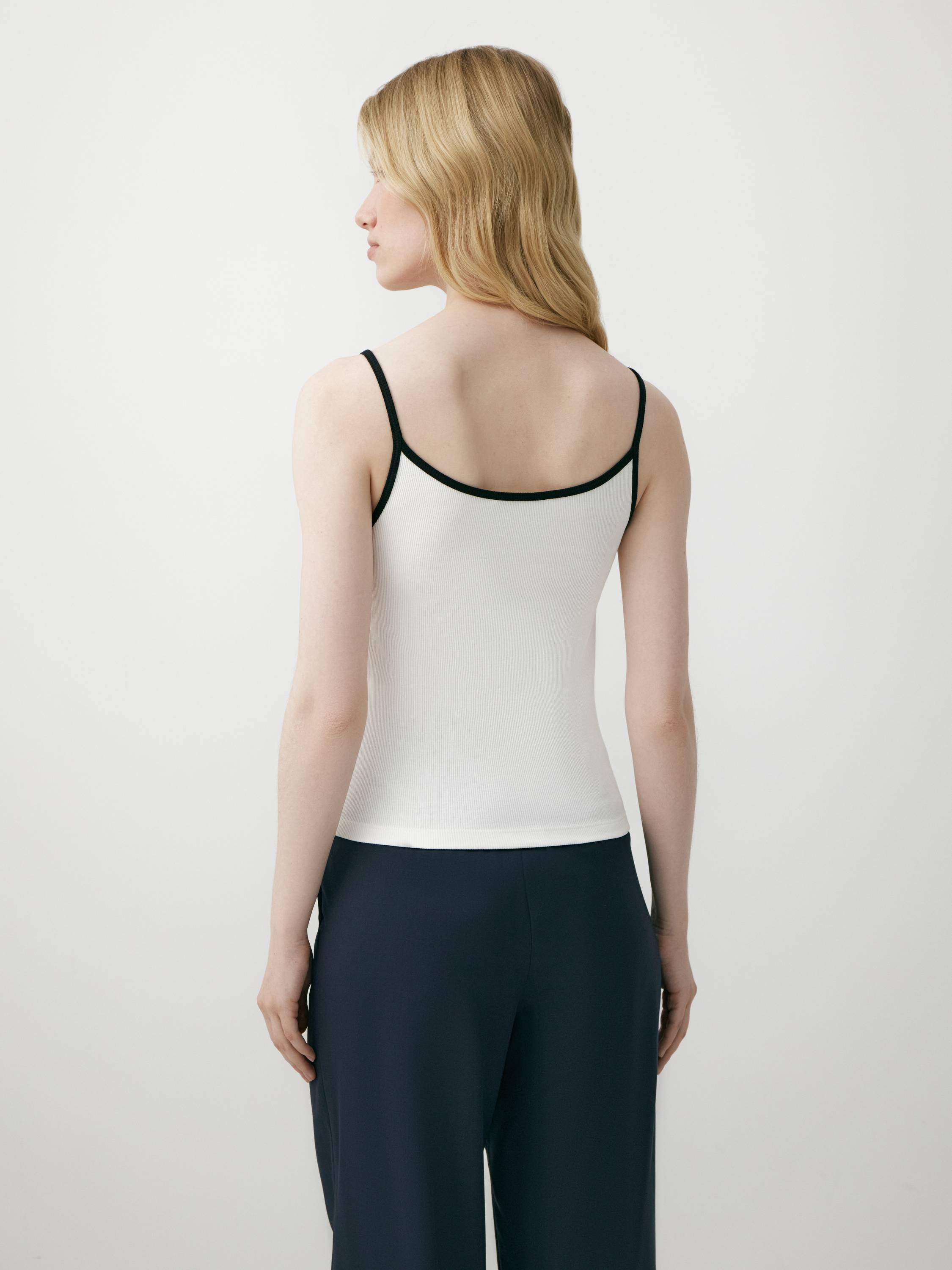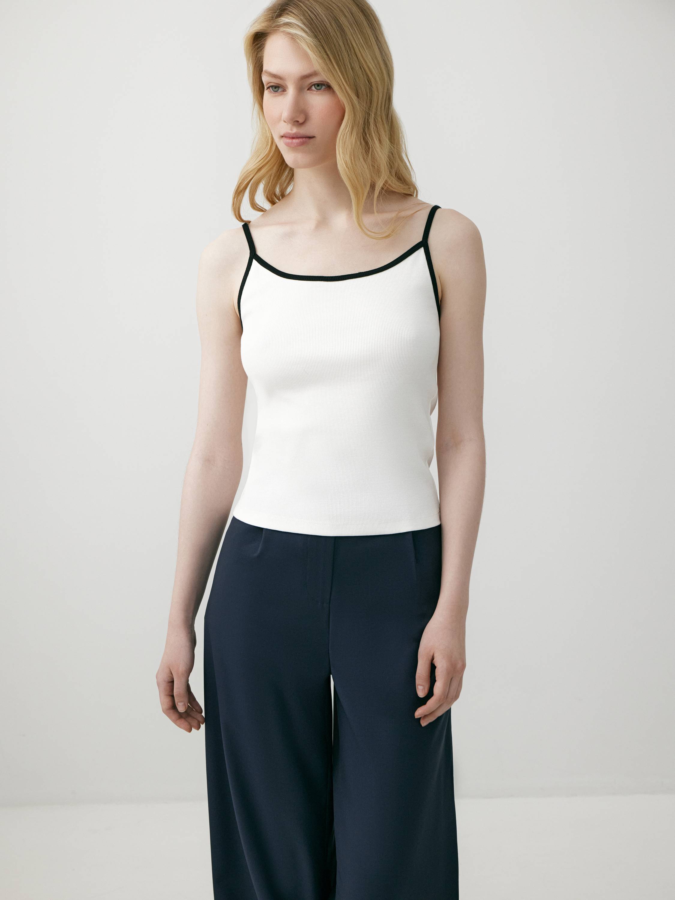 Минималистичный топ на тонких бретелях выполнен из мягкого смесового хлопка с добавлением эластана. Ткань в мелкий рубчик комфортно прилегает к телу, мягко подчеркивая силуэт и обеспечивая свободу движений. Контрастная окантовка по вырезу придает модели графичность и визуальную четкость, сохраняя при этом ощущение легкости. За счет лаконичного дизайна топ легко адаптируется под разные стили — от расслабленного повседневного до более структурного образа с жакетом. Сдержанная палитра делает его универсальной базой на каждый день.