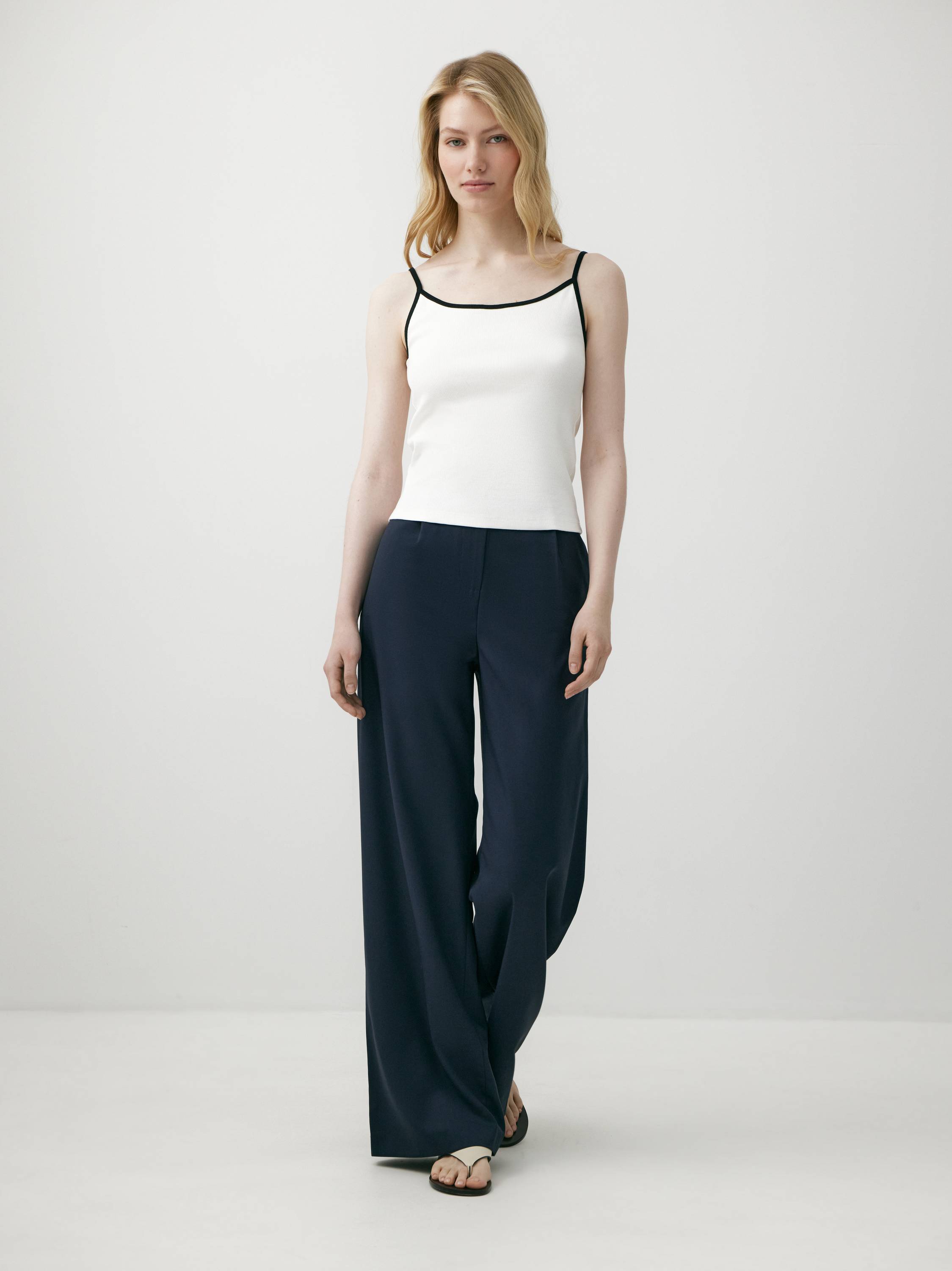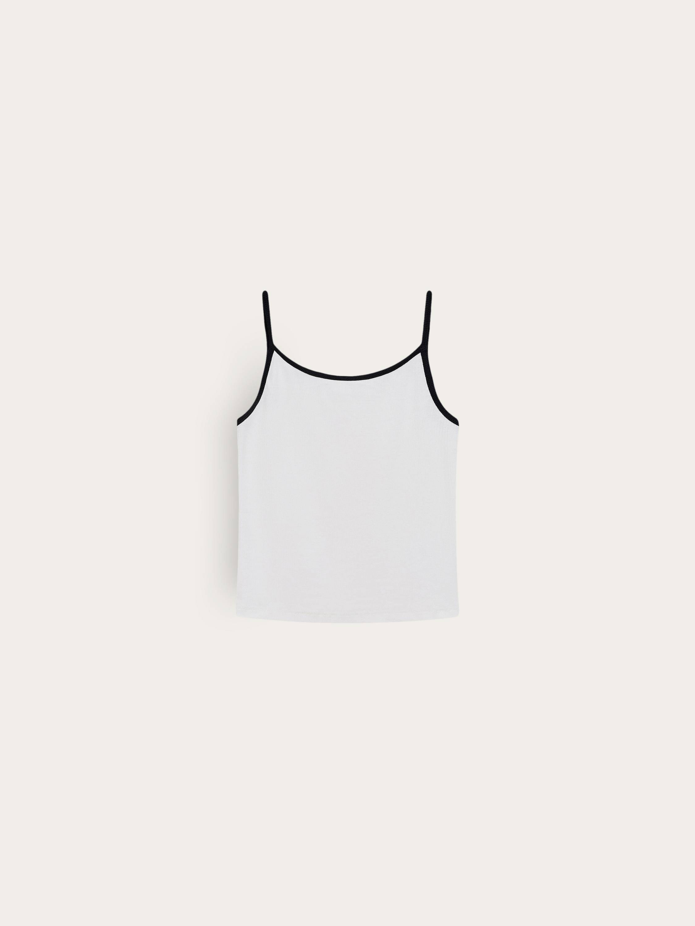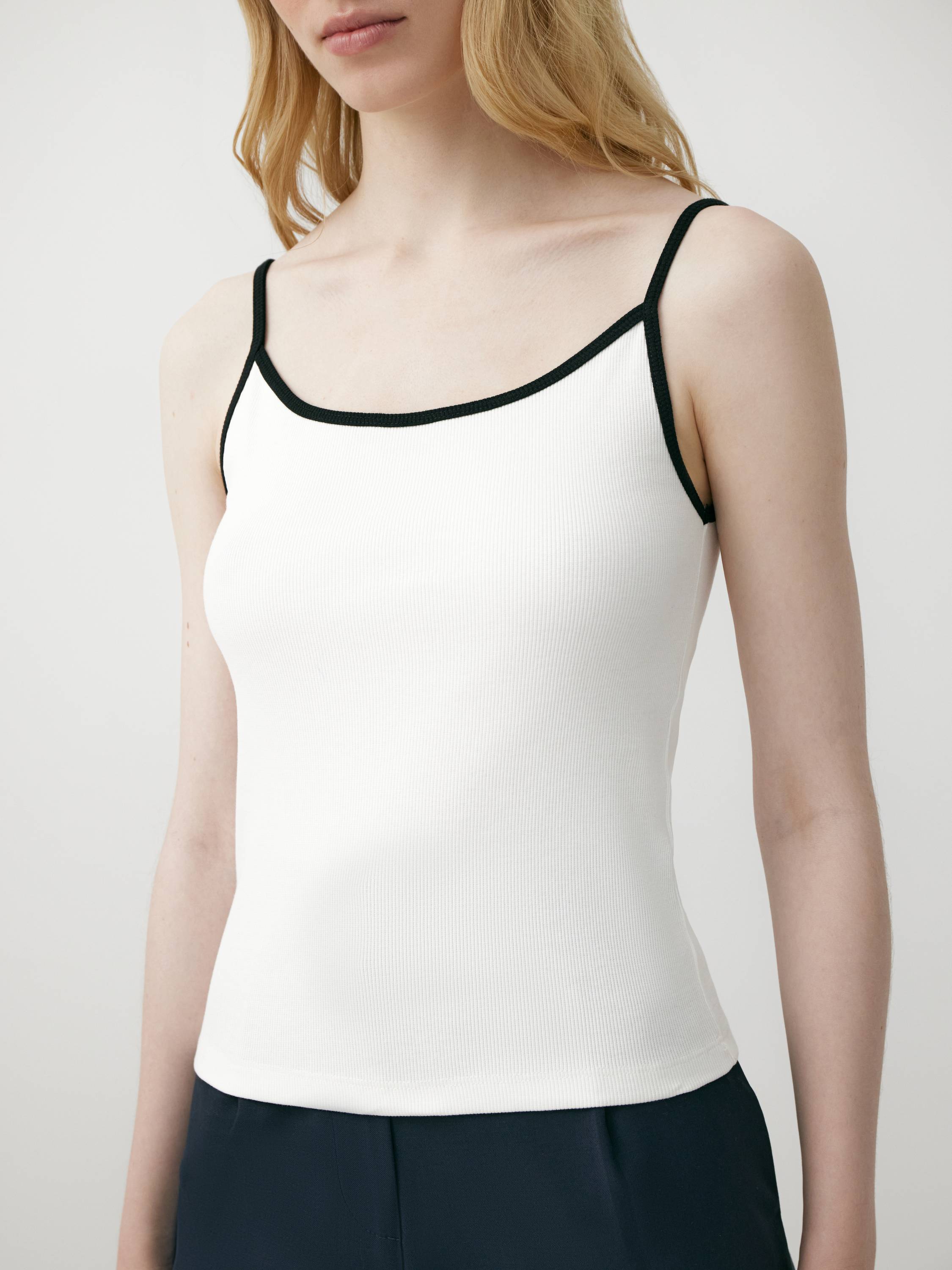 Минималистичный топ на тонких бретелях выполнен из мягкого смесового хлопка с добавлением эластана. Ткань в мелкий рубчик комфортно прилегает к телу, мягко подчеркивая силуэт и обеспечивая свободу движений. Контрастная окантовка по вырезу придает модели графичность и визуальную четкость, сохраняя при этом ощущение легкости. За счет лаконичного дизайна топ легко адаптируется под разные стили — от расслабленного повседневного до более структурного образа с жакетом. Сдержанная палитра делает его универсальной базой на каждый день.