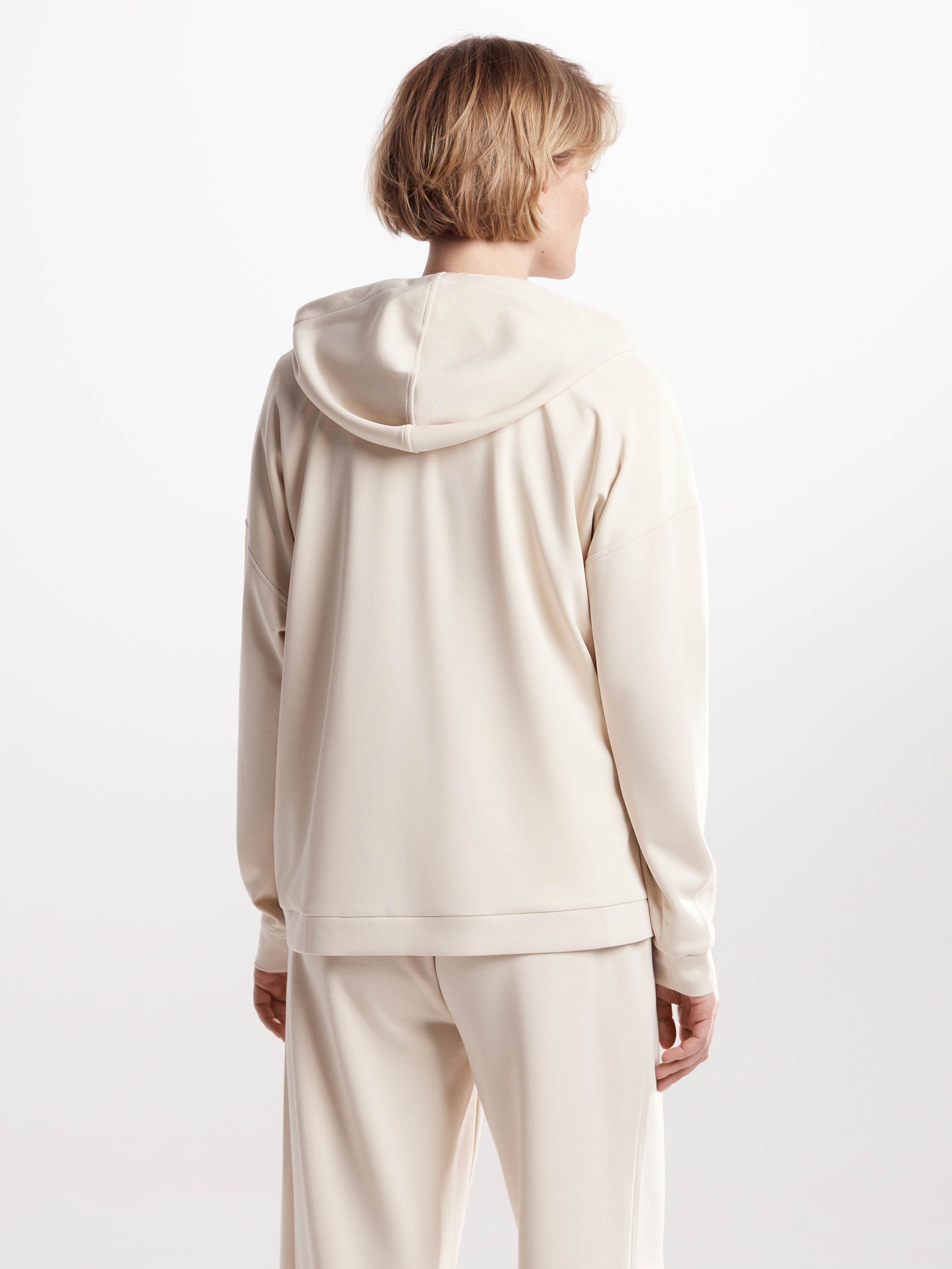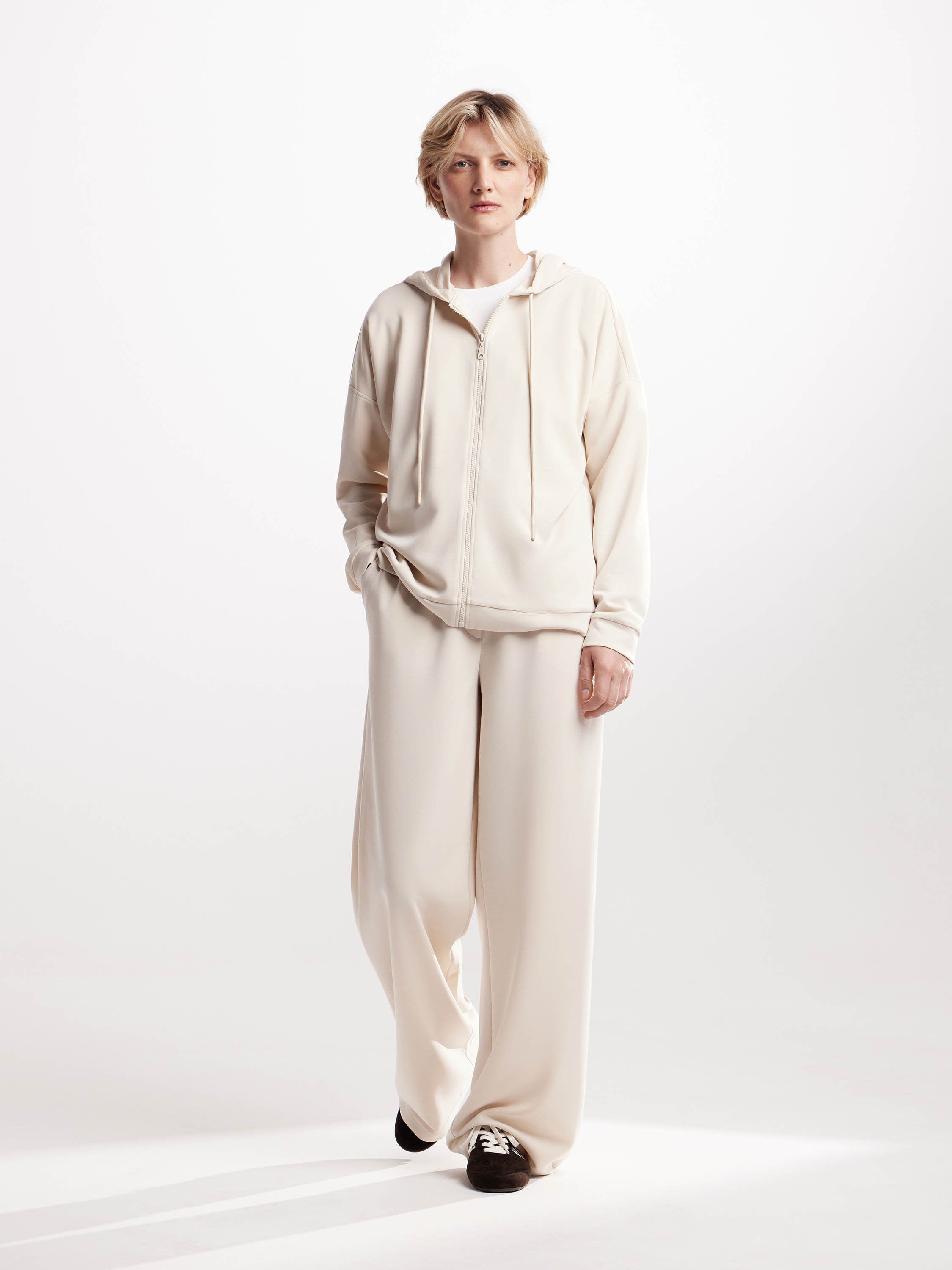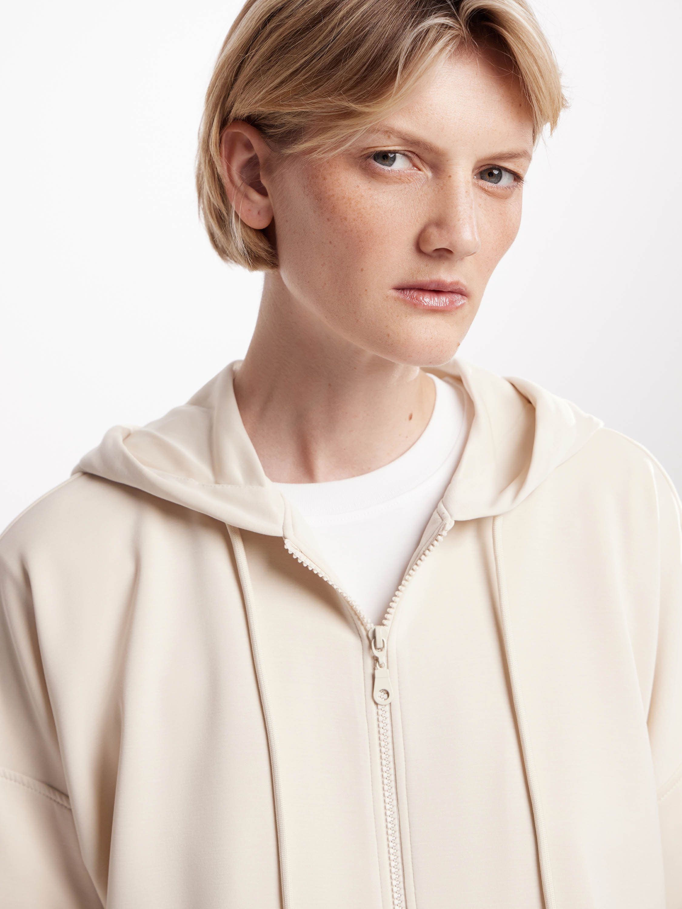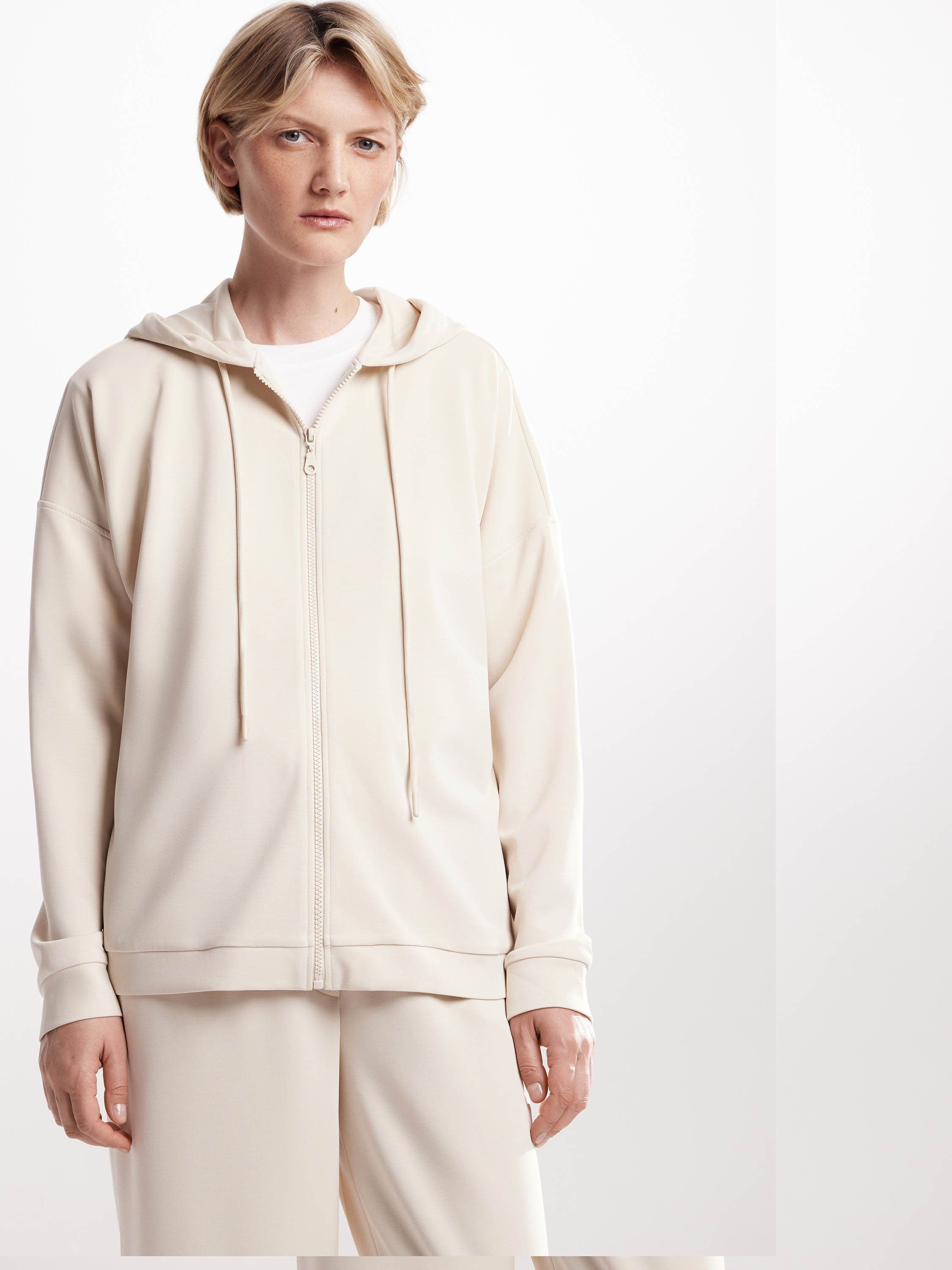 Толстовка на молнии из мягкого трикотажа — универсальная вещь с акцентом на комфорт. Прямой силуэт, расслабленная посадка и капюшон с кулиской создают непринужденное настроение, а лаконичный дизайн делает модель уместной в разных стилях — от спортивного до повседневного минимализма. Материал с высоким содержанием модала приятен к телу, пластичен и устойчив к износу, а эластан в составе добавляет свободы в движении. Такая толстовка работает и как самостоятельный элемент, и в комплекте с брюками в тон — для цельного, продуманного образа.