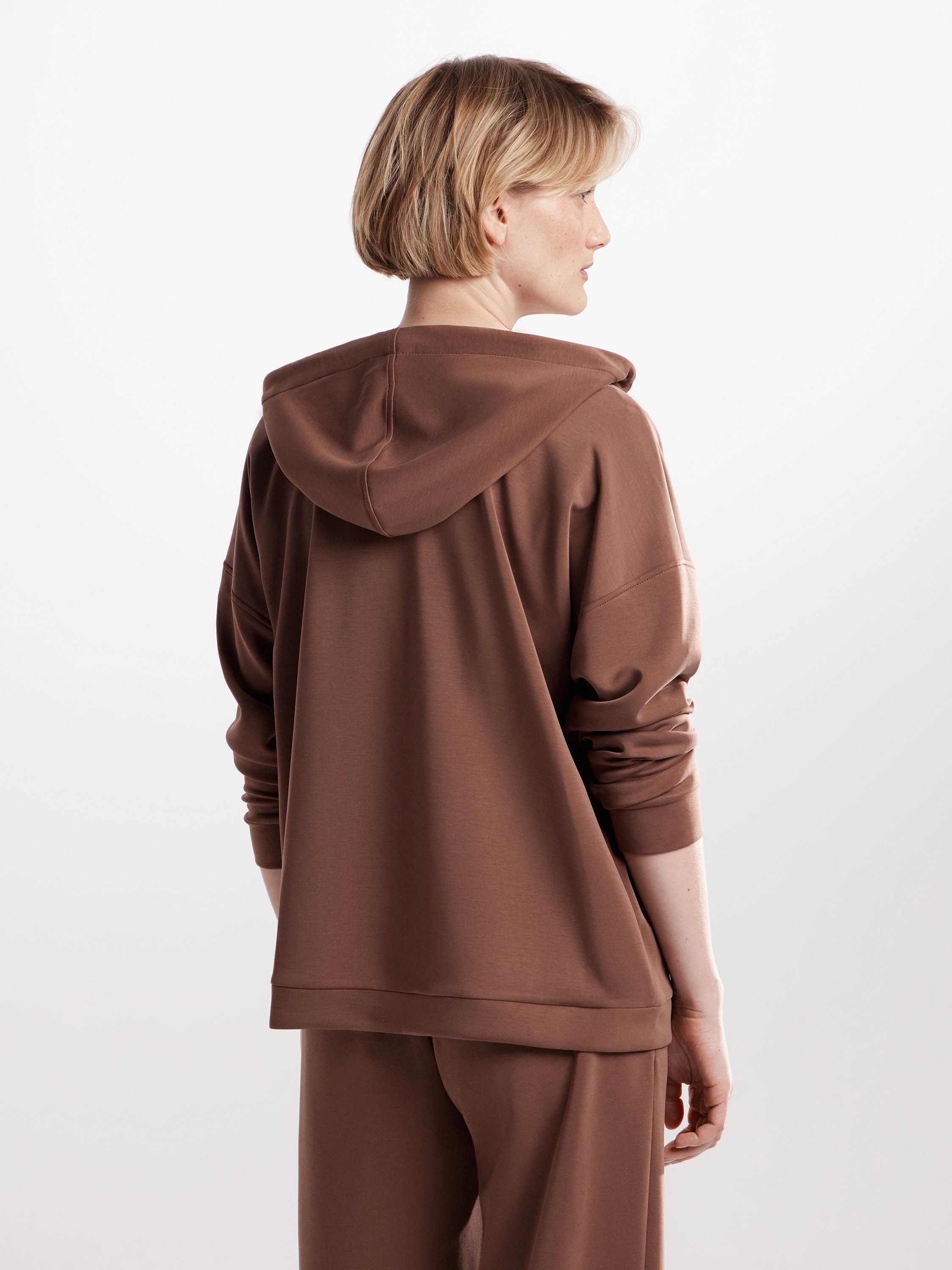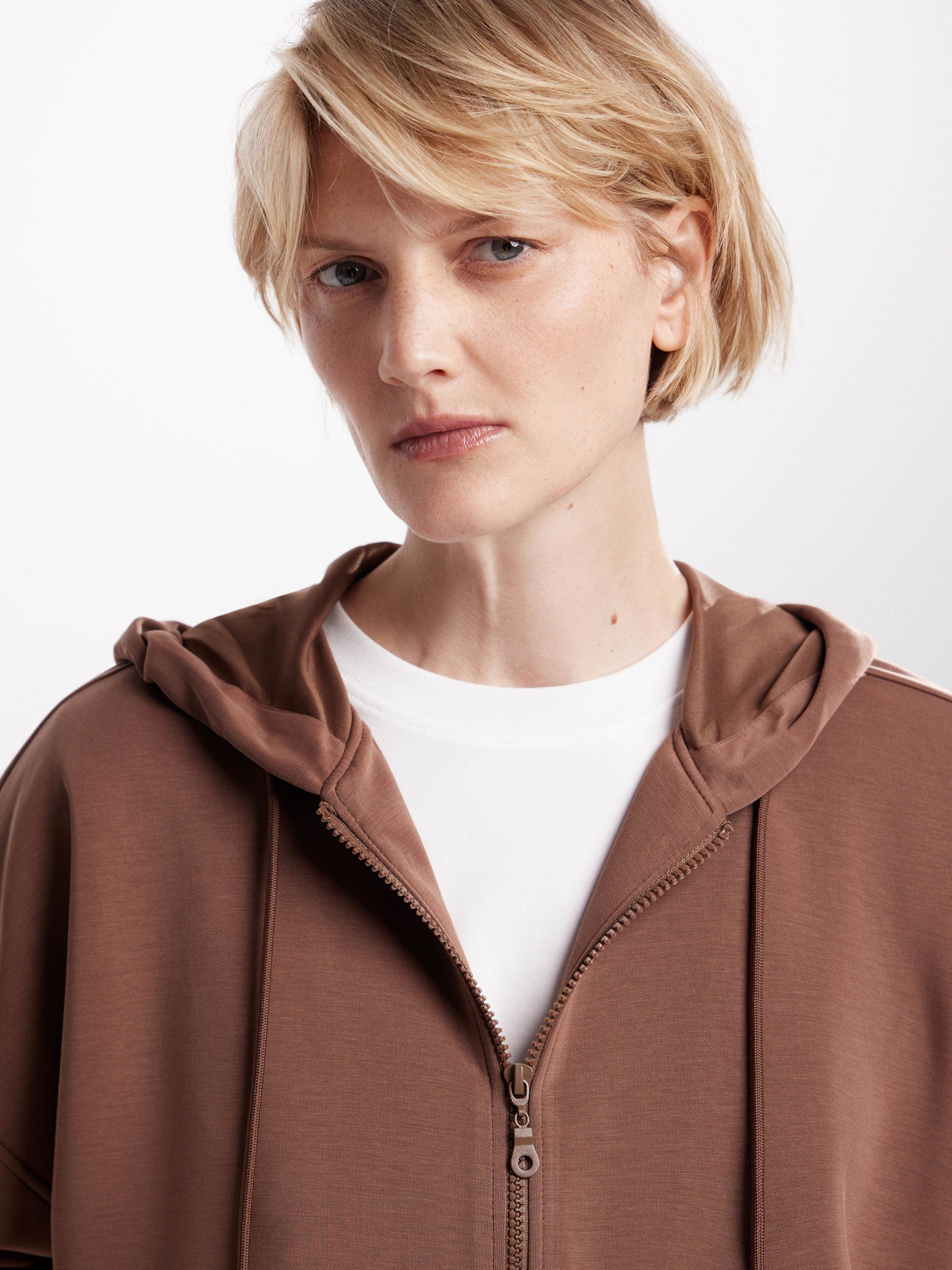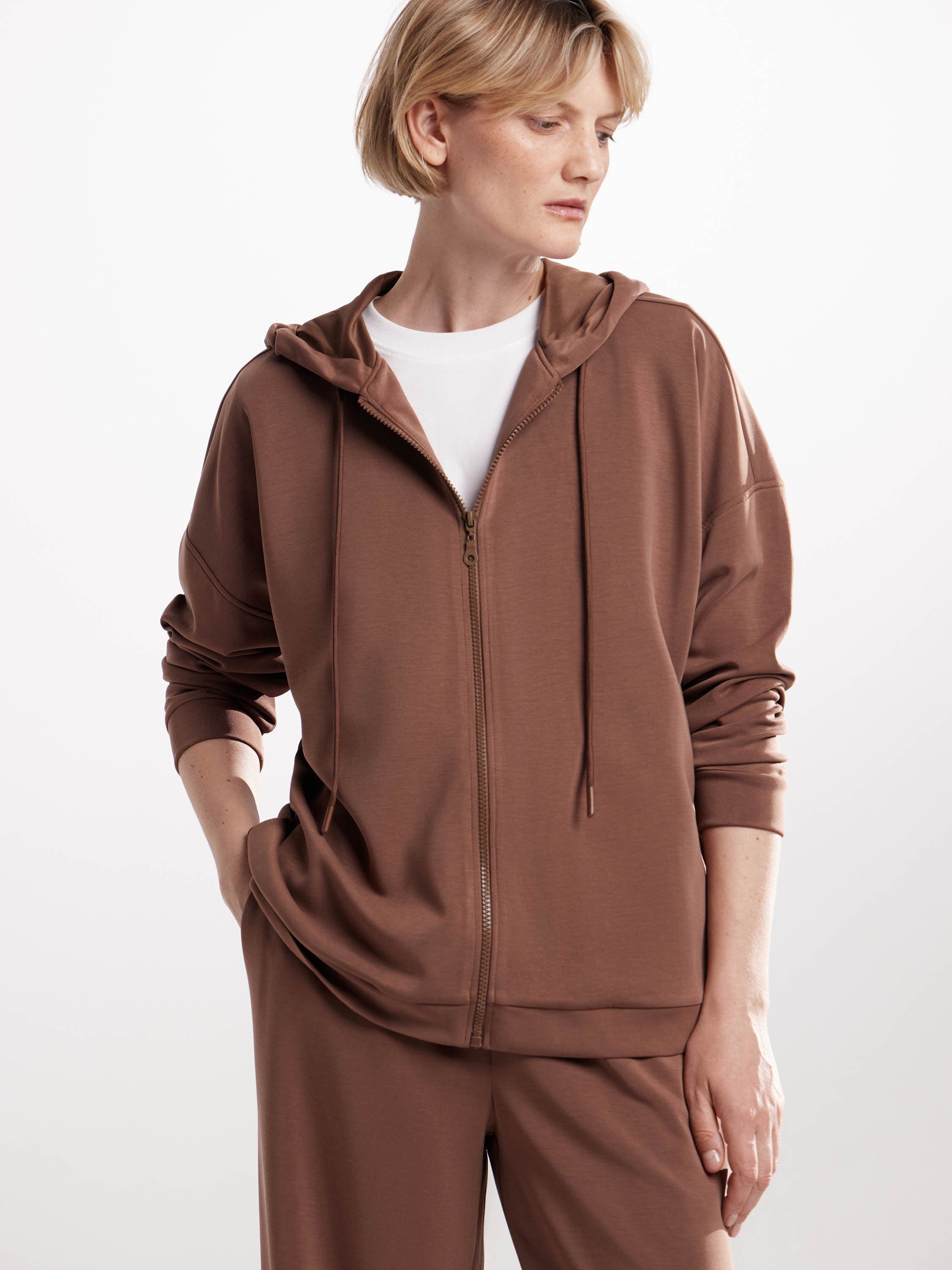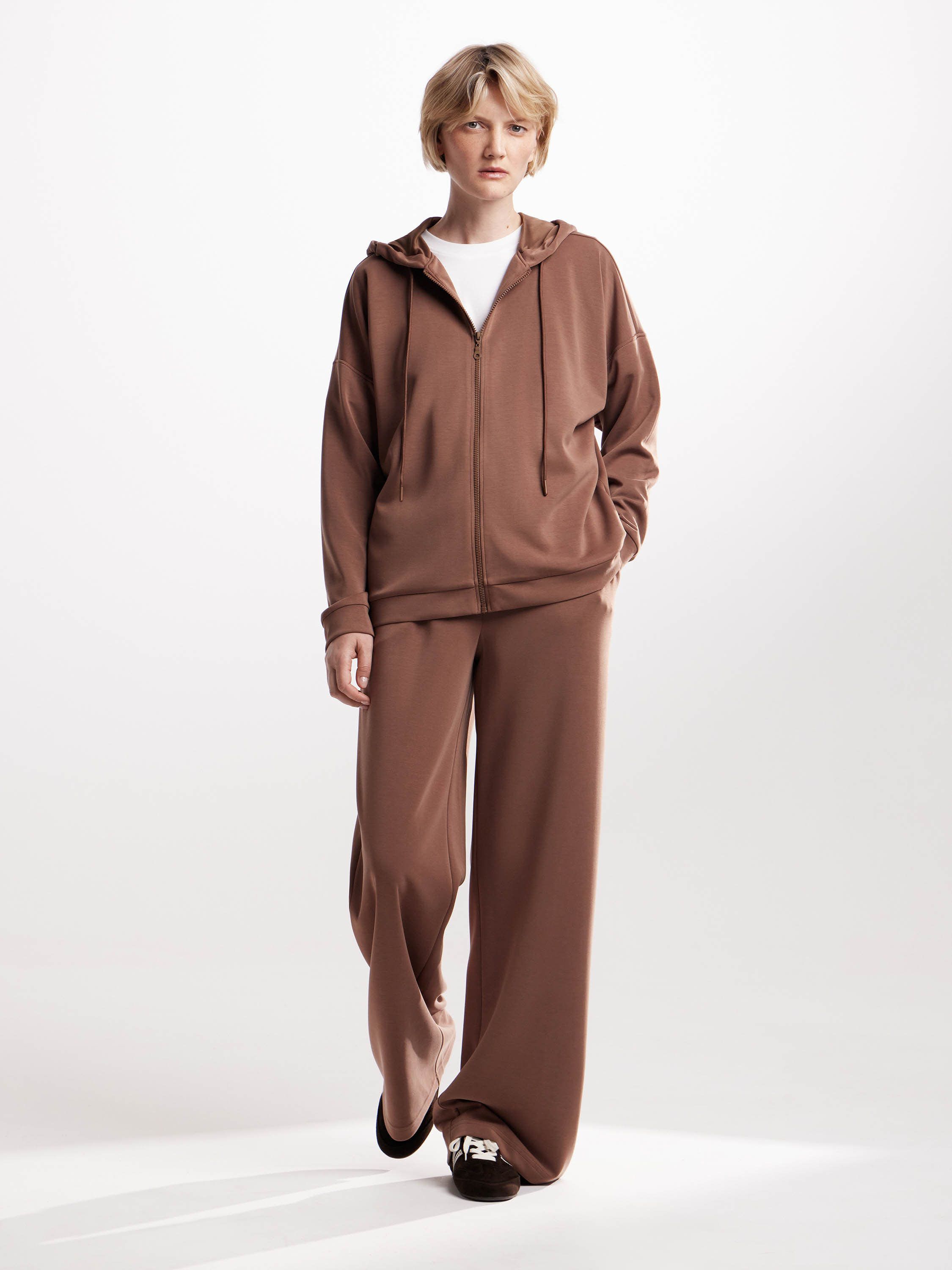 Толстовка на молнии из мягкого трикотажа — универсальная вещь с акцентом на комфорт. Прямой силуэт, расслабленная посадка и капюшон с кулиской создают непринужденное настроение, а лаконичный дизайн делает модель уместной в разных стилях — от спортивного до повседневного минимализма. Материал с высоким содержанием модала приятен к телу, пластичен и устойчив к износу, а эластан в составе добавляет свободы в движении. Такая толстовка работает и как самостоятельный элемент, и в комплекте с брюками в тон — для цельного, продуманного образа.