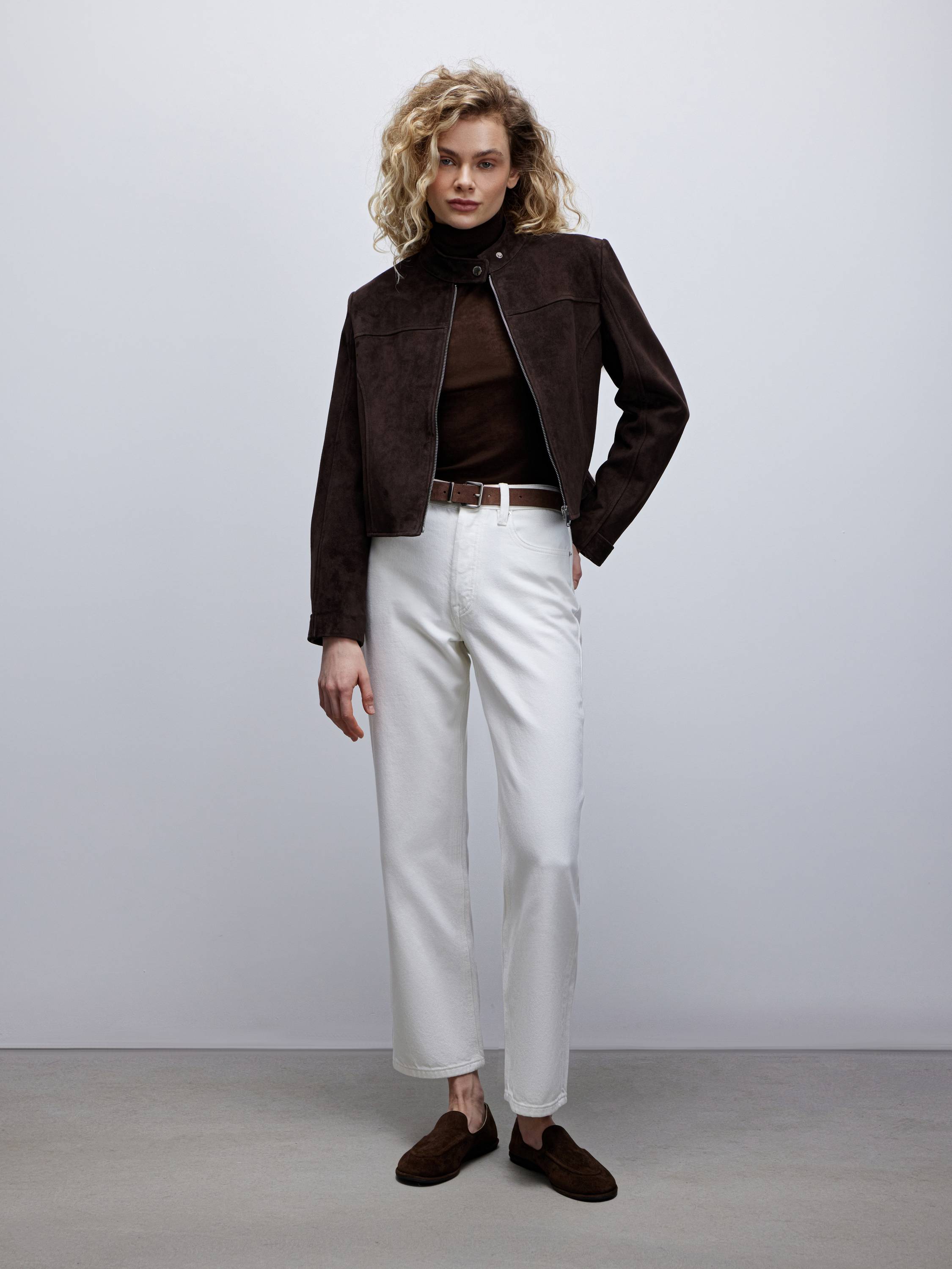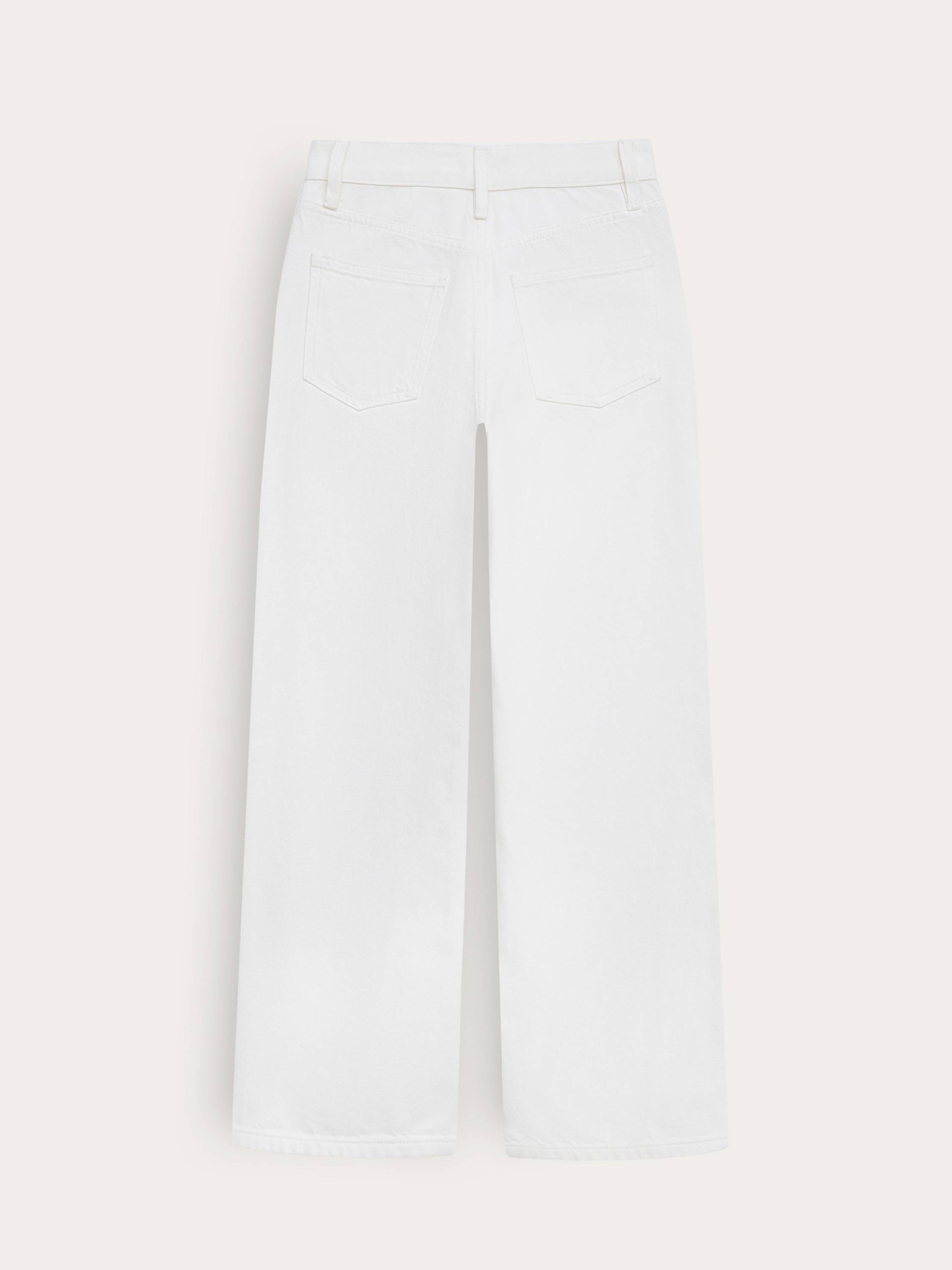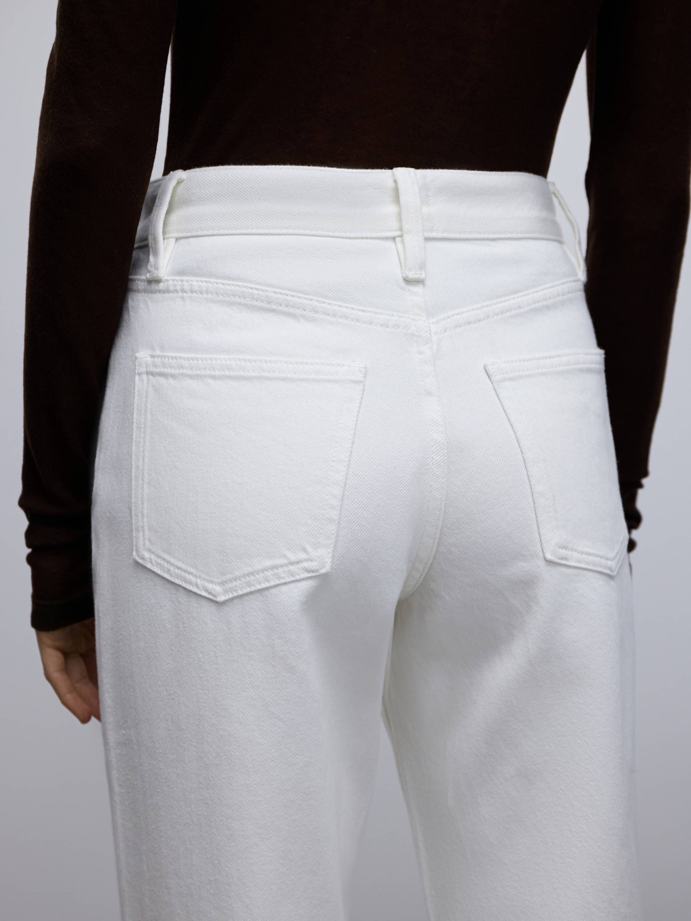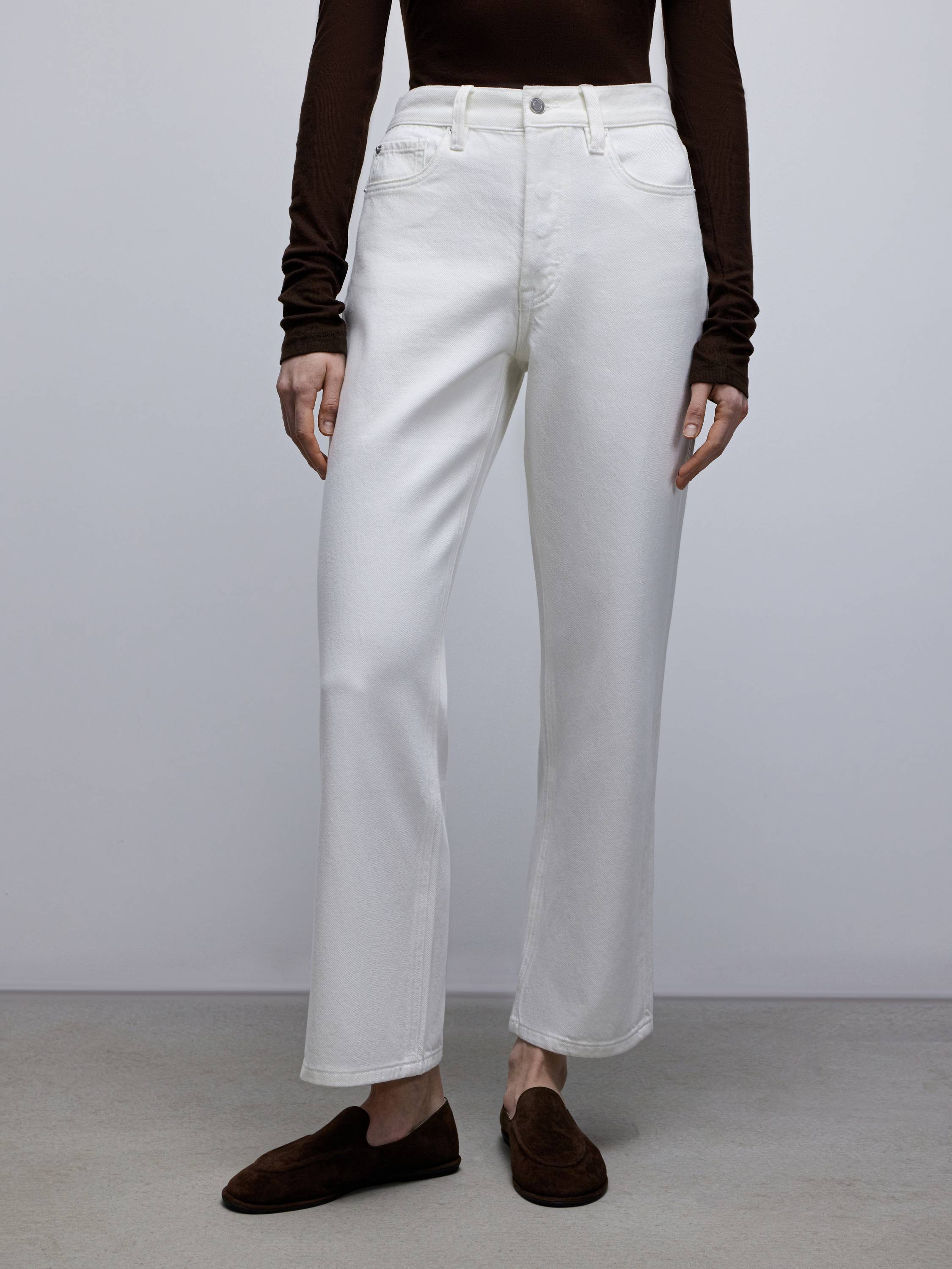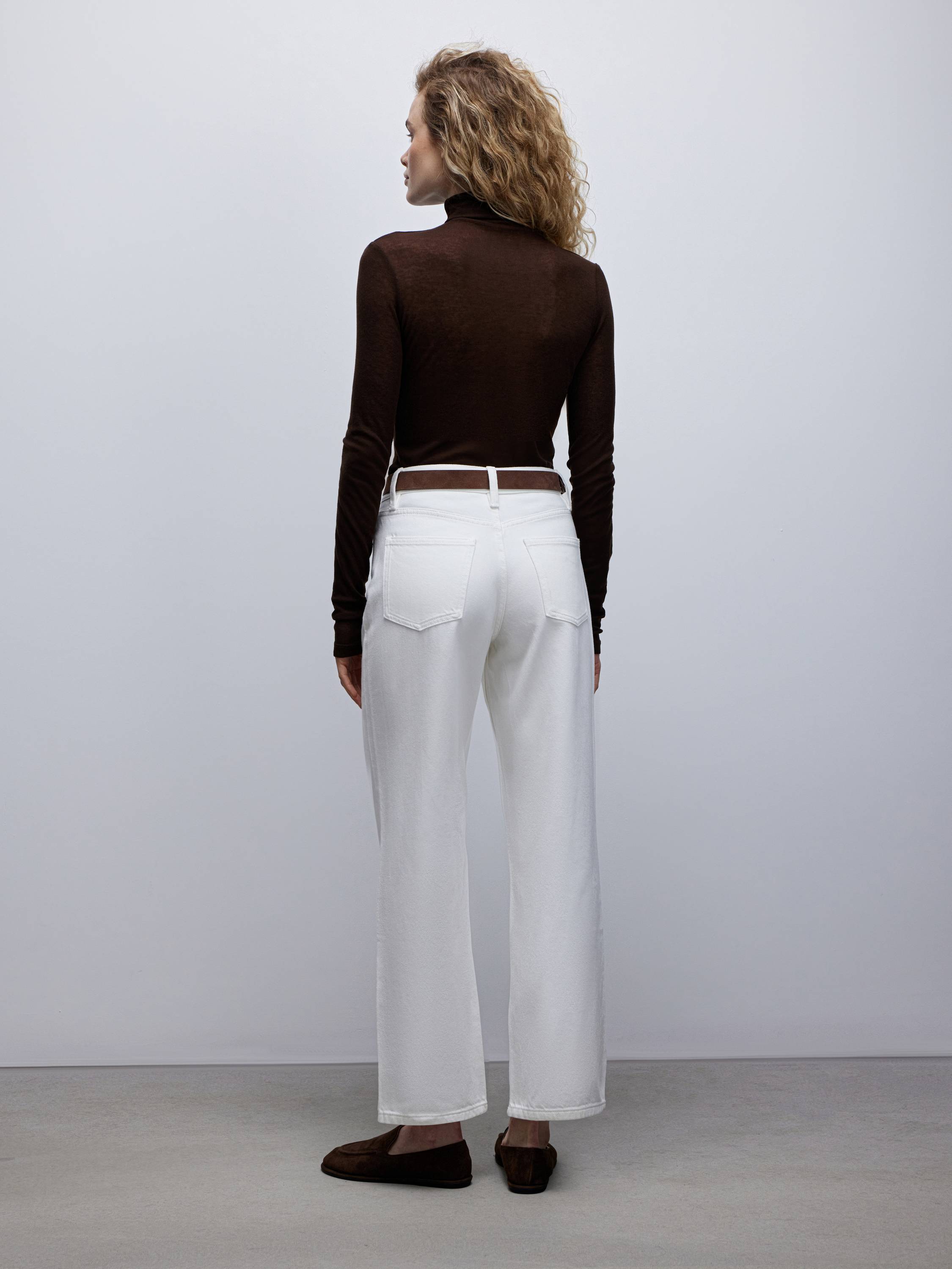 Укороченные джинсы из плотного хлопкового денима с высокой посадкой и лаконичным прямым кроем. Модель визуально вытягивает силуэт, акцентируя внимание на талии и создавая легкий графичный ритм в образе. Ткань с плотным переплетением хорошо держит форму и адаптируется к фигуре в процессе носки. Безупречно скроенный пояс, потайная застежка и ровные строчки подчеркивают внимание к деталям. Универсальный вариант на каждый день — органично сочетается с футболками, топами, структурированными жакетами и трикотажем.