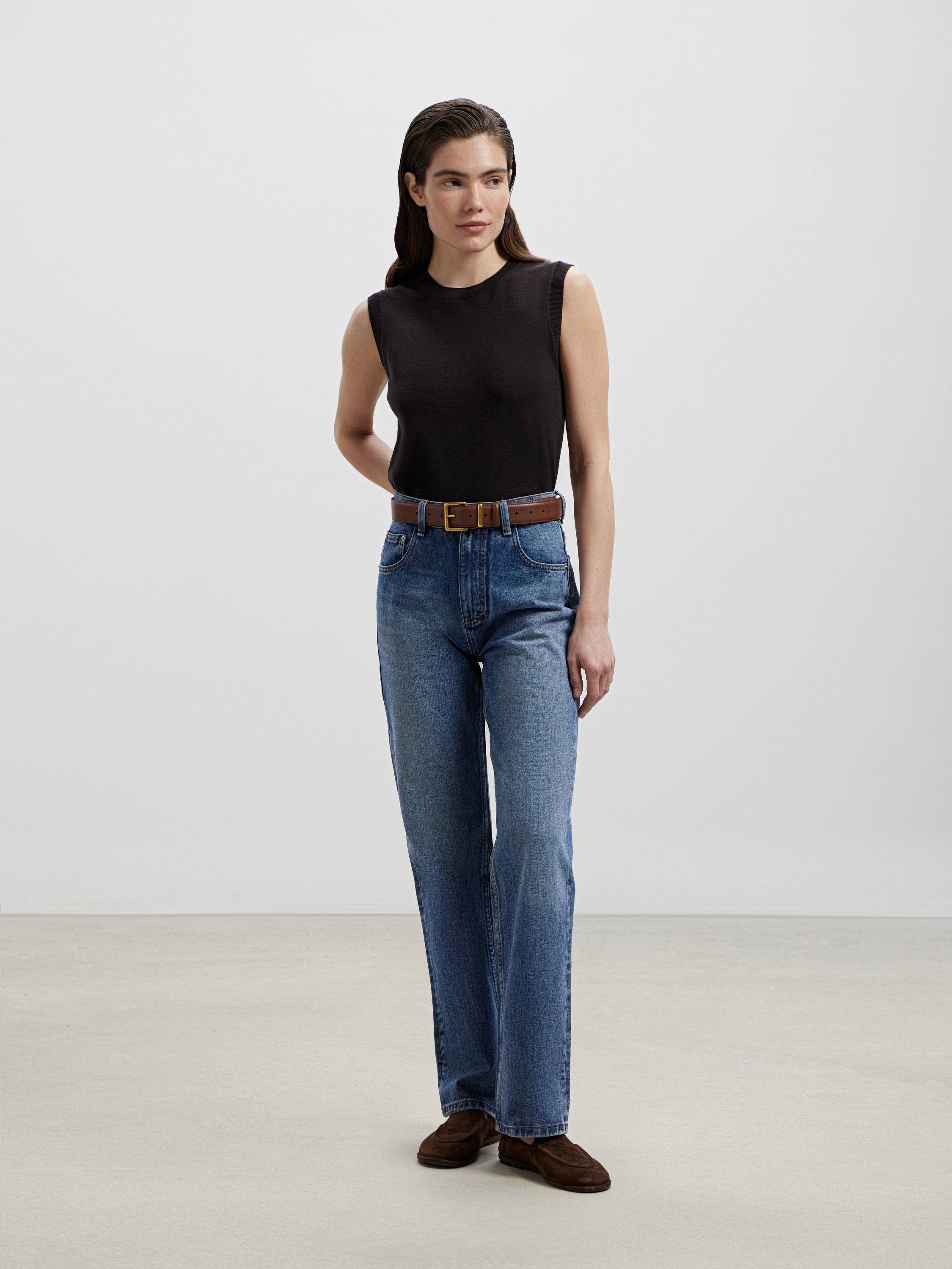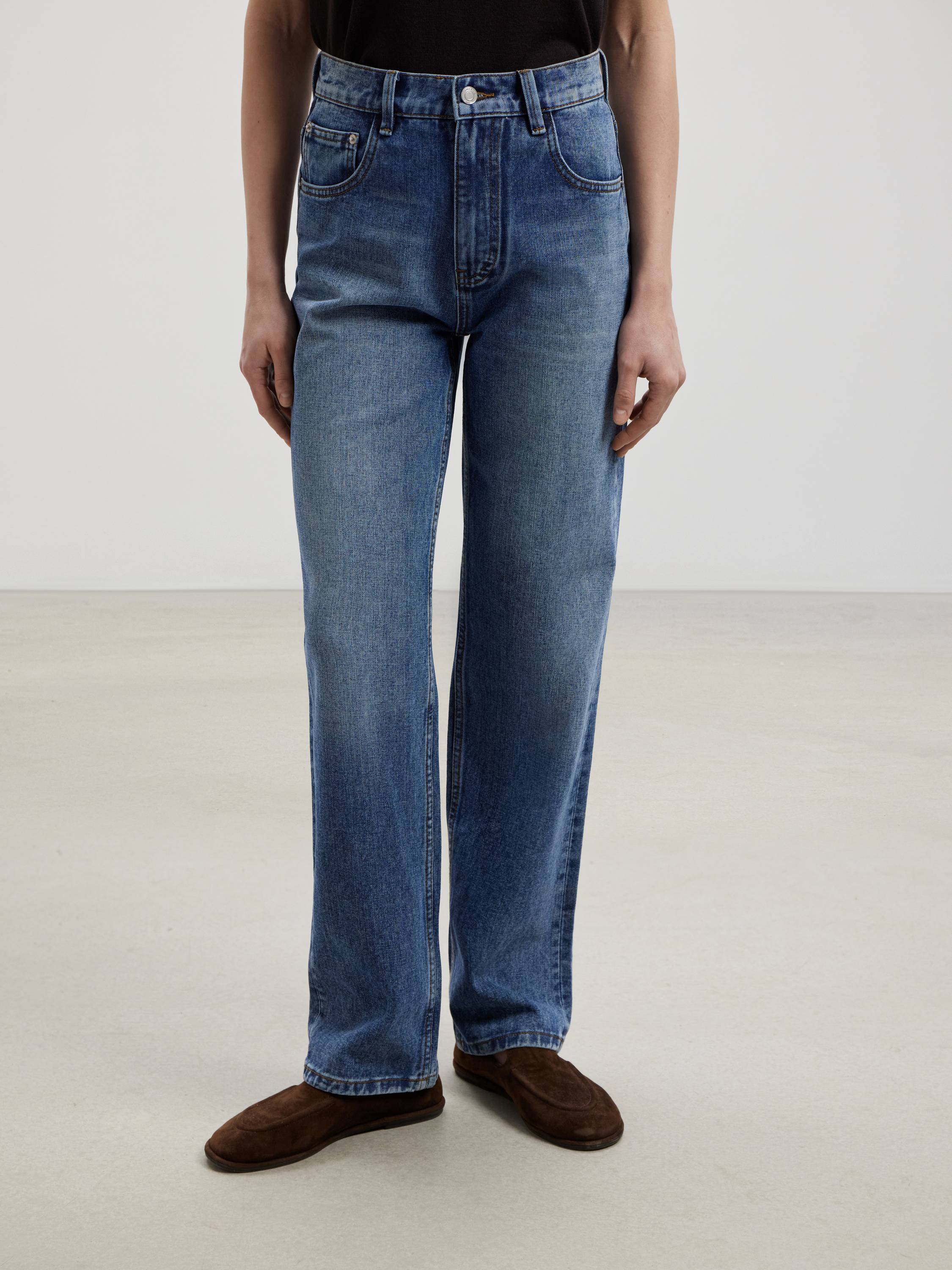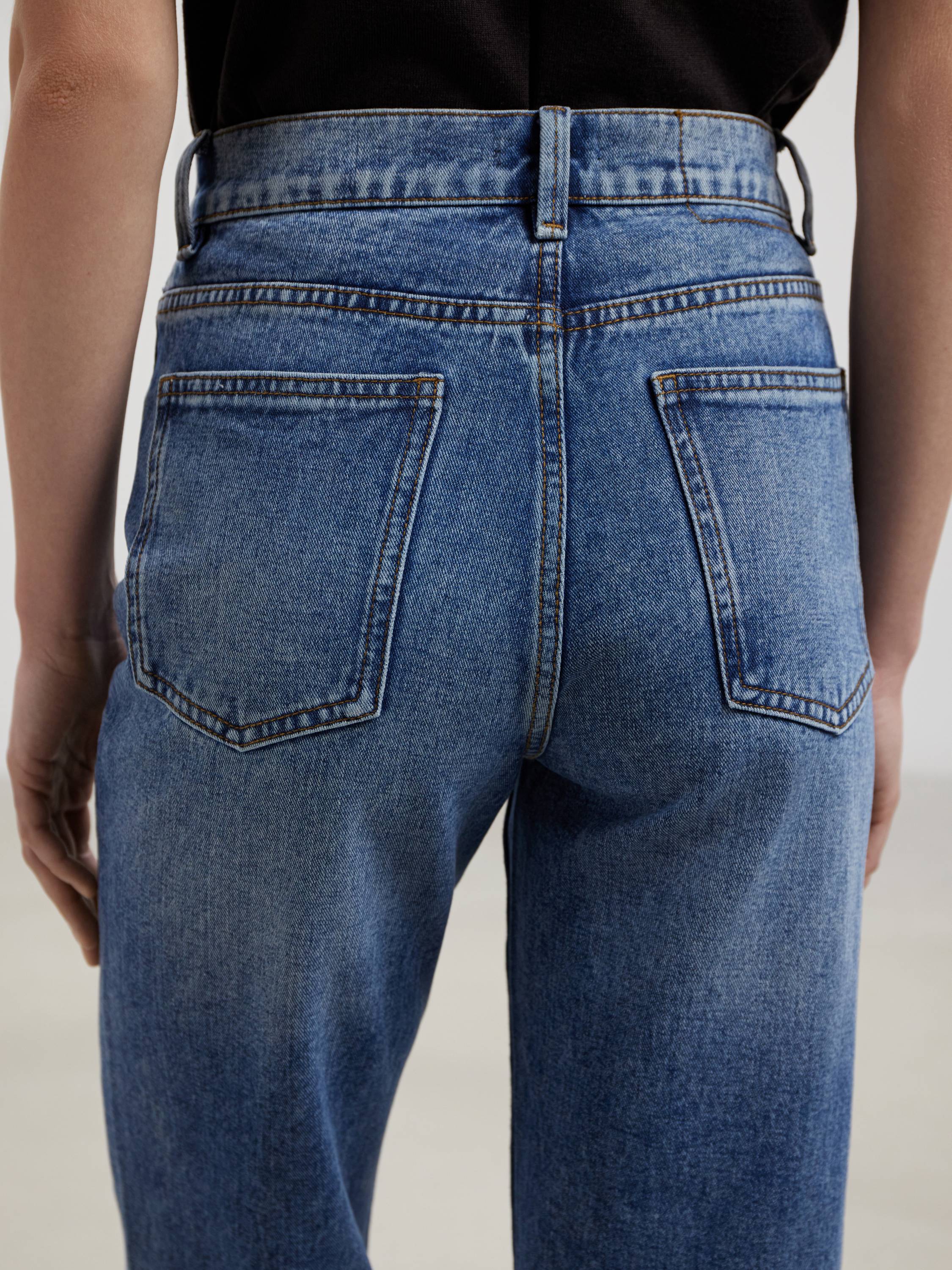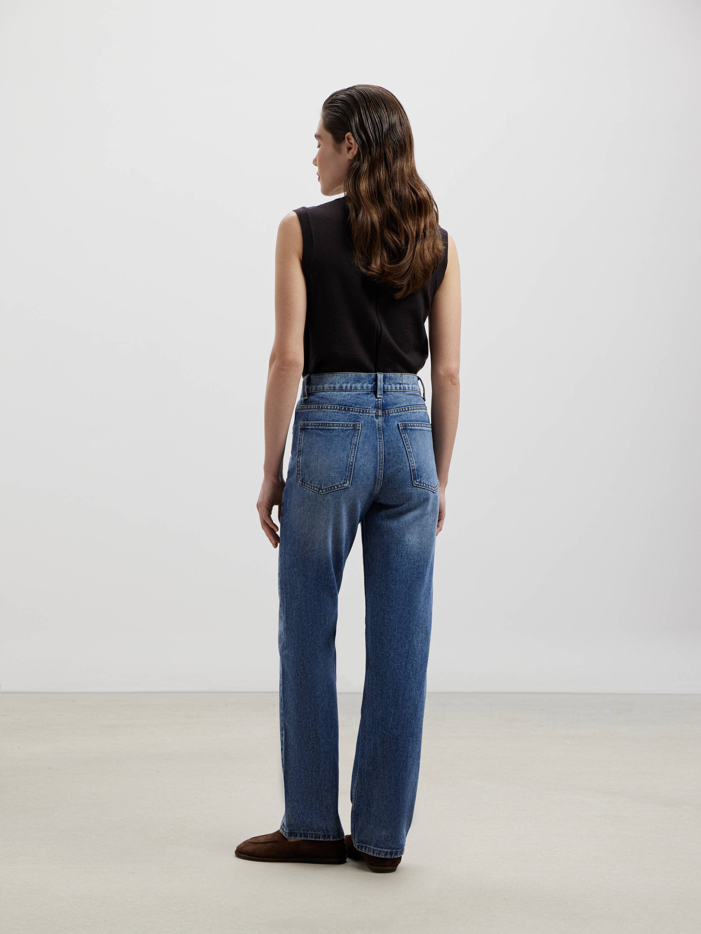 Джинсы из плотного денима с прямым силуэтом и высокой посадкой. Материал — смесовое хлопковое полотно: дышит, держит форму, со временем адаптируется к фигуре. Классическая посадка на талии визуально удлиняет ноги и подчеркивает линию бедер, а прямой крой создает сбалансированный силуэт без акцента на объеме. Аккуратные шлевки, потайная застежка на молнию и металлическая пуговица — в лучших традициях денима. Темно-синий оттенок с эффектом легкой выварки универсален: его легко сочетать как с белой рубашкой и лоферами, так и с базовым трикотажем и сандалиями. Незаменимая пара на каждый день — для тех, кто ценит конструктивную простоту и утонченную лаконичность.