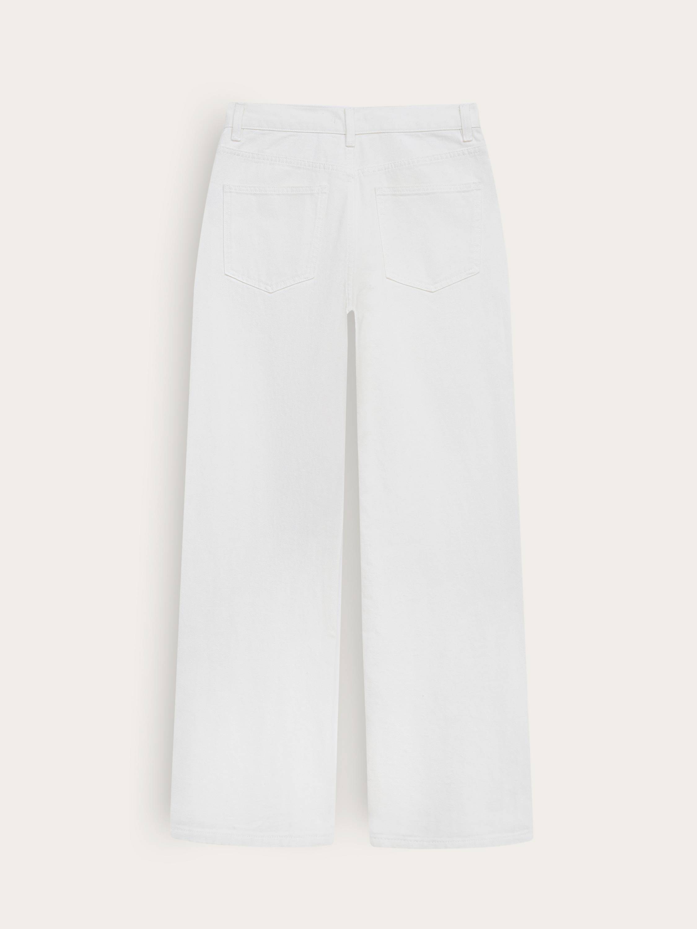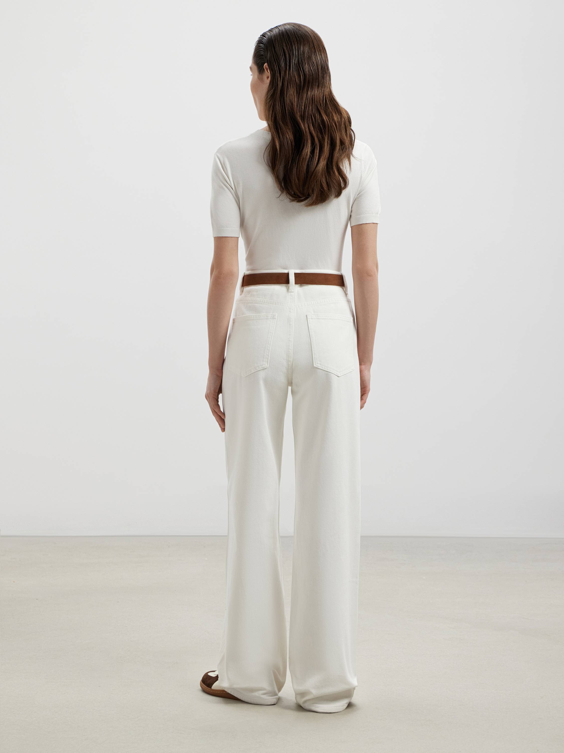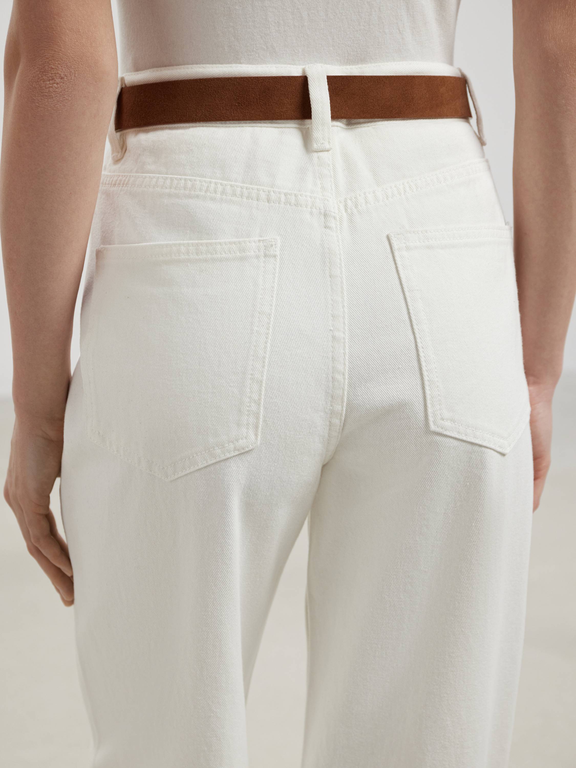 Свободные джинсы из плотного хлопка с выразительной фактурой. Натуральный состав обеспечивает дышащие свойства ткани и комфорт при носке, а чистый белый цвет делает модель универсальной — как для летнего гардероба, так и в межсезонье. Посадка — высокая, силуэт — расслабленный и прямой от бедра до низа, без сужения. Функциональные карманы, классическая застежка и строгая линия пояса подчеркивают продуманный характер модели и придают ей аккуратный, собранный вид. Благодаря этому джинсы органично вписываются в разные образы — от минималистичных с базовой футболкой до более сложных с рубашками, жакетами или объемным трикотажем.