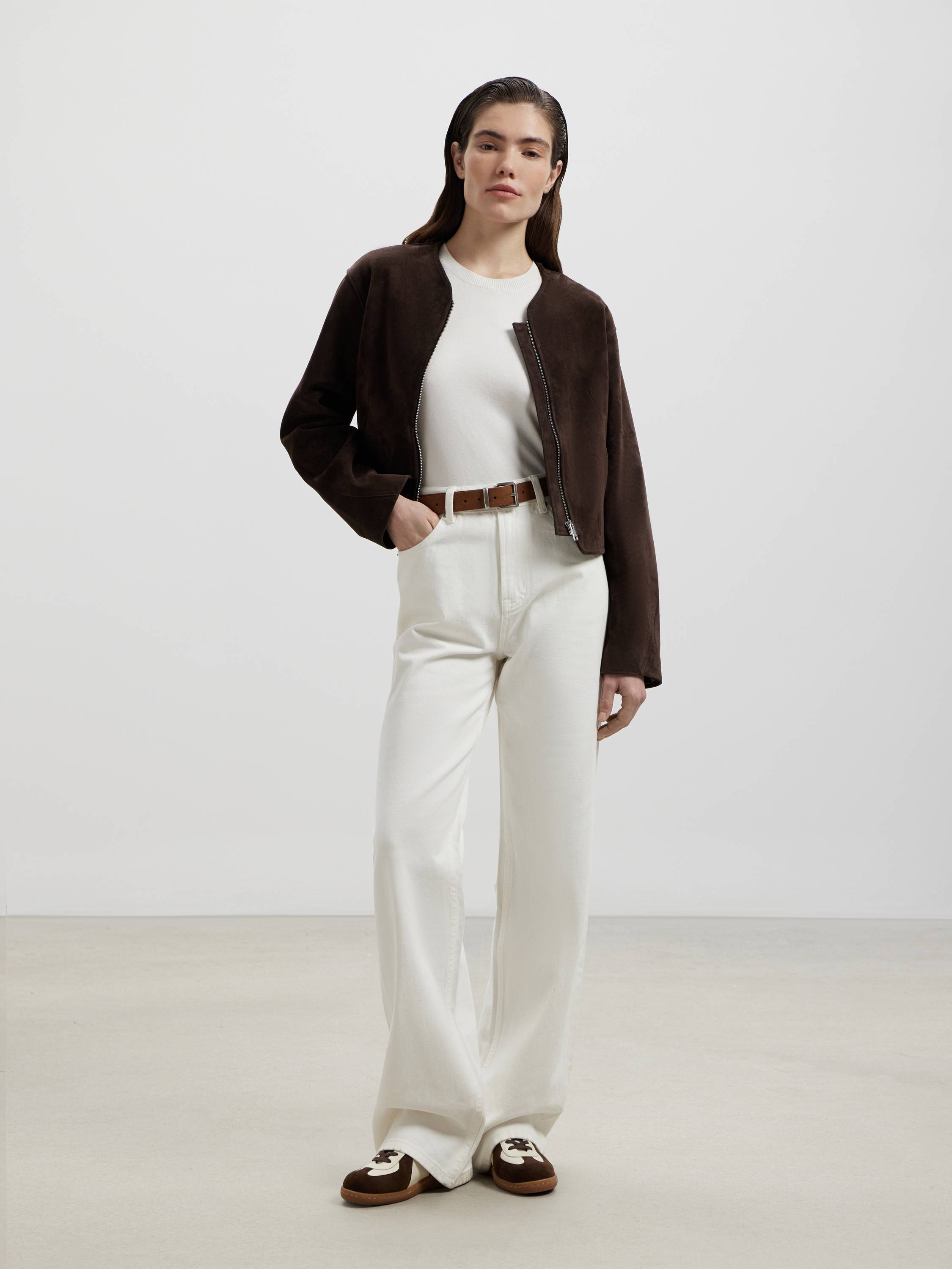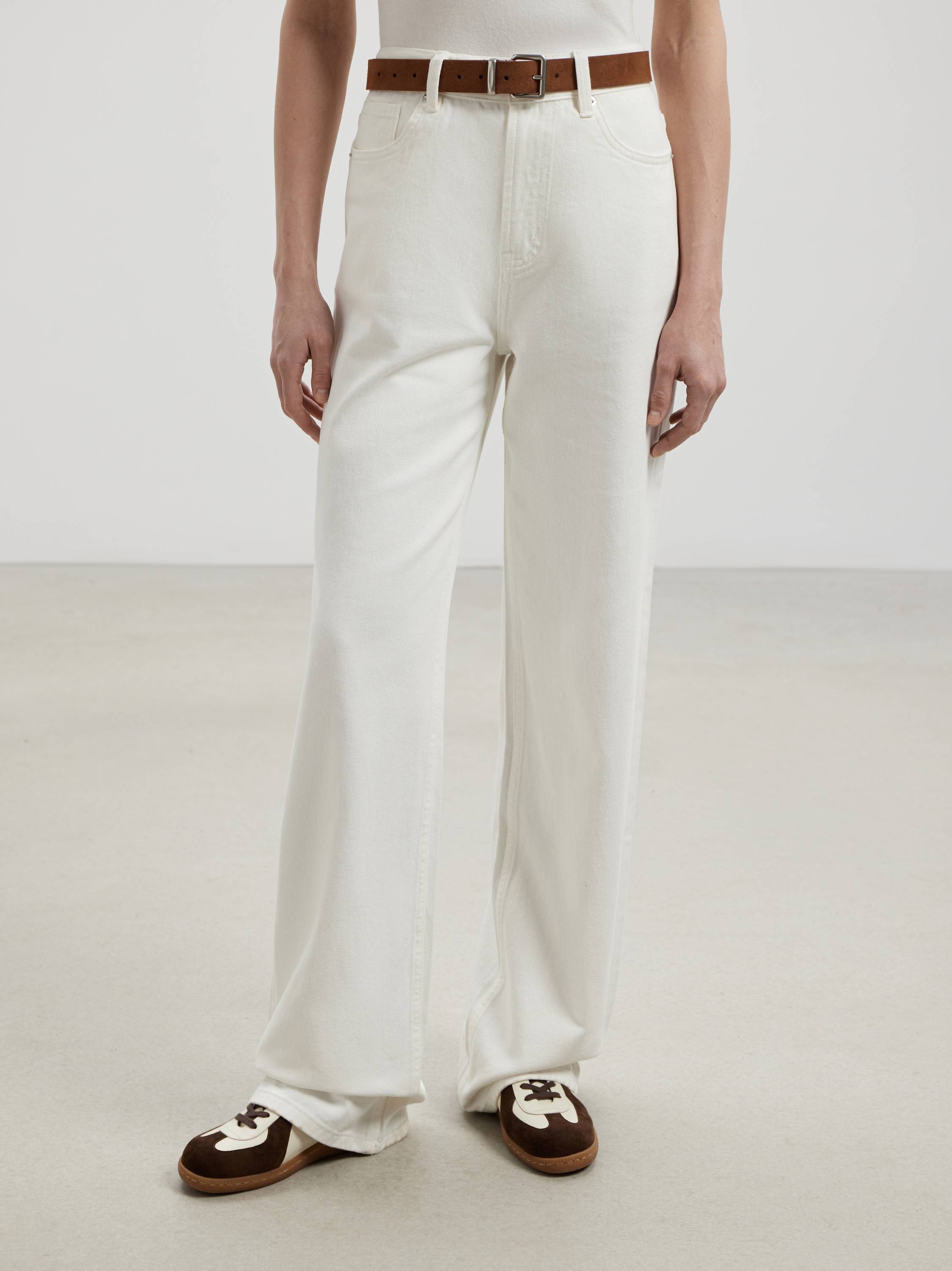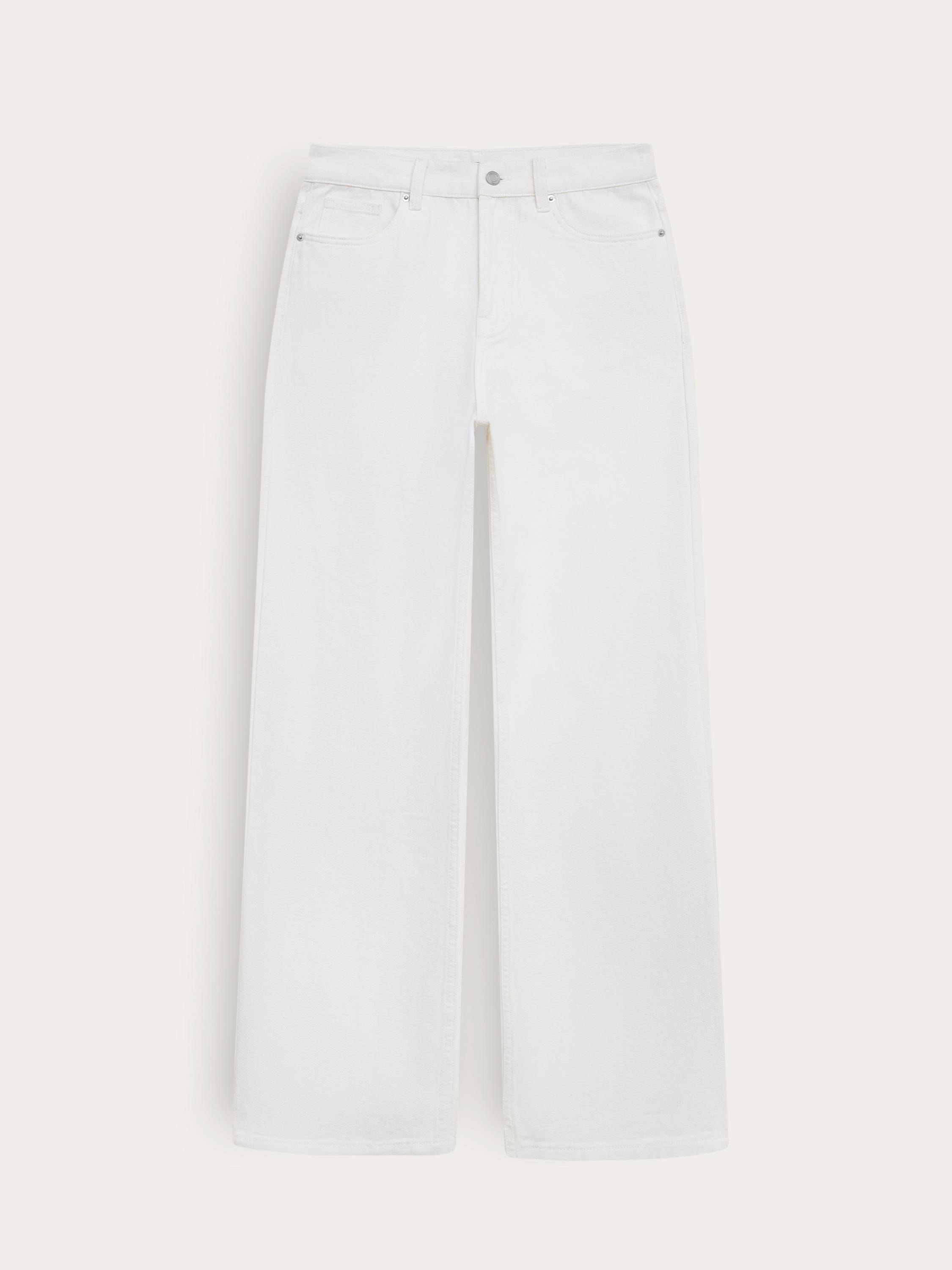 Свободные джинсы из плотного хлопка с выразительной фактурой. Натуральный состав обеспечивает дышащие свойства ткани и комфорт при носке, а чистый белый цвет делает модель универсальной — как для летнего гардероба, так и в межсезонье. Посадка — высокая, силуэт — расслабленный и прямой от бедра до низа, без сужения. Функциональные карманы, классическая застежка и строгая линия пояса подчеркивают продуманный характер модели и придают ей аккуратный, собранный вид. Благодаря этому джинсы органично вписываются в разные образы — от минималистичных с базовой футболкой до более сложных с рубашками, жакетами или объемным трикотажем.