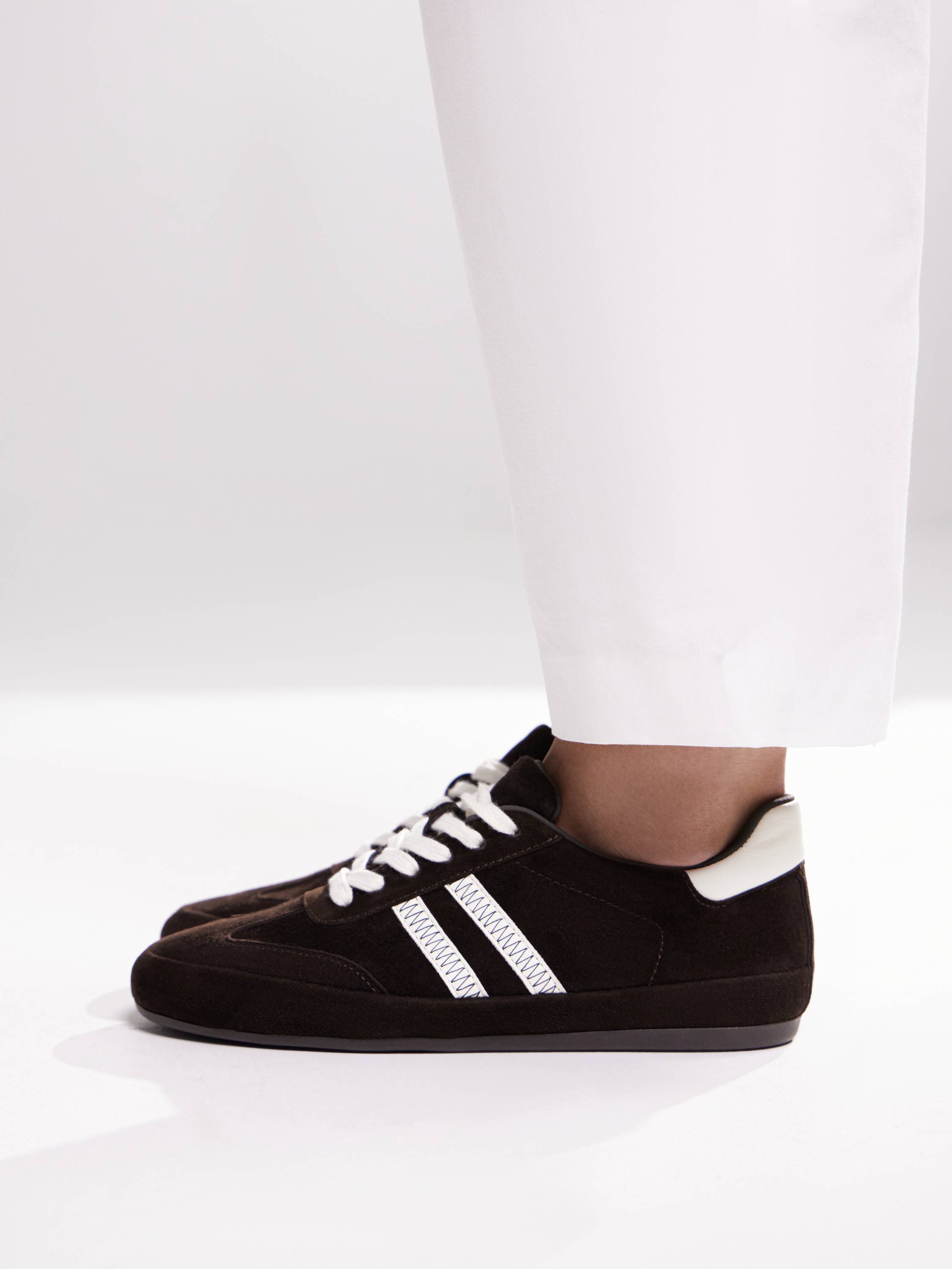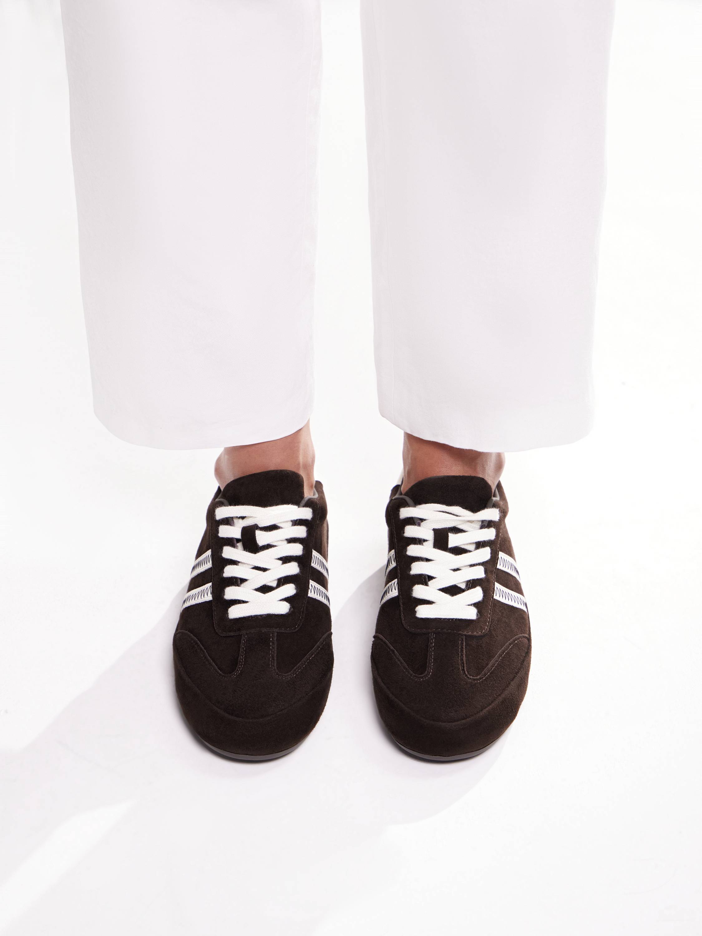 Кроссовки из мягкой замши с кожаными вставками — переосмысление классики в духе современной лаконичности. Сдержанный силуэт дополнен характерными деталями: белыми шнурками, рельефной строчкой и двойными полосками по бокам с графичным зигзагом. Низкий верх и обтекаемая форма придают модели винтажный характер, а амортизирующая подошва обеспечивает комфорт при ходьбе. Универсальный темно-шоколадный оттенок впишется как в повседневные, так и в более собранные образы с брюками или юбкой.