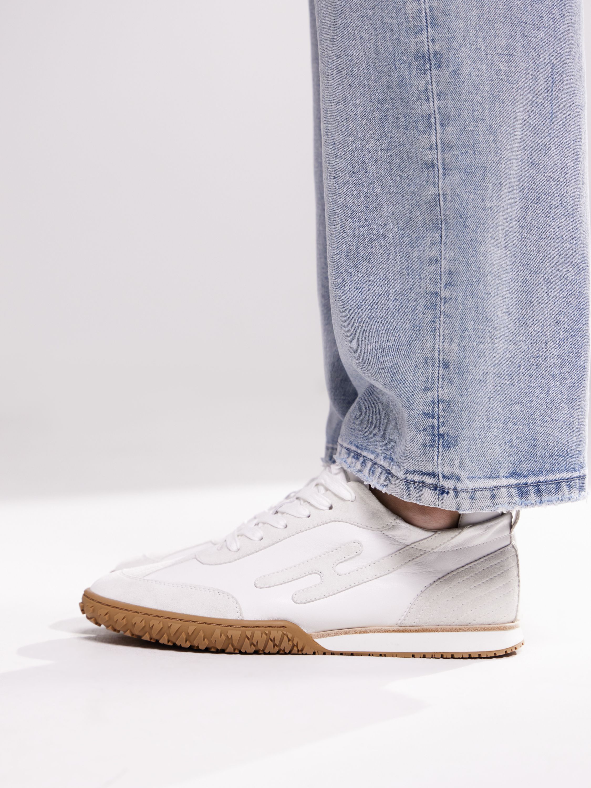 Кроссовки из гладкой кожи с замшевыми вставками — базовая пара на каждый день с акцентом на фактуру и чистый силуэт. Матовая поверхность и мягкий велюр формируют визуально объемную конструкцию, при этом остаются тактильно приятными и износостойкими. Плавная линия мыска, классическая шнуровка и рельефная подошва в оттенке натурального каучука создают сбалансированный образ в духе современной классики. Модель легко вписывается в повседневный гардероб: сочетайте ее с денимом, хлопковыми брюками или лаконичными платьями — в любом варианте эта пара работает как уверенный и универсальный акцент.
