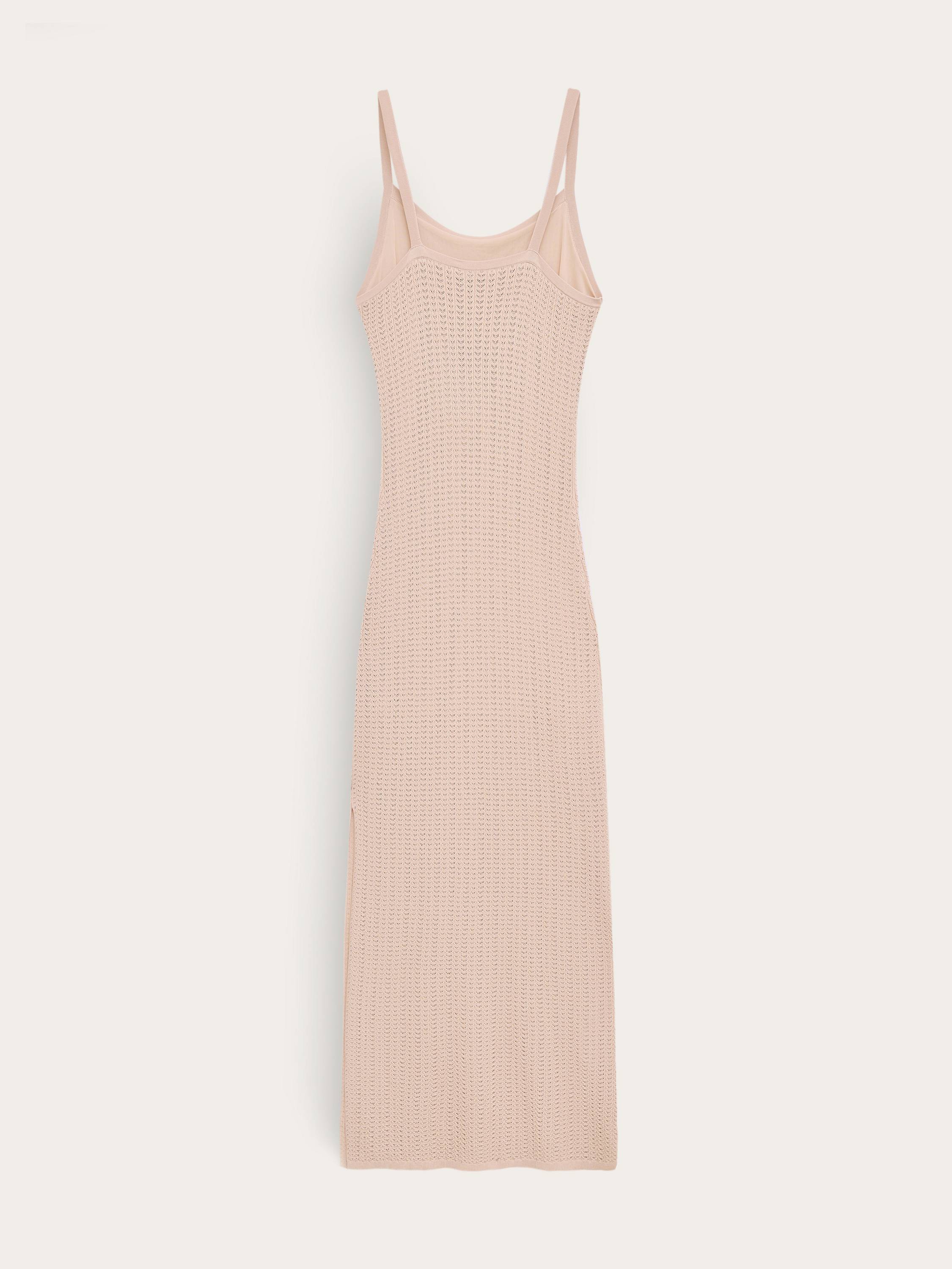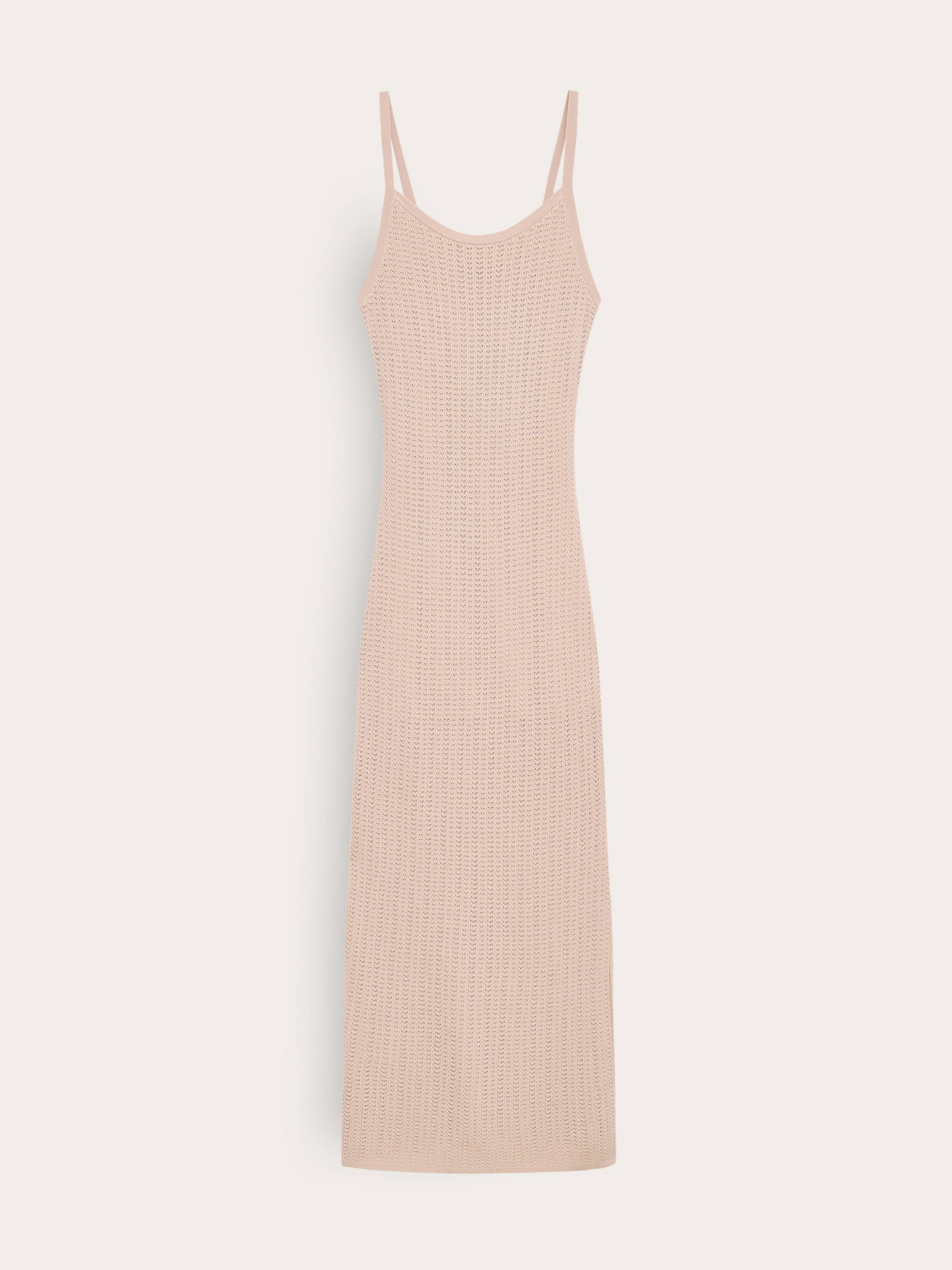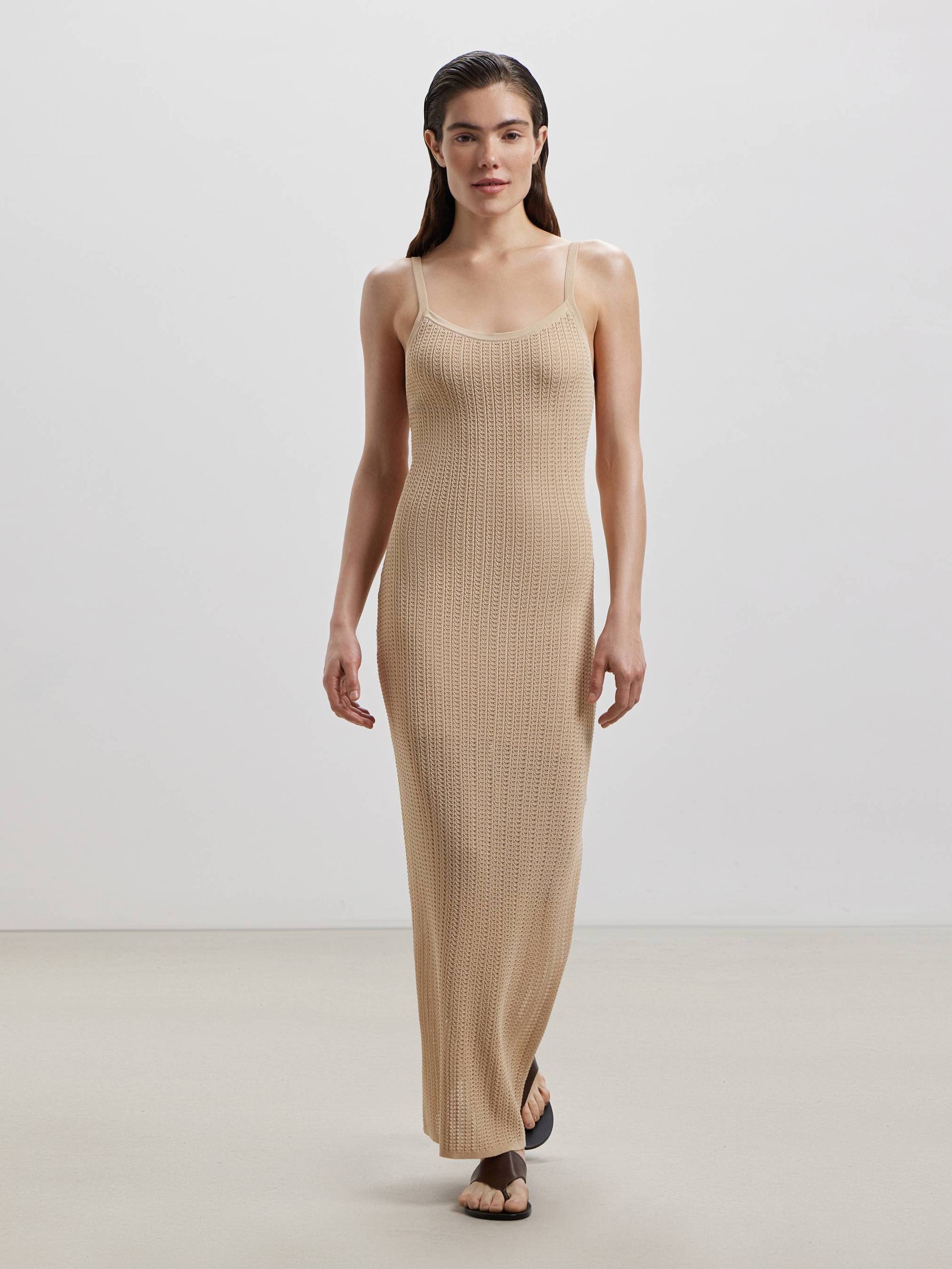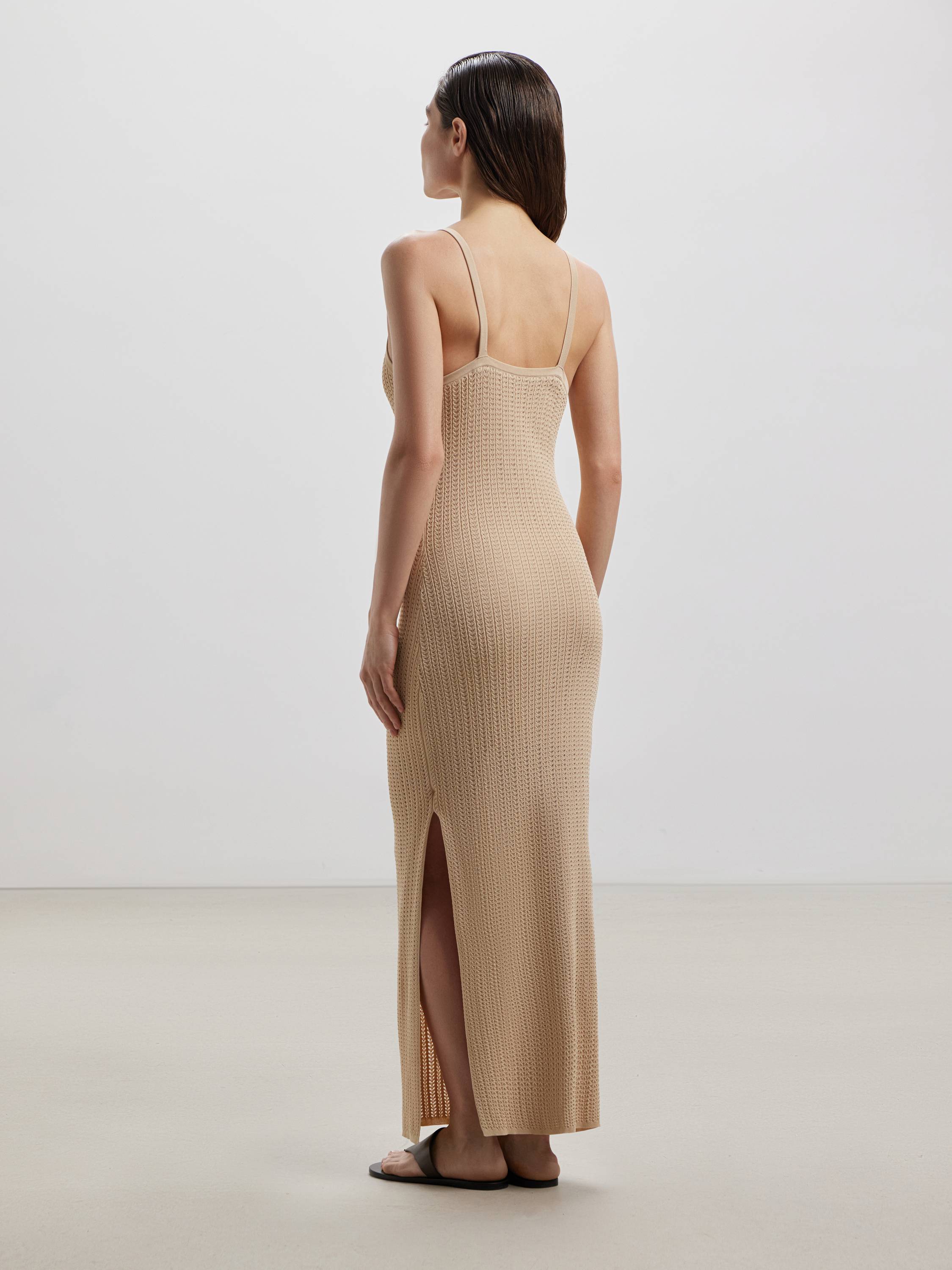 Платье миди на тонких бретелях выполнено из мягкого трикотажа с высоким содержанием вискозы — материала, который отличается шелковистостью и воздухопроницаемостью. Особое внимание привлекает текстура: по всей длине проходит рельефный узор, имитирующий ручную технику кроше. Такая вязка придает модели выразительность и делает даже самый лаконичный образ более фактурным. Силуэт платья мягко облегает фигуру, не сковывая движений, а разрез сзади обеспечивает комфорт при ходьбе. Тонкие бретели и округлый вырез подчеркивают линию плеч. Модель представлена в двух благородных оттенках — светлом бежевом и глубоком шоколадном. Оба цвета подчеркивают пластичность ткани и выигрышно смотрятся на загорелой коже. Это универсальный летний акцент: достаточно минимальных аксессуаров, чтобы собрать образ для отпуска, прогулки или вечернего выхода.