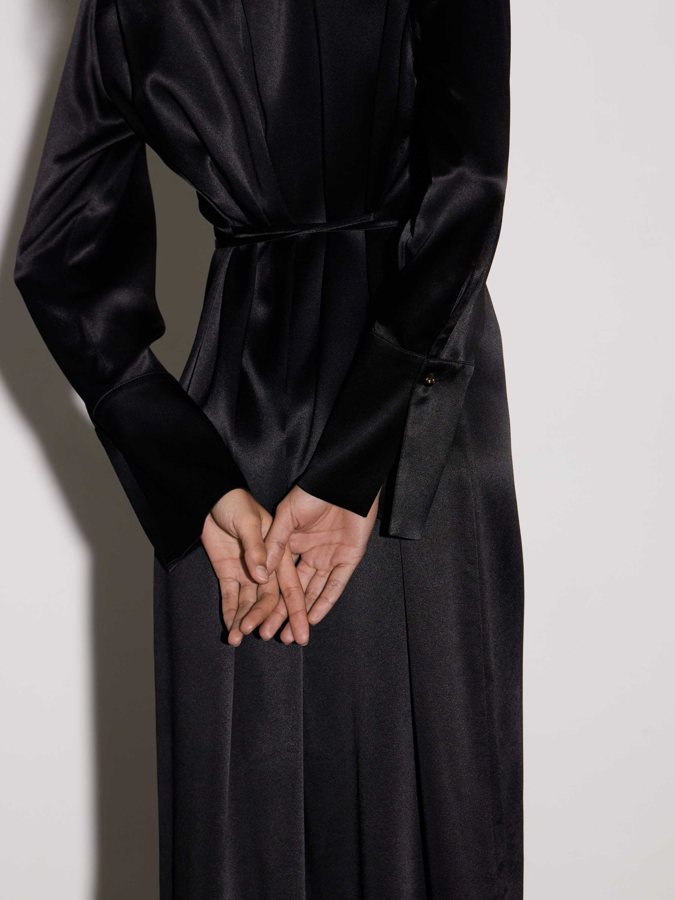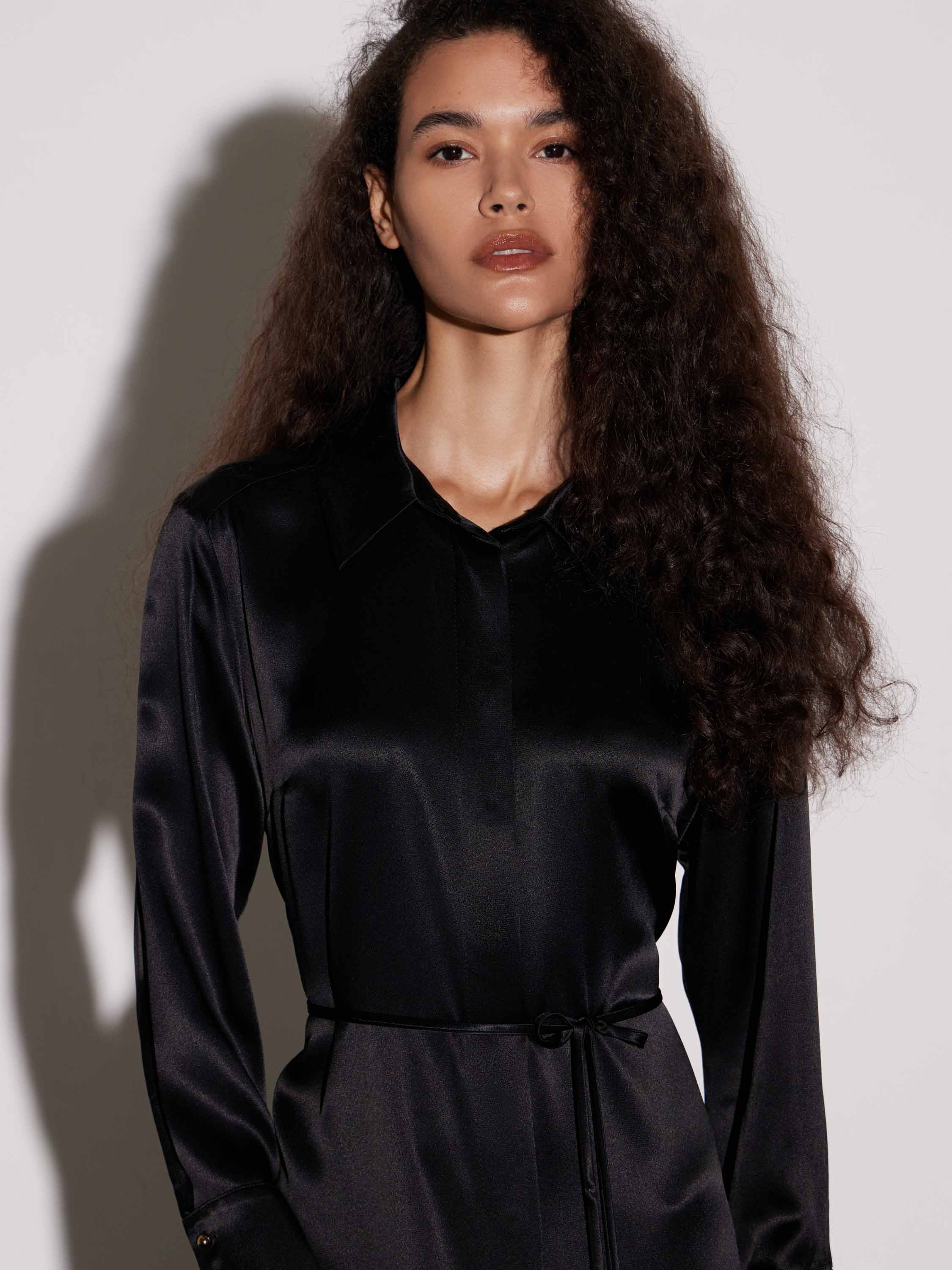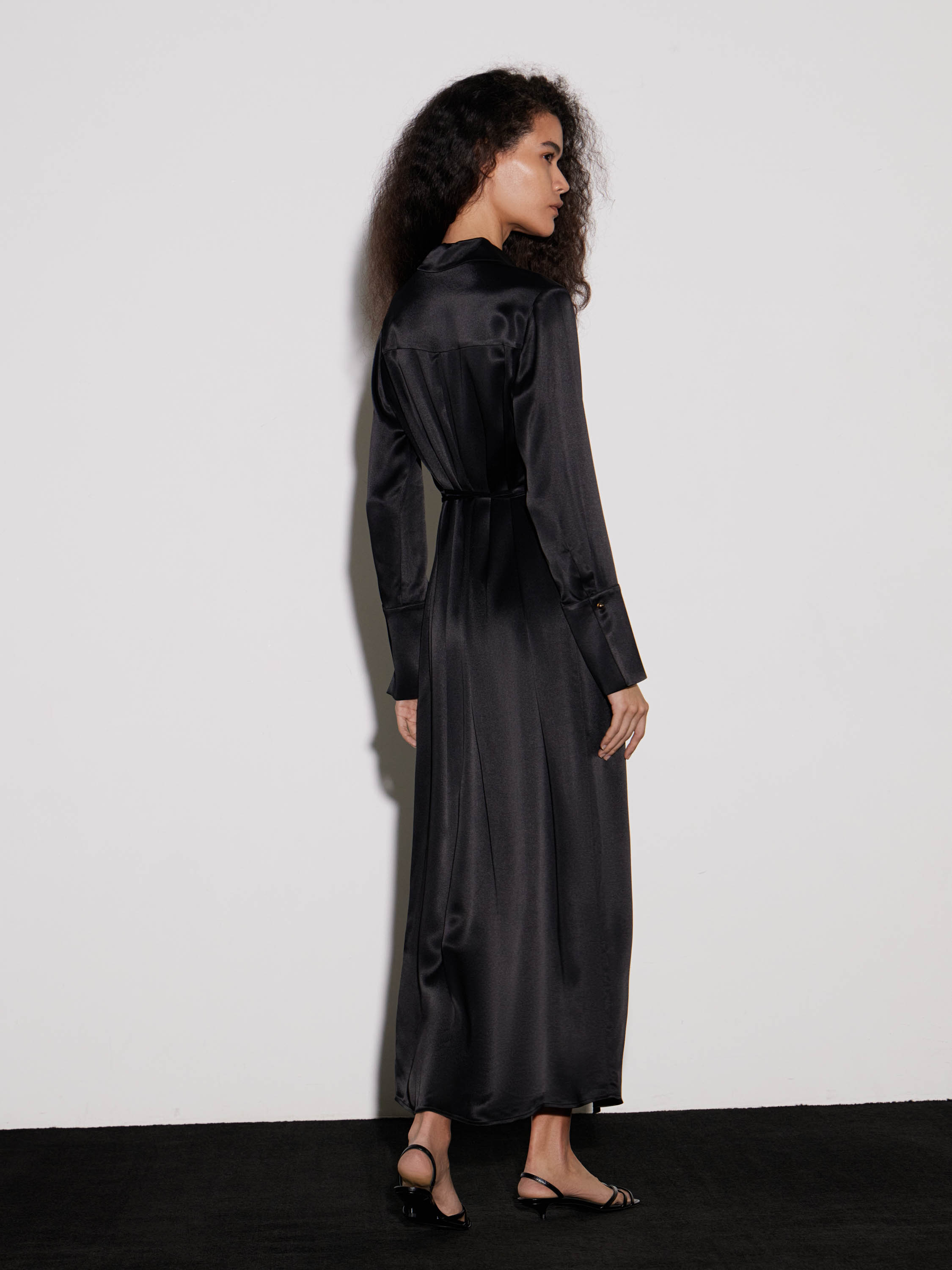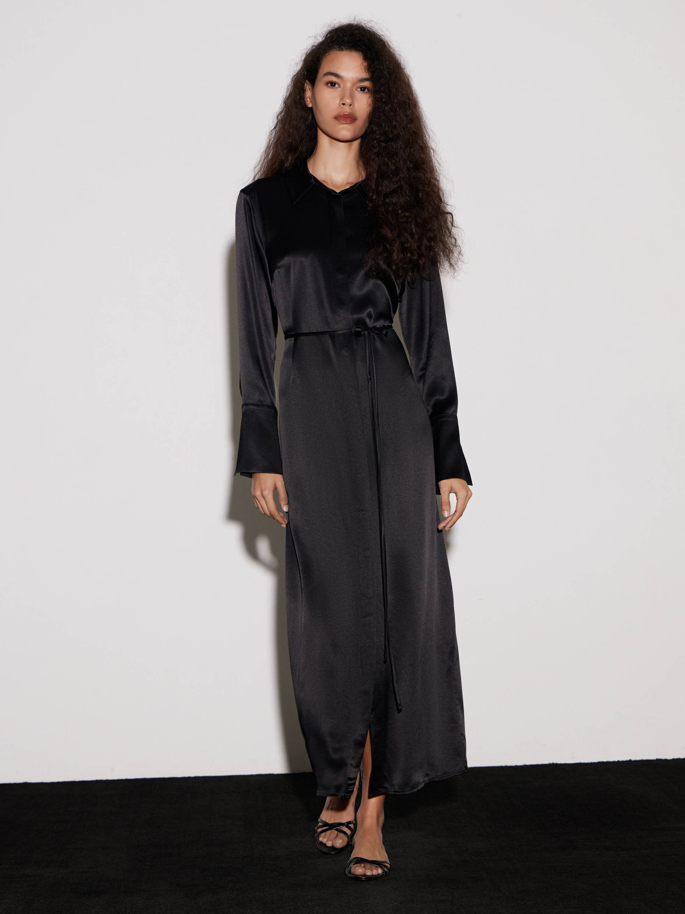 Платье прямого кроя из района в насыщенном красном оттенке. Гладкое полотно с мягким сатиновым блеском драпируется плавными линиями, подчеркивая вертикаль силуэта. Модель с классическим рубашечным верхом, скрытой планкой и длинными рукавами с широкими манжетами. Линия талии акцентирована тонким поясом, а разрез спереди добавляет динамики и свободы движений. Длина макси делает изделие уместным для вечерних выходов, а минималистичный крой позволяет интегрировать его в современный капсульный гардероб.