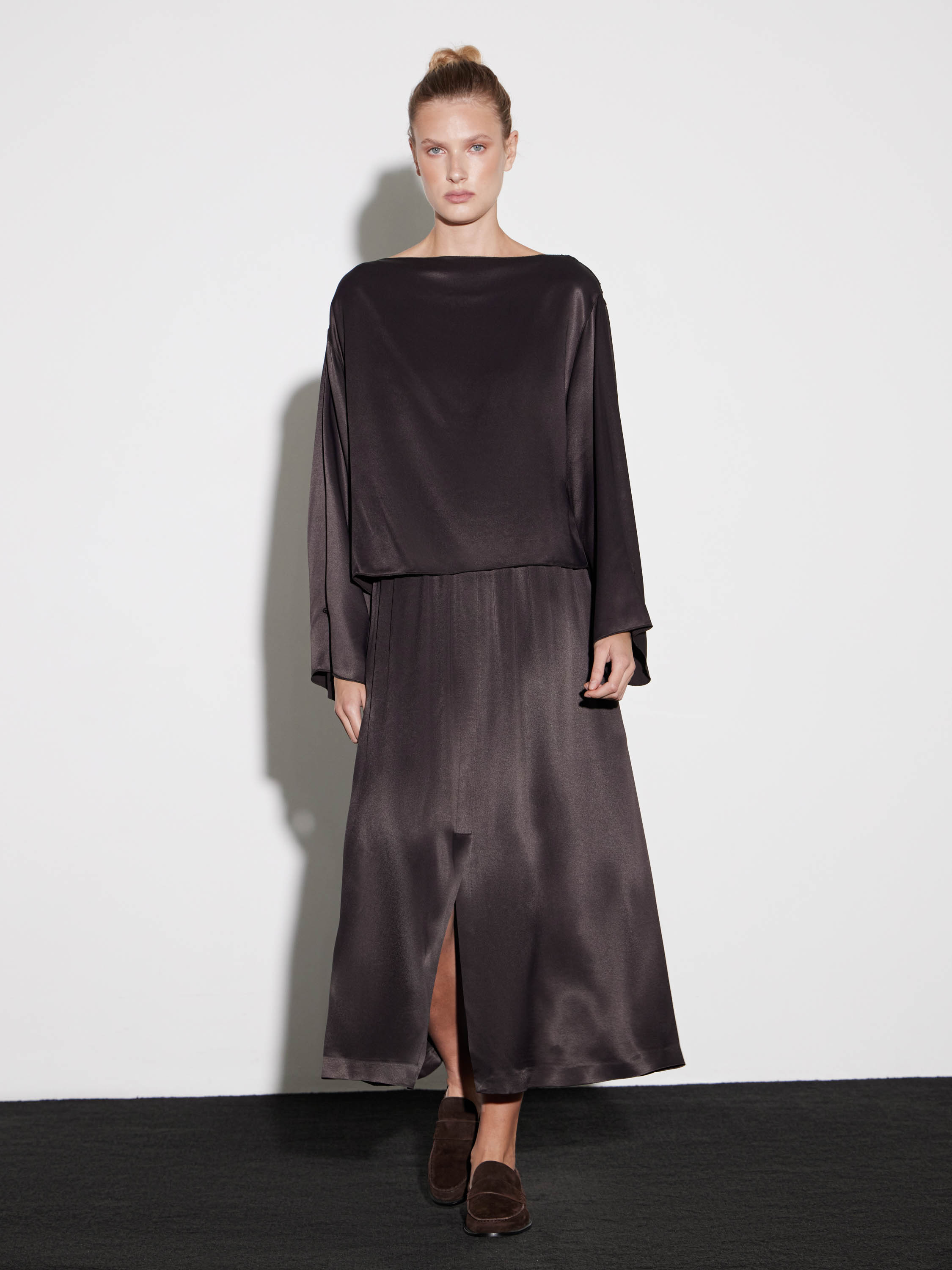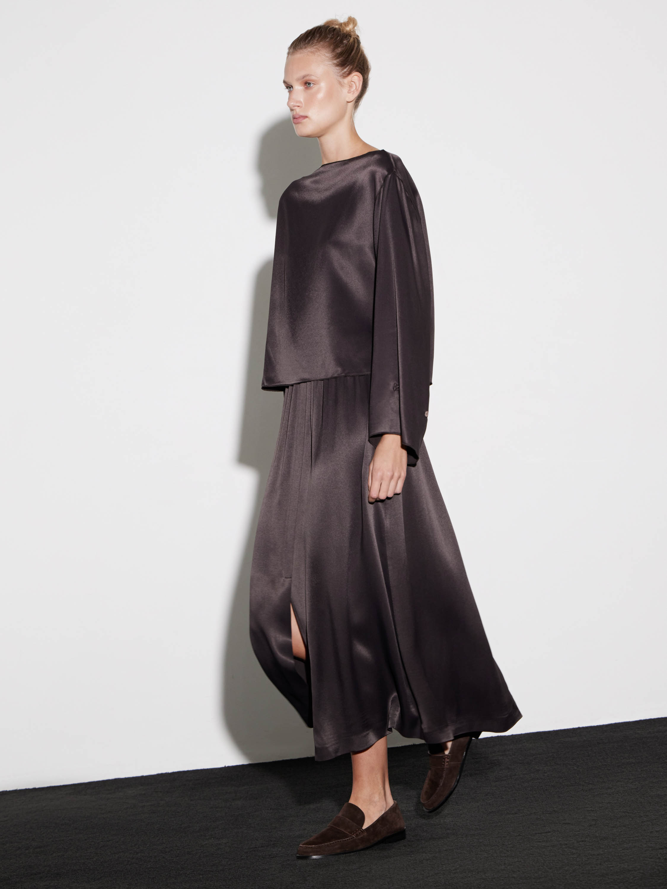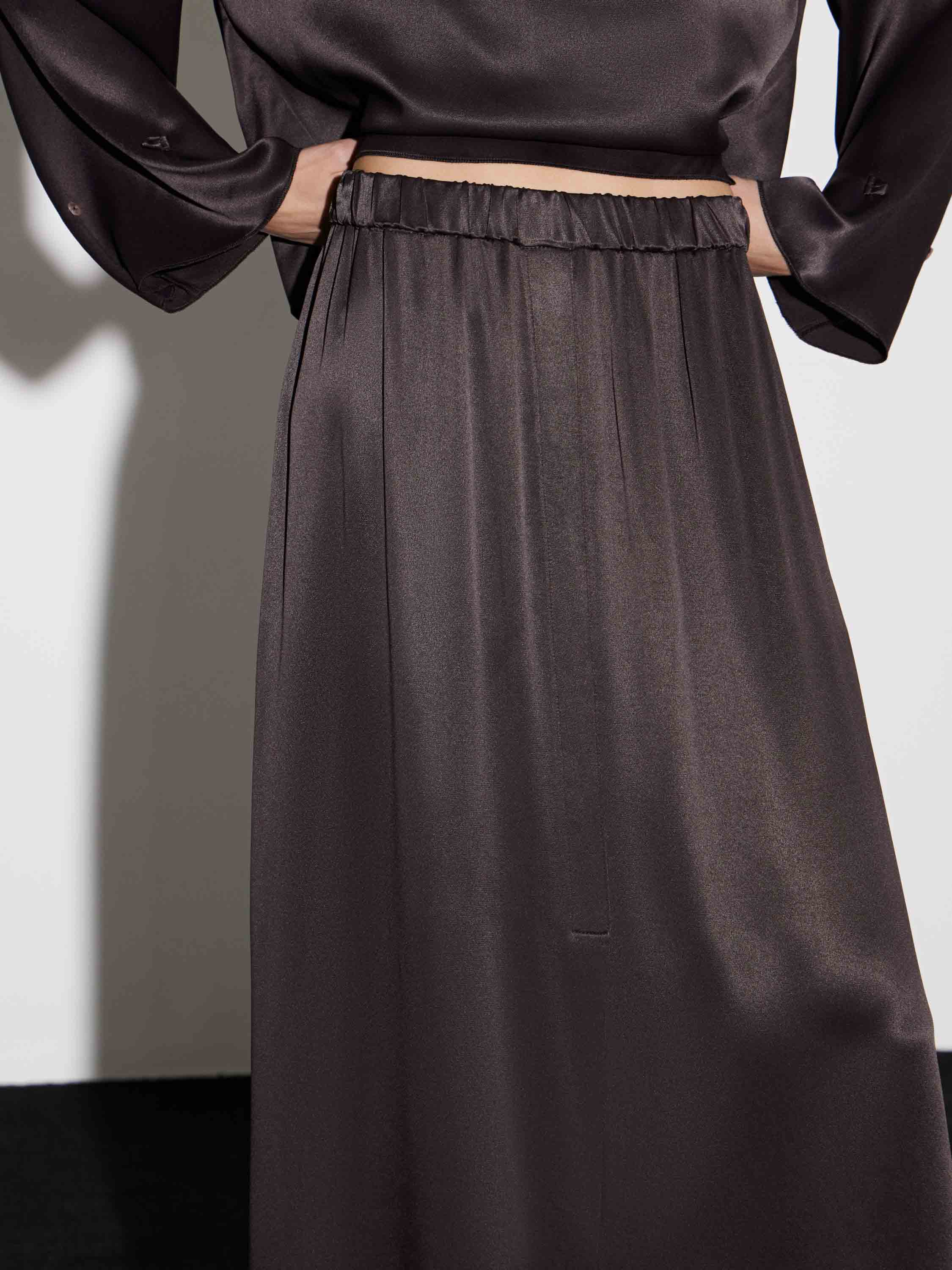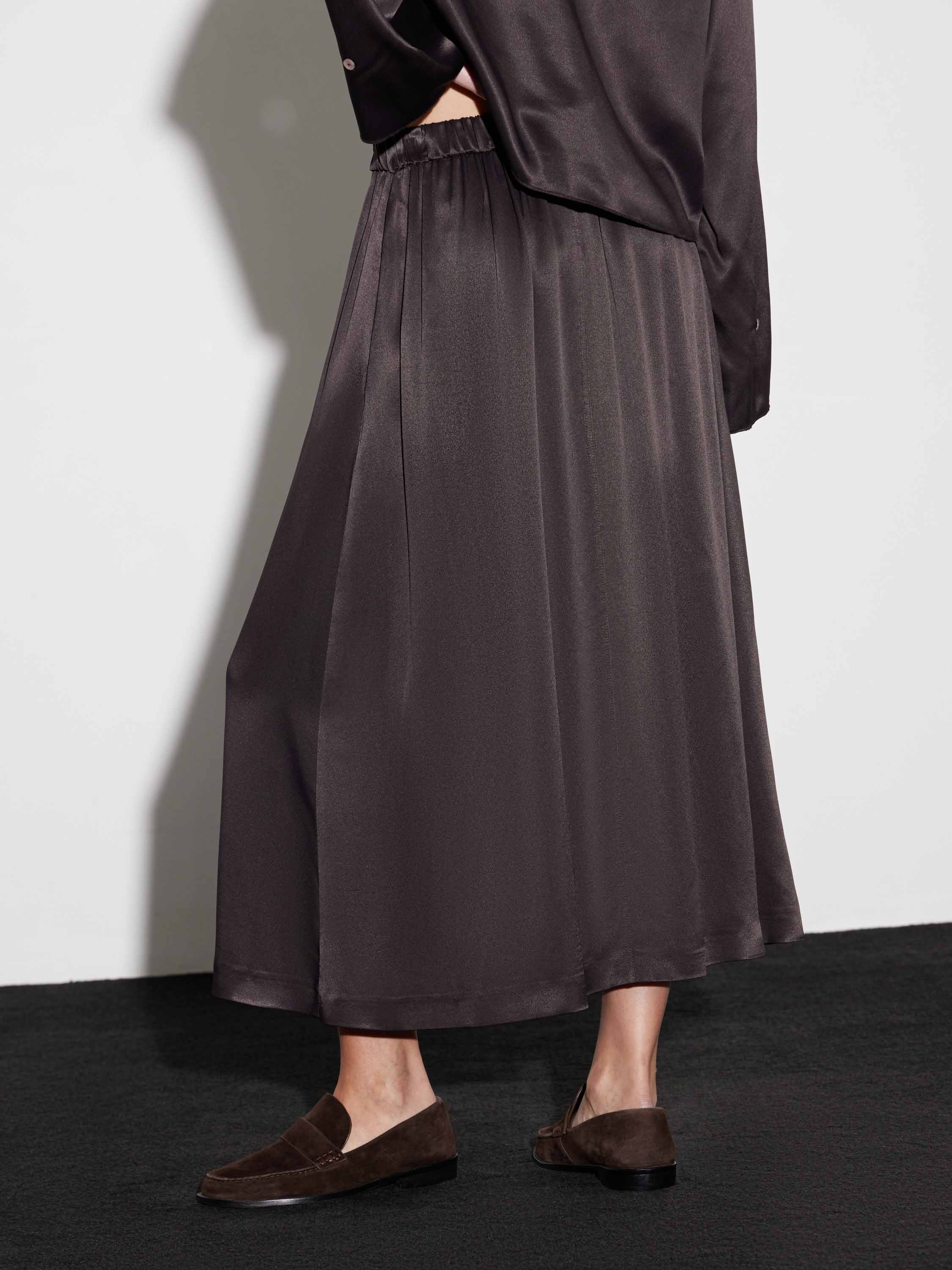 Юбка миди из гладкого, струящегося района с мягким сатиновым блеском. Свободный силуэт подчеркивает пластичность ткани, позволяя ей красиво драпироваться и двигаться в такт каждого шага. Пояс на резинке обеспечивает комфортную посадку и универсальность в повседневных образах. Спереди — аккуратный разрез, добавляющий легкость движений. Модель на подкладке, что сохраняет форму и делает посадку безупречной.