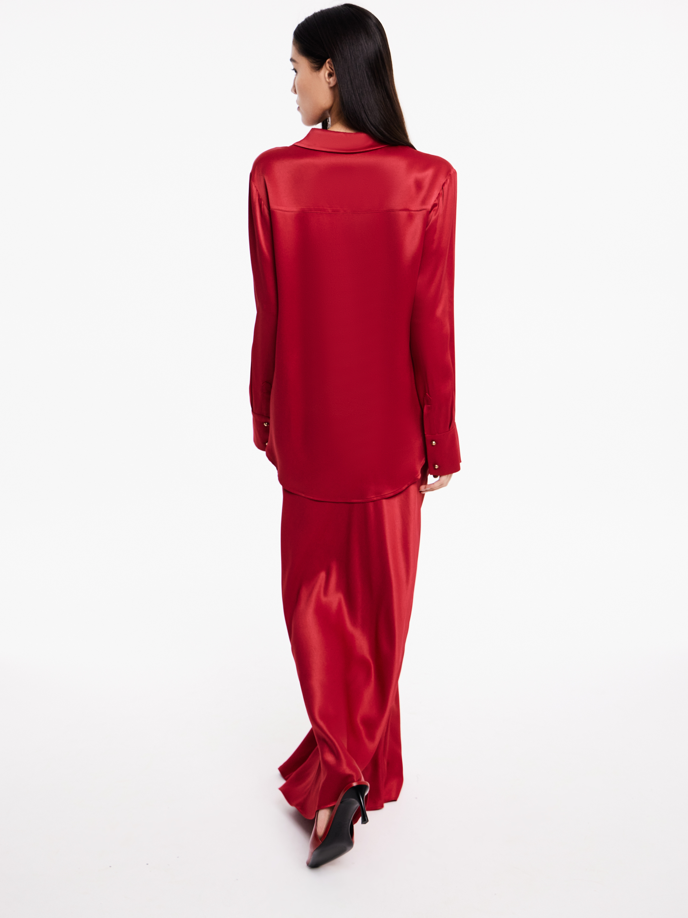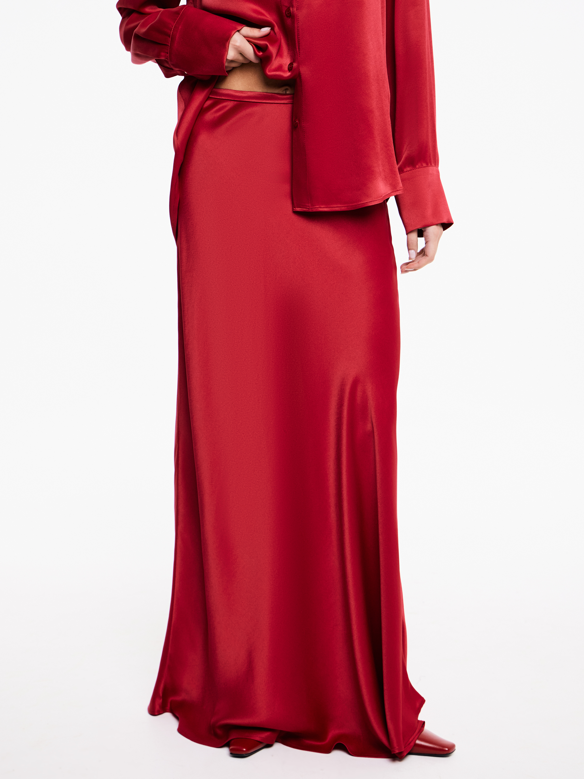 Юбка-макси из района с мягким сатиновым отливом в насыщенном красном оттенке. Легкая ткань красиво драпируется и струится при движении. Посадка средняя, аккуратный и минималистичный пояс не перегружает образ, застежка на молнию скрыта сбоку. Линия кроя плавно расширяется к подолу, создавая мягкий клеш и подчеркивая длину силуэта. Модель универсальна для вечерних и дневных образов, гармонично сочетается с топами, рубашками и объемными жакетами.