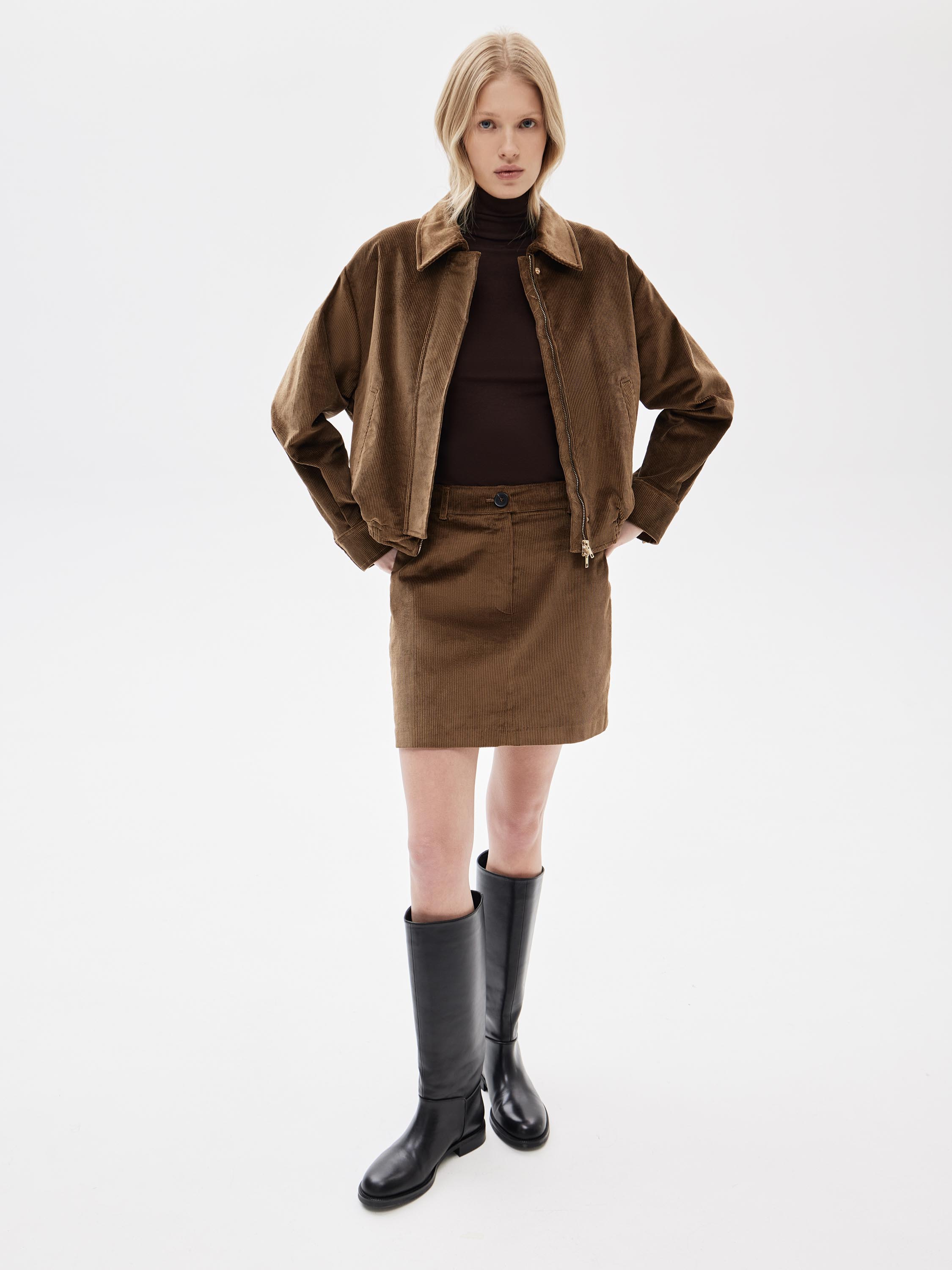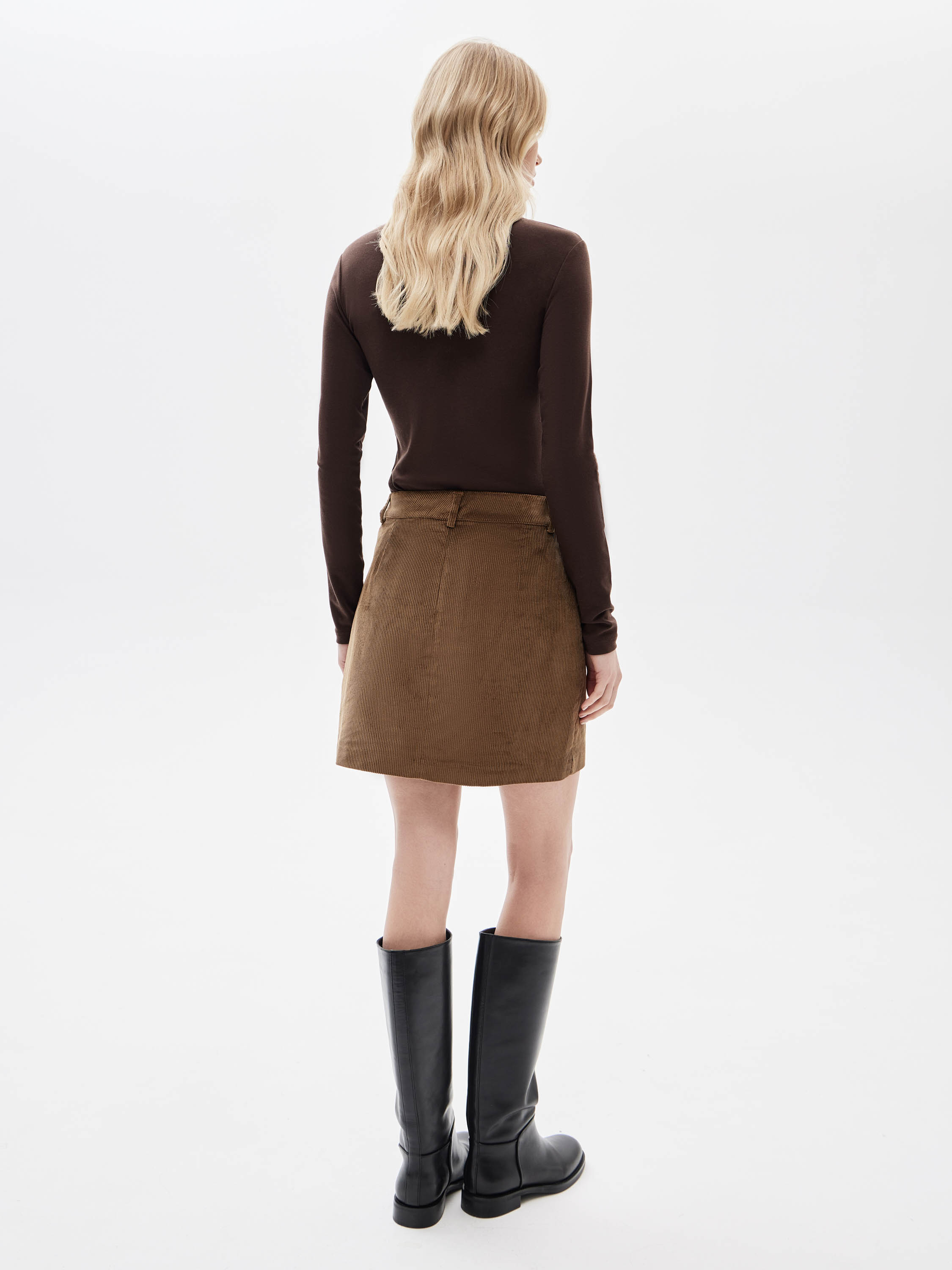 Юбка выполнена из вельветового полотна на основе вискозы и модала с мягкой, пластичной текстурой и четко выраженным вертикальным рубчиком. Материал комфортен в носке, хорошо садится по фигуре и сохраняет форму за счет эластана в составе. Посадка средняя, линия талии оформлена поясом со шлевками под ремень, застежка на пуговицу и гульфик формируют собранную центральную линию. Силуэт прямой, длина мини выстраивает аккуратные, компактные пропорции. Внутренняя подкладка повышает комфорт и стабильность посадки. Модель подходит для сочетаний с тонким трикотажем, рубашками, базовыми топами и жакетами, органично вписываясь в продуманный повседневный гардероб.