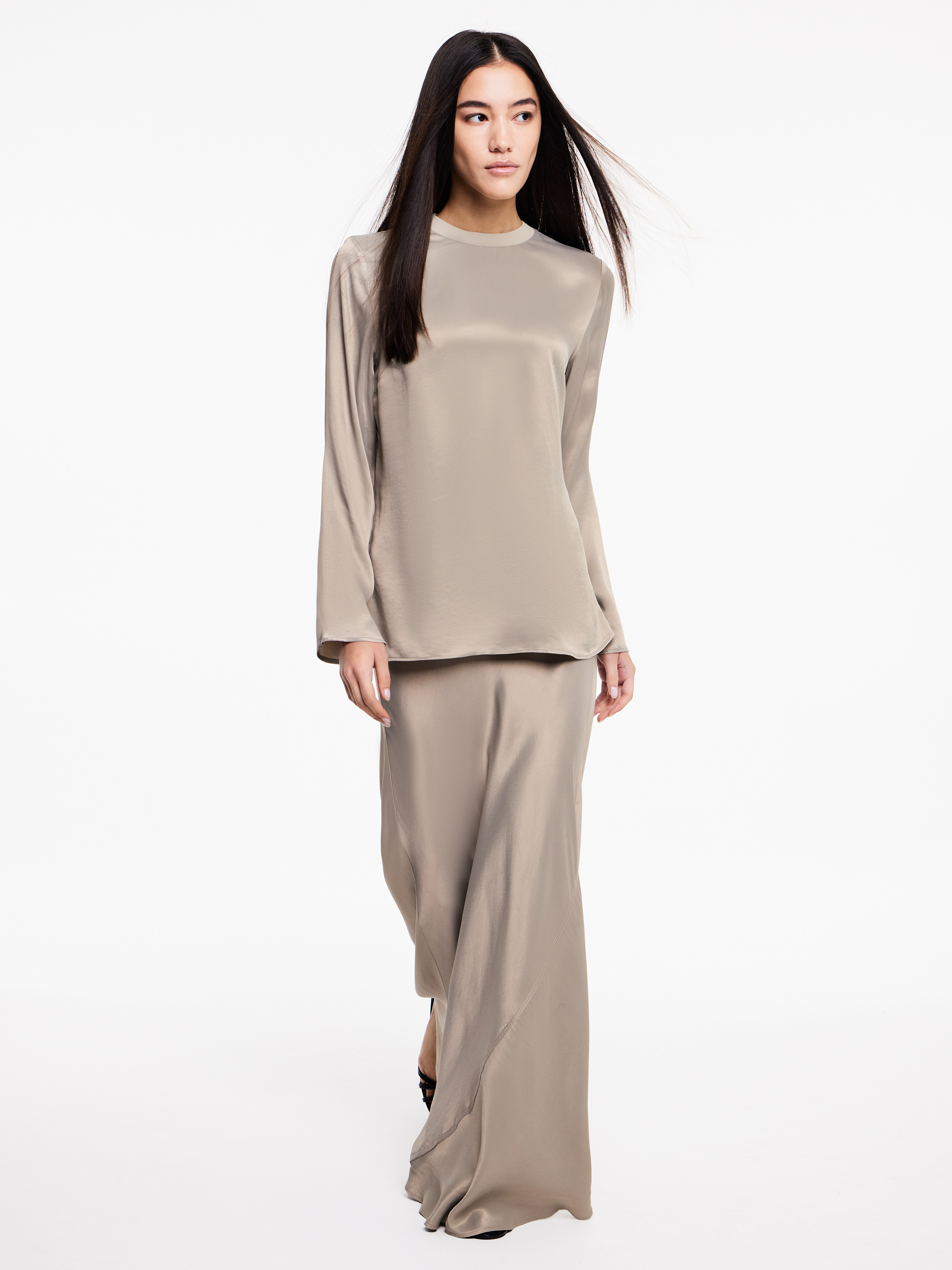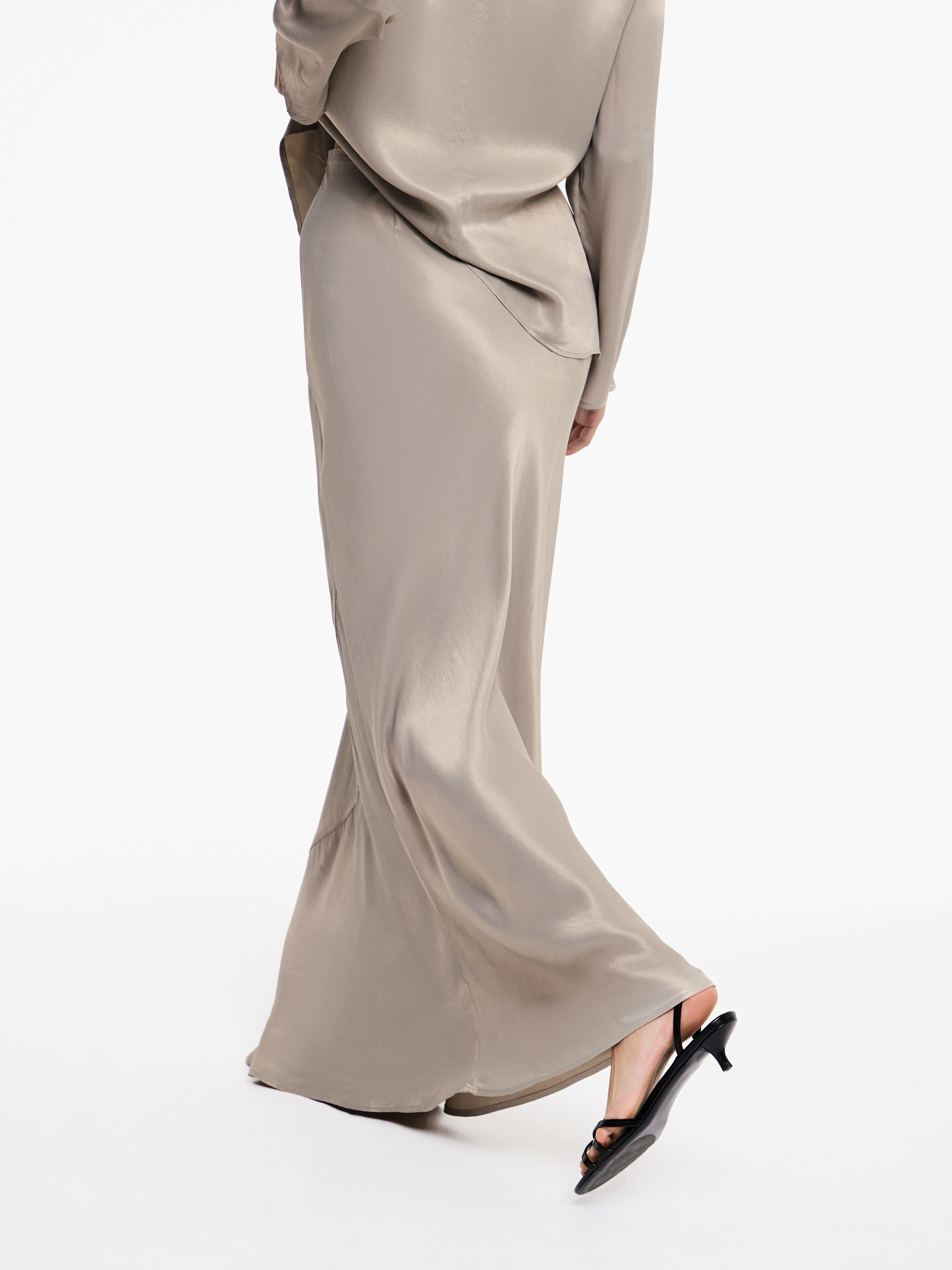 Юбка макси из района с характерным мягким блеском и гладкой шелковистой поверхностью. Материал тонко драпируется, подчеркивая естественные линии тела и создавая вытянутый женственный силуэт. Лаконичный крой визуально удлиняет фигуру, а расклешенный низ добавляет движению легкость и динамику. При ходьбе полотно мягко переливается и красиво играет на свету, придавая образу утонченность и ощущение плавности.