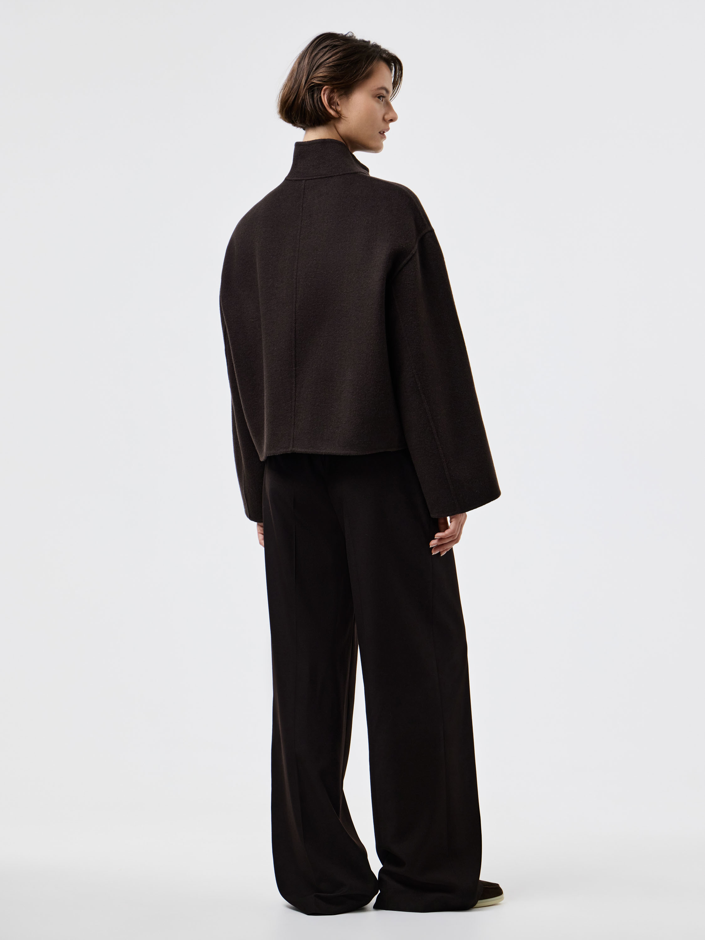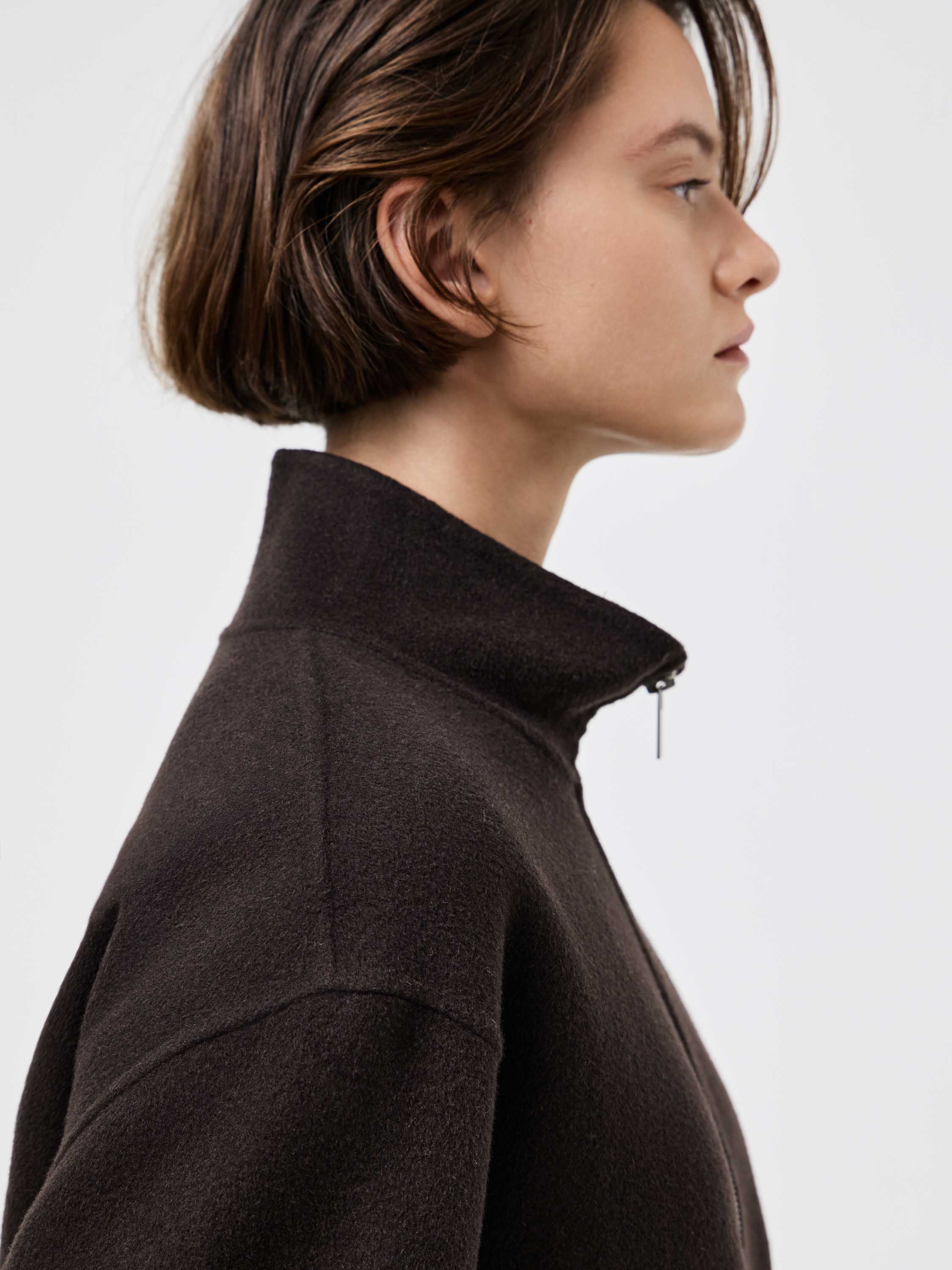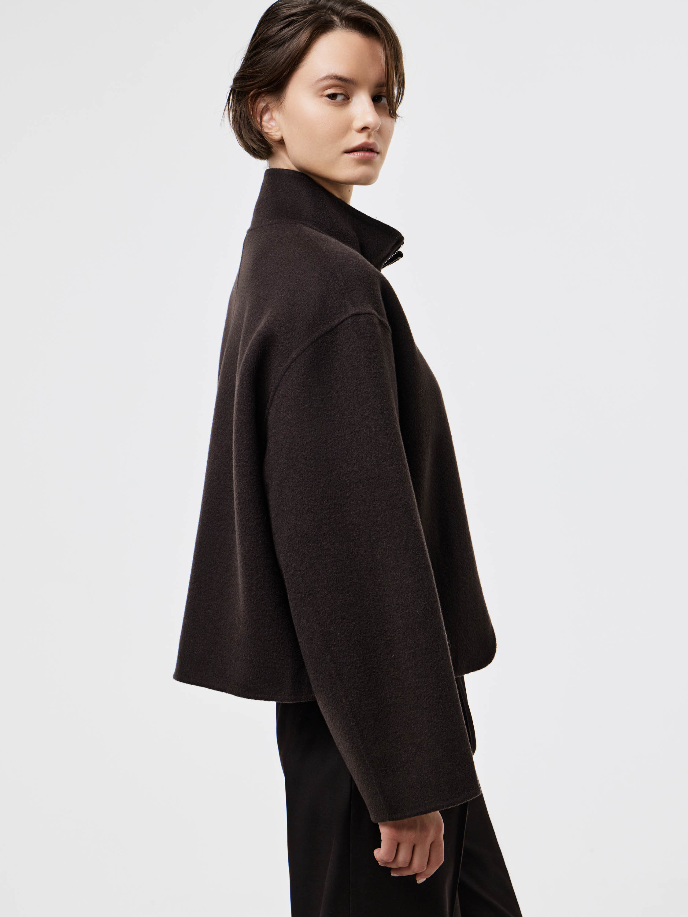 Полупальто из плотного шерстяного полотна с добавлением тенсела — материал отличается устойчивостью к деформации, мягкой пластичностью и приятной фактурой. Крой прямой, со спущенной линией плеча и аккуратным воротником-стойкой, который формирует чистый силуэт. Молния на потайной застежке подчеркивает лаконичность дизайна. Легкий оверсайз позволяет сочетать модель с трикотажем, брюками или юбкой, создавая современный и собранный образ на каждый день.