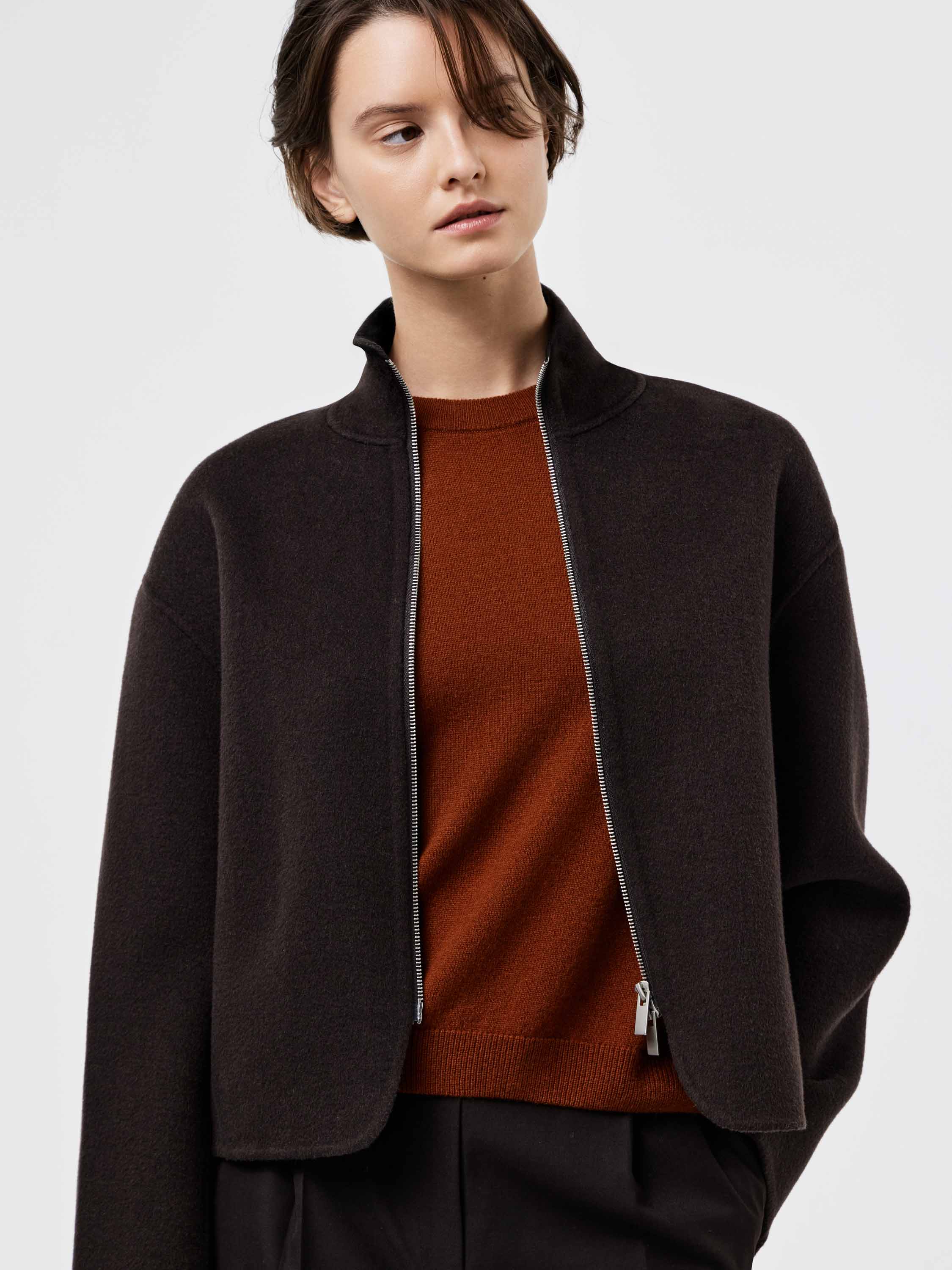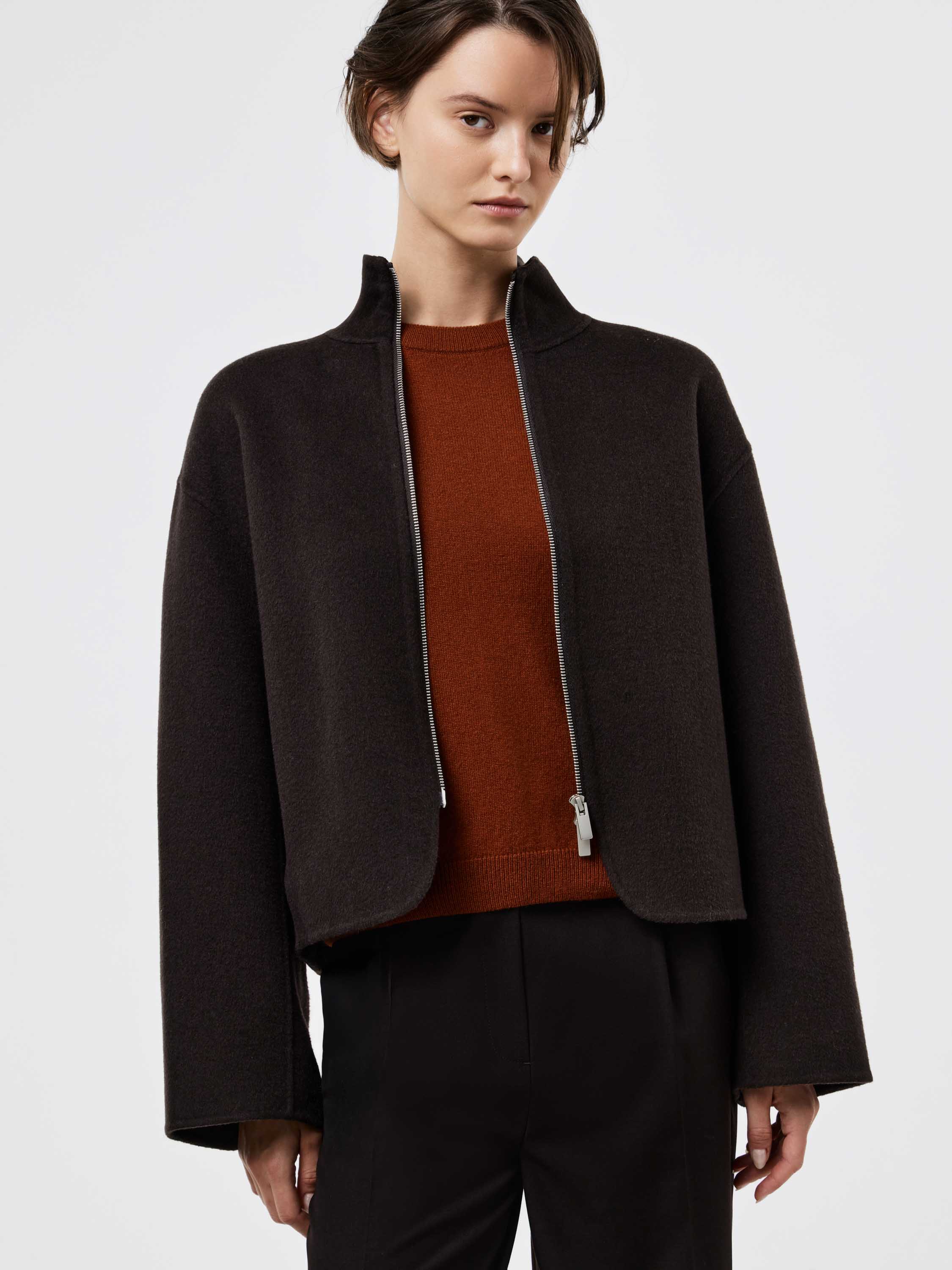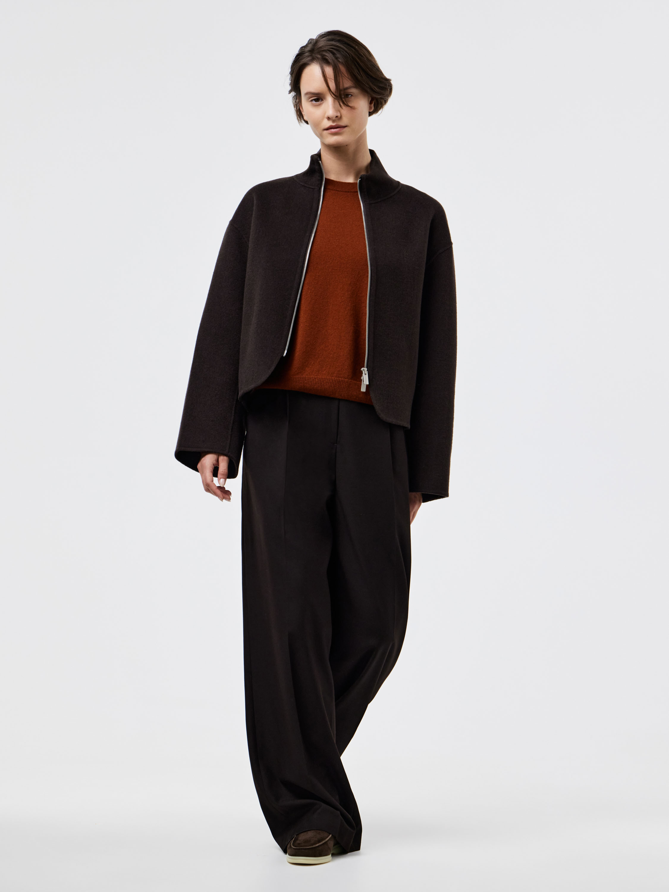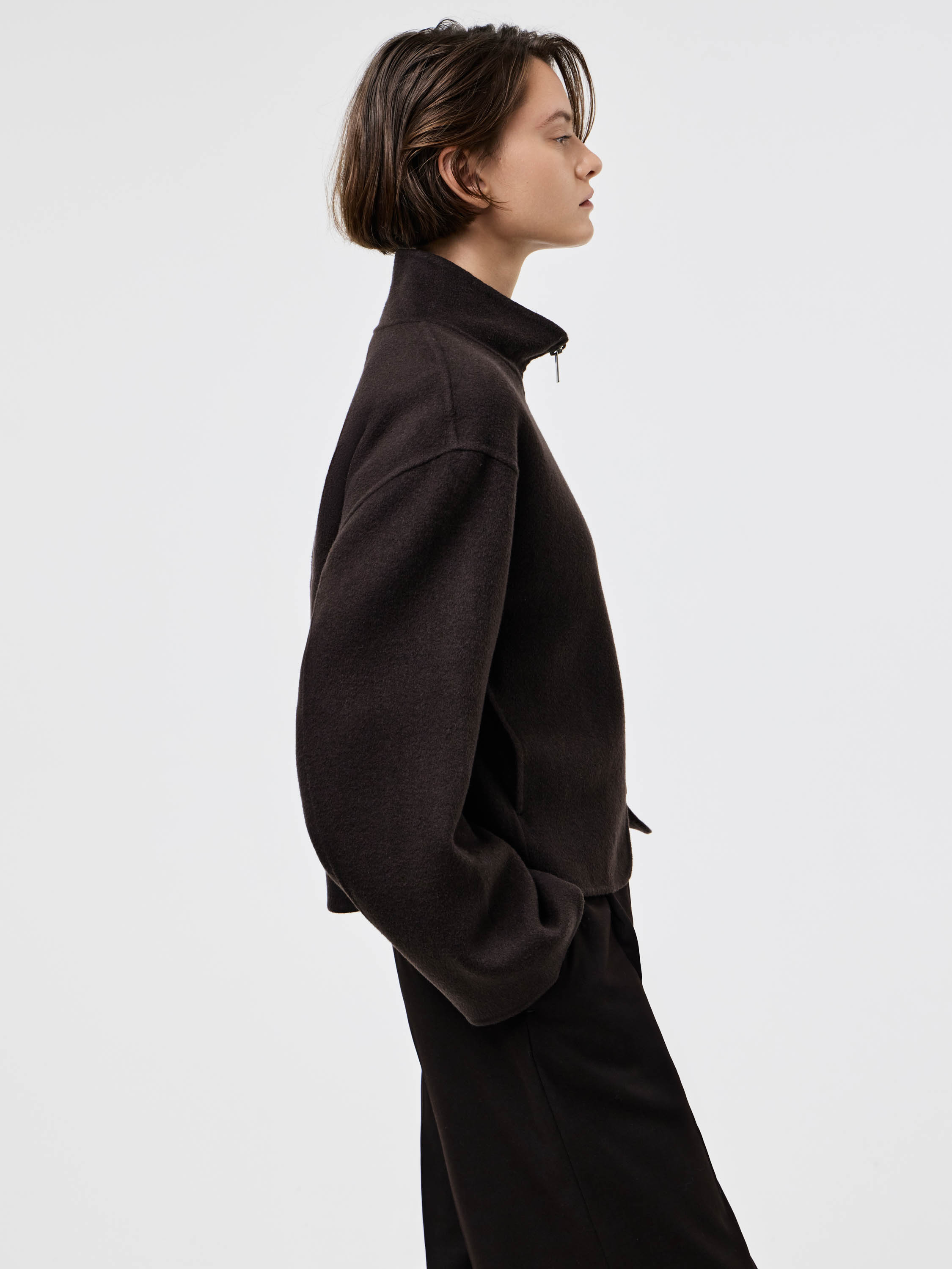 Полупальто из плотного шерстяного полотна с добавлением тенсела — материал отличается устойчивостью к деформации, мягкой пластичностью и приятной фактурой. Крой прямой, со спущенной линией плеча и аккуратным воротником-стойкой, который формирует чистый силуэт. Молния на потайной застежке подчеркивает лаконичность дизайна. Легкий оверсайз позволяет сочетать модель с трикотажем, брюками или юбкой, создавая современный и собранный образ на каждый день.