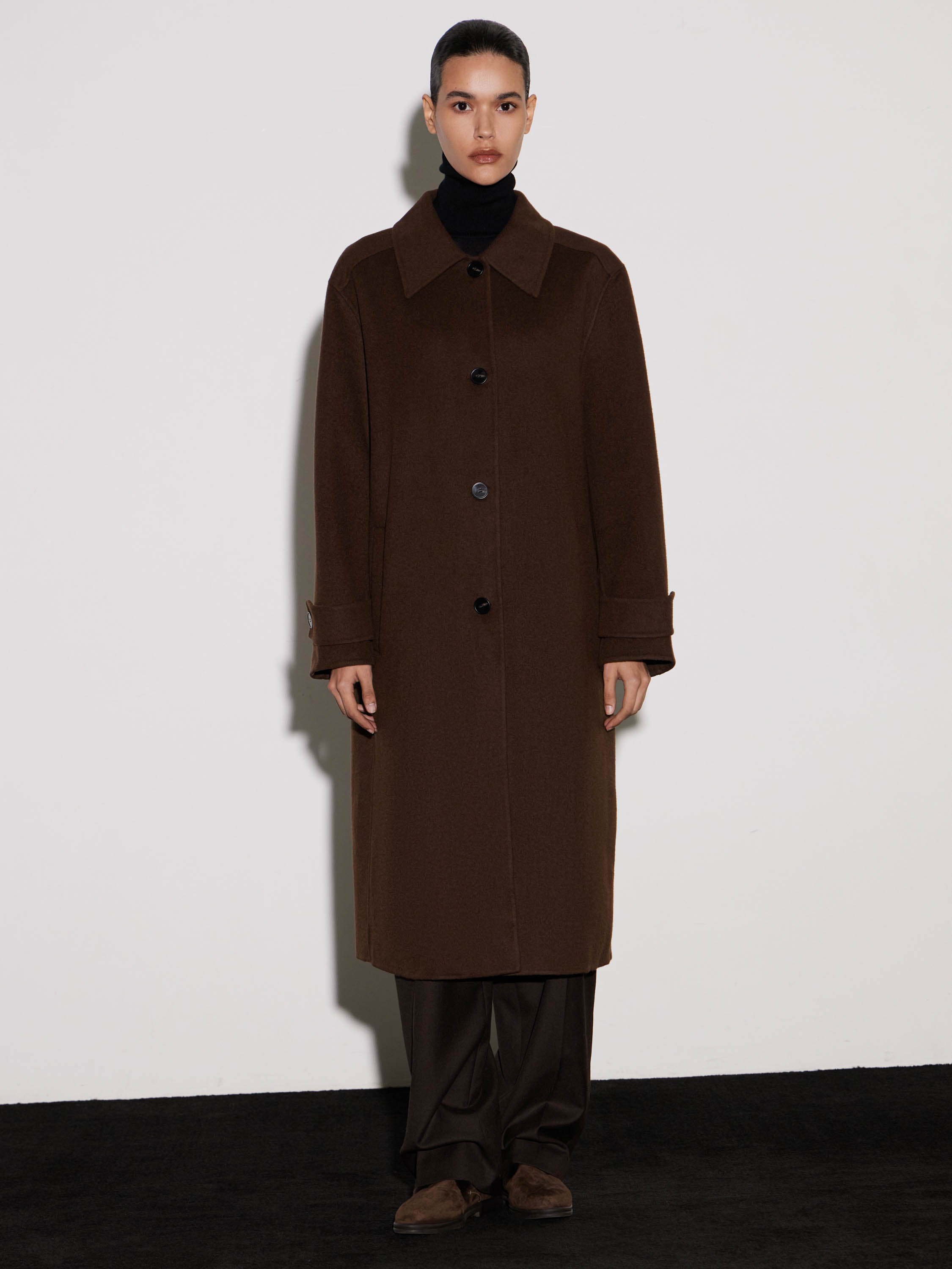 Пальто из шерсти с добавлением тенсела выполнено в удлиненном прямом силуэте. Плотное полотно держит форму и остается пластичным, сохраняя комфорт при повседневном ношении. Классический воротник и застежка на пуговицы формируют чистый и лаконичный образ, а ремешки на рукавах добавляют аккуратный акцент. Модель универсальна: ее можно носить в деловых и повседневных комплектах, сочетая с брюками, юбками и трикотажем.