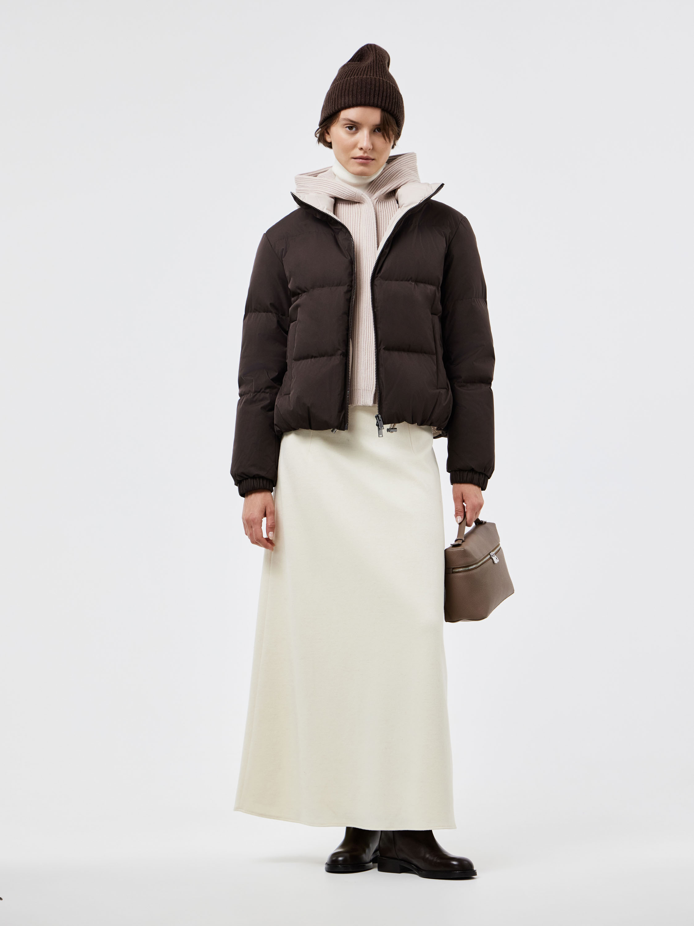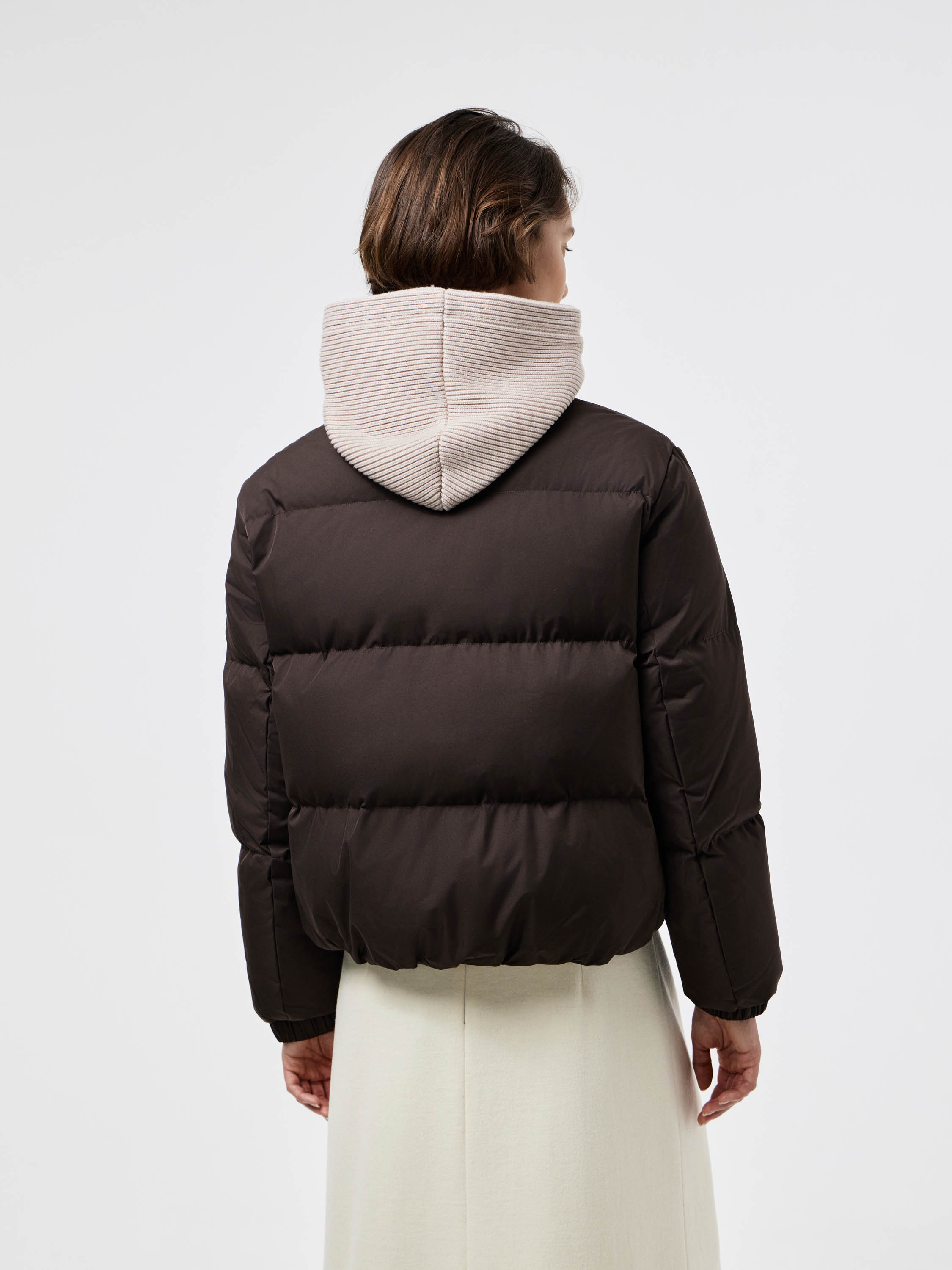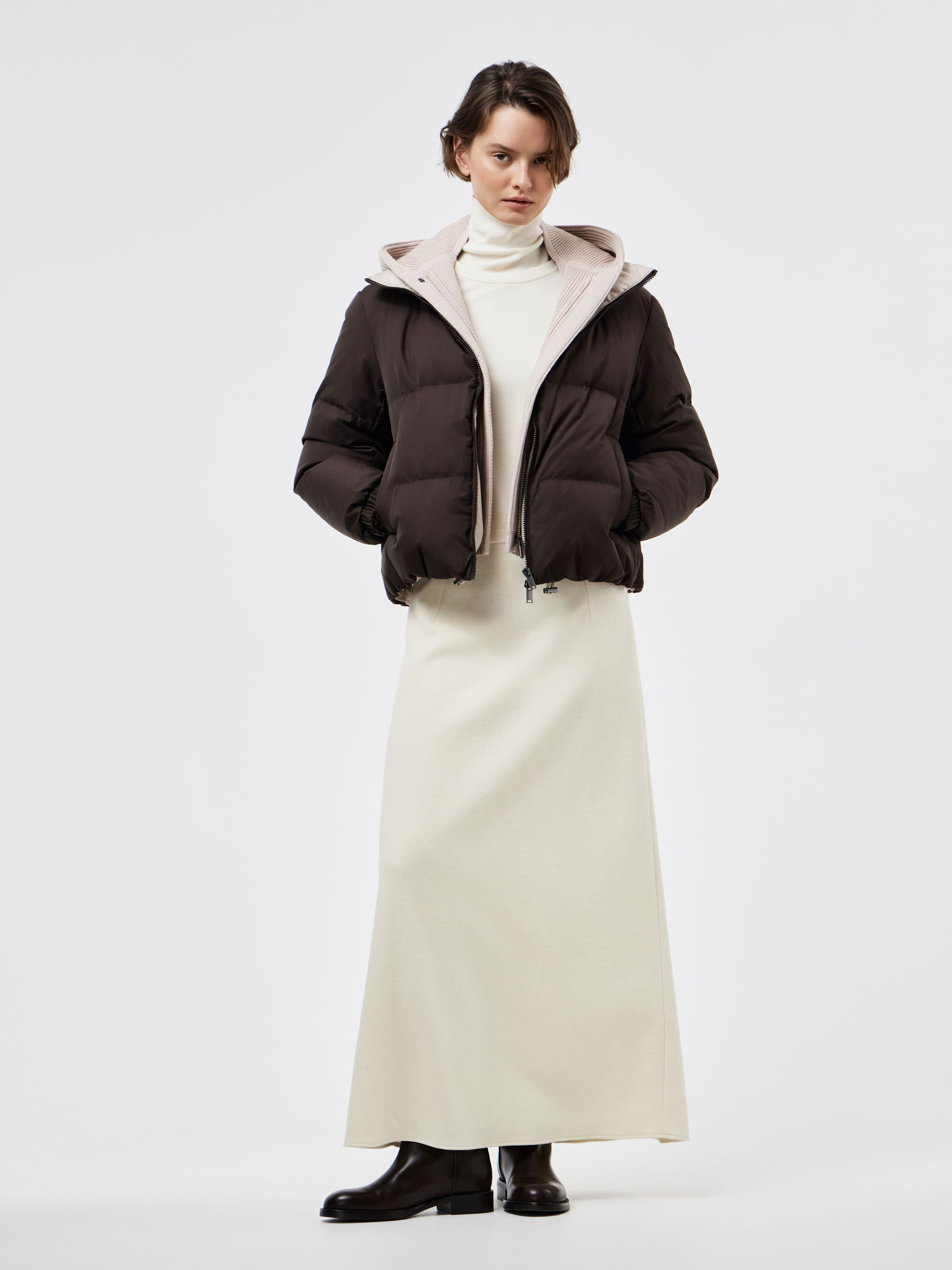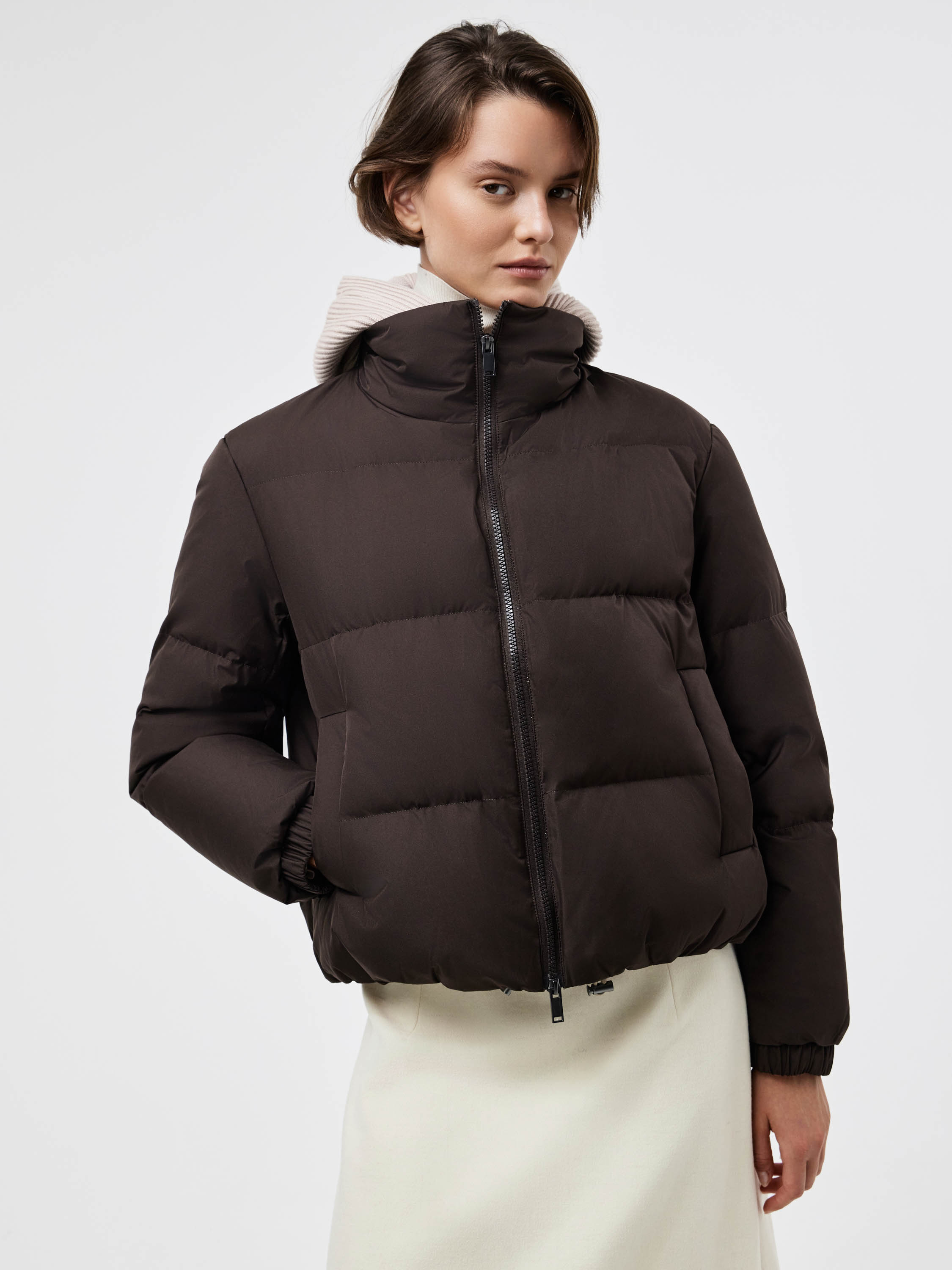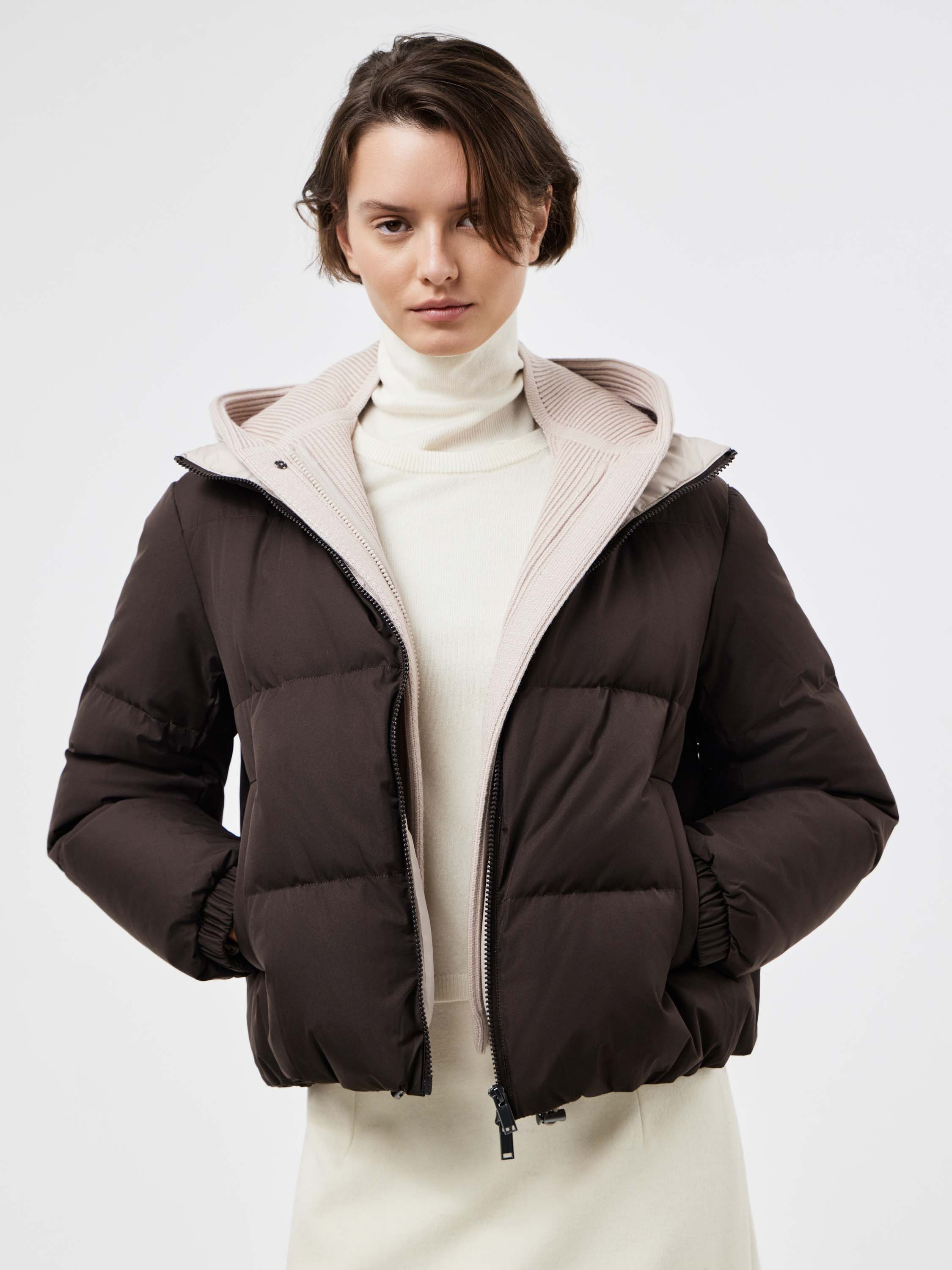 Укороченный пуховик прямого силуэта, выполненный из гладкого текстиля с горизонтальной стежкой. В качестве наполнителя используется натуральный утиный пух с добавлением пера, что делает модель легкой и теплой. Подкладка с содержанием шерсти обеспечивает дополнительный комфорт и сохраняет тепло даже в холодное время года. Детали кроя продуманы для практичности: объемный капюшон с внутренней трикотажной вставкой защищает от ветра, двусторонняя молния удобна в носке, а эластичные манжеты фиксируют рукав. Лаконичный дизайн и универсальная длина позволяют носить пуховик как с брюками и джинсами, так и с платьями или юбками, создавая современные и функциональные образы.