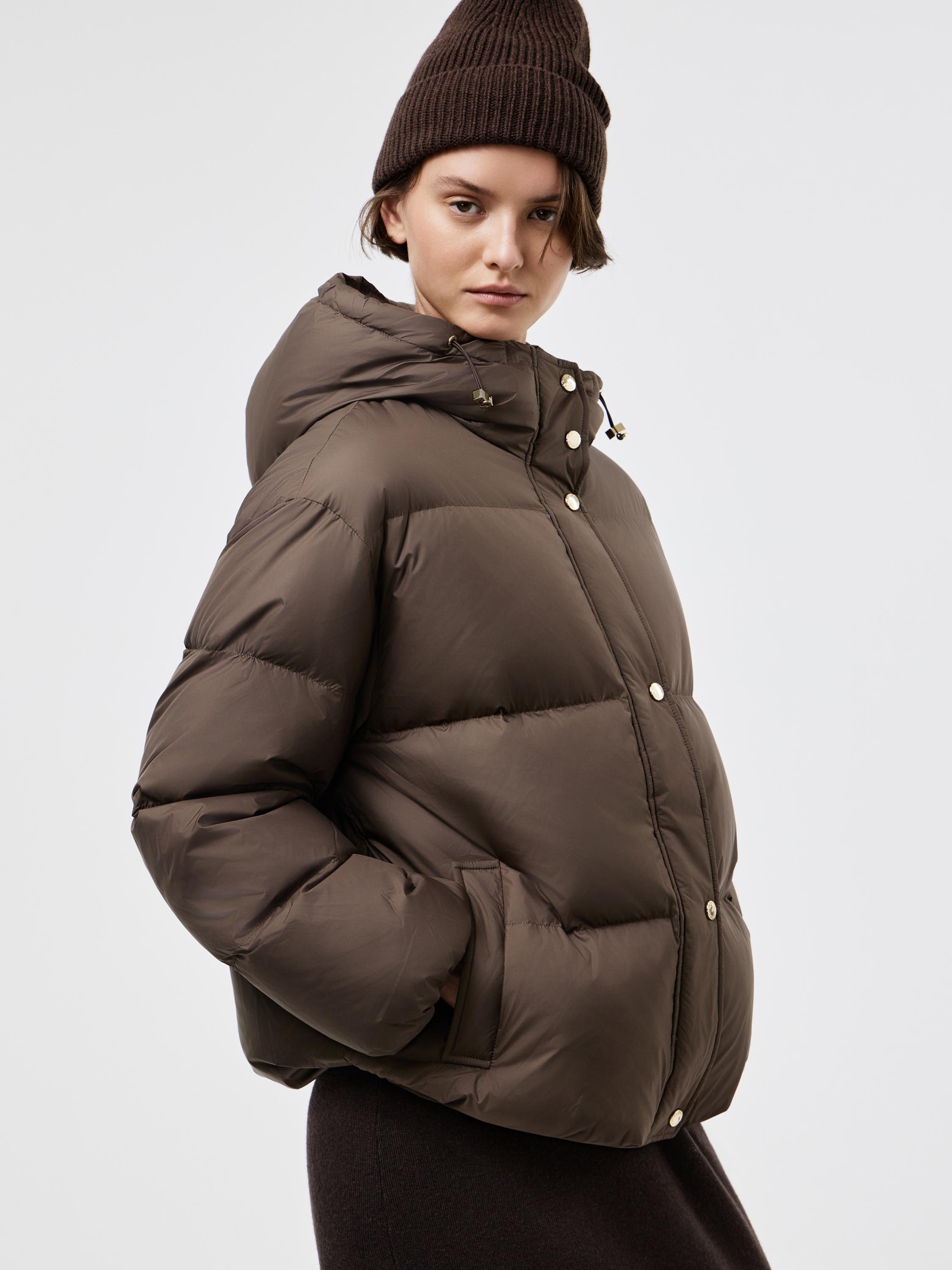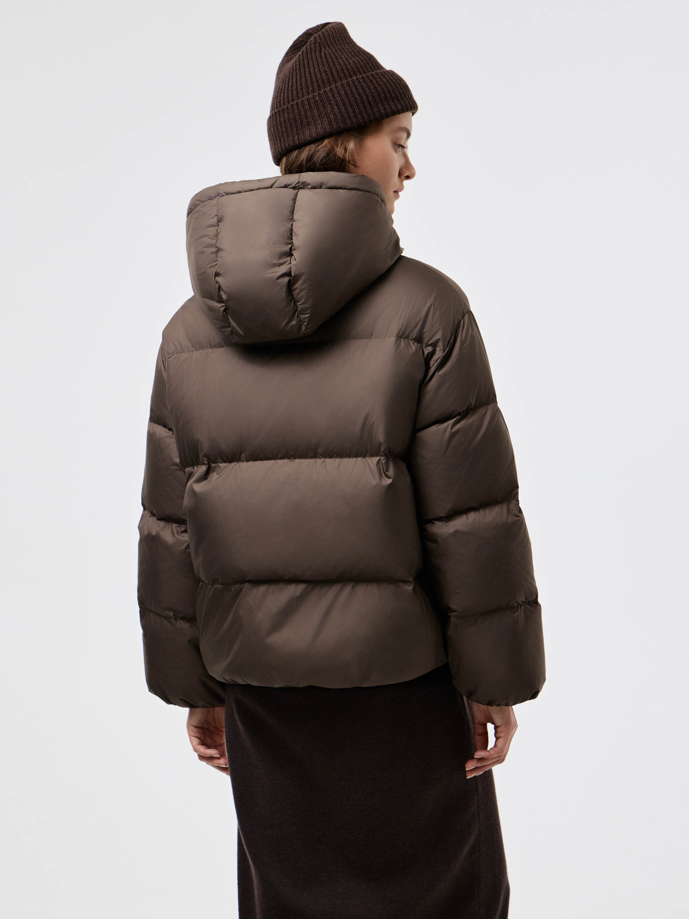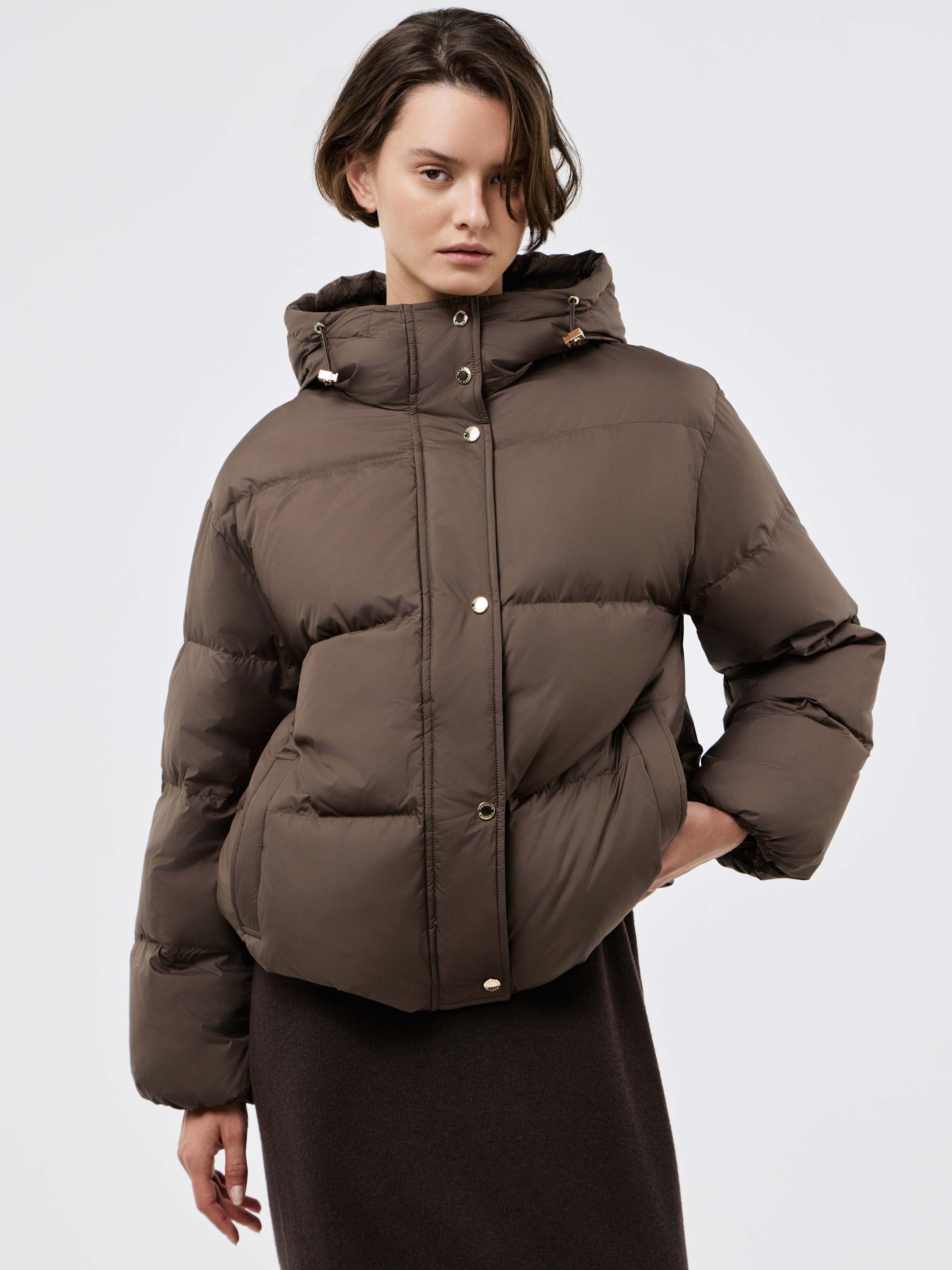 Куртка-пуховик укороченного силуэта с наполнителем из пуха и пера утки сочетает легкость и надежную теплоизоляцию. Объемная простежка формирует современный объем, а прямой крой обеспечивает свободу движений. Капюшон с регулируемым шнурком и застежка на молнию с планкой фиксируют тепло и защищают от ветра. Крупные прорезные карманы подчеркивают практичность модели, а аккуратные металлические детали добавляют выразительности. Универсальный силуэт делает куртку удобной для городских образов: она гармонично смотрится и с джинсами, и с брюками, и с юбками.