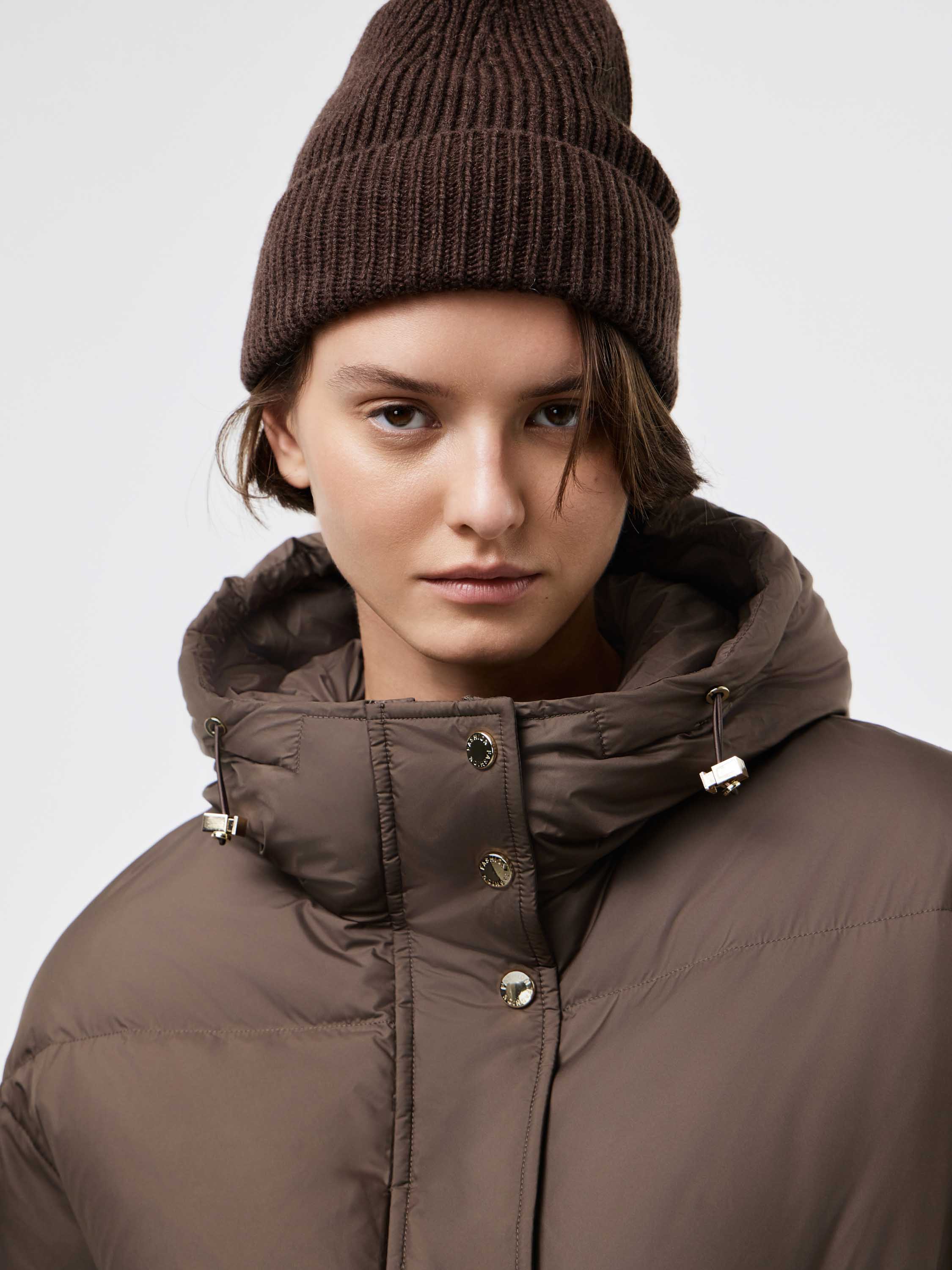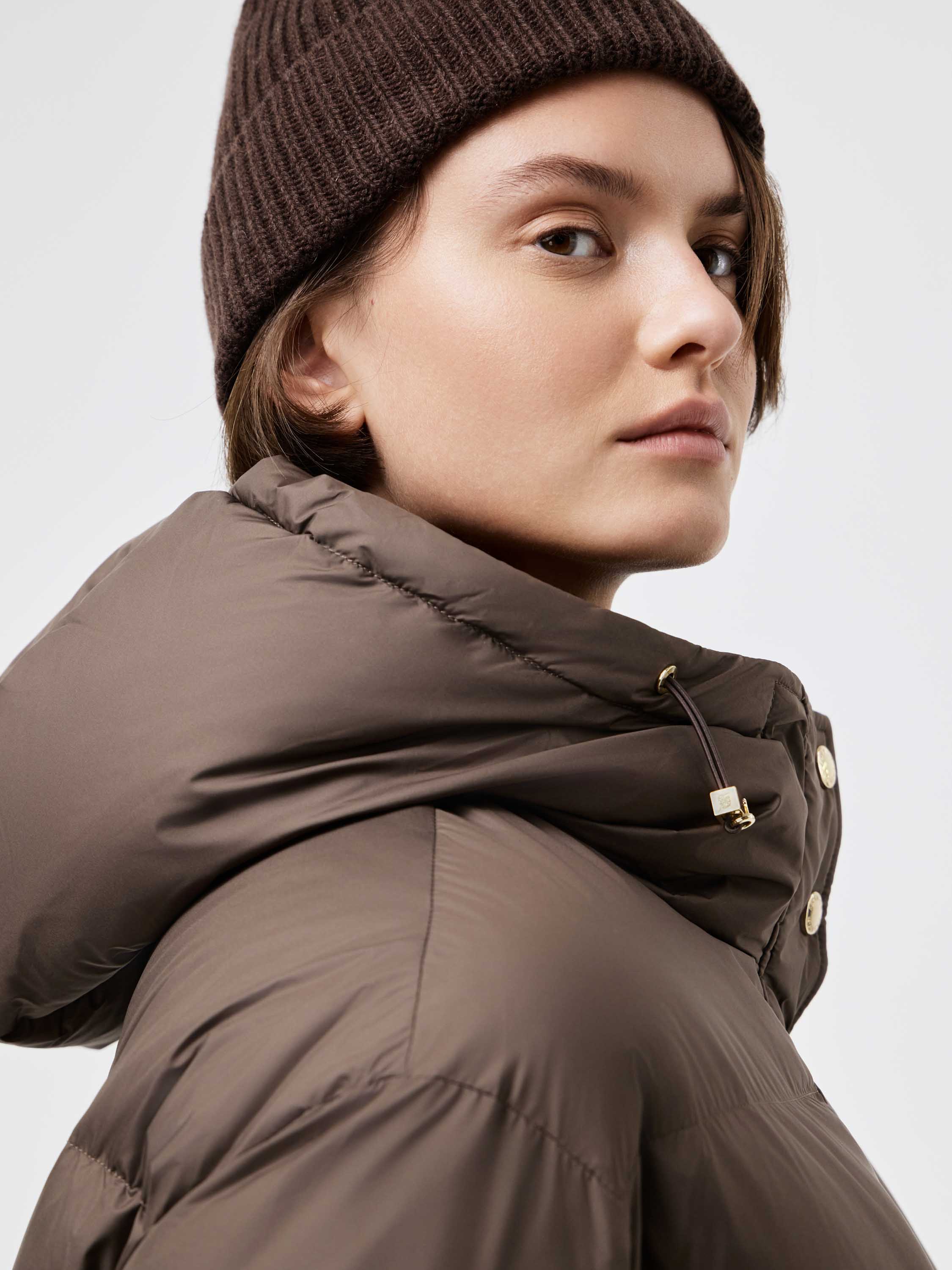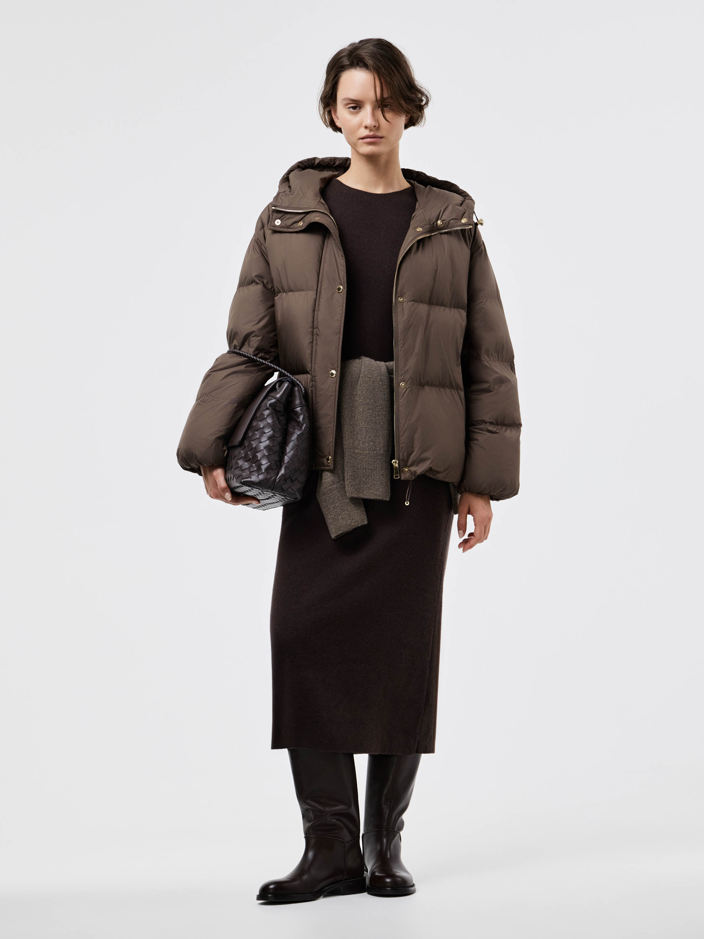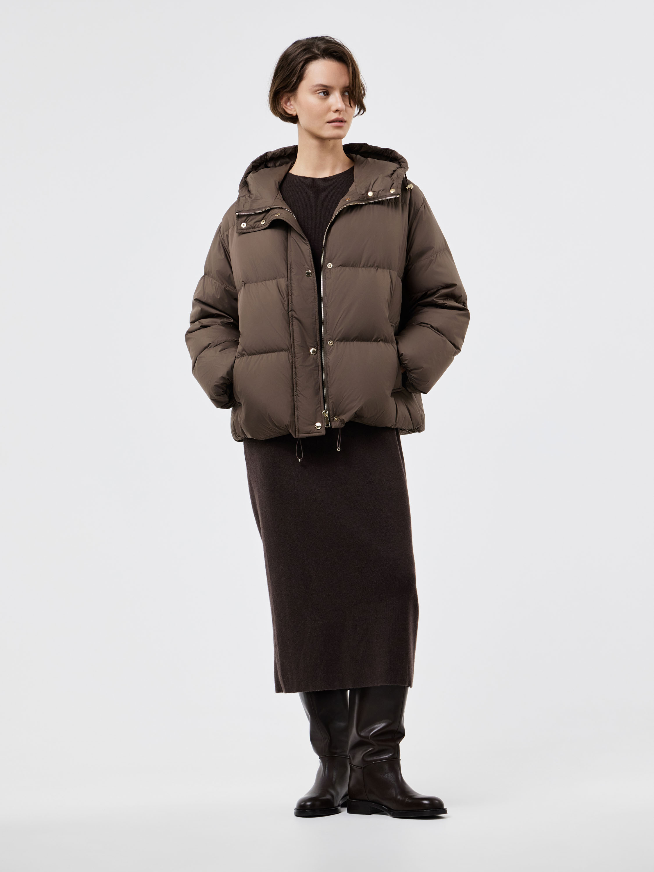 Куртка-пуховик укороченного силуэта с наполнителем из пуха и пера утки сочетает легкость и надежную теплоизоляцию. Объемная простежка формирует современный объем, а прямой крой обеспечивает свободу движений. Капюшон с регулируемым шнурком и застежка на молнию с планкой фиксируют тепло и защищают от ветра. Крупные прорезные карманы подчеркивают практичность модели, а аккуратные металлические детали добавляют выразительности. Универсальный силуэт делает куртку удобной для городских образов: она гармонично смотрится и с джинсами, и с брюками, и с юбками.