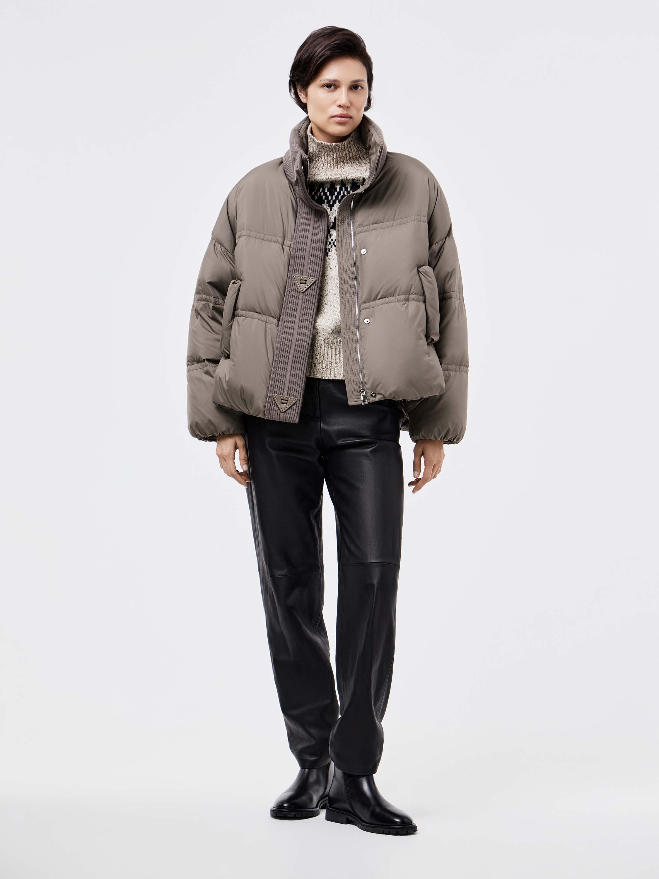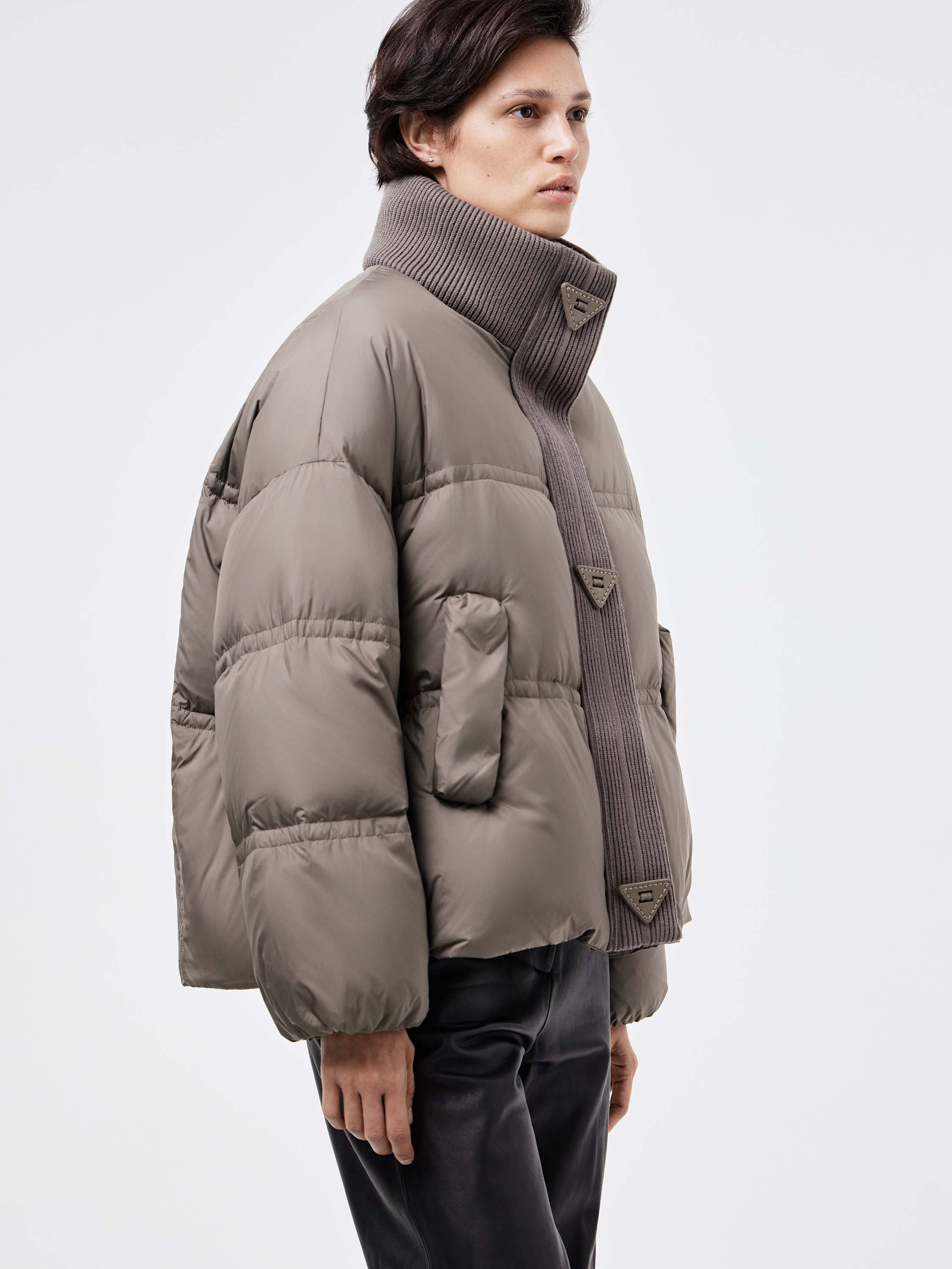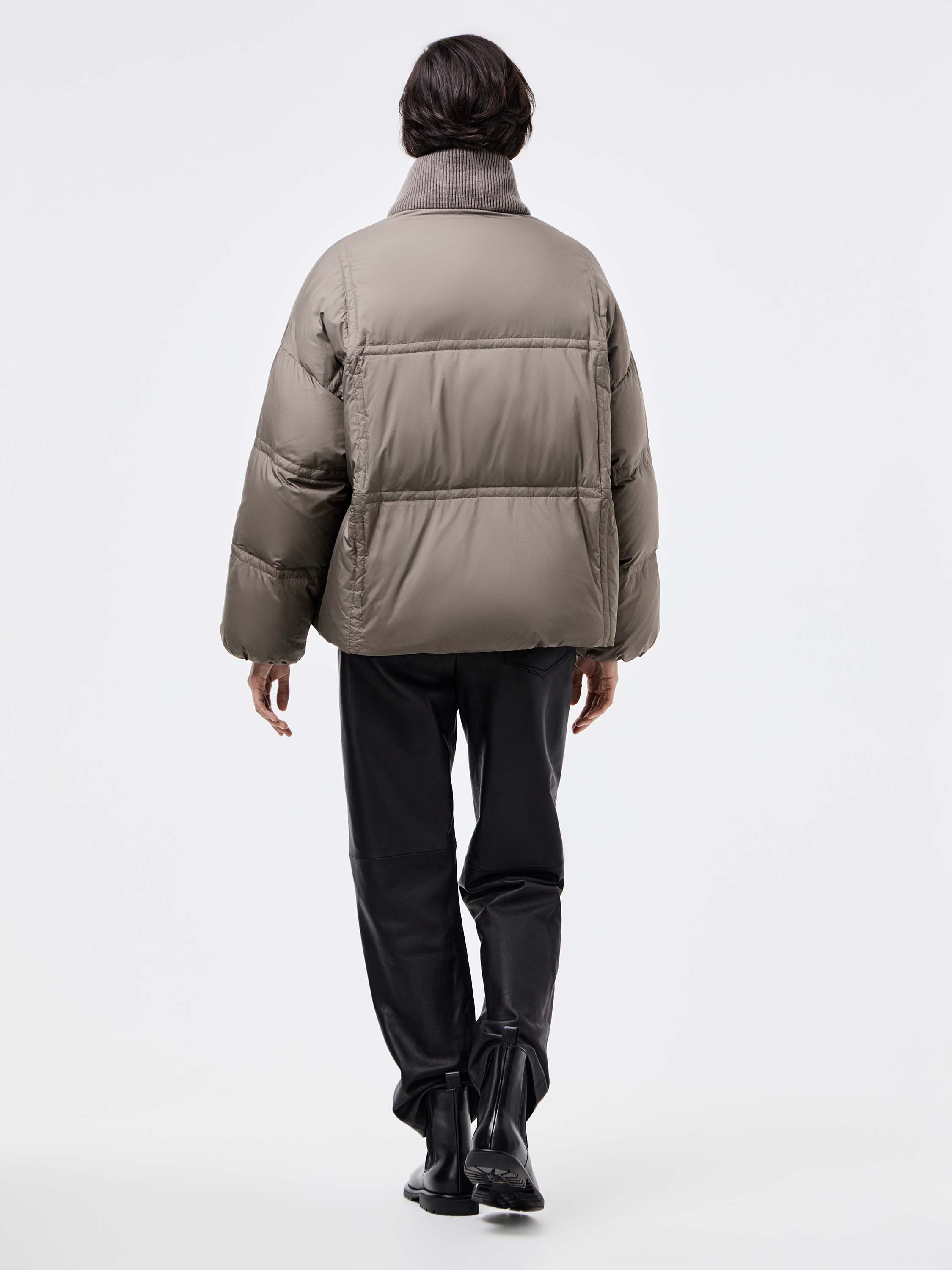 Укороченный пуховик с акцентом на объем и современный силуэт. Наполнитель из пуха и пера утки обеспечивает тепло при легком весе, а гладкая поверхность верха дополнена мягкими вставками из трикотажа по планке и воротнику. Крупная стежка формирует геометричный ритм и придает модели фактурность. Удобные карманы с клапанами подчеркивают практичность. Такой пуховик легко вписывается в городской гардероб: он сочетается с джинсами и трикотажем для повседневных комплектов и гармонично смотрится с кожаными брюками или строгими силуэтами.