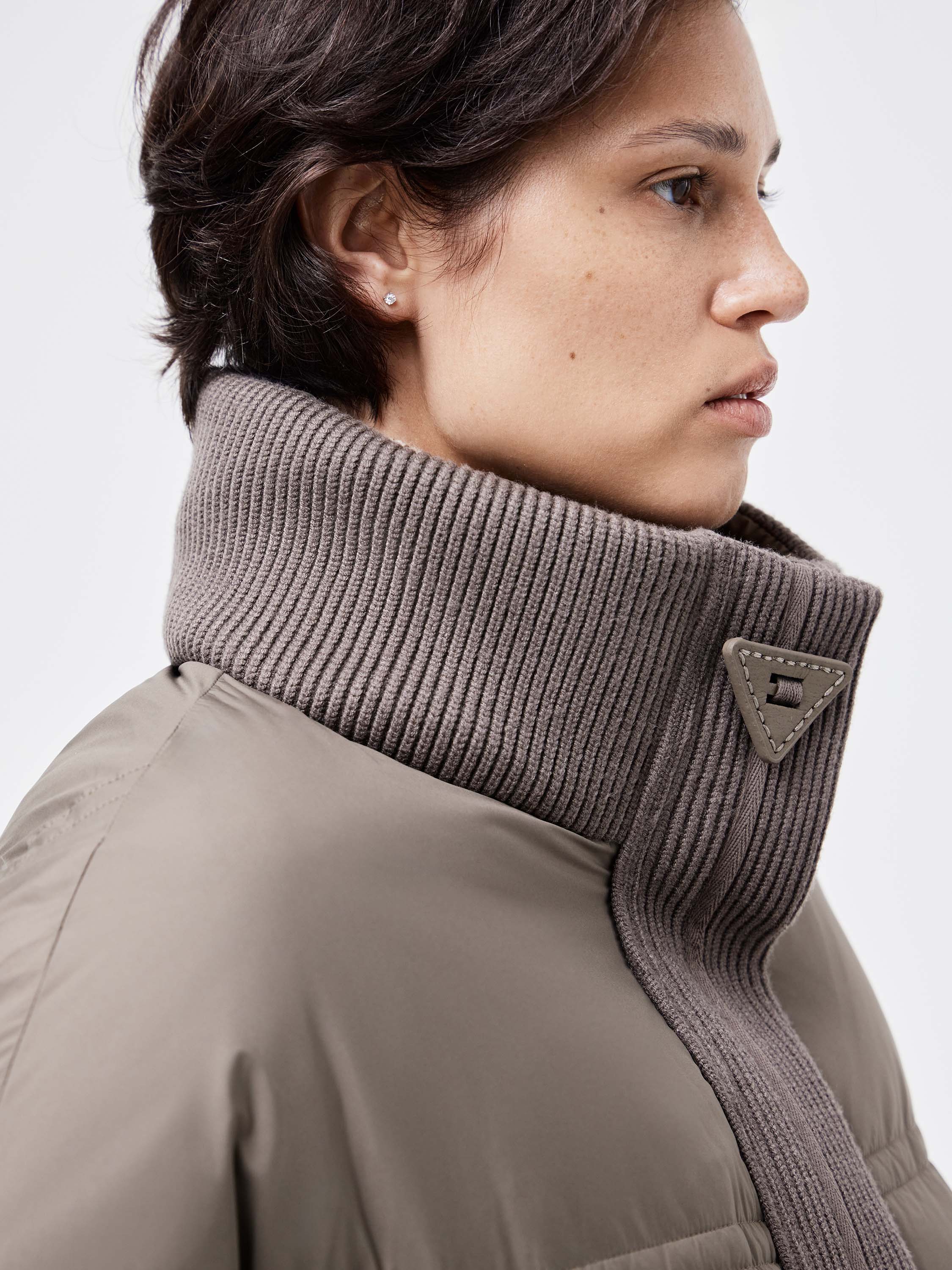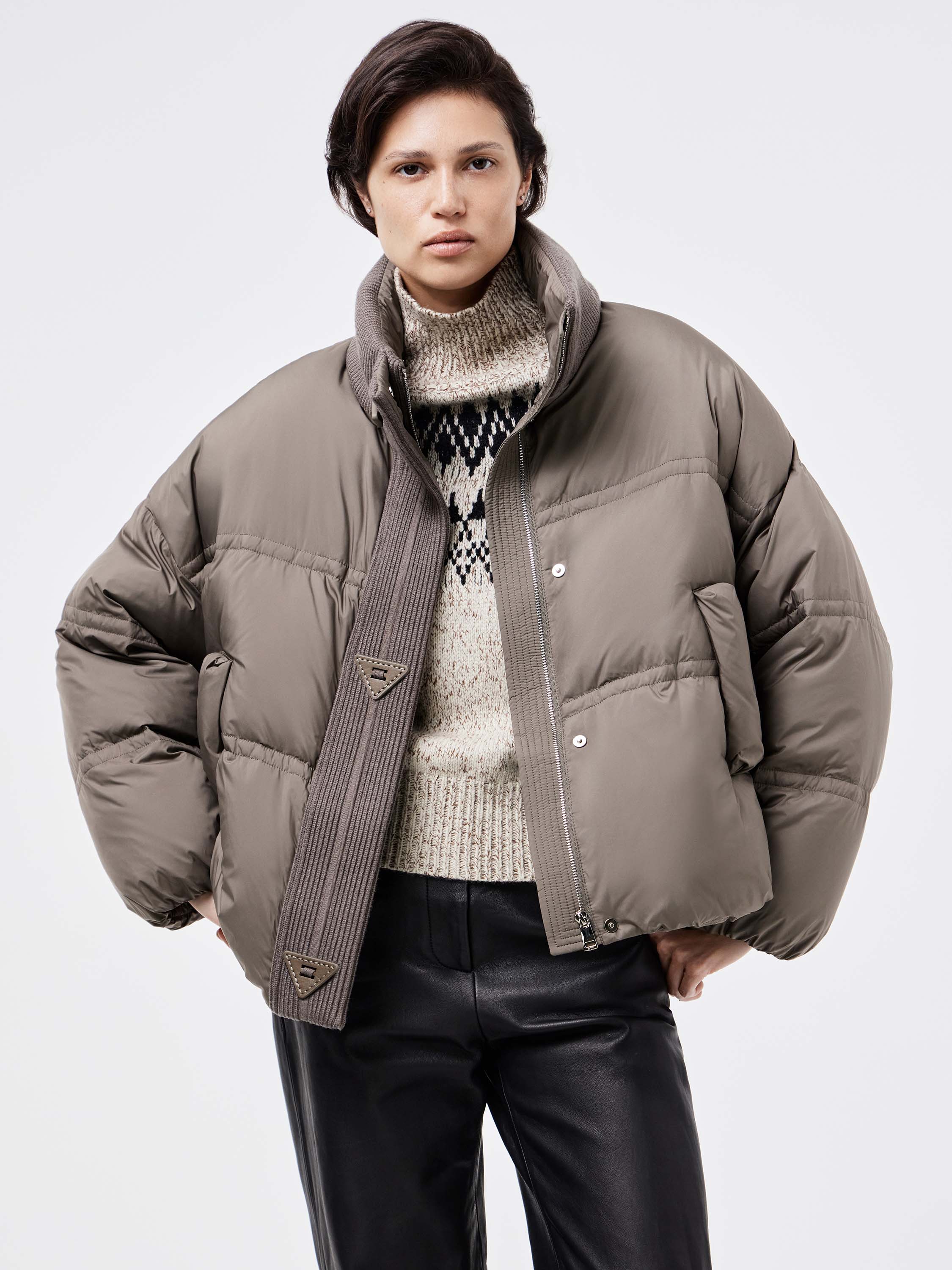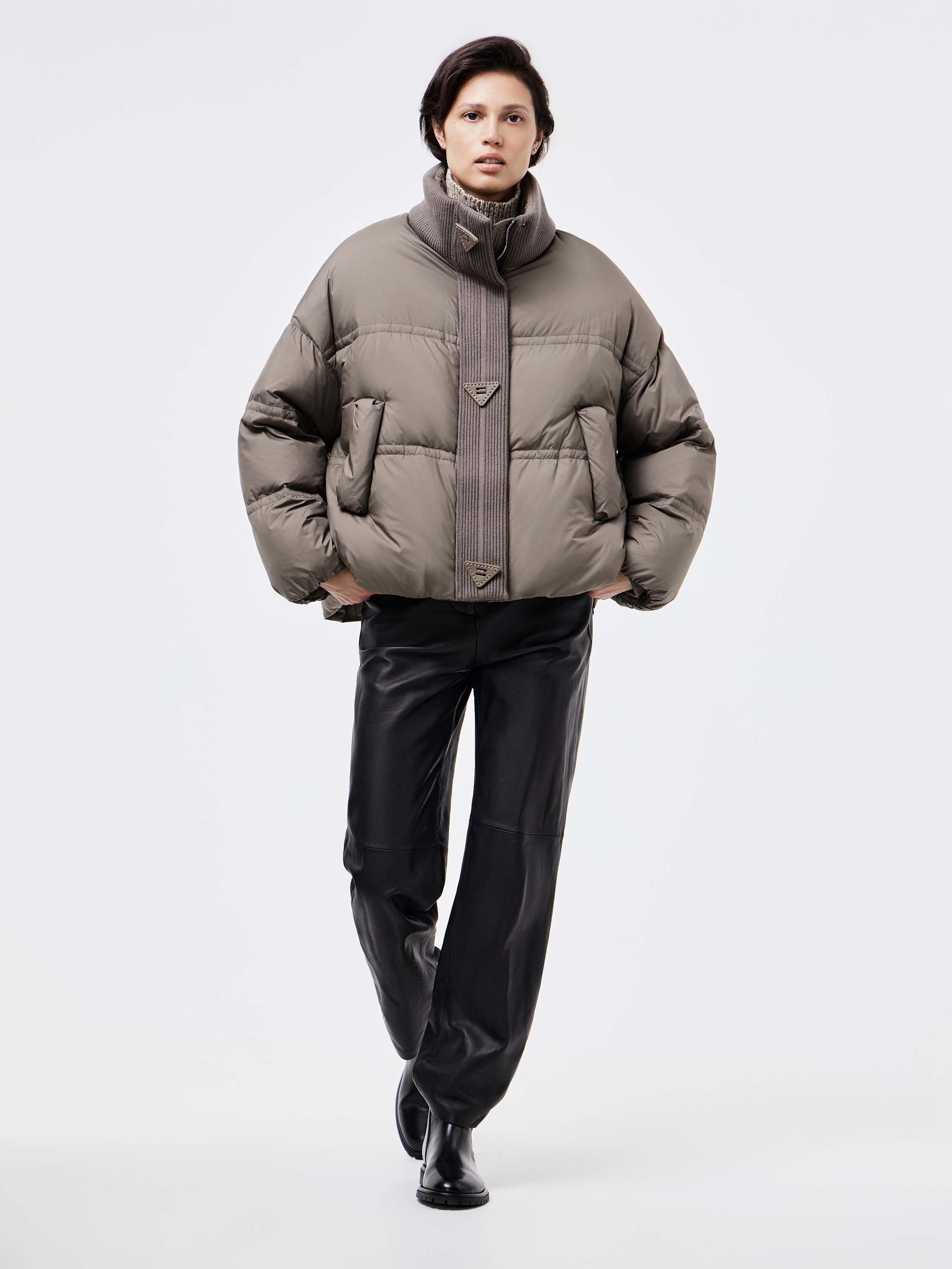 Укороченный пуховик с акцентом на объем и современный силуэт. Наполнитель из пуха и пера утки обеспечивает тепло при легком весе, а гладкая поверхность верха дополнена мягкими вставками из трикотажа по планке и воротнику. Крупная стежка формирует геометричный ритм и придает модели фактурность. Удобные карманы с клапанами подчеркивают практичность. Такой пуховик легко вписывается в городской гардероб: он сочетается с джинсами и трикотажем для повседневных комплектов и гармонично смотрится с кожаными брюками или строгими силуэтами.