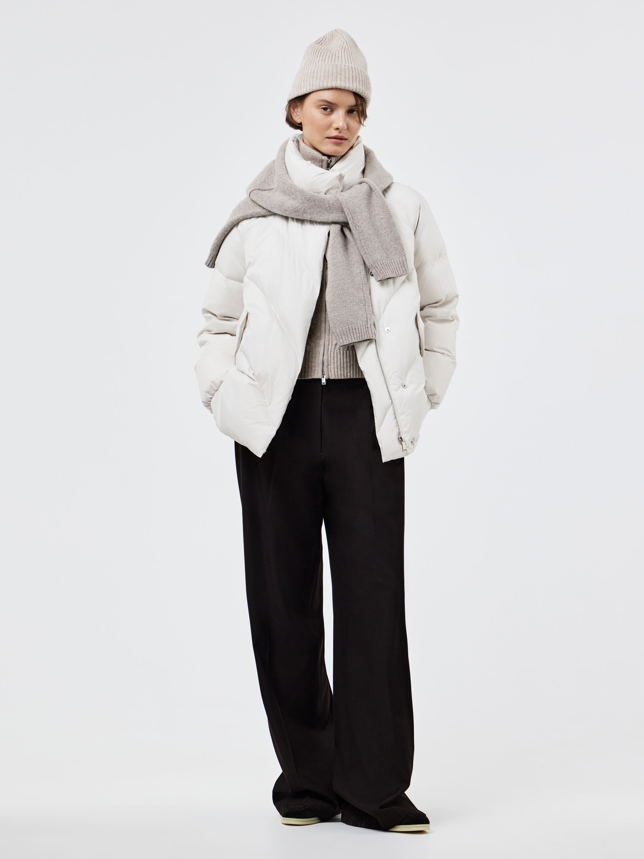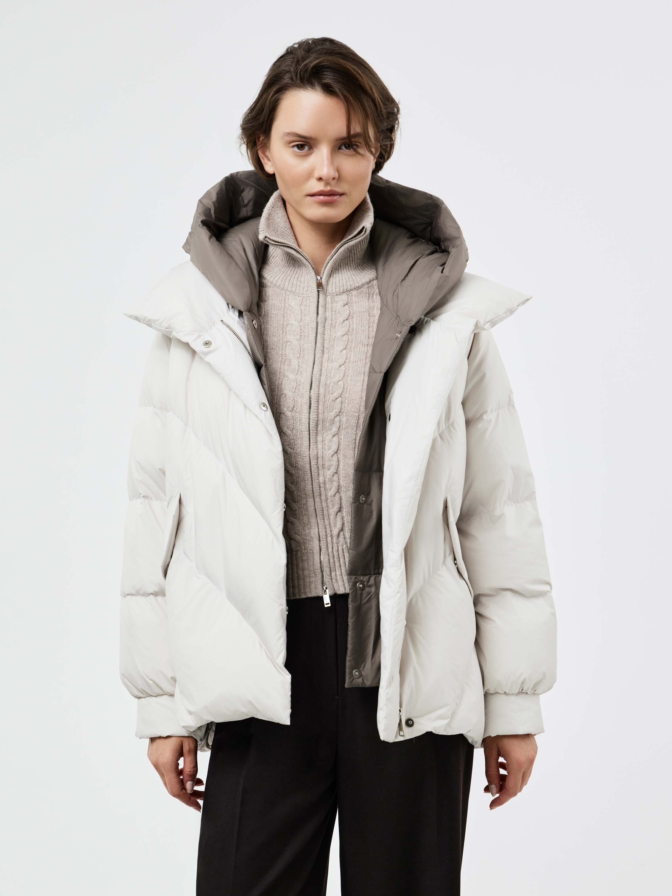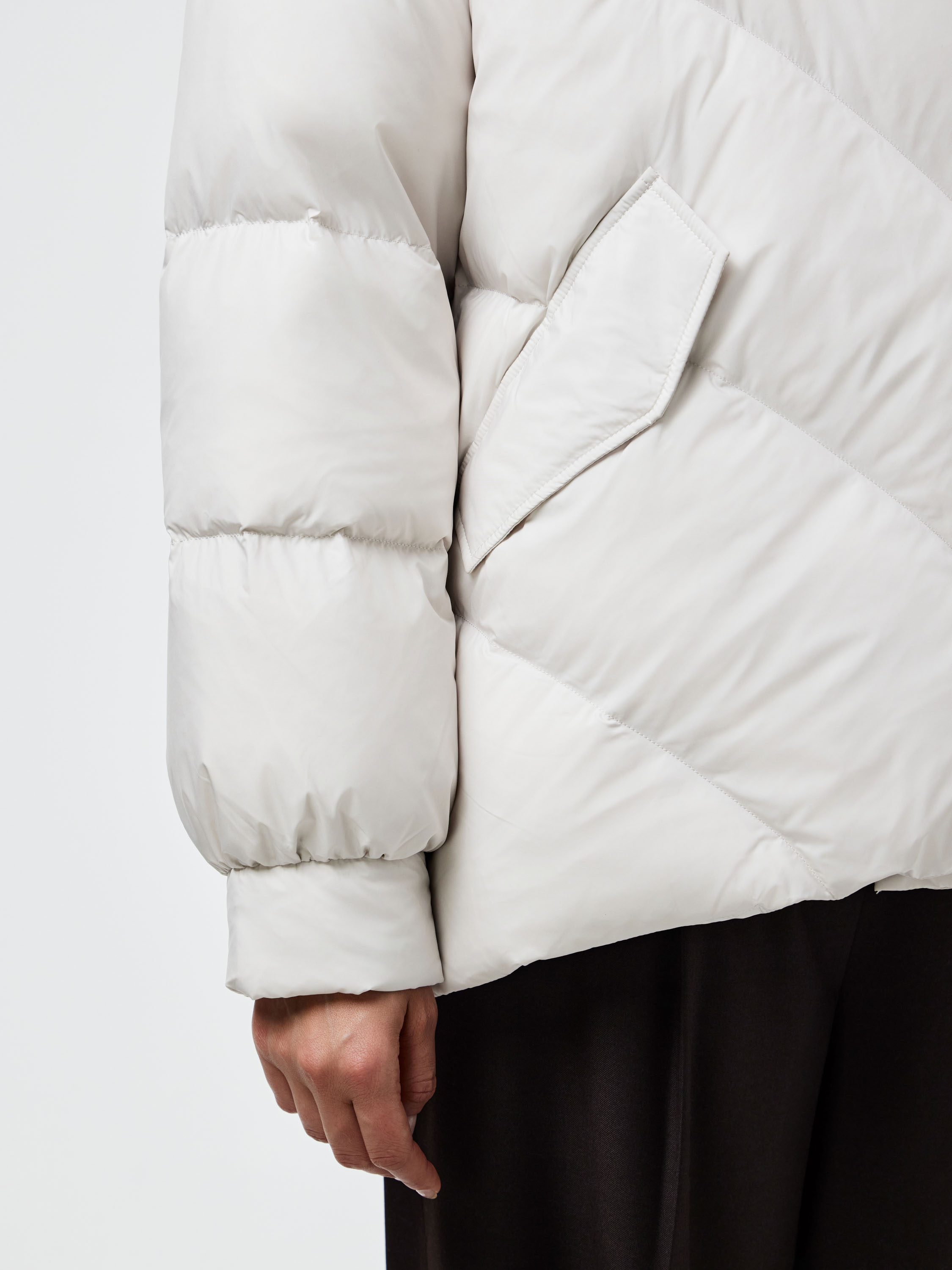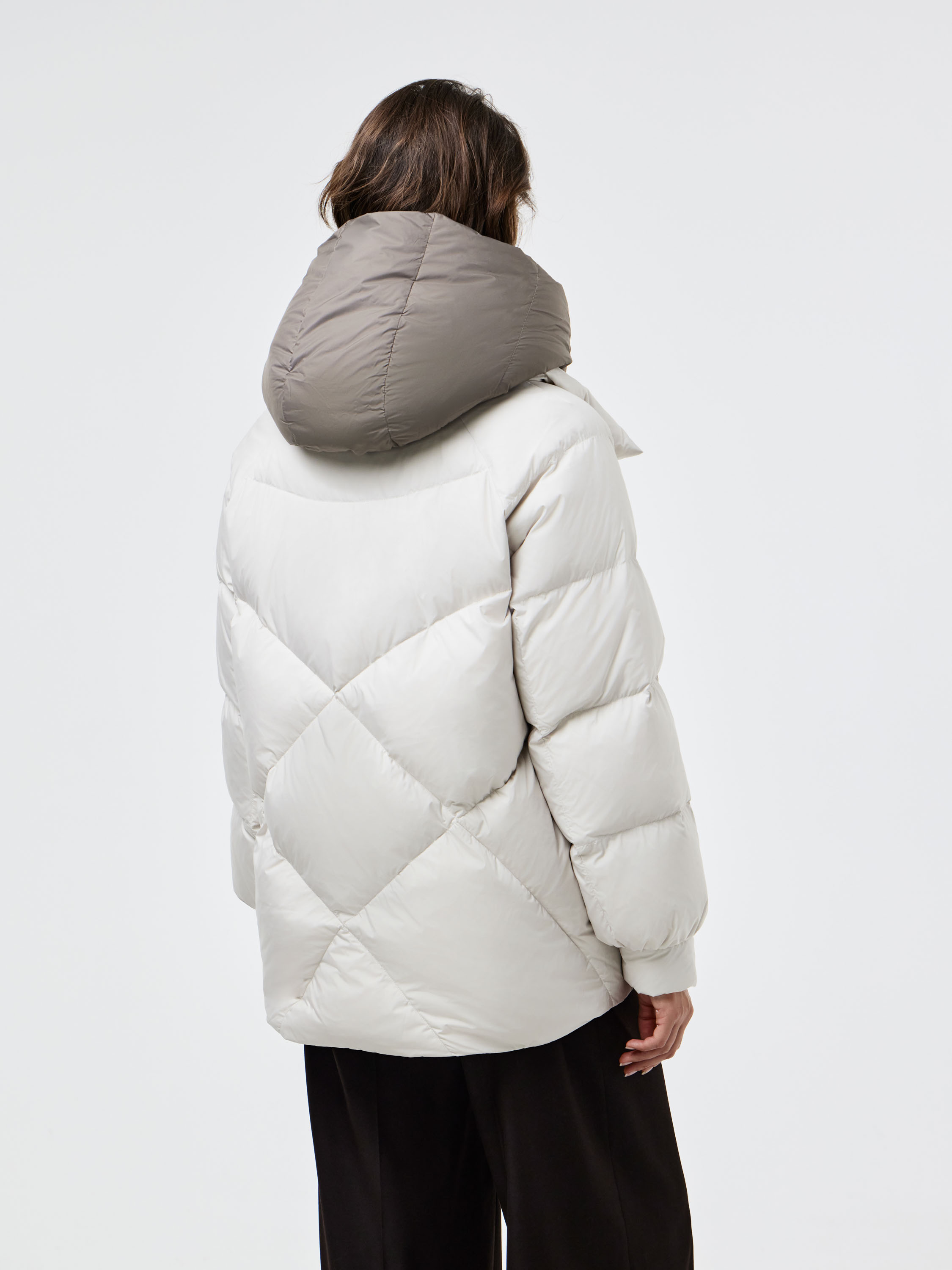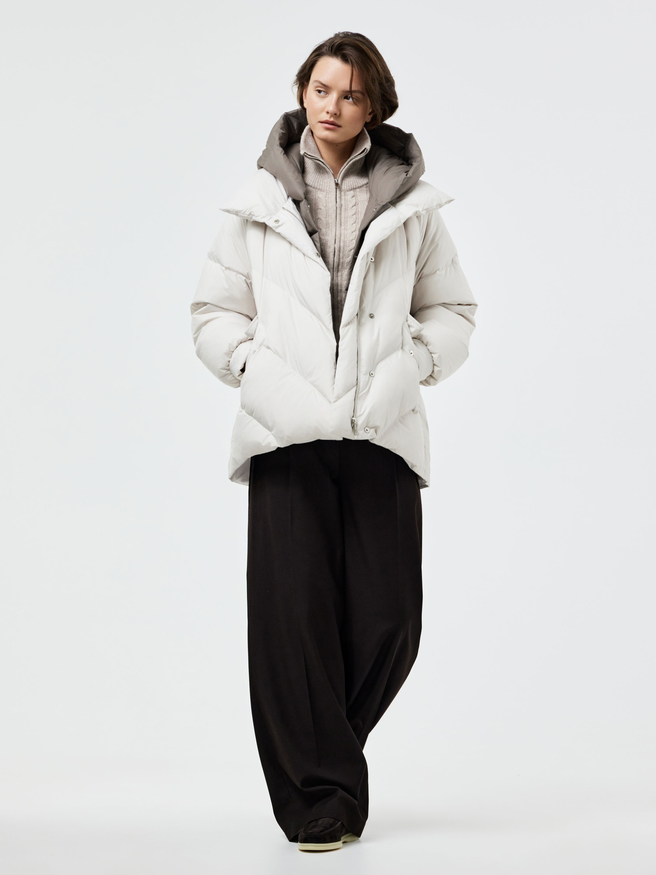 Пуховик прямого силуэта со спущенной линией плеча, выполненный из гладкого текстиля с объемной стежкой «елочкой». В качестве наполнителя используется натуральный утиный пух с добавлением пера, что делает модель легкой и одновременно теплой. Объемный воротник-стойка с широким отворотом защищает от ветра и холода, а глубокие карманы с клапанами добавляют практичности. Лаконичный крой и продуманные пропорции создают современный минималистичный образ, который легко вписывается в повседневный гардероб и сочетается как с деловыми, так и с более расслабленными комплектами.