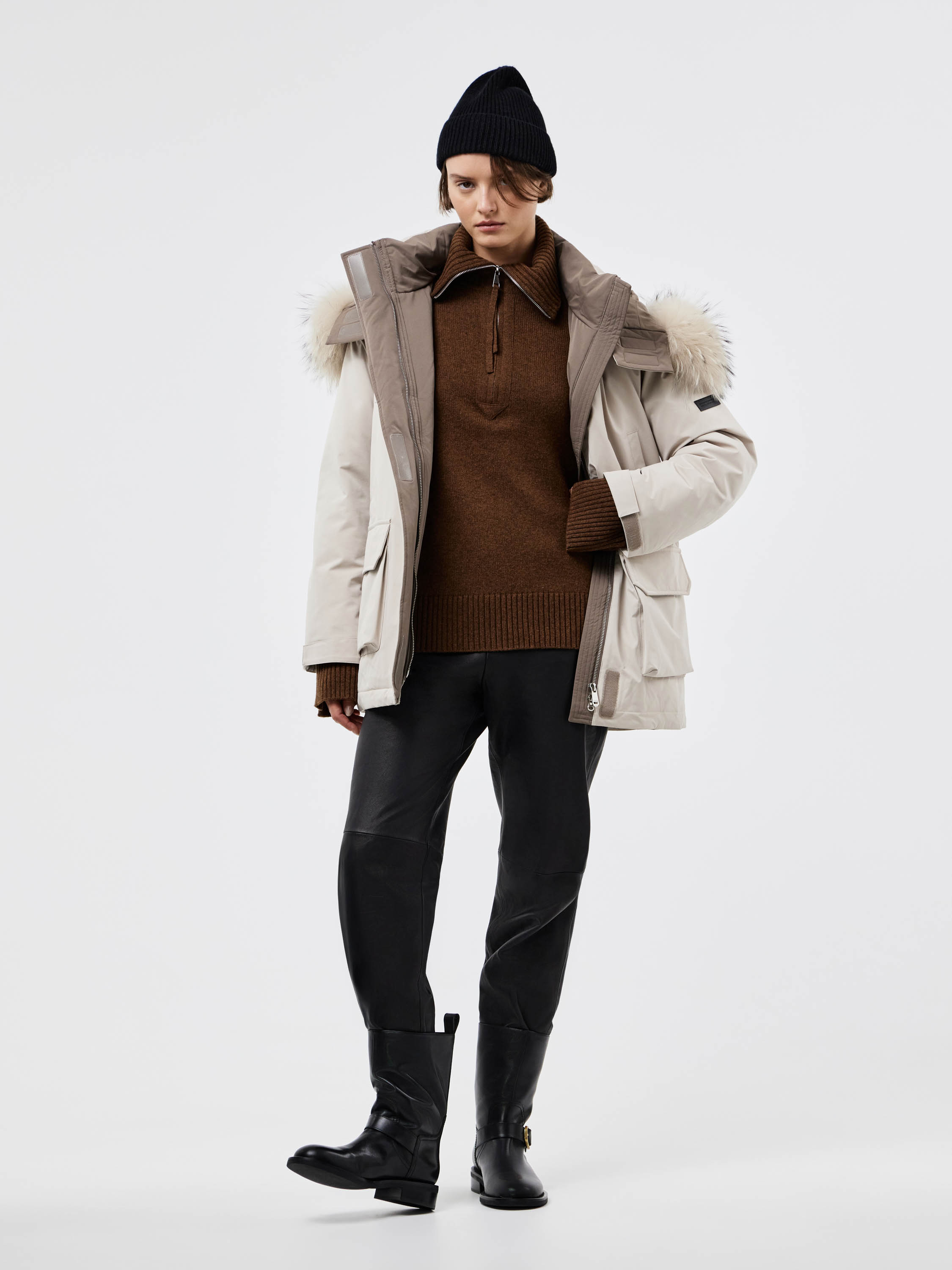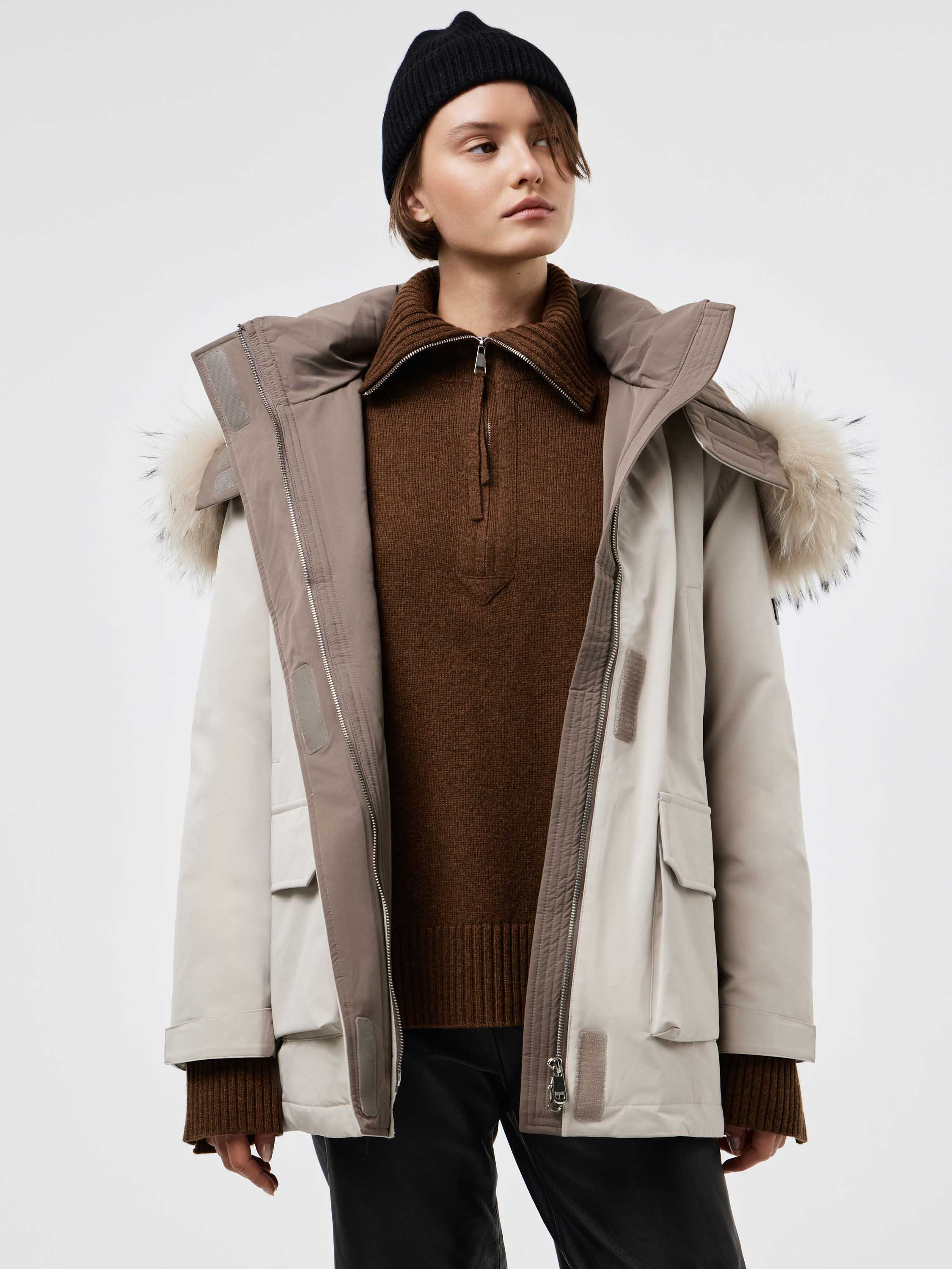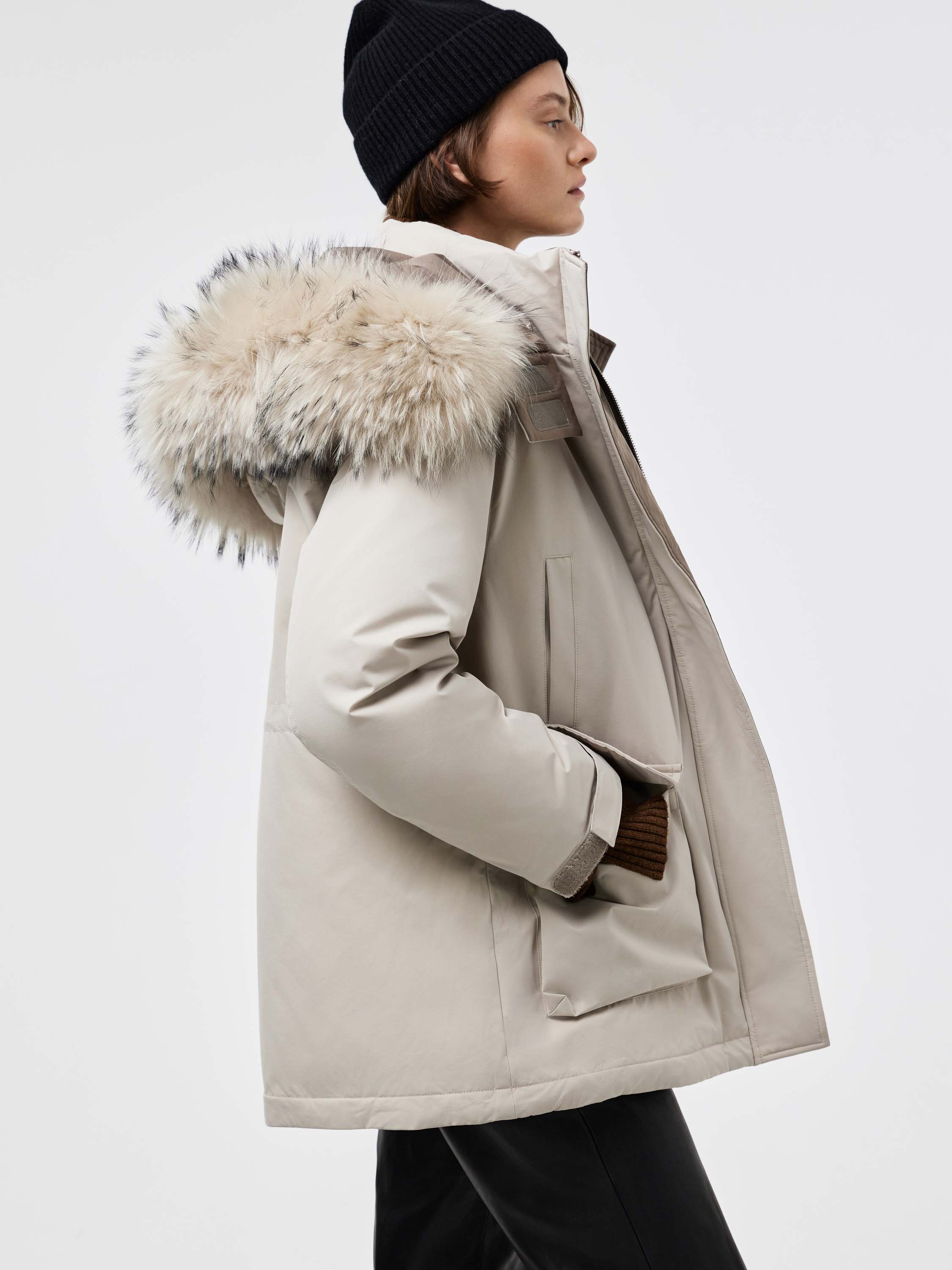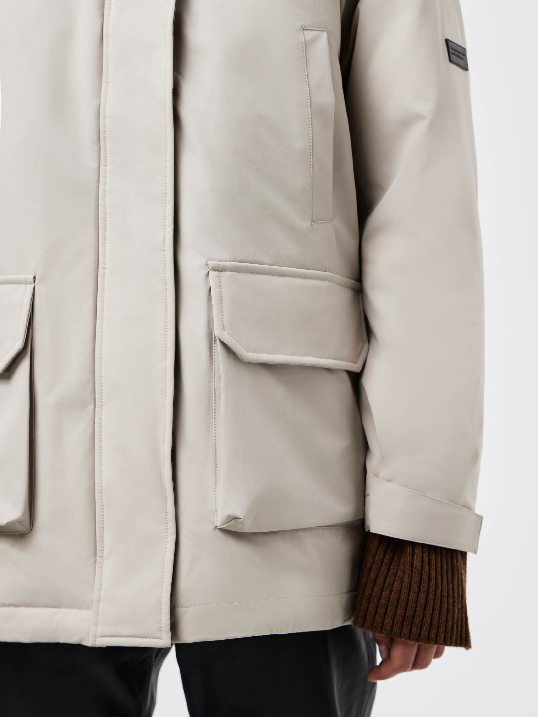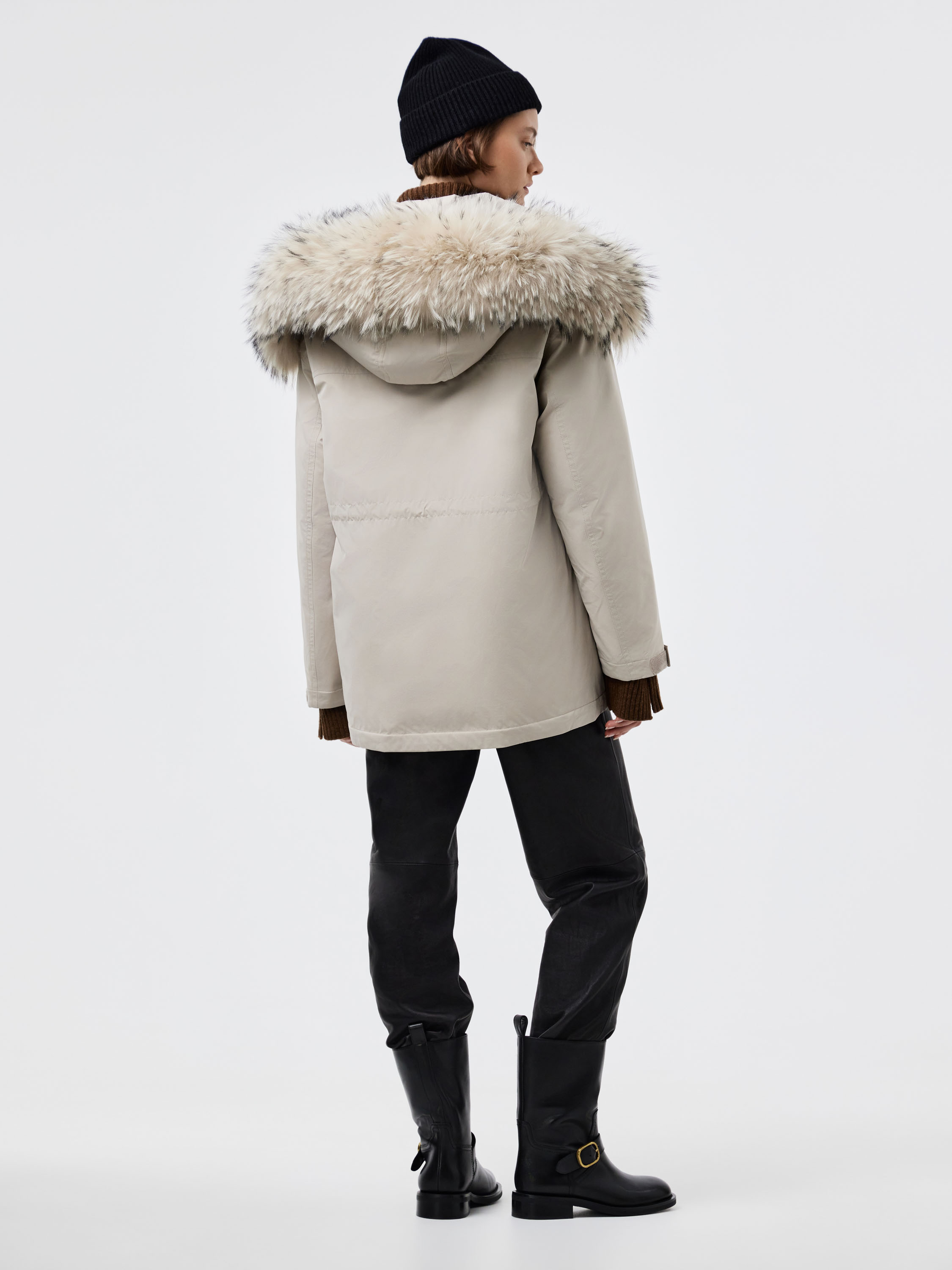 Парка с утеплителем из пуха и пера утки объединяет функциональность и выразительный дизайн. Верх выполнен из прочного материала, устойчивого к износу и погодным условиям. Объемный капюшон оформлен натуральным мехом енота, который подчеркивает характер модели и защищает от ветра. Застежка на молнию скрыта планкой, фиксирующей тепло, а крупные накладные карманы с клапанами добавляют практичности. Прямой силуэт с регулируемыми манжетами обеспечивает комфортную посадку. Парка легко вписывается в повседневный гардероб, сочетая практичность и современный стиль.