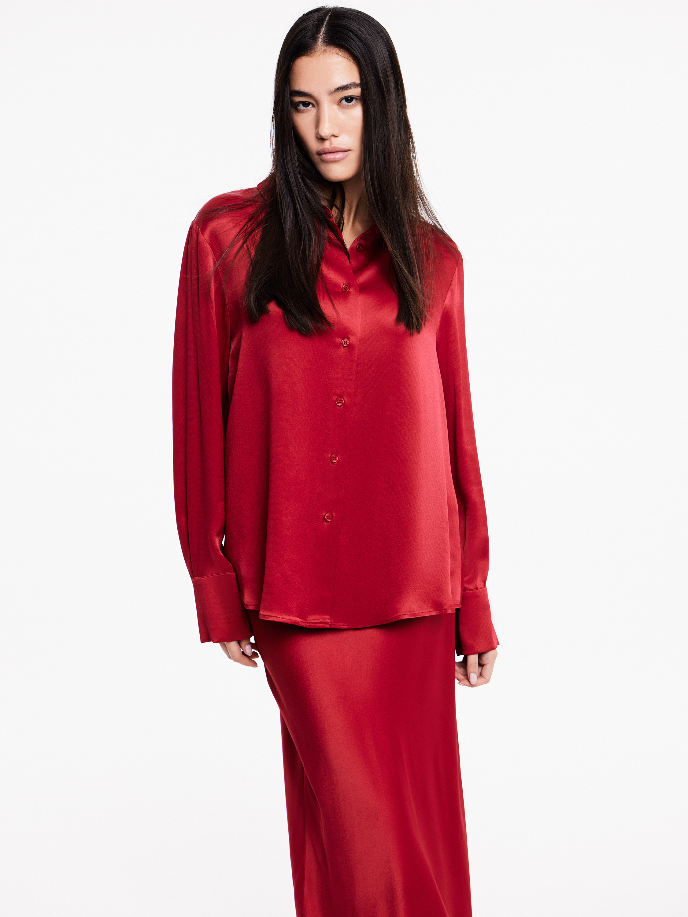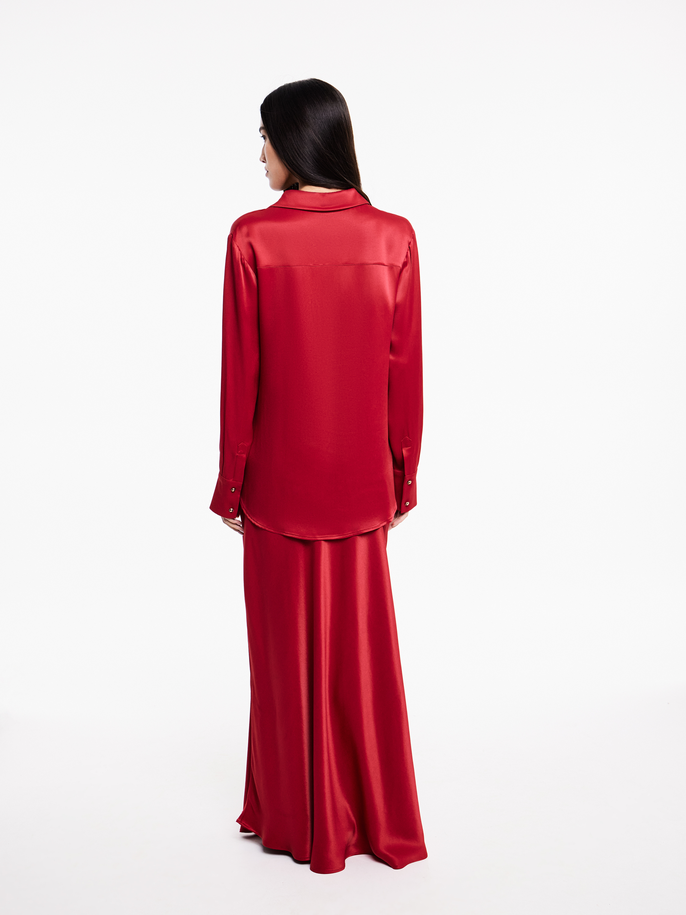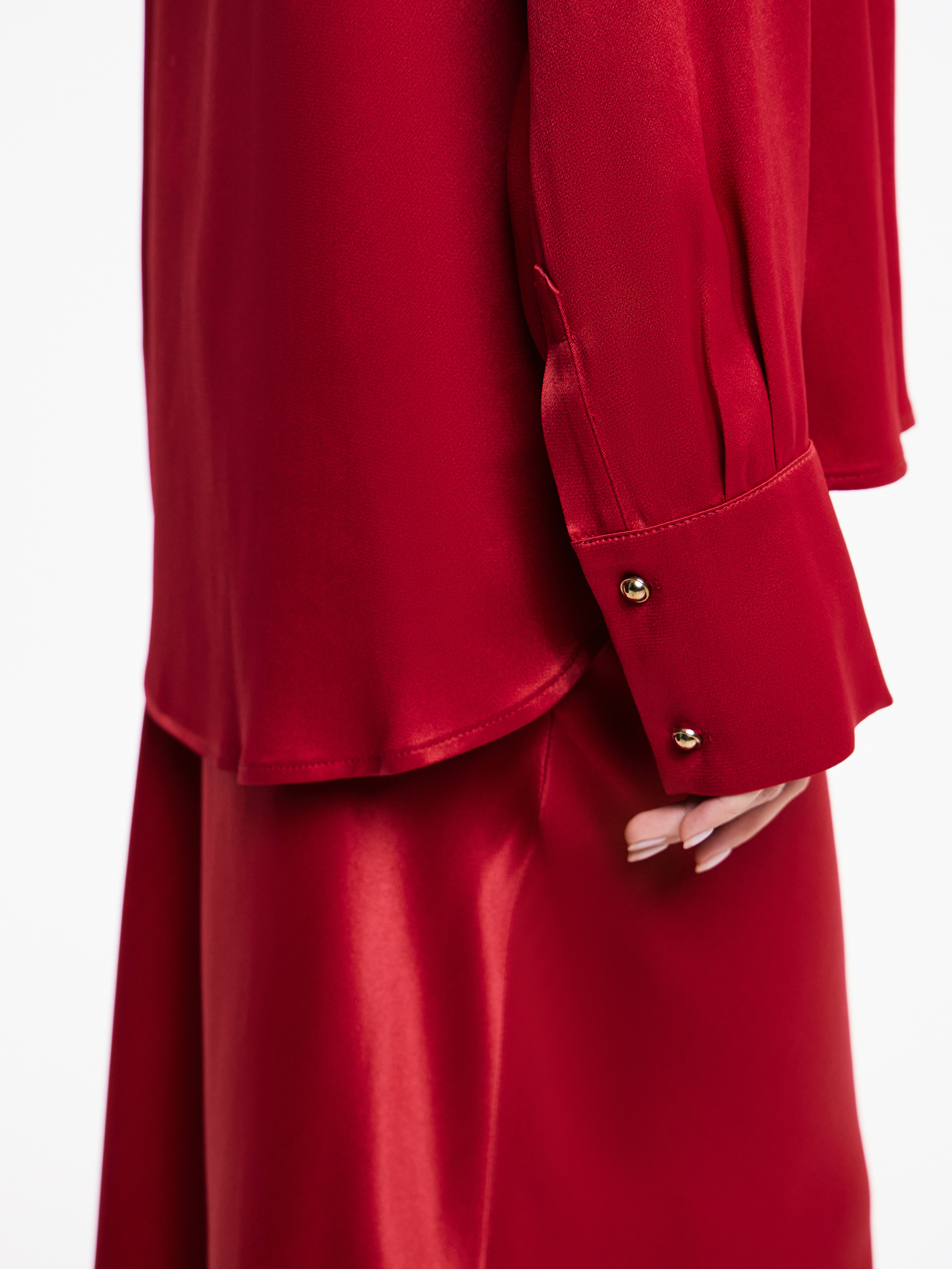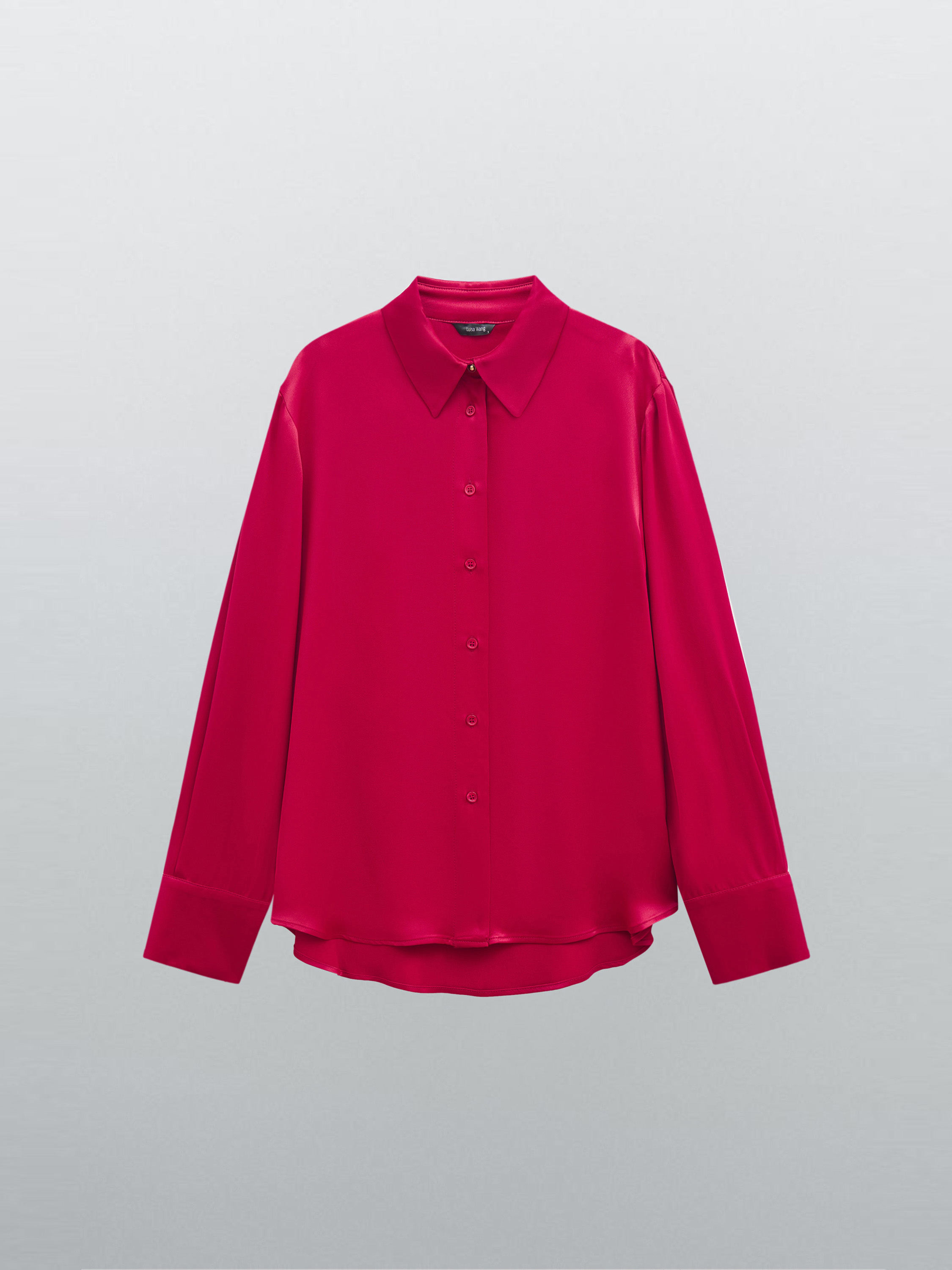 Рубашка из гладкого атласного района с выразительным сатиновым блеском. Материал легкий, пластичный, мягко драпируется и комфортно ощущается на коже. Крой прямой, с классическим отложным воротником и длинными рукавами на манжетах, застегивающихся на две пуговицы. Застежка выполнена в тон, что поддерживает цельность силуэта. Универсальная длина позволяет носить рубашку как навыпуск, так и заправленной в брюки или юбку, создавая элегантные и современные образы с акцентом.