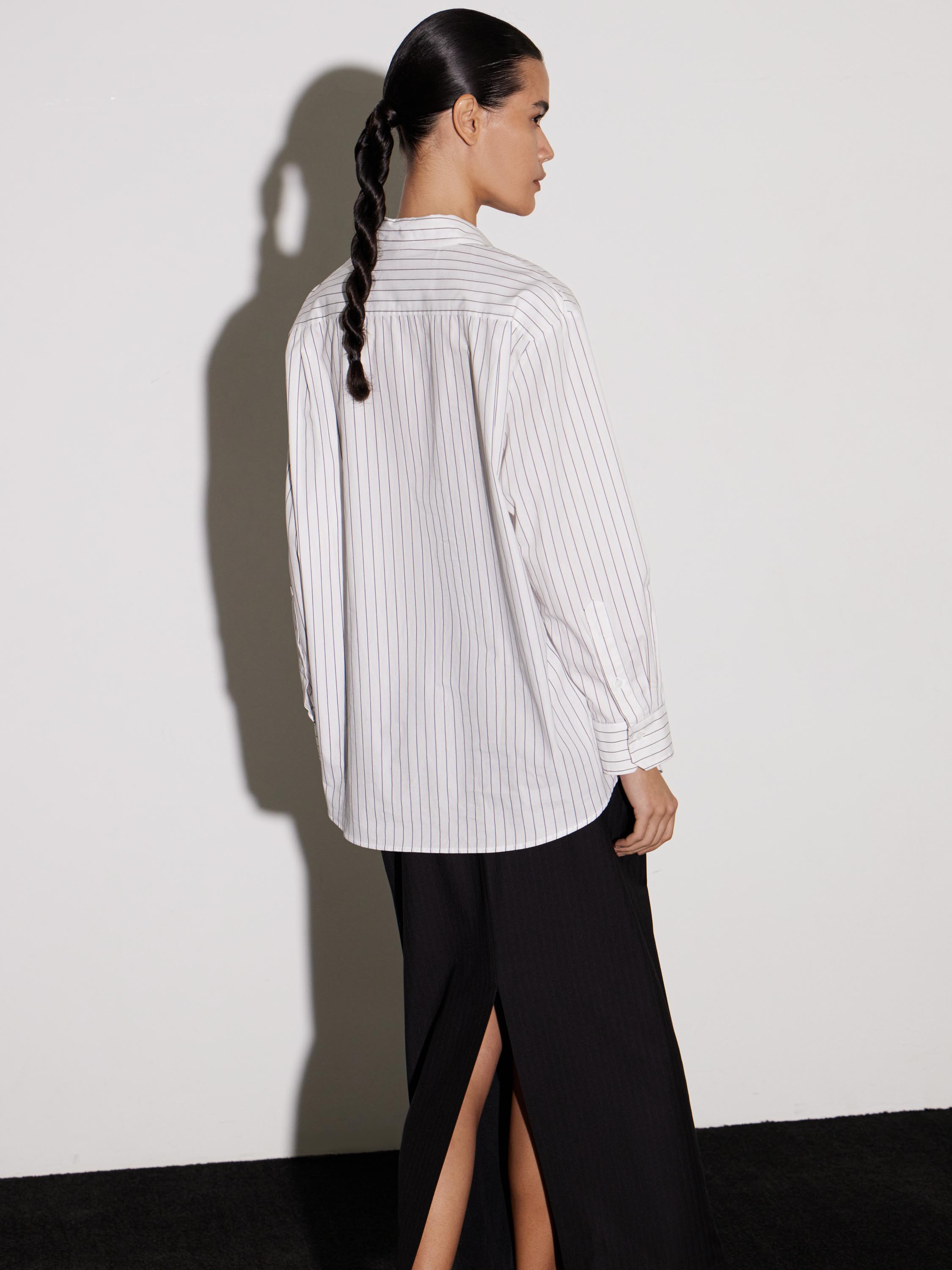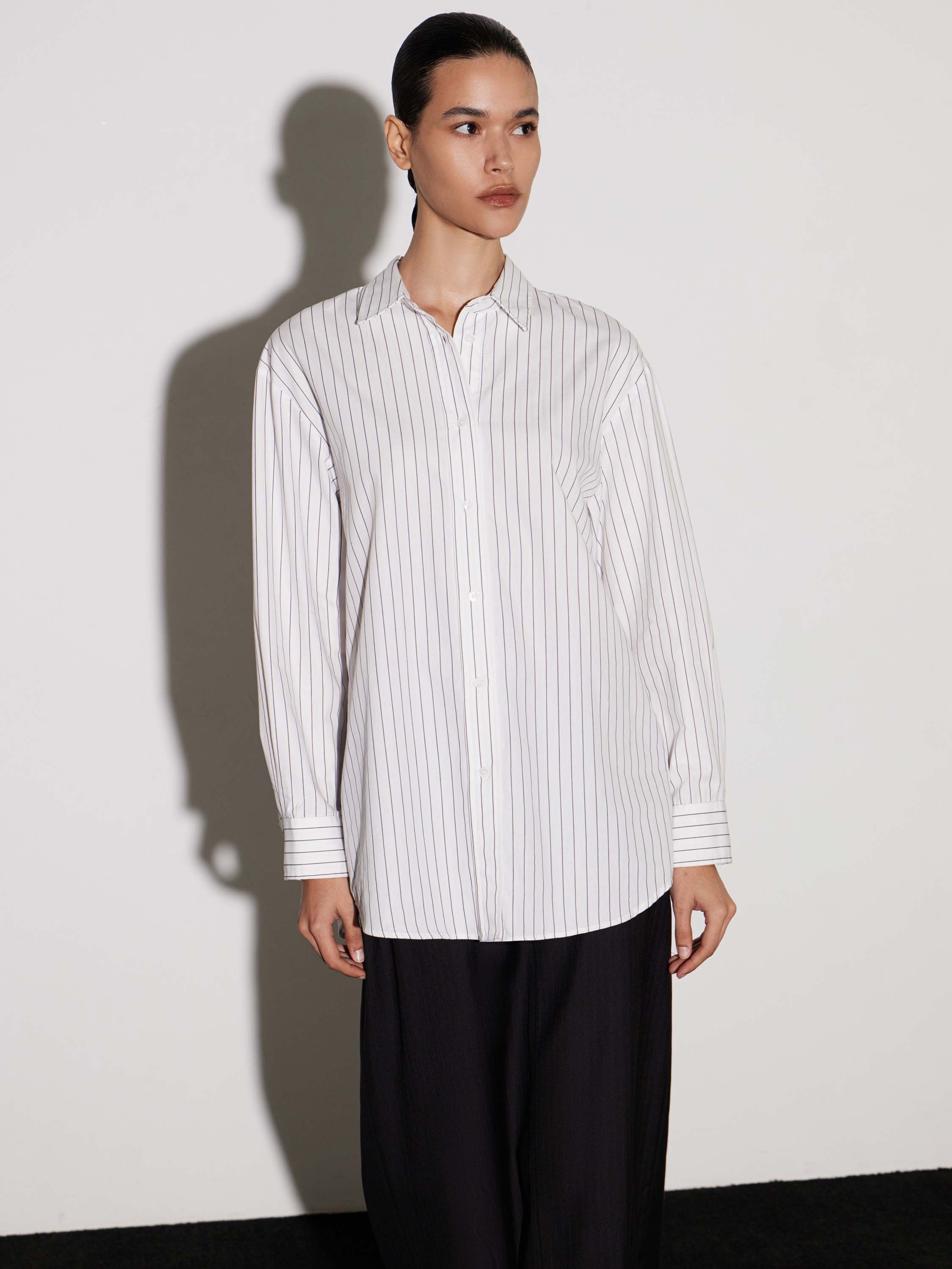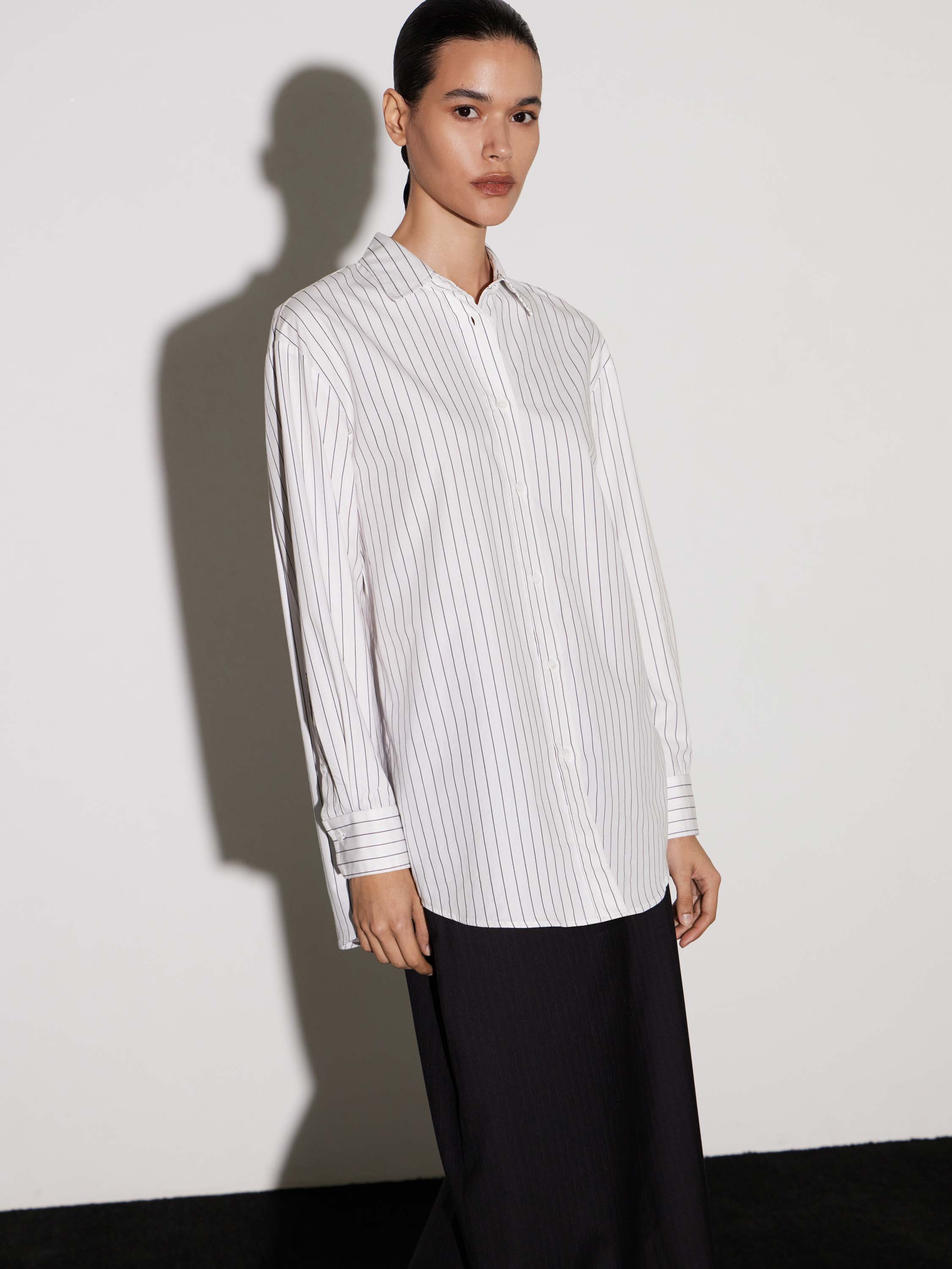 Рубашка из хлопка с деликатным вертикальным принтом в тонкую полоску. Натуральный материал обеспечивает комфорт и воздухопроницаемость, оставаясь мягким и тактильно приятным. Крой свободный, с классическим отложным воротником и застежкой на пуговицы. Длинные рукава дополнены широкими манжетами на пуговицах, что подчеркивает аккуратность силуэта. Минималистичный дизайн с лаконичным рисунком делает рубашку универсальной: она одинаково органично смотрится в сочетании с брюками строгого кроя, джинсами или юбкой, создавая сдержанный и современный образ.