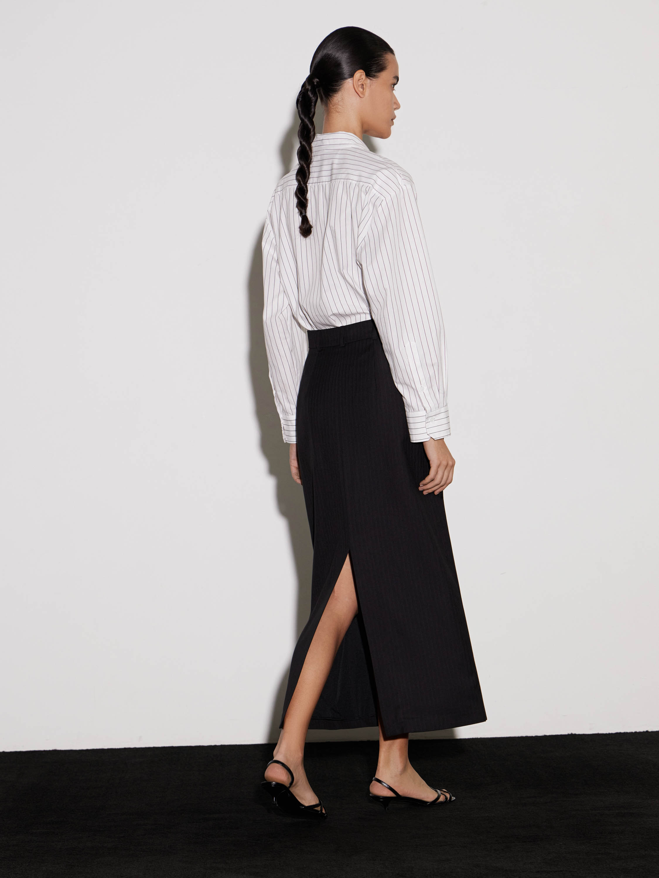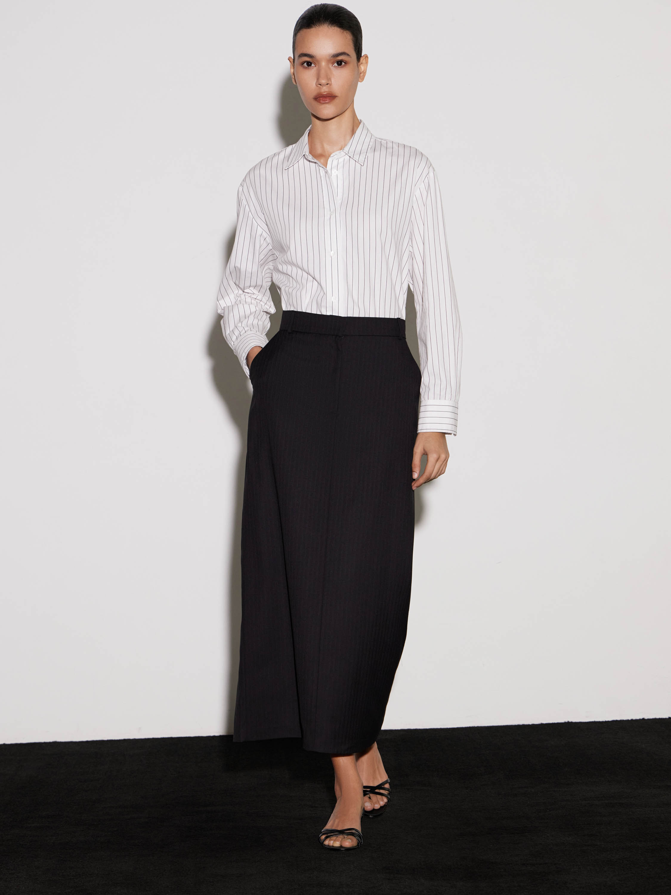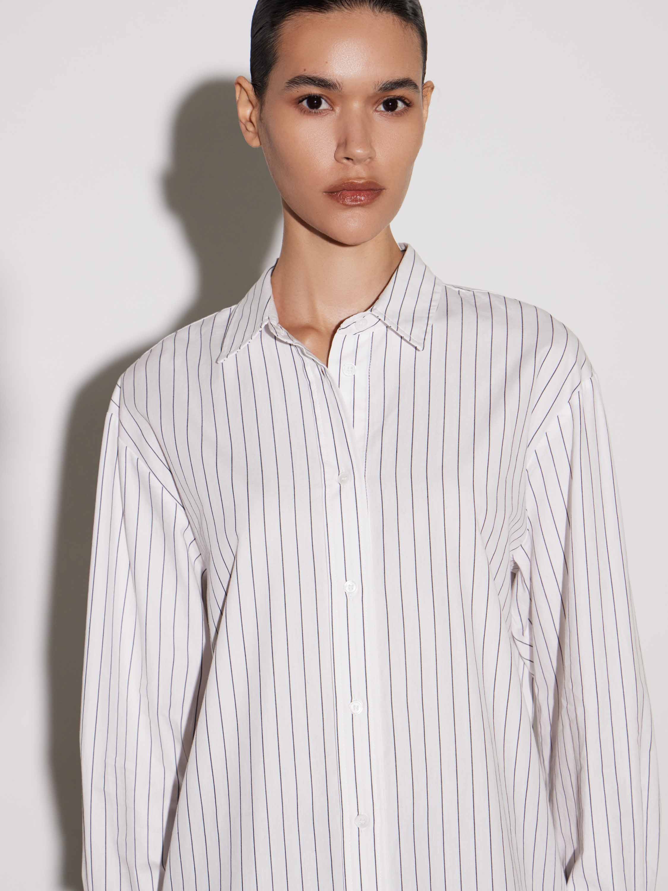 Рубашка из хлопка с деликатным вертикальным принтом в тонкую полоску. Натуральный материал обеспечивает комфорт и воздухопроницаемость, оставаясь мягким и тактильно приятным. Крой свободный, с классическим отложным воротником и застежкой на пуговицы. Длинные рукава дополнены широкими манжетами на пуговицах, что подчеркивает аккуратность силуэта. Минималистичный дизайн с лаконичным рисунком делает рубашку универсальной: она одинаково органично смотрится в сочетании с брюками строгого кроя, джинсами или юбкой, создавая сдержанный и современный образ.