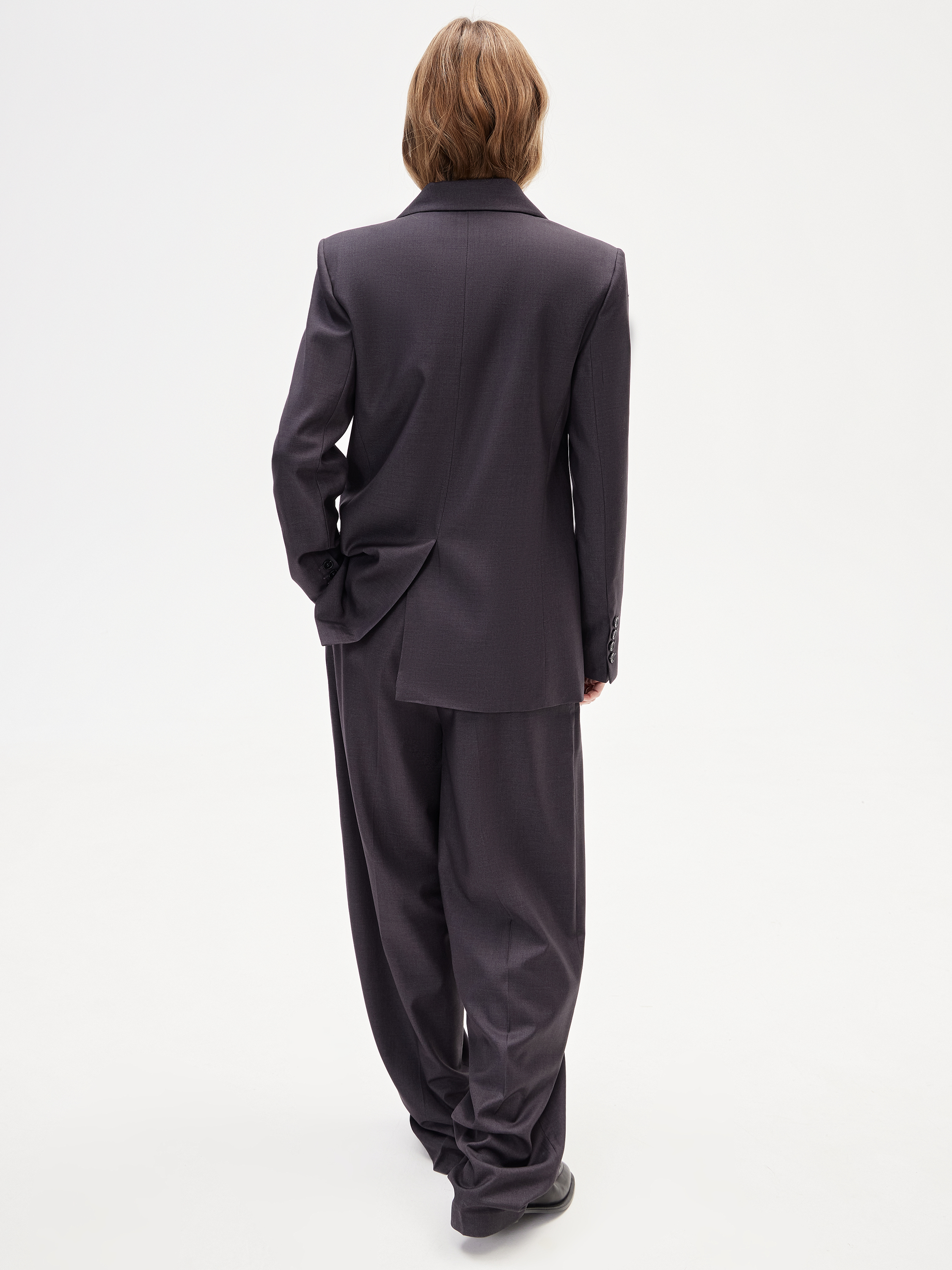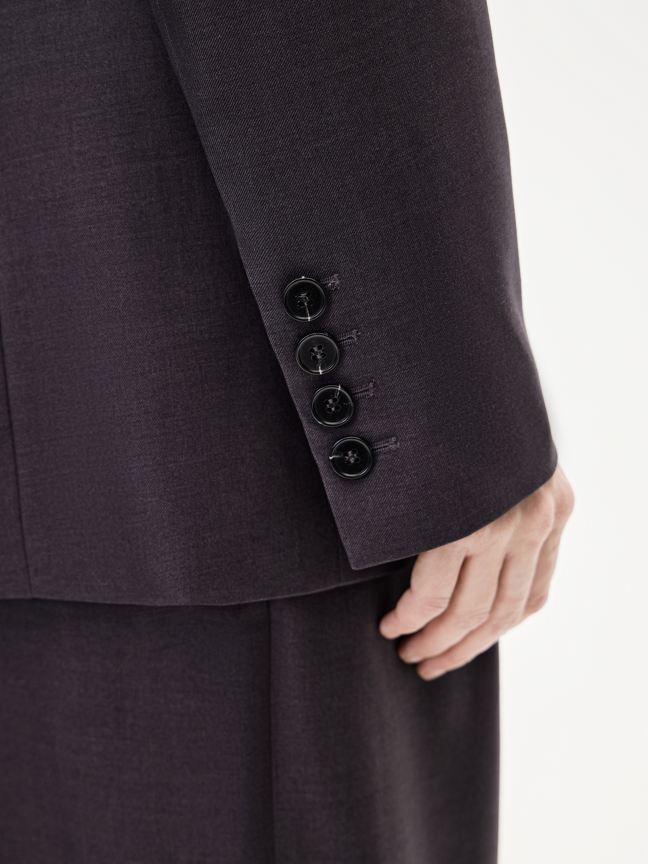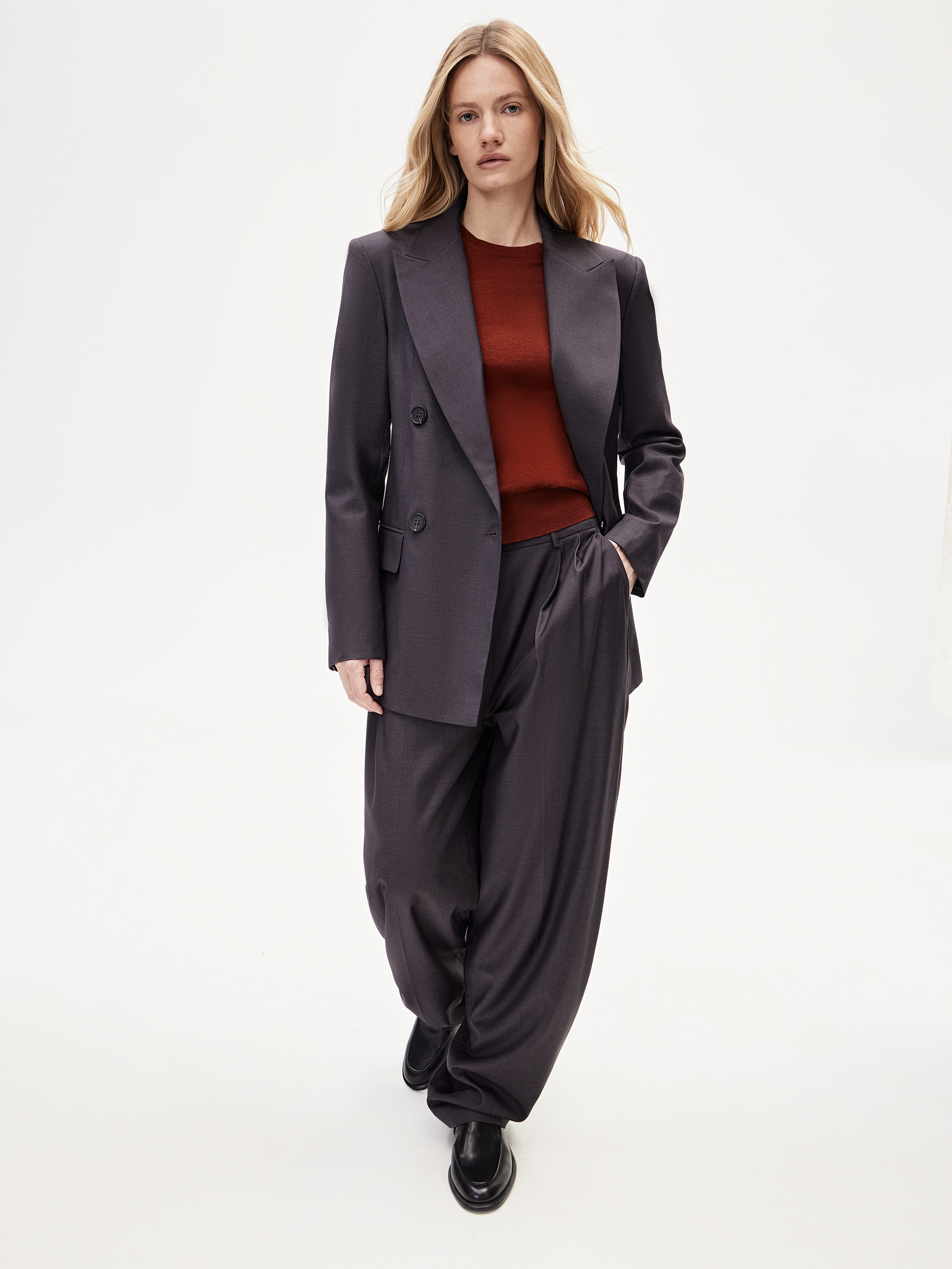 Удлиненный двубортный жакет строгого силуэта с акцентом на линию плеча и четкую геометрию кроя. Модель выстроена по классическим канонам, но за счет длины и пропорций выглядит современно и актуально. Смесовое полотно с добавлением шерсти и вискозы формирует плотную, пластичную структуру, которая хорошо держит форму и при этом остается комфортной в носке. Вискоза придает ткани мягкость и легкий матовый блеск, шерсть добавляет теплоту и глубину фактуры. Материал устойчив к деформации, сохраняет аккуратный вид в течение дня. Серый цвет — универсальный и функциональный, легко интегрируется в повседневный и деловой гардероб. Модель выполнена с широкими лацканами, двубортной застежкой на четыре пуговицы и клапанами по линии бедер. Прямой крой с мягким прилеганием формирует вытянутый силуэт. Носите с классическими брюками из комплекта, с прямыми джинсами и базовым трикотажем или поверх тонкого платья для более женственной интерпретации образа.